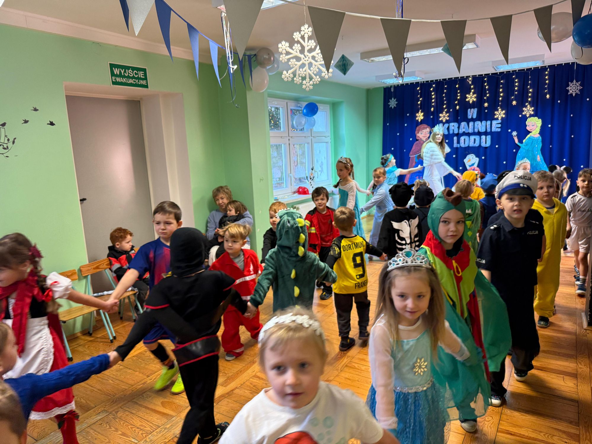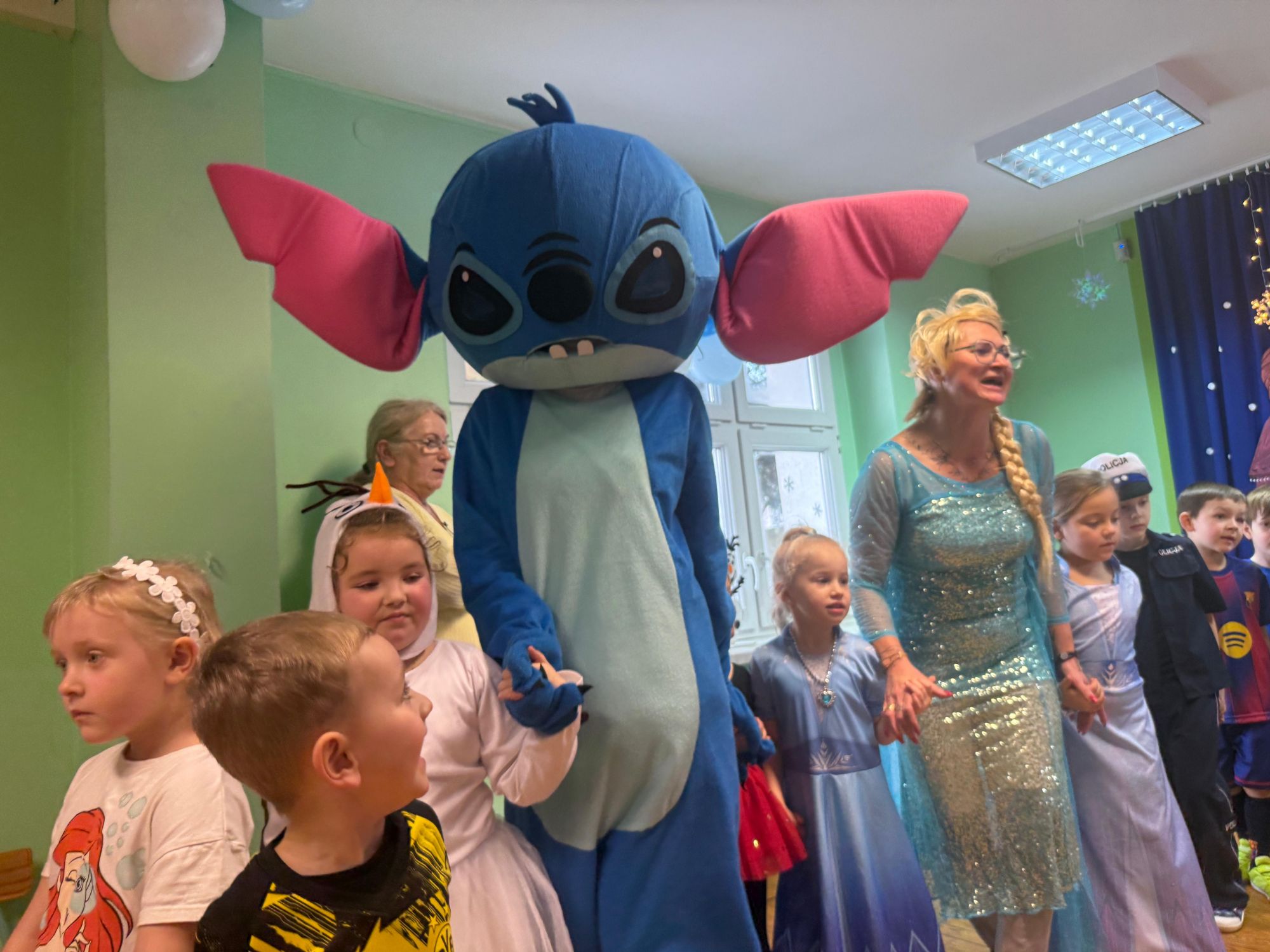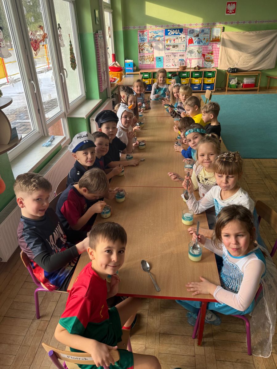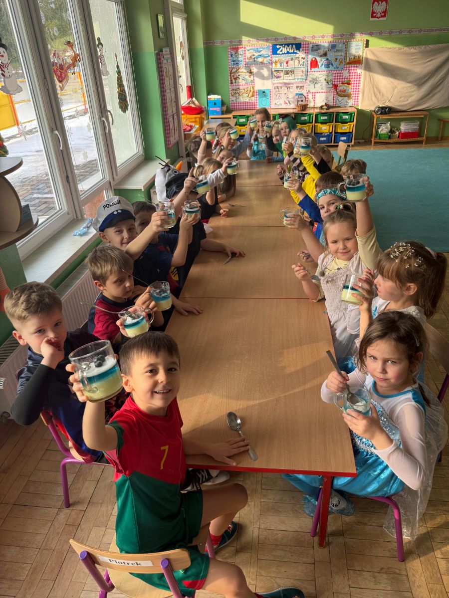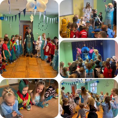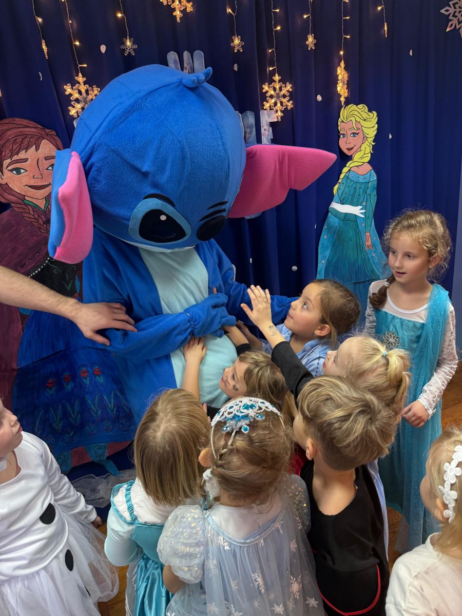 15 stycznia w naszym przedszkolu odbył się wyjątkowy bal karnawałowy pod hasłem „W krainie lodu”. To pełne radości i uśmiechu wydarzenie poprowadziła pani Barbara Koprek z firmy Skeleton, która zadbała o wspaniałą atmosferę oraz mnóstwo atrakcji dla najmłodszych. Tego dnia dzieci przyszły do przedszkola przebrane za swoich ulubionych bohaterów z bajek, filmów i nie tylko. Wśród barwnego tłumu można było spotkać m.in. Elsy, Królowe Śniegu, Olafa, bohaterów Psiego Patrolu, policjantów, piłkarzy oraz wiele innych fantastycznych postaci. Sala została specjalnie na tę okazję pięknie udekorowana balonami, girlandami i serpentynami, które doskonale wpisywały się w zimową tematykę balu. Na przedszkolaki czekało mnóstwo atrakcji – wspólne tańce, wesołe konkurencje oraz różnorodne zadania, w których dzieci chętnie brały udział razem z paniami. Nie zabrakło również chwili na odpoczynek i ugaszenie pragnienia. Po radosnych zabawach na dzieci czekał pyszny poczęstunek w postaci deseru „Śnieżna kraina”- kolorowej galaretki, która wszystkim bardzo smakowała. Zwieńczeniem tego wyjątkowego dnia była miła niespodzianka. Przedszkole odwiedził Stitch - kosmiczna postać z bajki Disneya, wywołując u dzieci ogromne emocje i szerokie uśmiechy. Bal karnawałowy był pełen radości, śmiechu i niezapomnianych wrażeń, a wspólna zabawa na długo pozostanie w pamięci wszystkich uczestników.