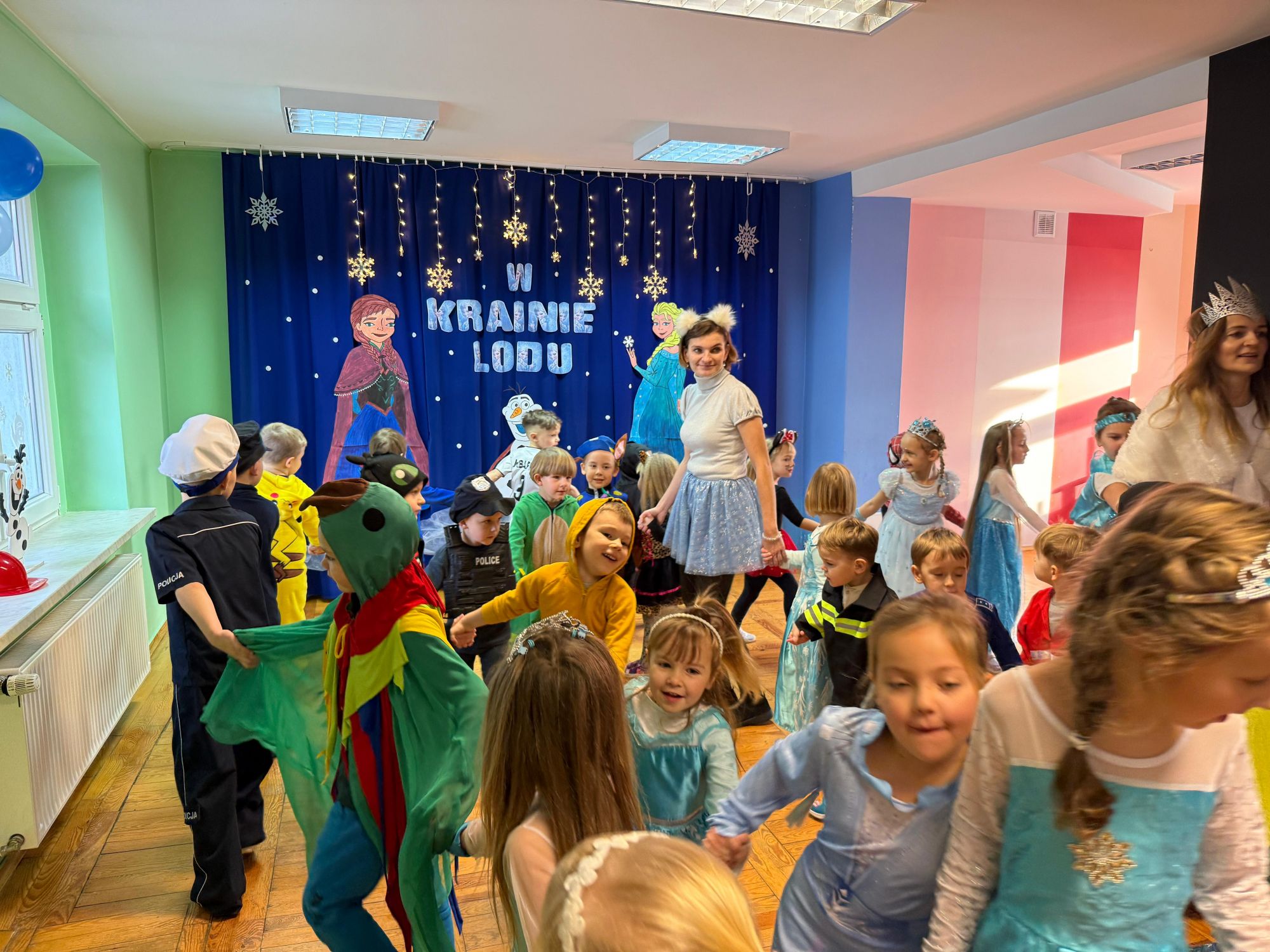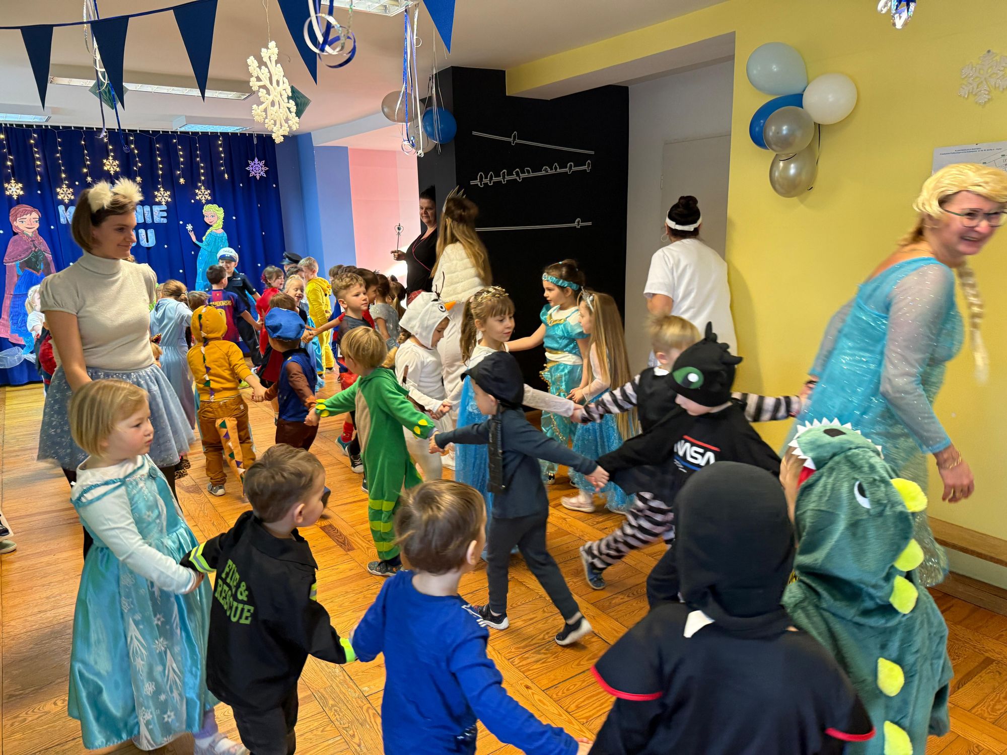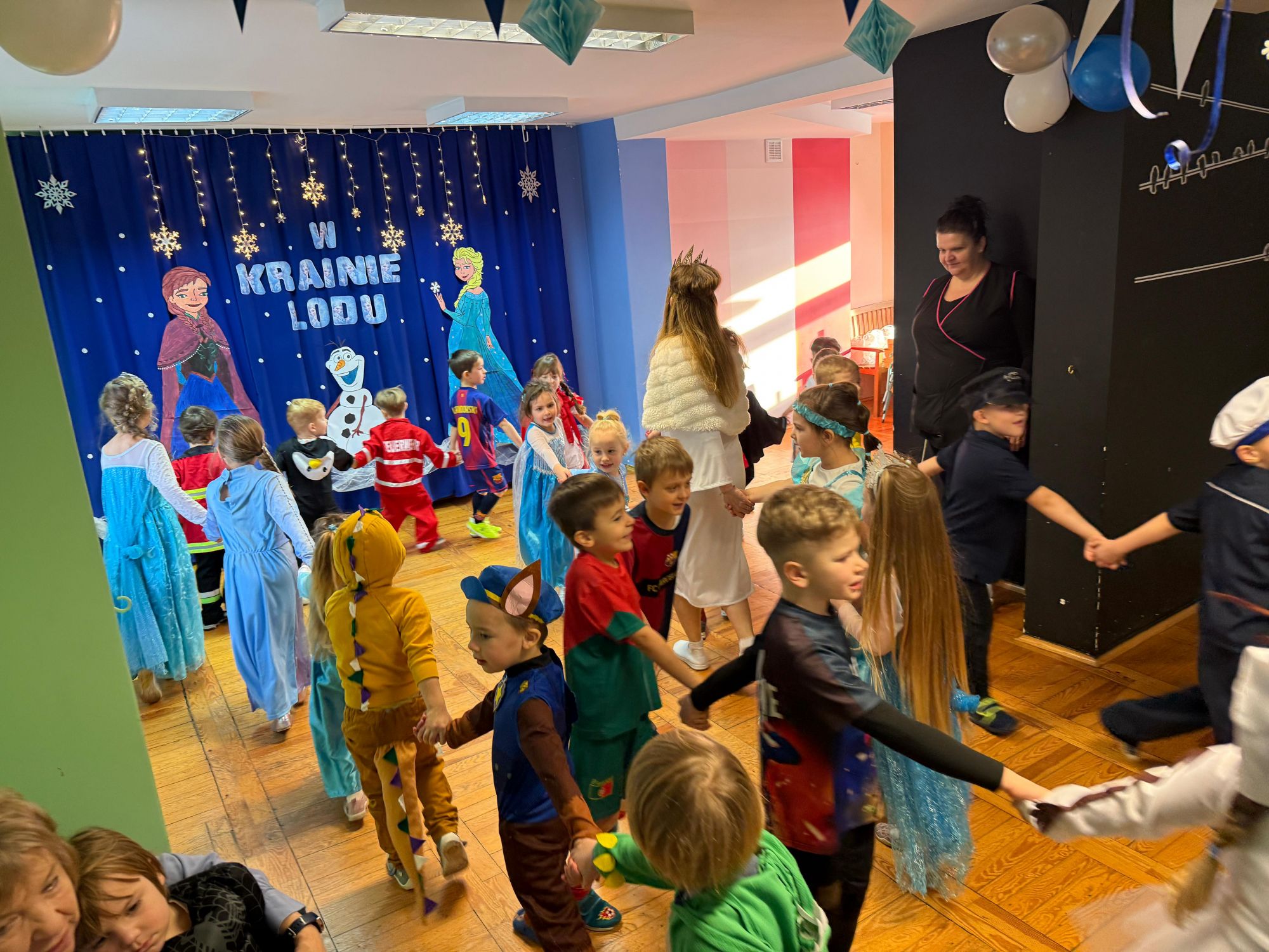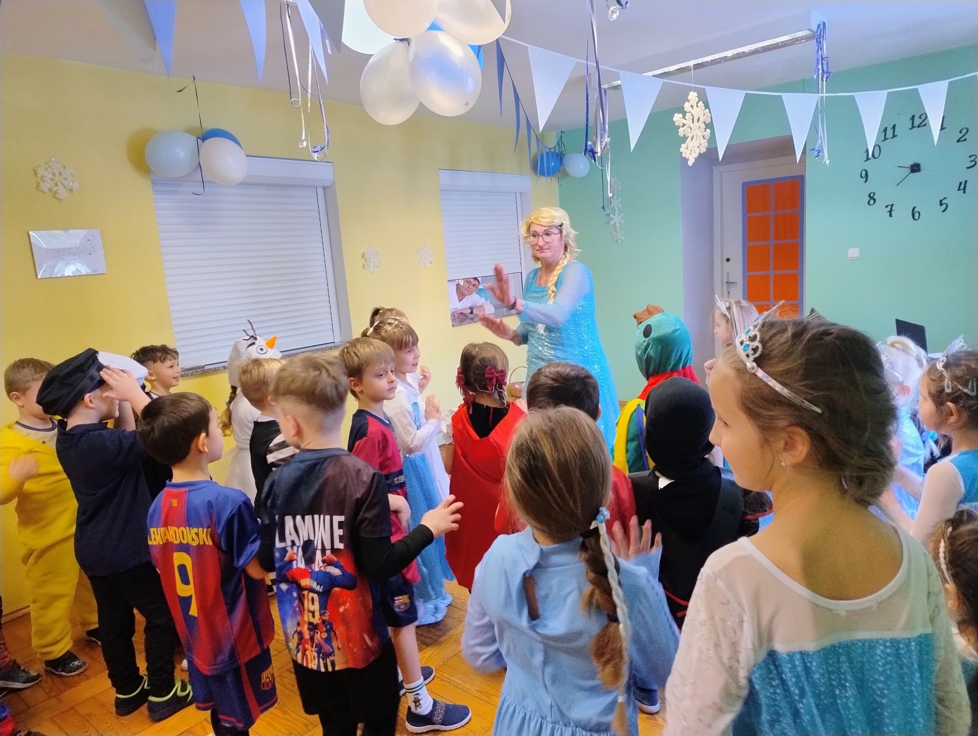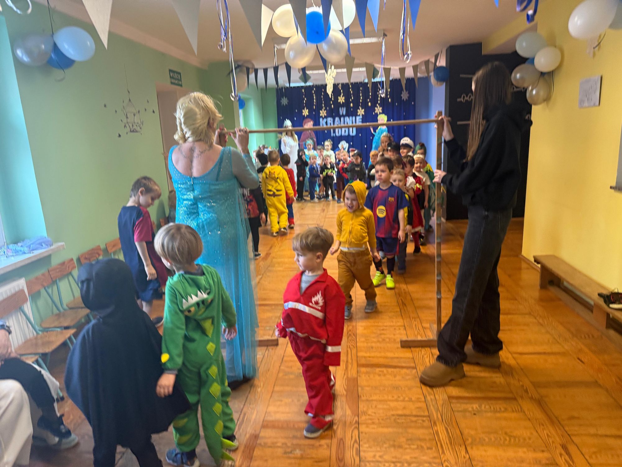 15 stycznia w naszym przedszkolu odbył się wyjątkowy bal karnawałowy pod hasłem „W krainie lodu”. To pełne radości i uśmiechu wydarzenie poprowadziła pani Barbara Koprek z firmy Skeleton, która zadbała o wspaniałą atmosferę oraz mnóstwo atrakcji dla najmłodszych. Tego dnia dzieci przyszły do przedszkola przebrane za swoich ulubionych bohaterów z bajek, filmów i nie tylko. Wśród barwnego tłumu można było spotkać m.in. Elsy, Królowe Śniegu, Olafa, bohaterów Psiego Patrolu, policjantów, piłkarzy oraz wiele innych fantastycznych postaci. Sala została specjalnie na tę okazję pięknie udekorowana balonami, girlandami i serpentynami, które doskonale wpisywały się w zimową tematykę balu. Na przedszkolaki czekało mnóstwo atrakcji – wspólne tańce, wesołe konkurencje oraz różnorodne zadania, w których dzieci chętnie brały udział razem z paniami. Nie zabrakło również chwili na odpoczynek i ugaszenie pragnienia. Po radosnych zabawach na dzieci czekał pyszny poczęstunek w postaci deseru „Śnieżna kraina”- kolorowej galaretki, która wszystkim bardzo smakowała. Zwieńczeniem tego wyjątkowego dnia była miła niespodzianka. Przedszkole odwiedził Stitch - kosmiczna postać z bajki Disneya, wywołując u dzieci ogromne emocje i szerokie uśmiechy. Bal karnawałowy był pełen radości, śmiechu i niezapomnianych wrażeń, a wspólna zabawa na długo pozostanie w pamięci wszystkich uczestników.