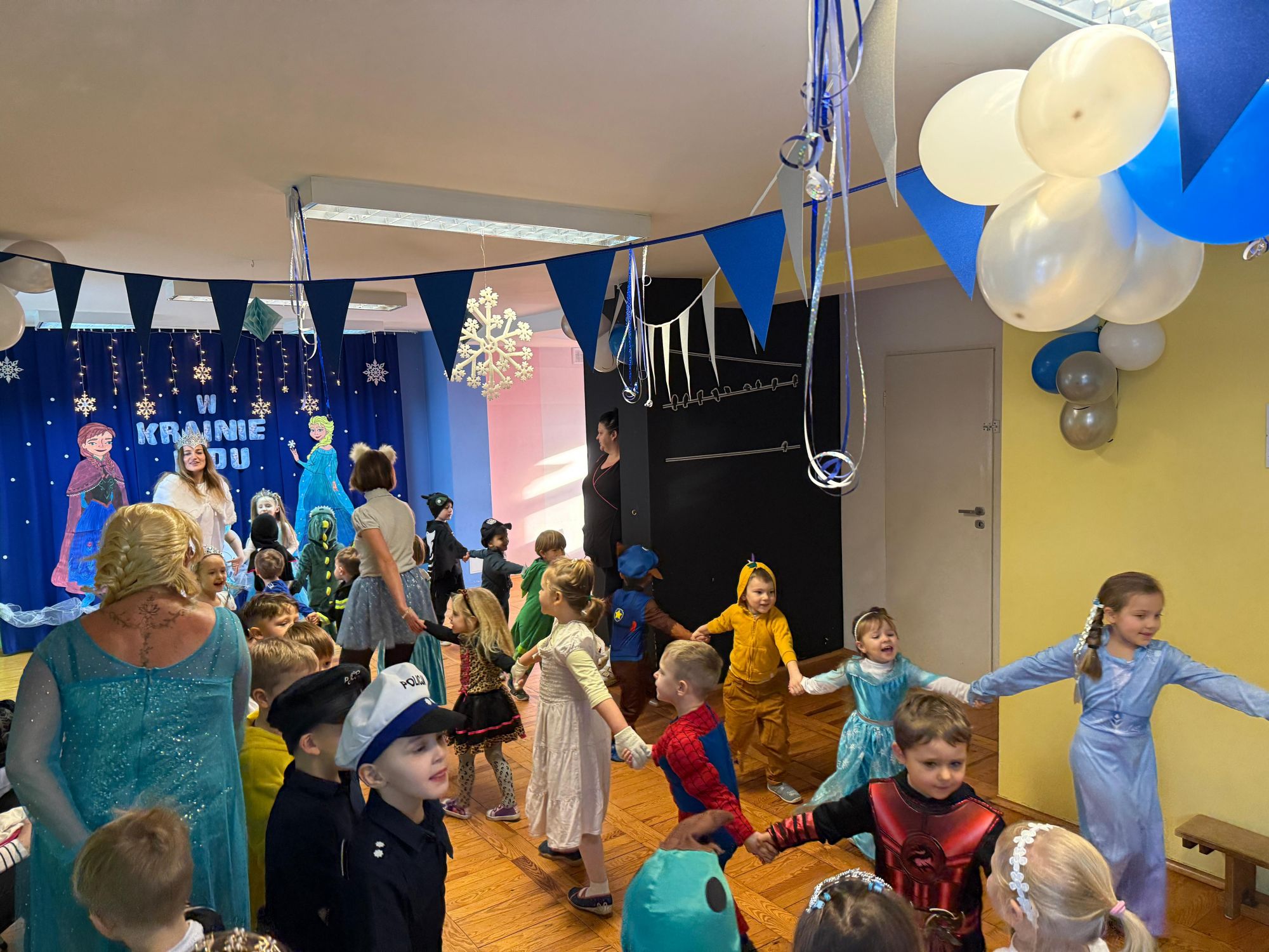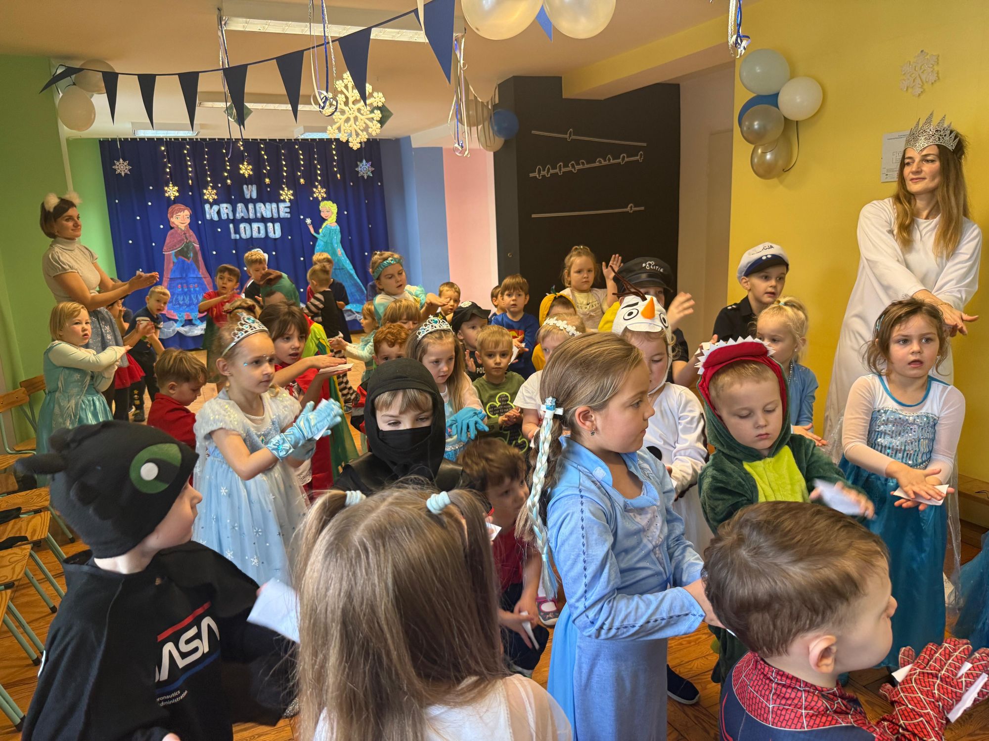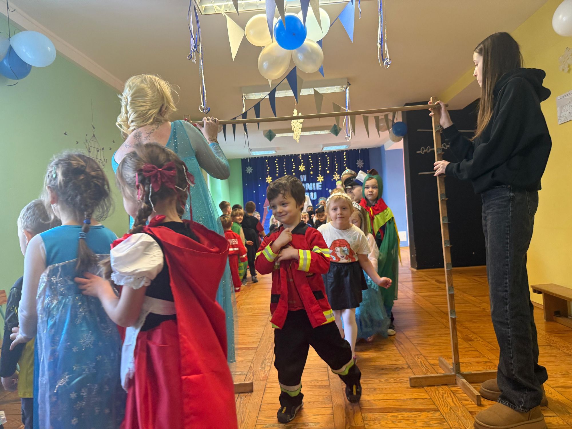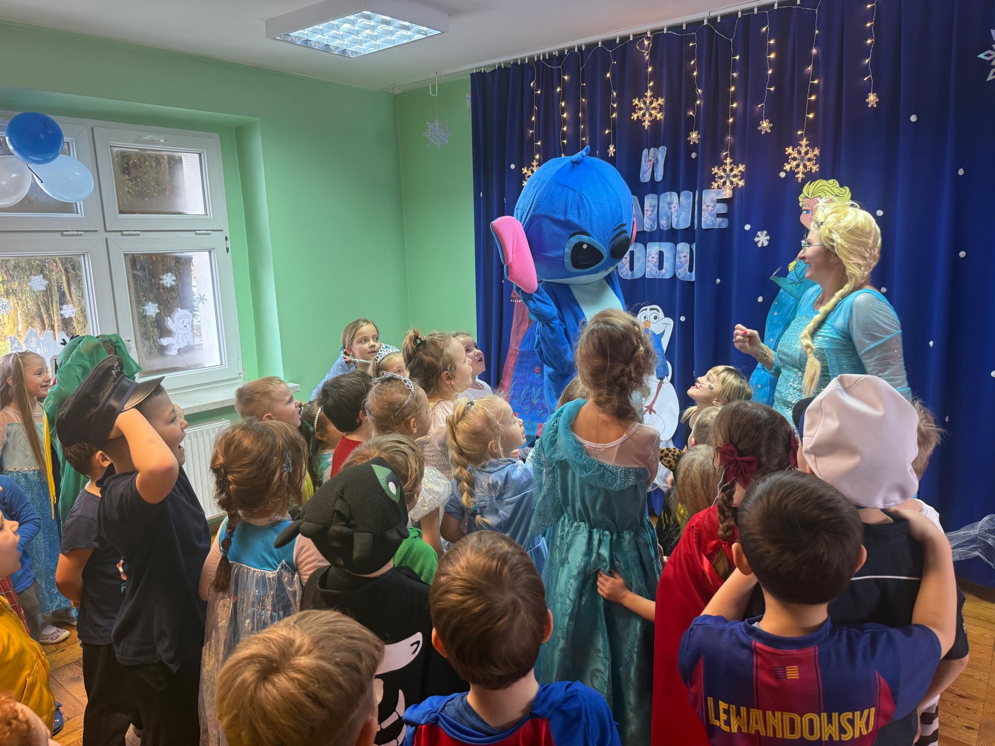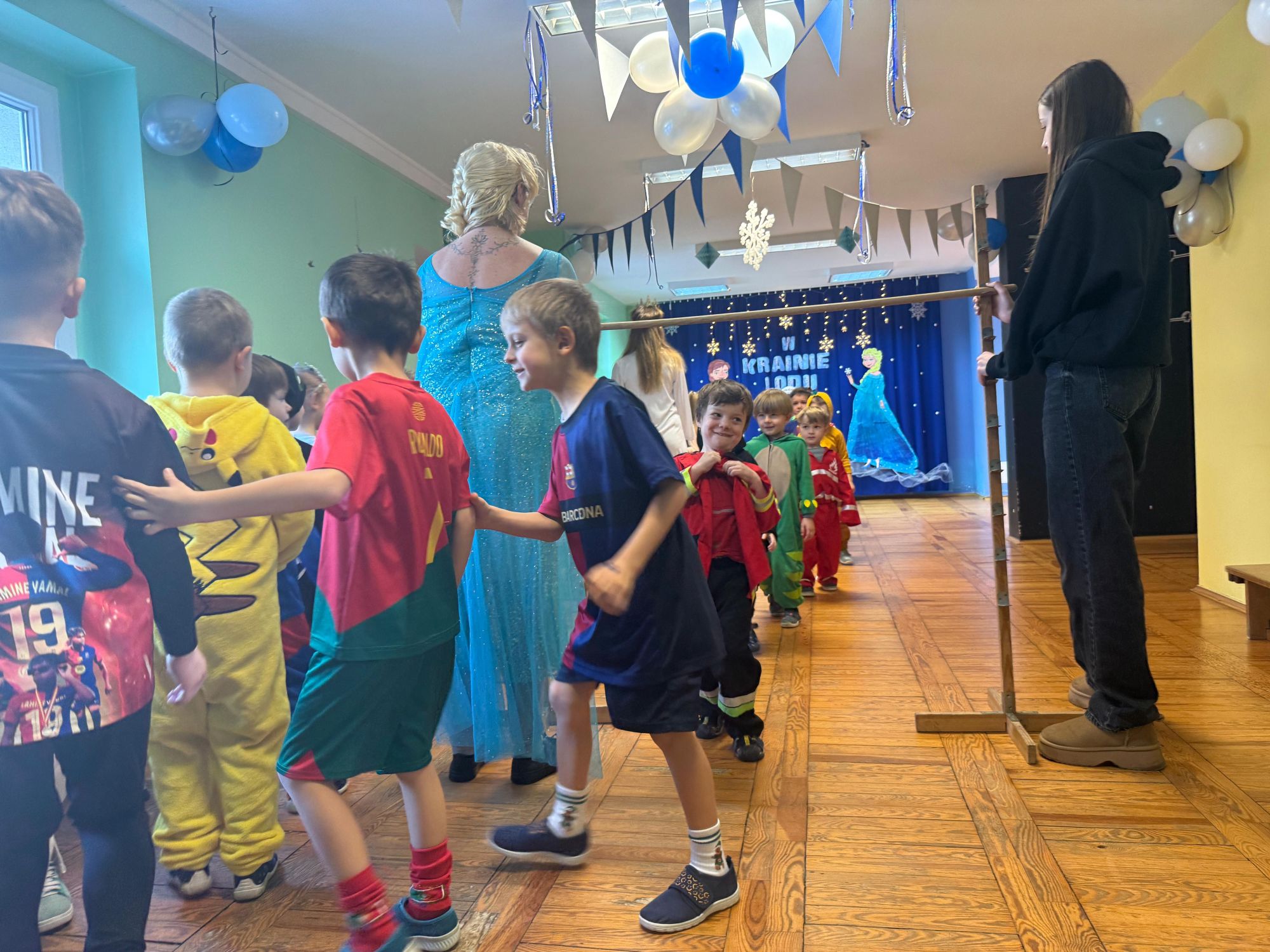 15 stycznia w naszym przedszkolu odbył się wyjątkowy bal karnawałowy pod hasłem „W krainie lodu”. To pełne radości i uśmiechu wydarzenie poprowadziła pani Barbara Koprek z firmy Skeleton, która zadbała o wspaniałą atmosferę oraz mnóstwo atrakcji dla najmłodszych. Tego dnia dzieci przyszły do przedszkola przebrane za swoich ulubionych bohaterów z bajek, filmów i nie tylko. Wśród barwnego tłumu można było spotkać m.in. Elsy, Królowe Śniegu, Olafa, bohaterów Psiego Patrolu, policjantów, piłkarzy oraz wiele innych fantastycznych postaci. Sala została specjalnie na tę okazję pięknie udekorowana balonami, girlandami i serpentynami, które doskonale wpisywały się w zimową tematykę balu. Na przedszkolaki czekało mnóstwo atrakcji – wspólne tańce, wesołe konkurencje oraz różnorodne zadania, w których dzieci chętnie brały udział razem z paniami. Nie zabrakło również chwili na odpoczynek i ugaszenie pragnienia. Po radosnych zabawach na dzieci czekał pyszny poczęstunek w postaci deseru „Śnieżna kraina”- kolorowej galaretki, która wszystkim bardzo smakowała. Zwieńczeniem tego wyjątkowego dnia była miła niespodzianka. Przedszkole odwiedził Stitch - kosmiczna postać z bajki Disneya, wywołując u dzieci ogromne emocje i szerokie uśmiechy. Bal karnawałowy był pełen radości, śmiechu i niezapomnianych wrażeń, a wspólna zabawa na długo pozostanie w pamięci wszystkich uczestników.