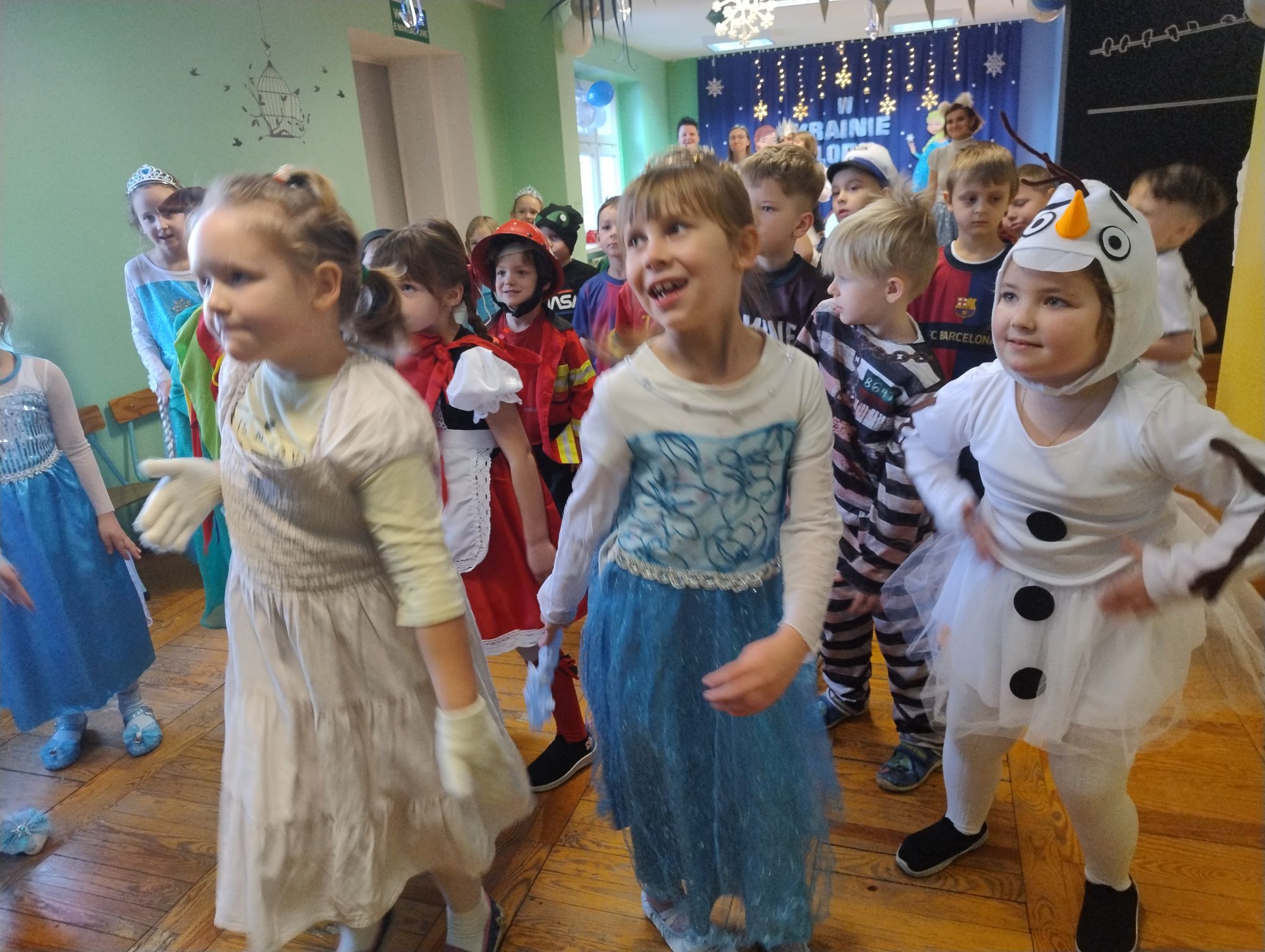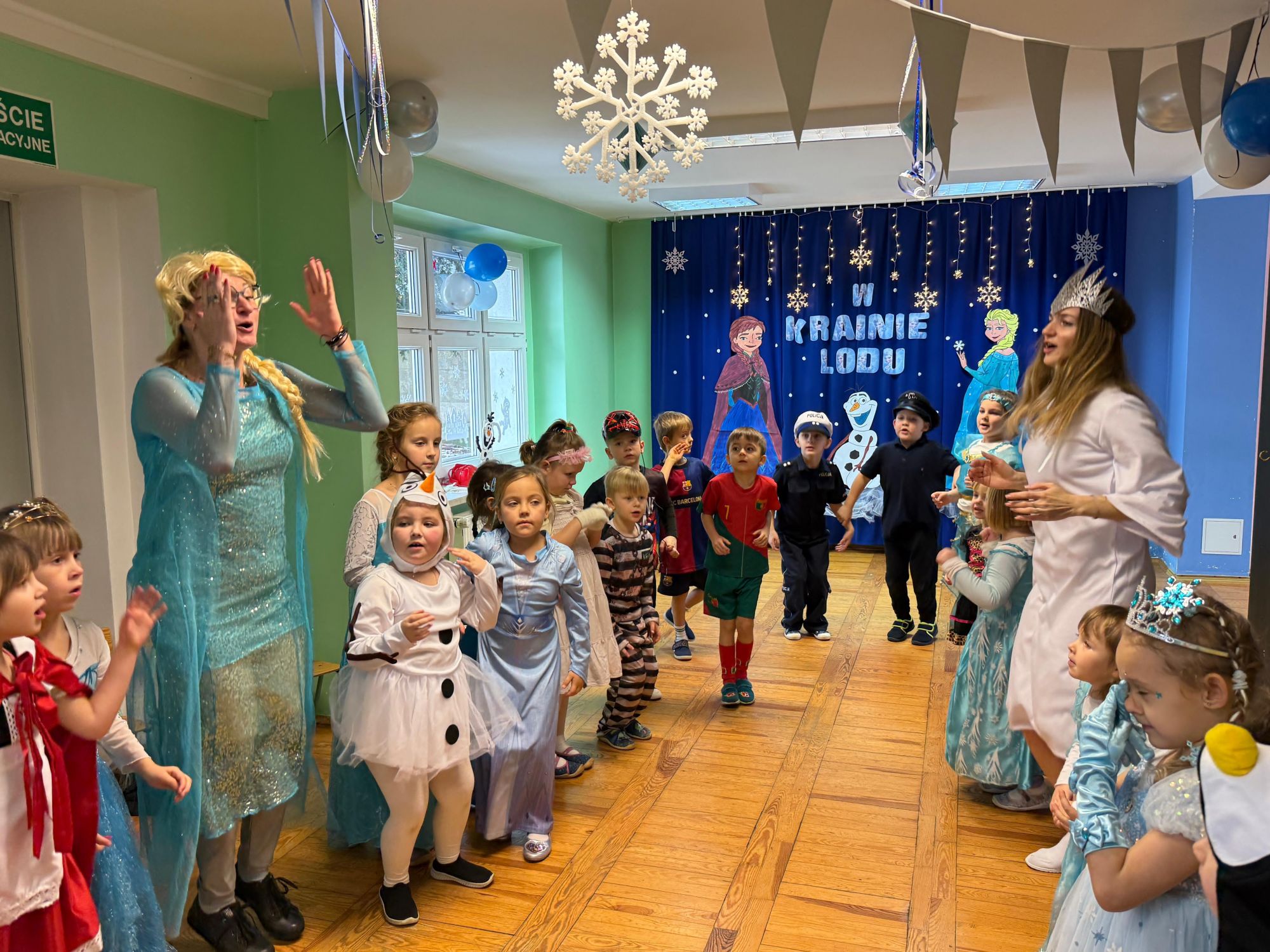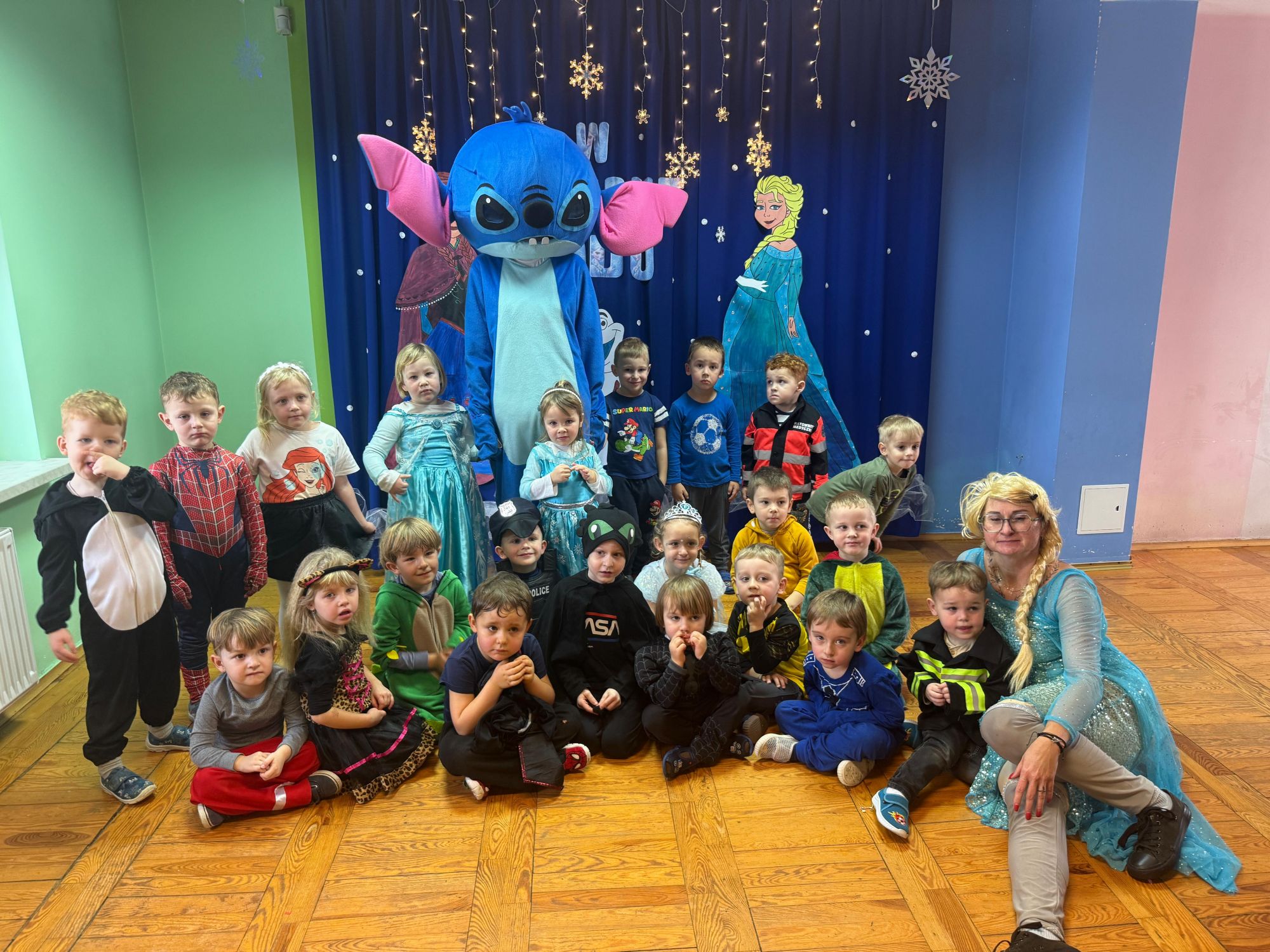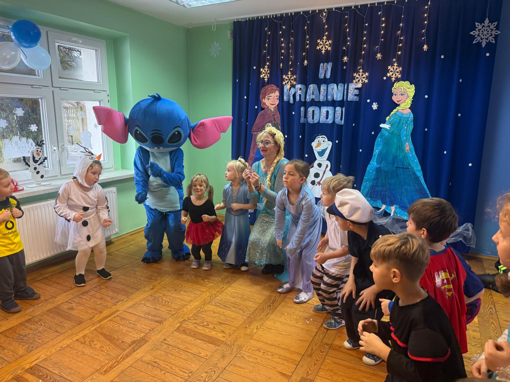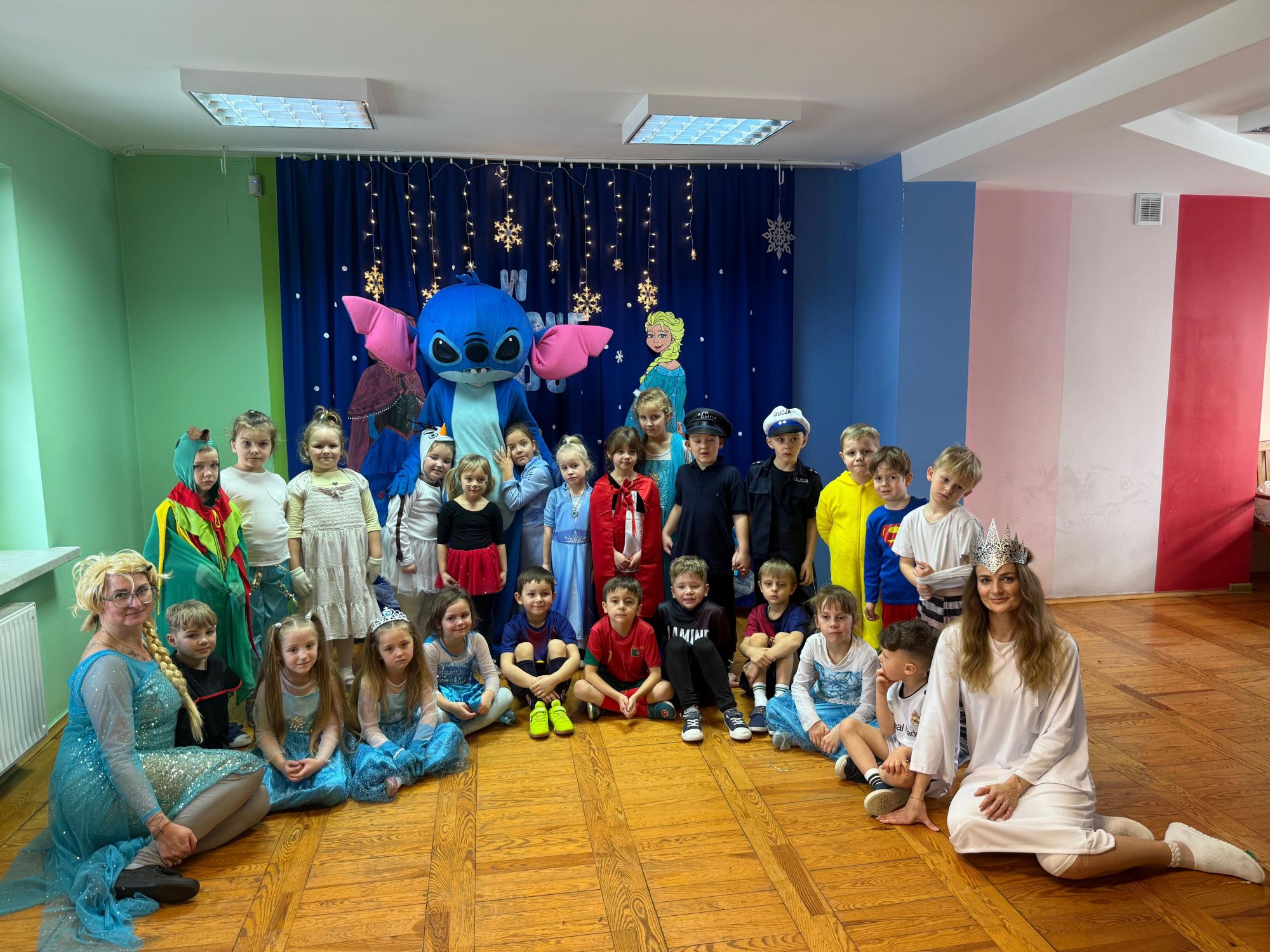 15 stycznia w naszym przedszkolu odbył się wyjątkowy bal karnawałowy pod hasłem „W krainie lodu”. To pełne radości i uśmiechu wydarzenie poprowadziła pani Barbara Koprek z firmy Skeleton, która zadbała o wspaniałą atmosferę oraz mnóstwo atrakcji dla najmłodszych. Tego dnia dzieci przyszły do przedszkola przebrane za swoich ulubionych bohaterów z bajek, filmów i nie tylko. Wśród barwnego tłumu można było spotkać m.in. Elsy, Królowe Śniegu, Olafa, bohaterów Psiego Patrolu, policjantów, piłkarzy oraz wiele innych fantastycznych postaci. Sala została specjalnie na tę okazję pięknie udekorowana balonami, girlandami i serpentynami, które doskonale wpisywały się w zimową tematykę balu. Na przedszkolaki czekało mnóstwo atrakcji – wspólne tańce, wesołe konkurencje oraz różnorodne zadania, w których dzieci chętnie brały udział razem z paniami. Nie zabrakło również chwili na odpoczynek i ugaszenie pragnienia. Po radosnych zabawach na dzieci czekał pyszny poczęstunek w postaci deseru „Śnieżna kraina”- kolorowej galaretki, która wszystkim bardzo smakowała. Zwieńczeniem tego wyjątkowego dnia była miła niespodzianka. Przedszkole odwiedził Stitch - kosmiczna postać z bajki Disneya, wywołując u dzieci ogromne emocje i szerokie uśmiechy. Bal karnawałowy był pełen radości, śmiechu i niezapomnianych wrażeń, a wspólna zabawa na długo pozostanie w pamięci wszystkich uczestników.