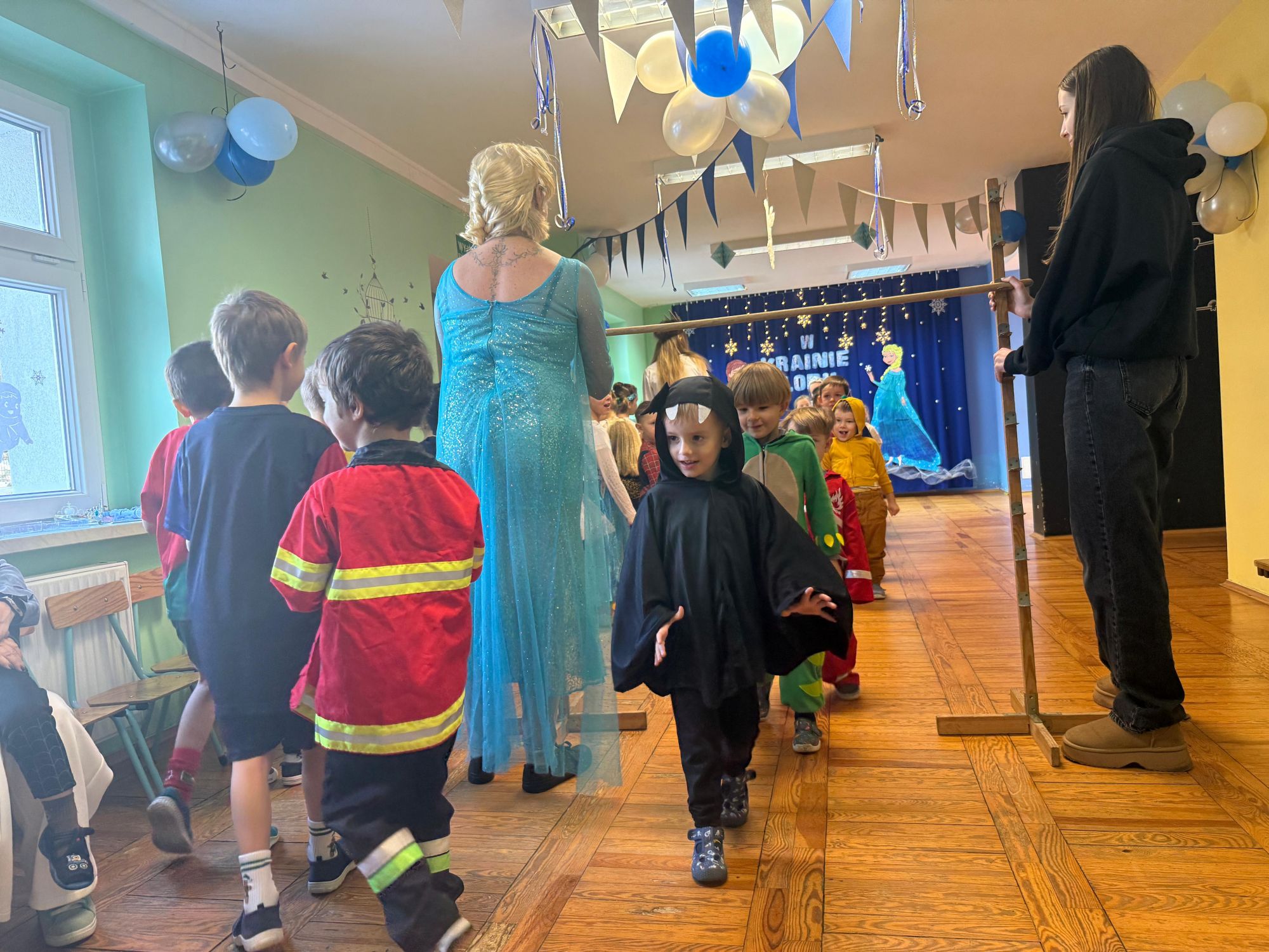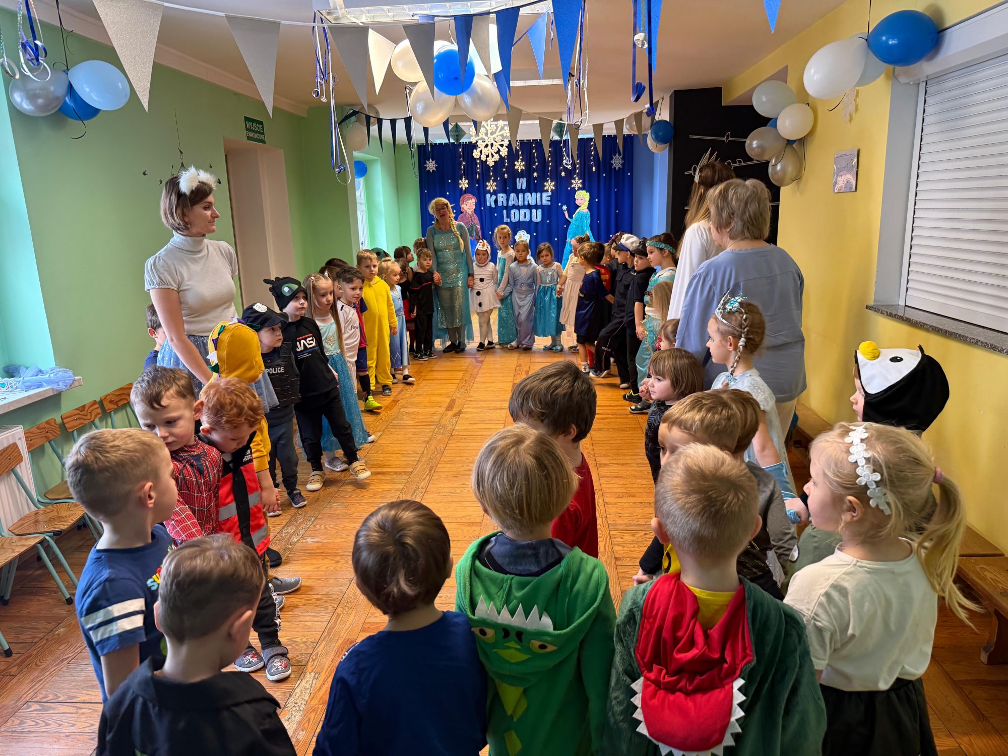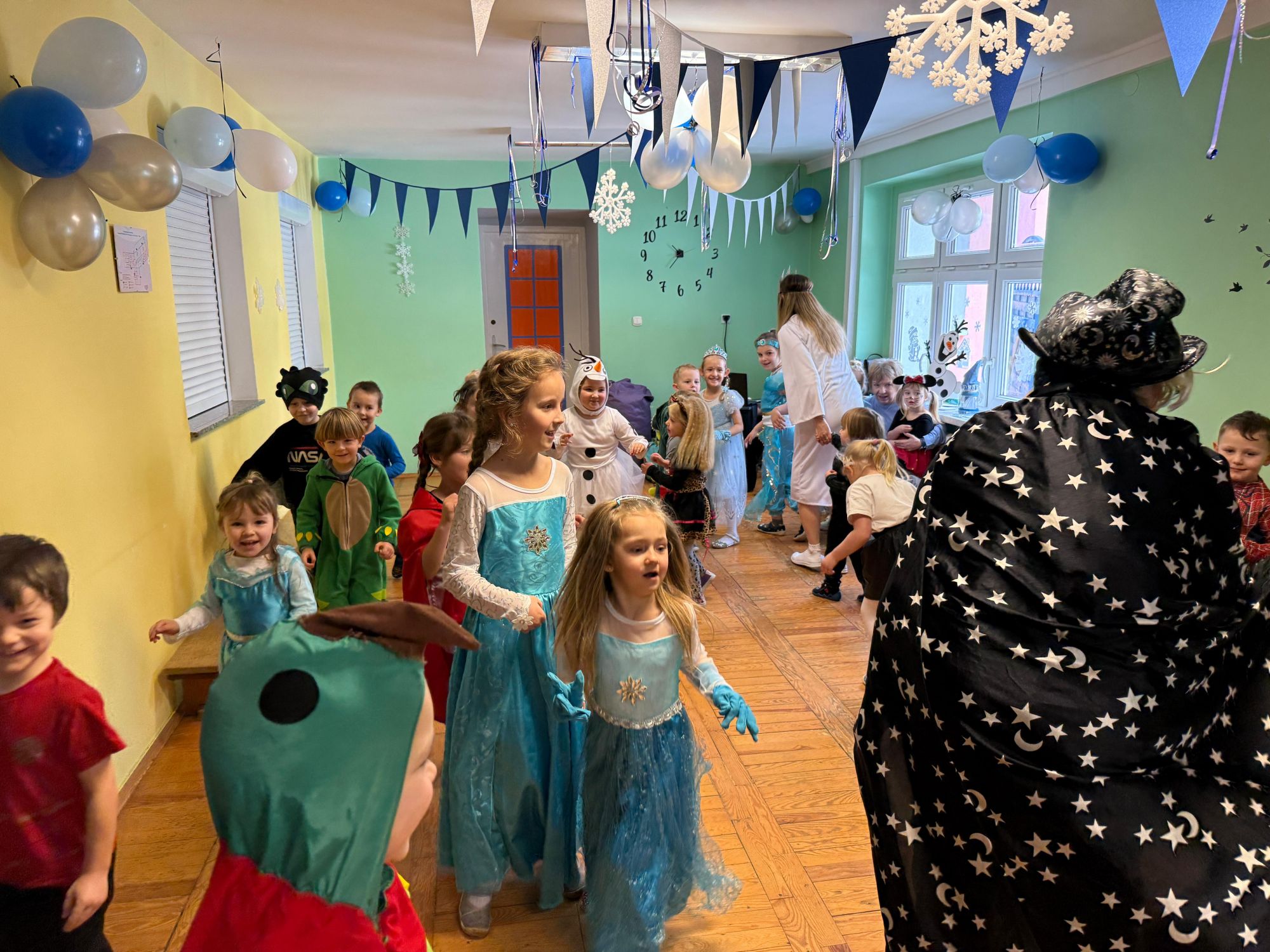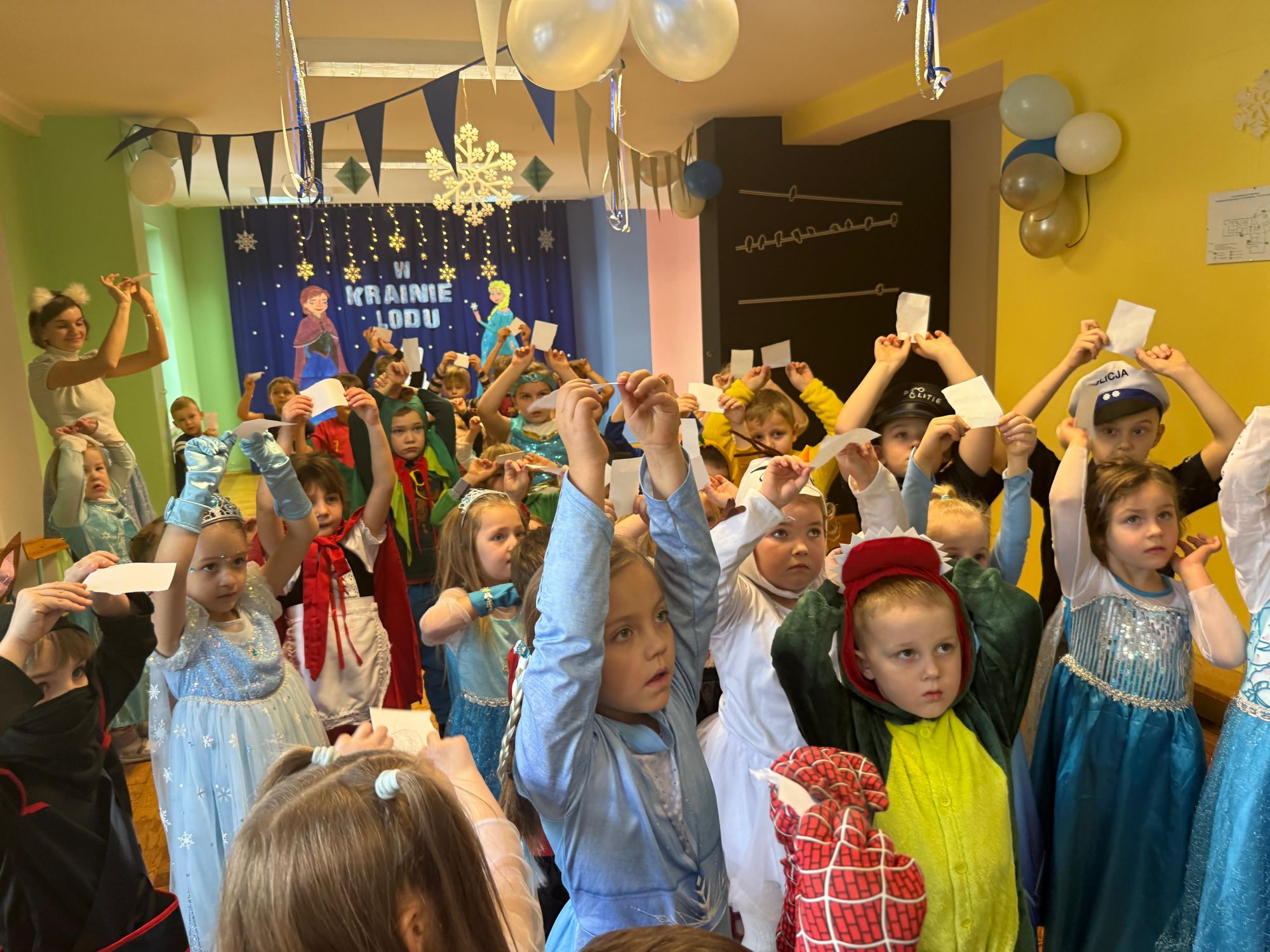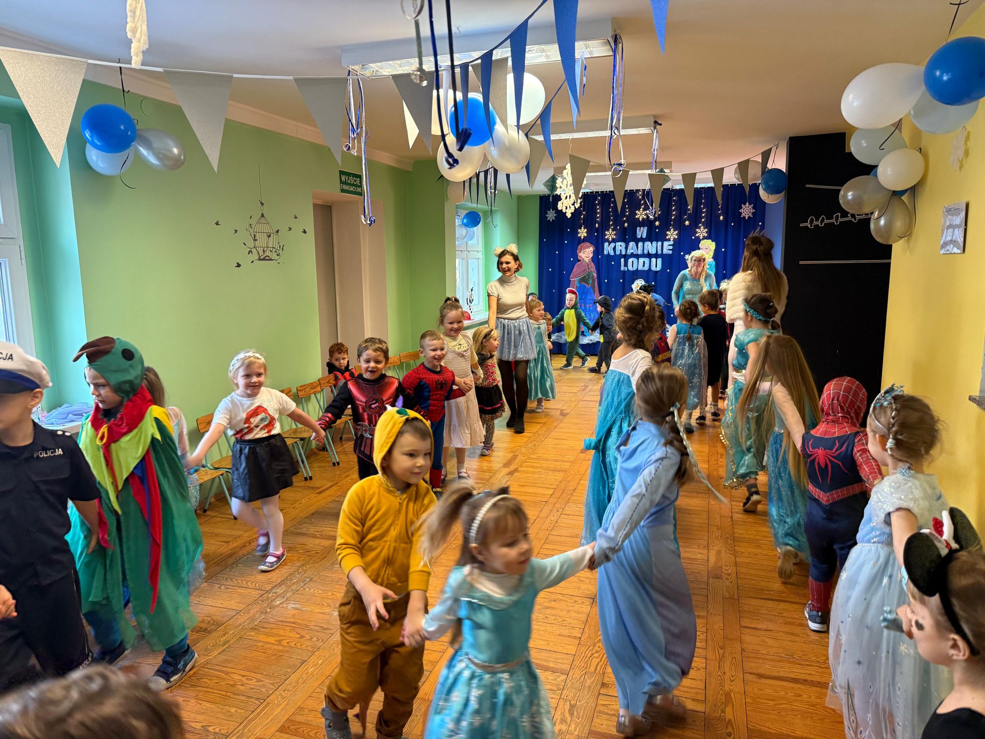 15 stycznia w naszym przedszkolu odbył się wyjątkowy bal karnawałowy pod hasłem „W krainie lodu”. To pełne radości i uśmiechu wydarzenie poprowadziła pani Barbara Koprek z firmy Skeleton, która zadbała o wspaniałą atmosferę oraz mnóstwo atrakcji dla najmłodszych. Tego dnia dzieci przyszły do przedszkola przebrane za swoich ulubionych bohaterów z bajek, filmów i nie tylko. Wśród barwnego tłumu można było spotkać m.in. Elsy, Królowe Śniegu, Olafa, bohaterów Psiego Patrolu, policjantów, piłkarzy oraz wiele innych fantastycznych postaci. Sala została specjalnie na tę okazję pięknie udekorowana balonami, girlandami i serpentynami, które doskonale wpisywały się w zimową tematykę balu. Na przedszkolaki czekało mnóstwo atrakcji – wspólne tańce, wesołe konkurencje oraz różnorodne zadania, w których dzieci chętnie brały udział razem z paniami. Nie zabrakło również chwili na odpoczynek i ugaszenie pragnienia. Po radosnych zabawach na dzieci czekał pyszny poczęstunek w postaci deseru „Śnieżna kraina”- kolorowej galaretki, która wszystkim bardzo smakowała. Zwieńczeniem tego wyjątkowego dnia była miła niespodzianka. Przedszkole odwiedził Stitch - kosmiczna postać z bajki Disneya, wywołując u dzieci ogromne emocje i szerokie uśmiechy. Bal karnawałowy był pełen radości, śmiechu i niezapomnianych wrażeń, a wspólna zabawa na długo pozostanie w pamięci wszystkich uczestników.