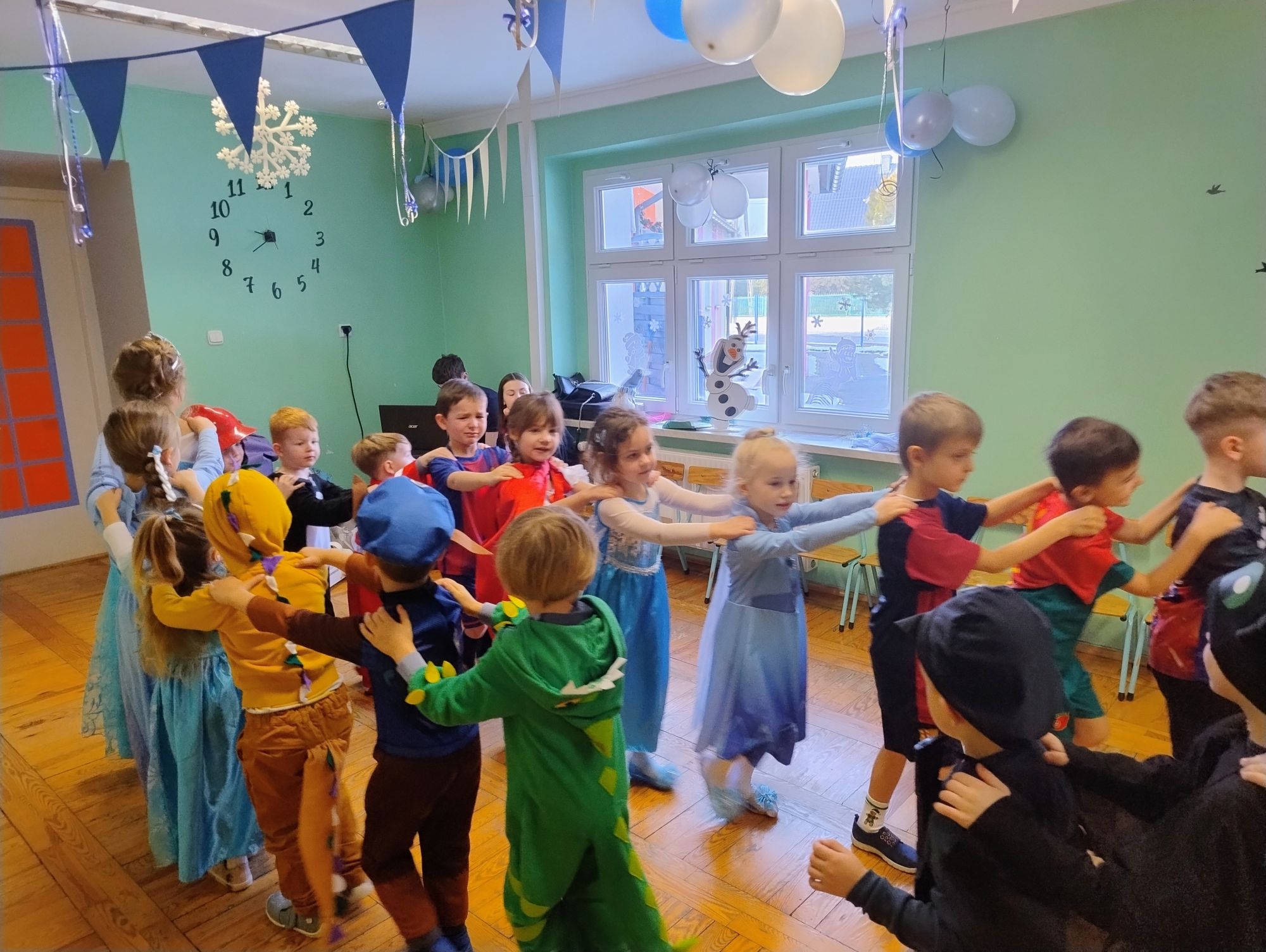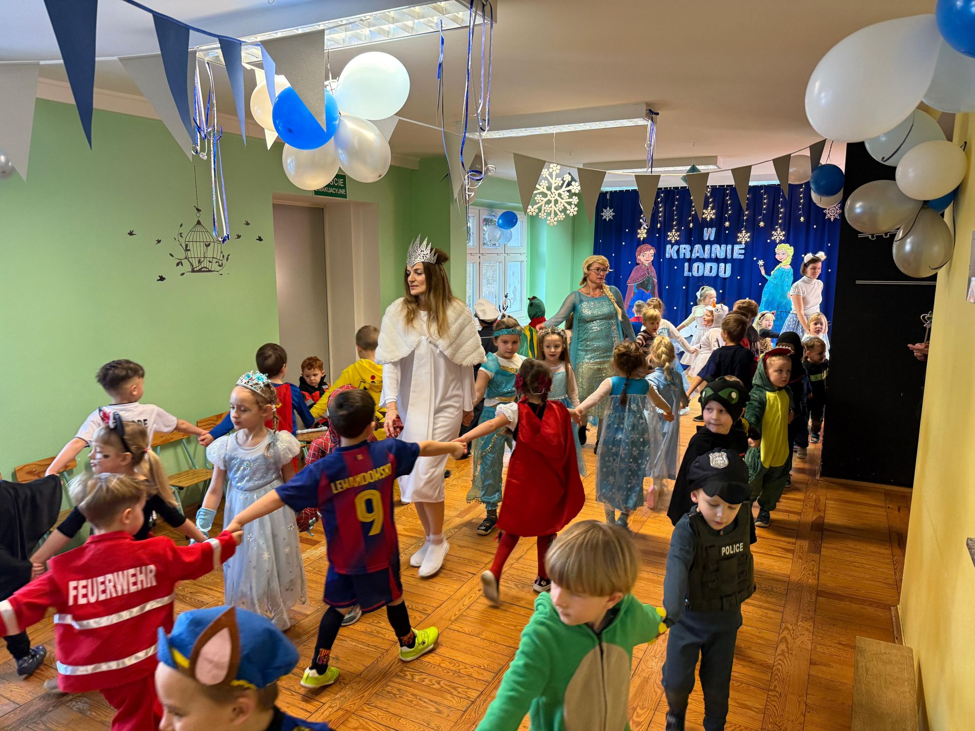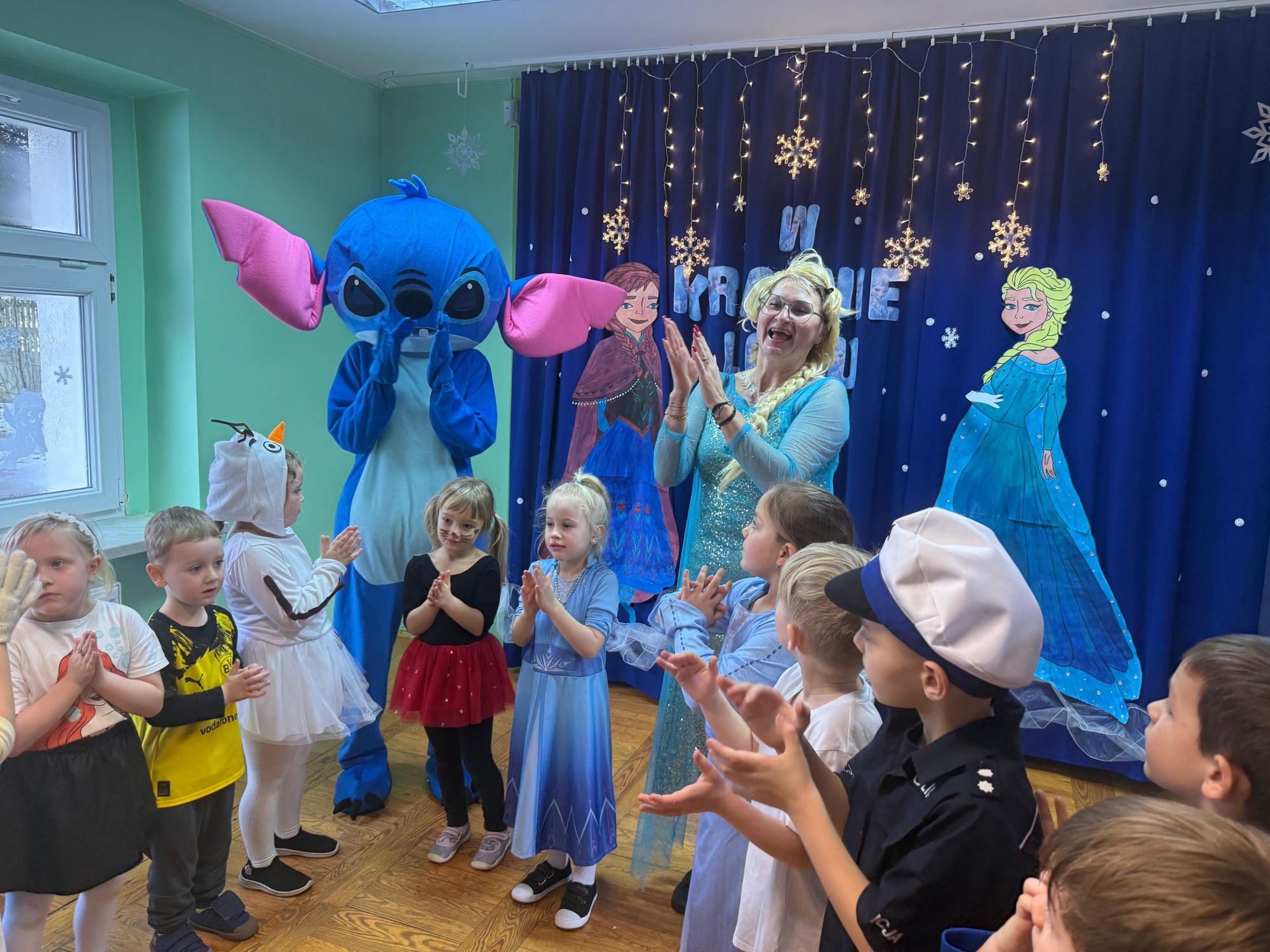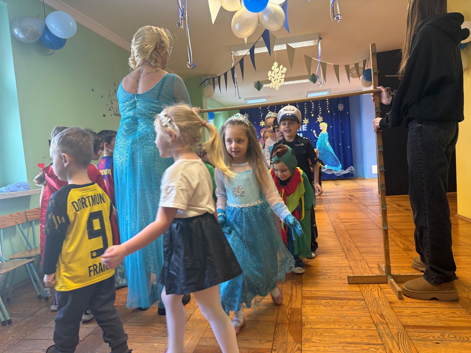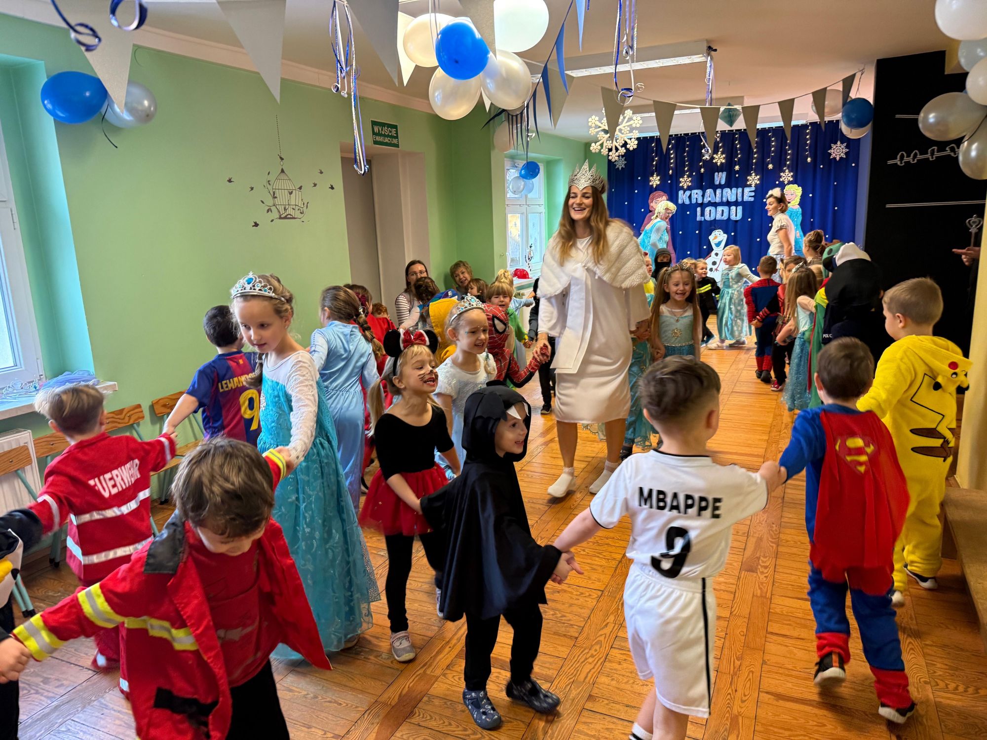 15 stycznia w naszym przedszkolu odbył się wyjątkowy bal karnawałowy pod hasłem „W krainie lodu”. To pełne radości i uśmiechu wydarzenie poprowadziła pani Barbara Koprek z firmy Skeleton, która zadbała o wspaniałą atmosferę oraz mnóstwo atrakcji dla najmłodszych. Tego dnia dzieci przyszły do przedszkola przebrane za swoich ulubionych bohaterów z bajek, filmów i nie tylko. Wśród barwnego tłumu można było spotkać m.in. Elsy, Królowe Śniegu, Olafa, bohaterów Psiego Patrolu, policjantów, piłkarzy oraz wiele innych fantastycznych postaci. Sala została specjalnie na tę okazję pięknie udekorowana balonami, girlandami i serpentynami, które doskonale wpisywały się w zimową tematykę balu. Na przedszkolaki czekało mnóstwo atrakcji – wspólne tańce, wesołe konkurencje oraz różnorodne zadania, w których dzieci chętnie brały udział razem z paniami. Nie zabrakło również chwili na odpoczynek i ugaszenie pragnienia. Po radosnych zabawach na dzieci czekał pyszny poczęstunek w postaci deseru „Śnieżna kraina”- kolorowej galaretki, która wszystkim bardzo smakowała. Zwieńczeniem tego wyjątkowego dnia była miła niespodzianka. Przedszkole odwiedził Stitch - kosmiczna postać z bajki Disneya, wywołując u dzieci ogromne emocje i szerokie uśmiechy. Bal karnawałowy był pełen radości, śmiechu i niezapomnianych wrażeń, a wspólna zabawa na długo pozostanie w pamięci wszystkich uczestników.