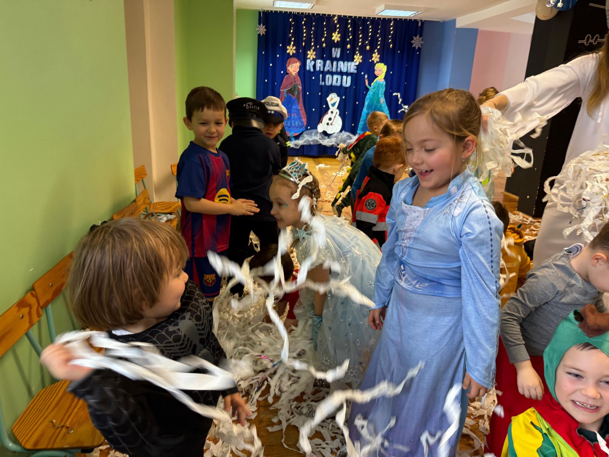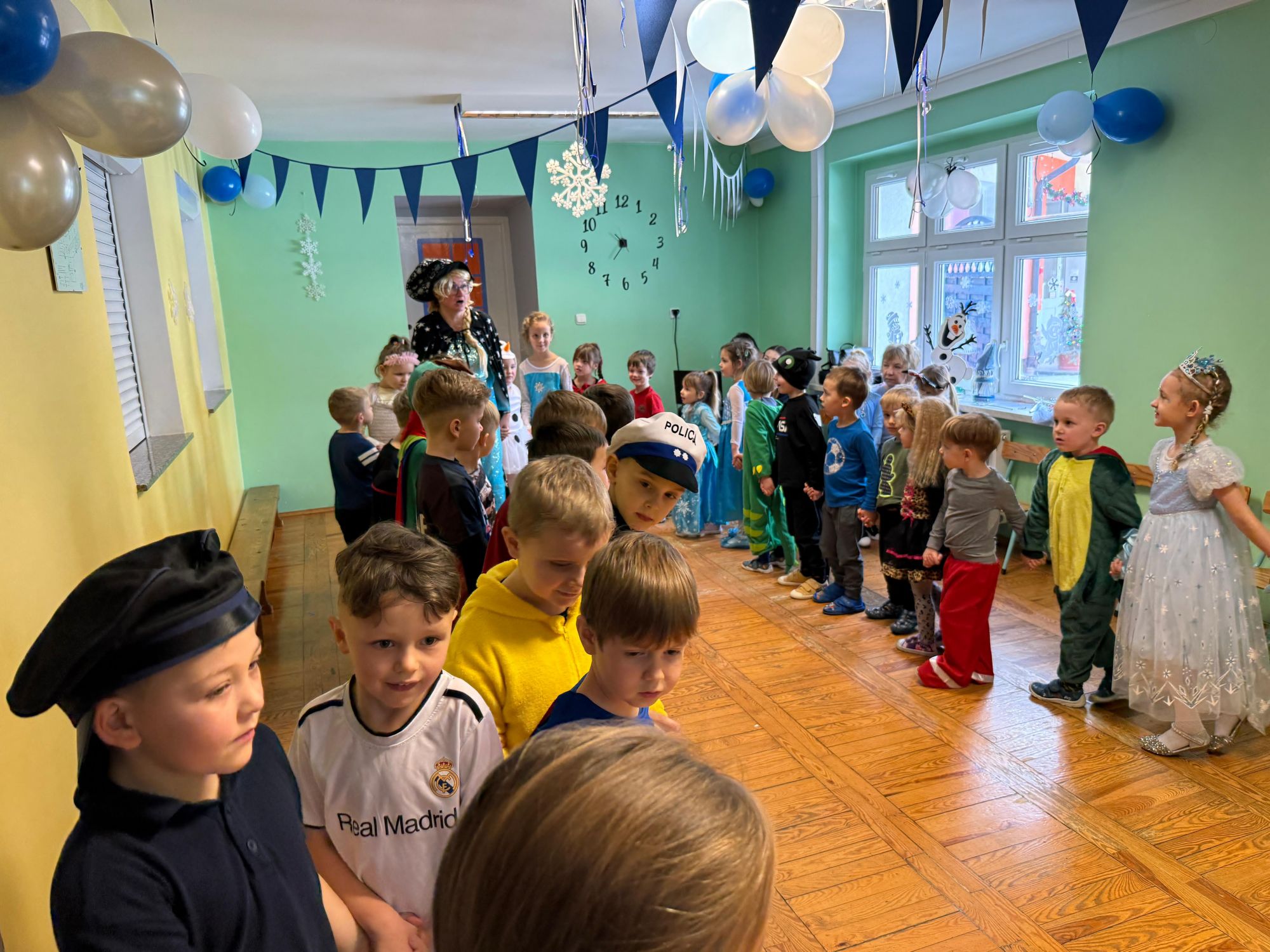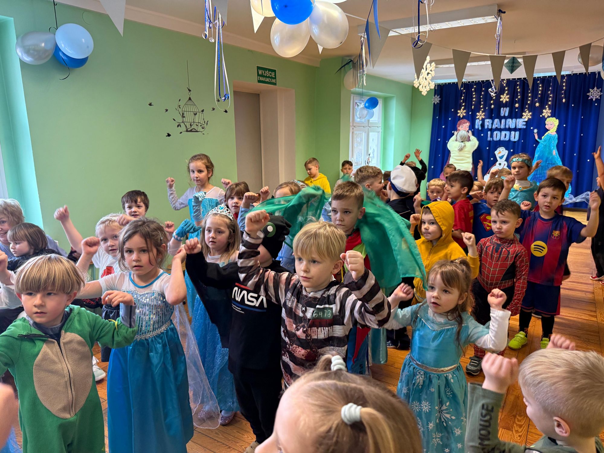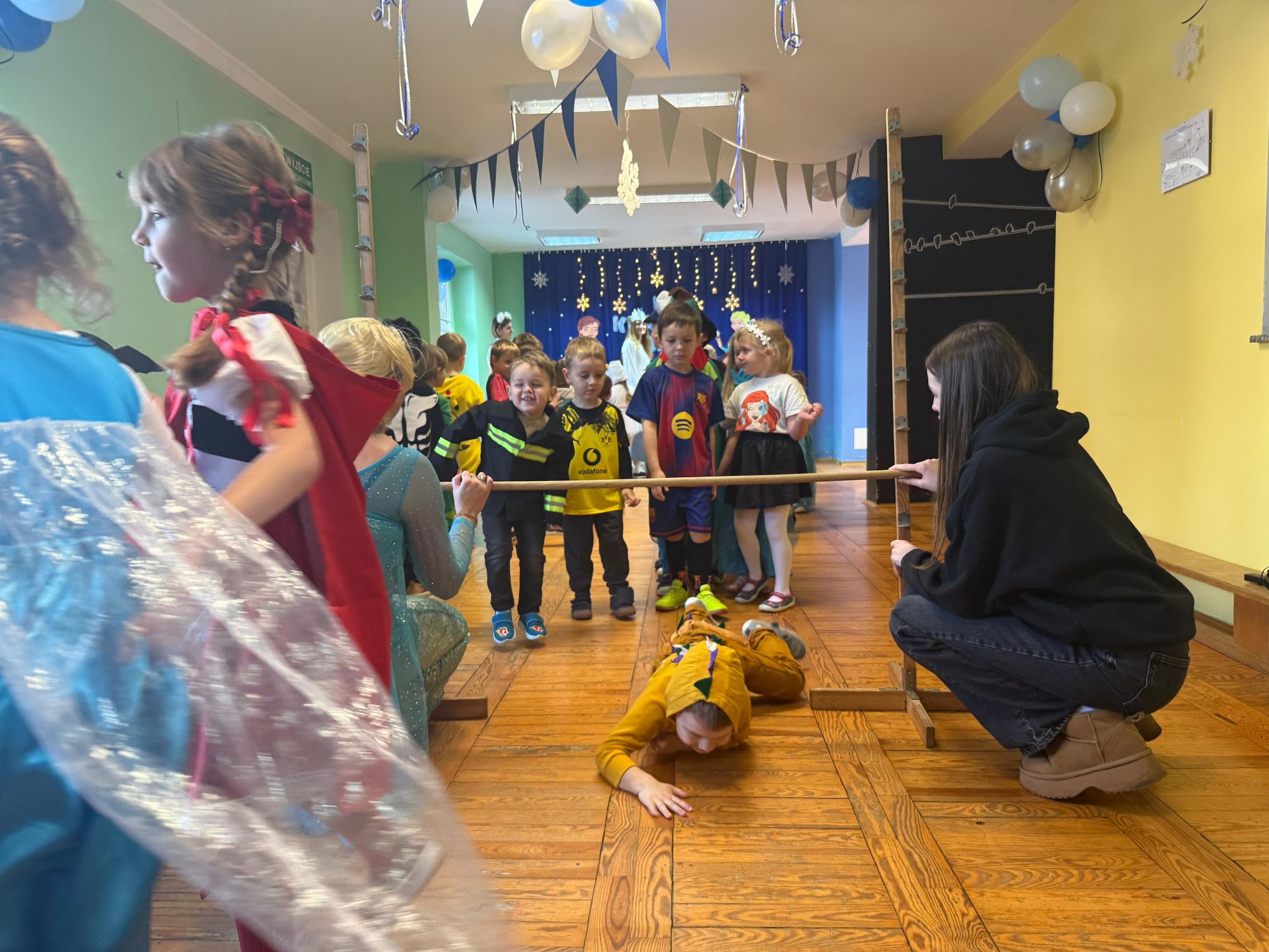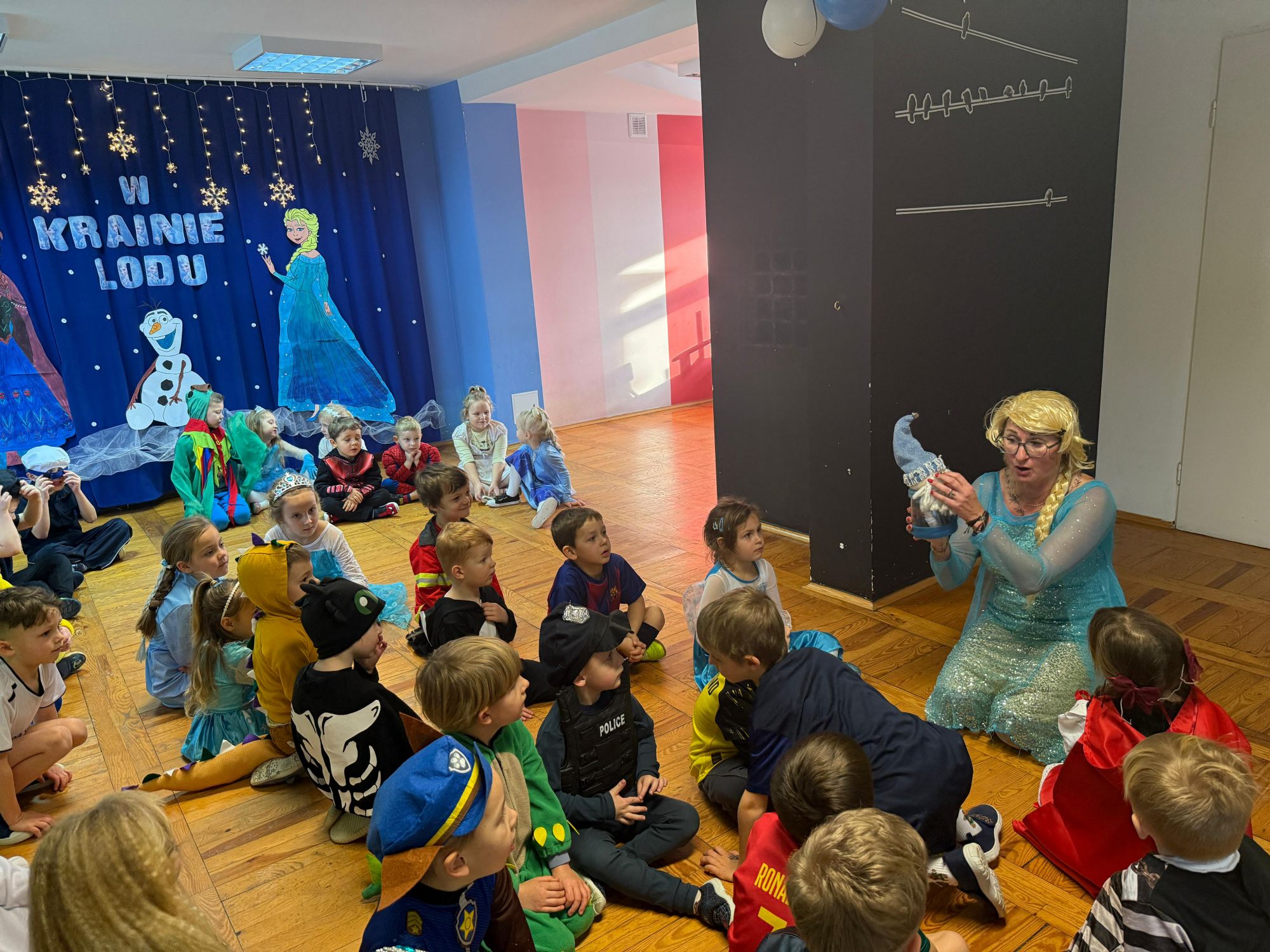 15 stycznia w naszym przedszkolu odbył się wyjątkowy bal karnawałowy pod hasłem „W krainie lodu”. To pełne radości i uśmiechu wydarzenie poprowadziła pani Barbara Koprek z firmy Skeleton, która zadbała o wspaniałą atmosferę oraz mnóstwo atrakcji dla najmłodszych. Tego dnia dzieci przyszły do przedszkola przebrane za swoich ulubionych bohaterów z bajek, filmów i nie tylko. Wśród barwnego tłumu można było spotkać m.in. Elsy, Królowe Śniegu, Olafa, bohaterów Psiego Patrolu, policjantów, piłkarzy oraz wiele innych fantastycznych postaci. Sala została specjalnie na tę okazję pięknie udekorowana balonami, girlandami i serpentynami, które doskonale wpisywały się w zimową tematykę balu. Na przedszkolaki czekało mnóstwo atrakcji – wspólne tańce, wesołe konkurencje oraz różnorodne zadania, w których dzieci chętnie brały udział razem z paniami. Nie zabrakło również chwili na odpoczynek i ugaszenie pragnienia. Po radosnych zabawach na dzieci czekał pyszny poczęstunek w postaci deseru „Śnieżna kraina”- kolorowej galaretki, która wszystkim bardzo smakowała. Zwieńczeniem tego wyjątkowego dnia była miła niespodzianka. Przedszkole odwiedził Stitch - kosmiczna postać z bajki Disneya, wywołując u dzieci ogromne emocje i szerokie uśmiechy. Bal karnawałowy był pełen radości, śmiechu i niezapomnianych wrażeń, a wspólna zabawa na długo pozostanie w pamięci wszystkich uczestników.