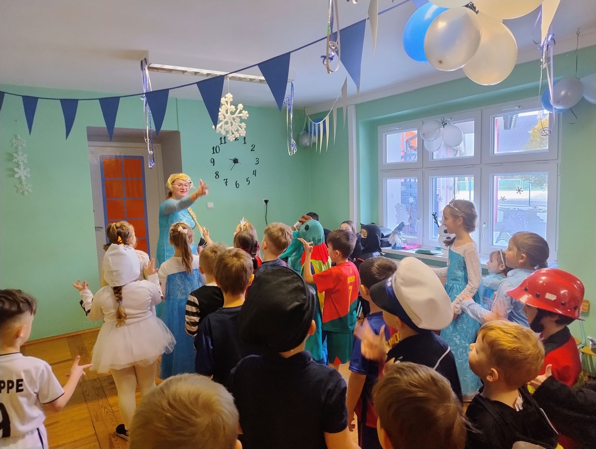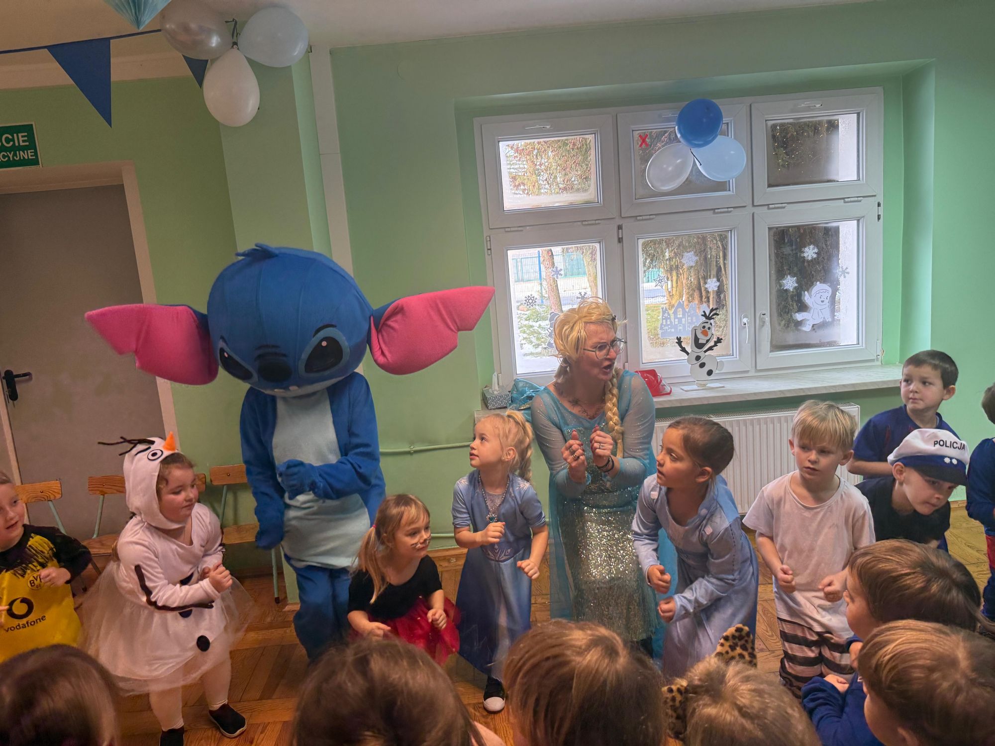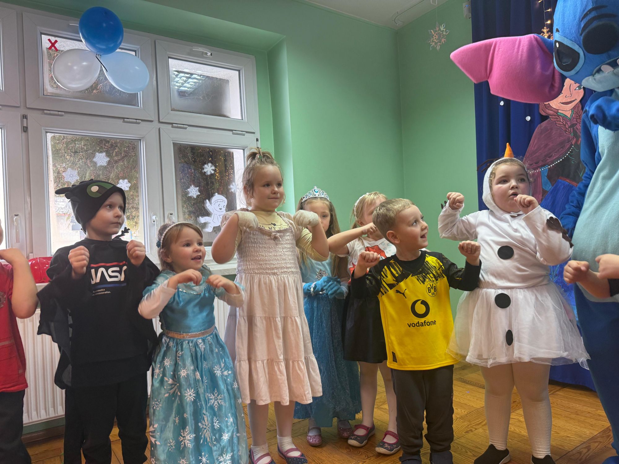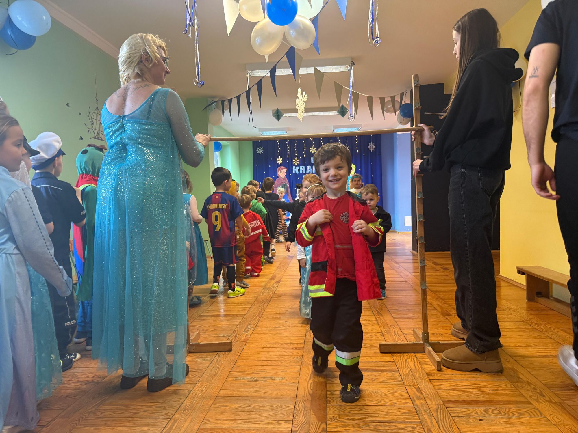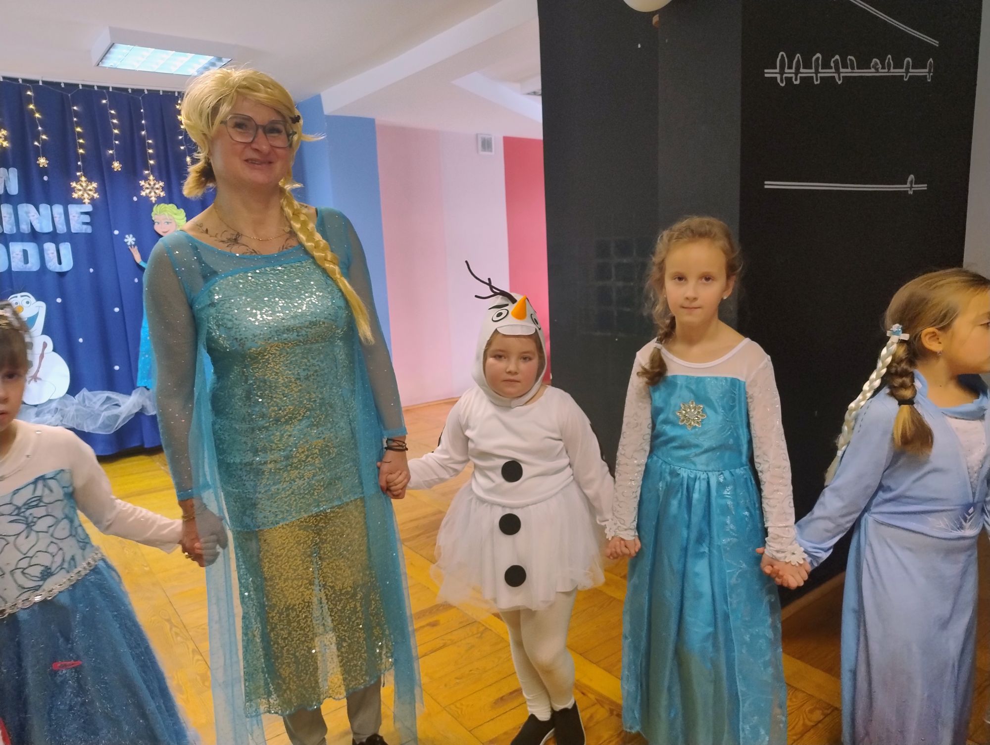 15 stycznia w naszym przedszkolu odbył się wyjątkowy bal karnawałowy pod hasłem „W krainie lodu”. To pełne radości i uśmiechu wydarzenie poprowadziła pani Barbara Koprek z firmy Skeleton, która zadbała o wspaniałą atmosferę oraz mnóstwo atrakcji dla najmłodszych. Tego dnia dzieci przyszły do przedszkola przebrane za swoich ulubionych bohaterów z bajek, filmów i nie tylko. Wśród barwnego tłumu można było spotkać m.in. Elsy, Królowe Śniegu, Olafa, bohaterów Psiego Patrolu, policjantów, piłkarzy oraz wiele innych fantastycznych postaci. Sala została specjalnie na tę okazję pięknie udekorowana balonami, girlandami i serpentynami, które doskonale wpisywały się w zimową tematykę balu. Na przedszkolaki czekało mnóstwo atrakcji – wspólne tańce, wesołe konkurencje oraz różnorodne zadania, w których dzieci chętnie brały udział razem z paniami. Nie zabrakło również chwili na odpoczynek i ugaszenie pragnienia. Po radosnych zabawach na dzieci czekał pyszny poczęstunek w postaci deseru „Śnieżna kraina”- kolorowej galaretki, która wszystkim bardzo smakowała. Zwieńczeniem tego wyjątkowego dnia była miła niespodzianka. Przedszkole odwiedził Stitch - kosmiczna postać z bajki Disneya, wywołując u dzieci ogromne emocje i szerokie uśmiechy. Bal karnawałowy był pełen radości, śmiechu i niezapomnianych wrażeń, a wspólna zabawa na długo pozostanie w pamięci wszystkich uczestników.