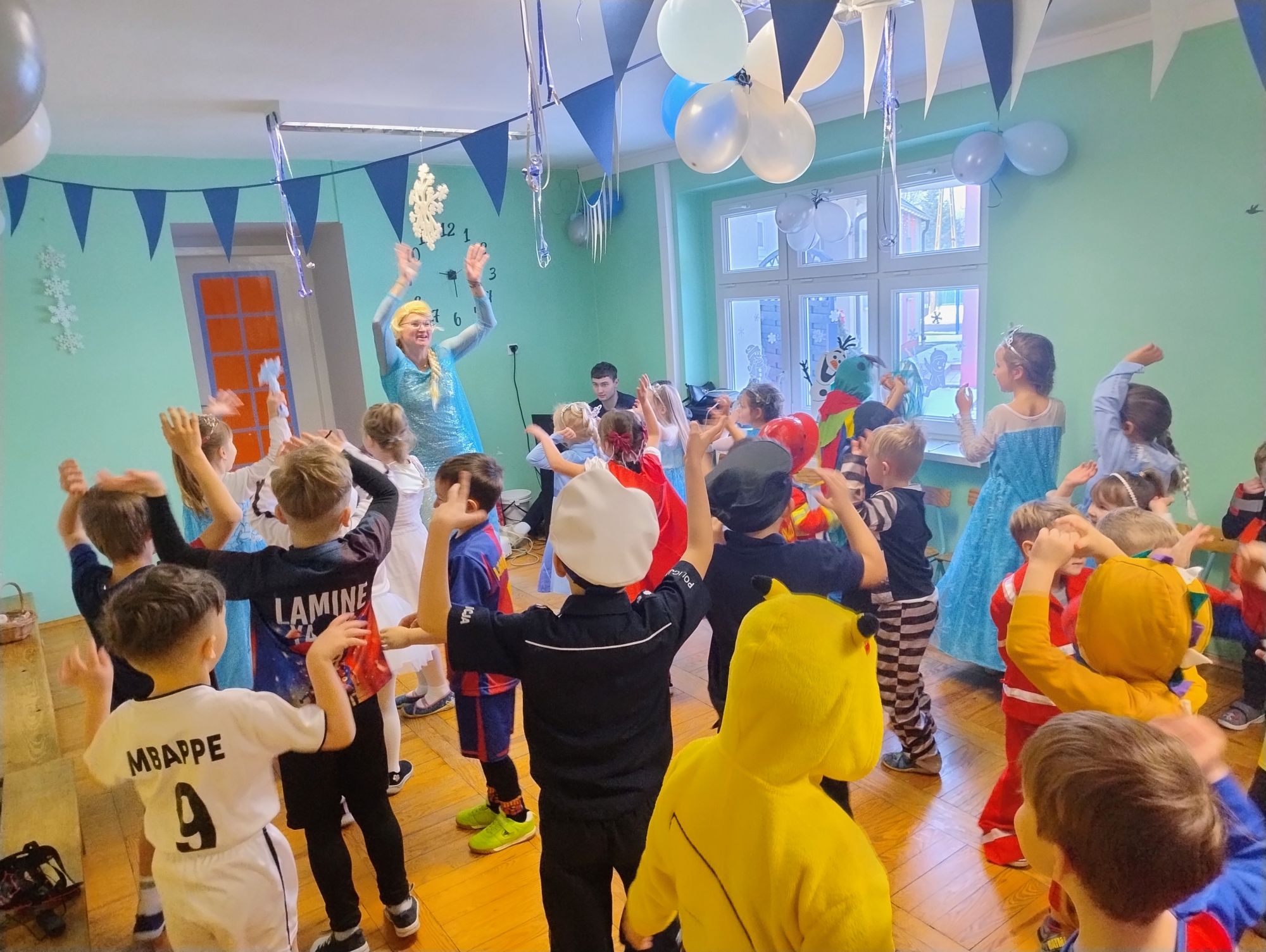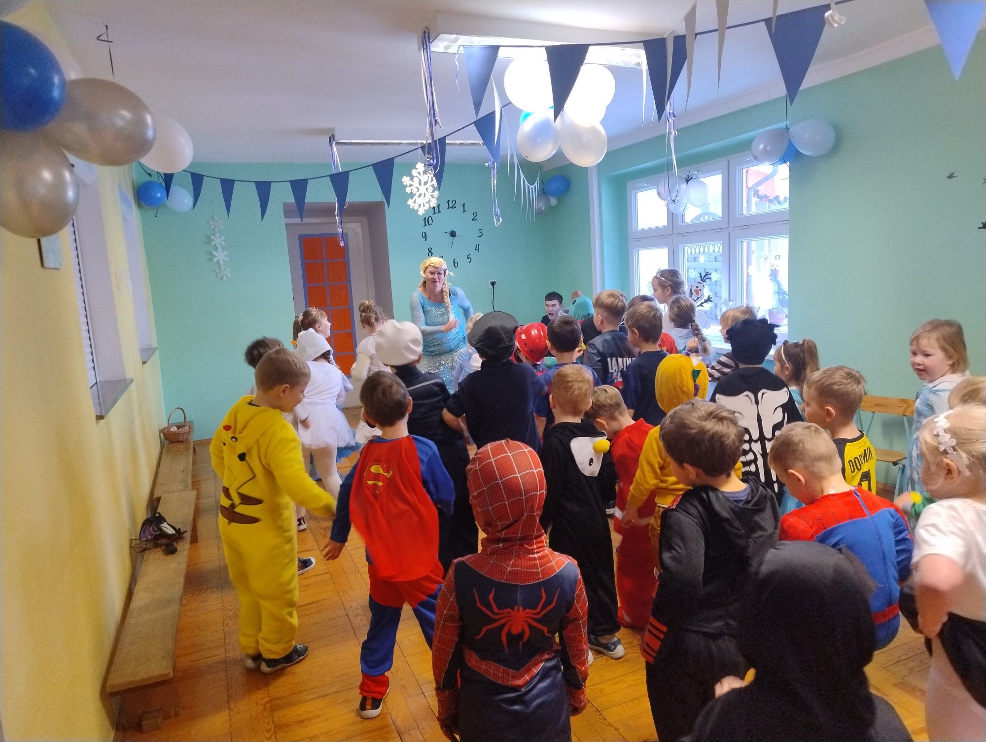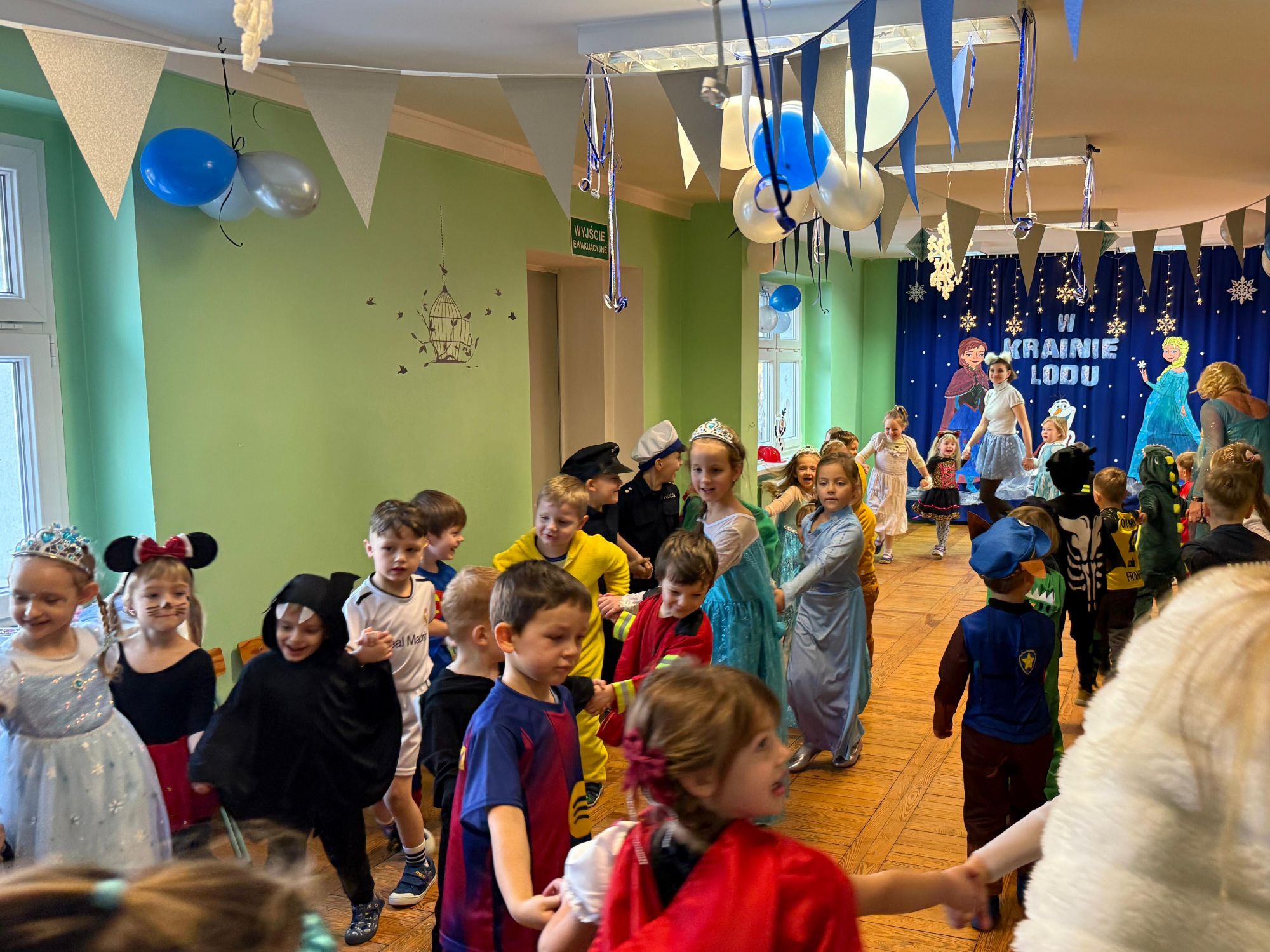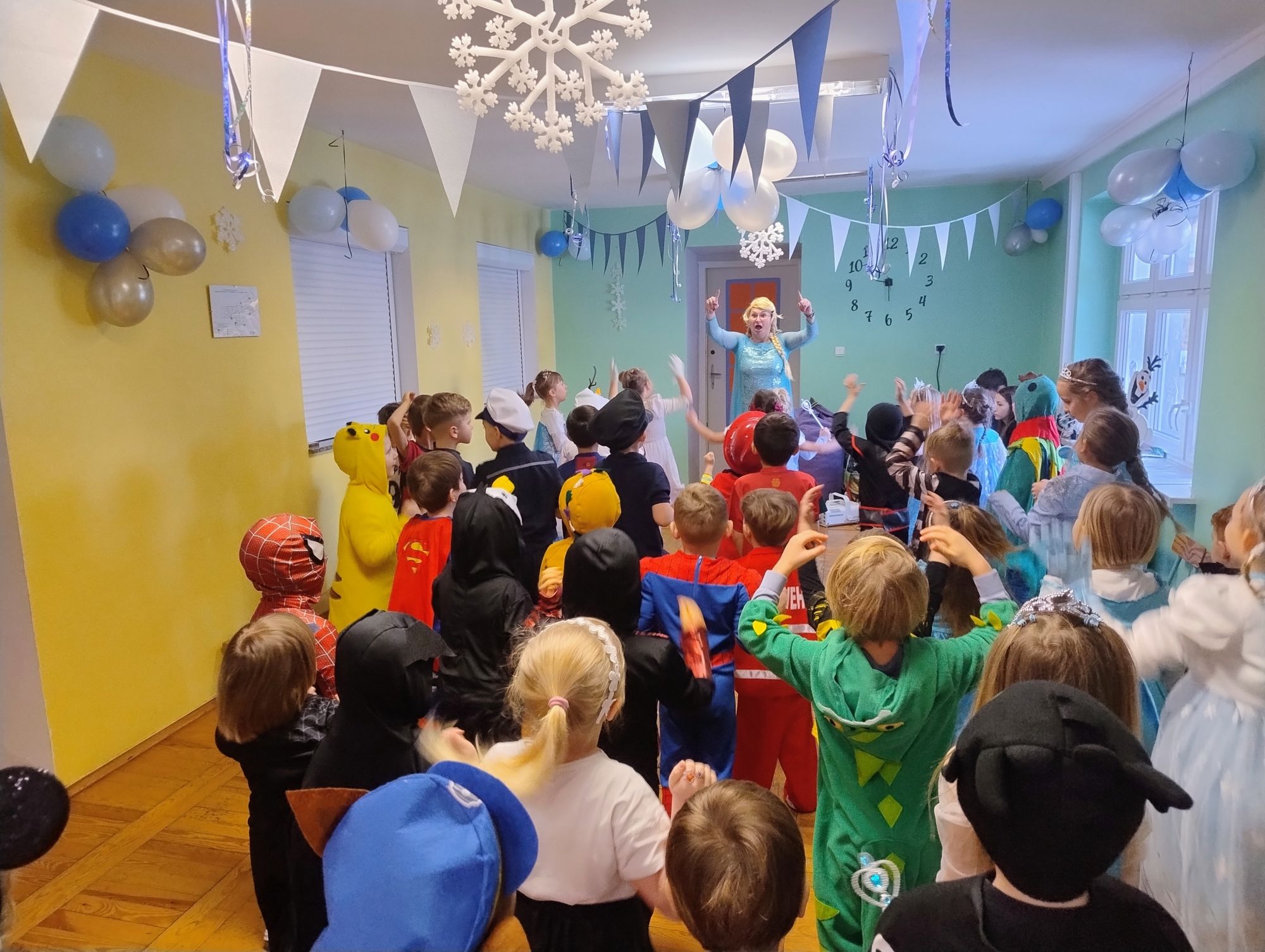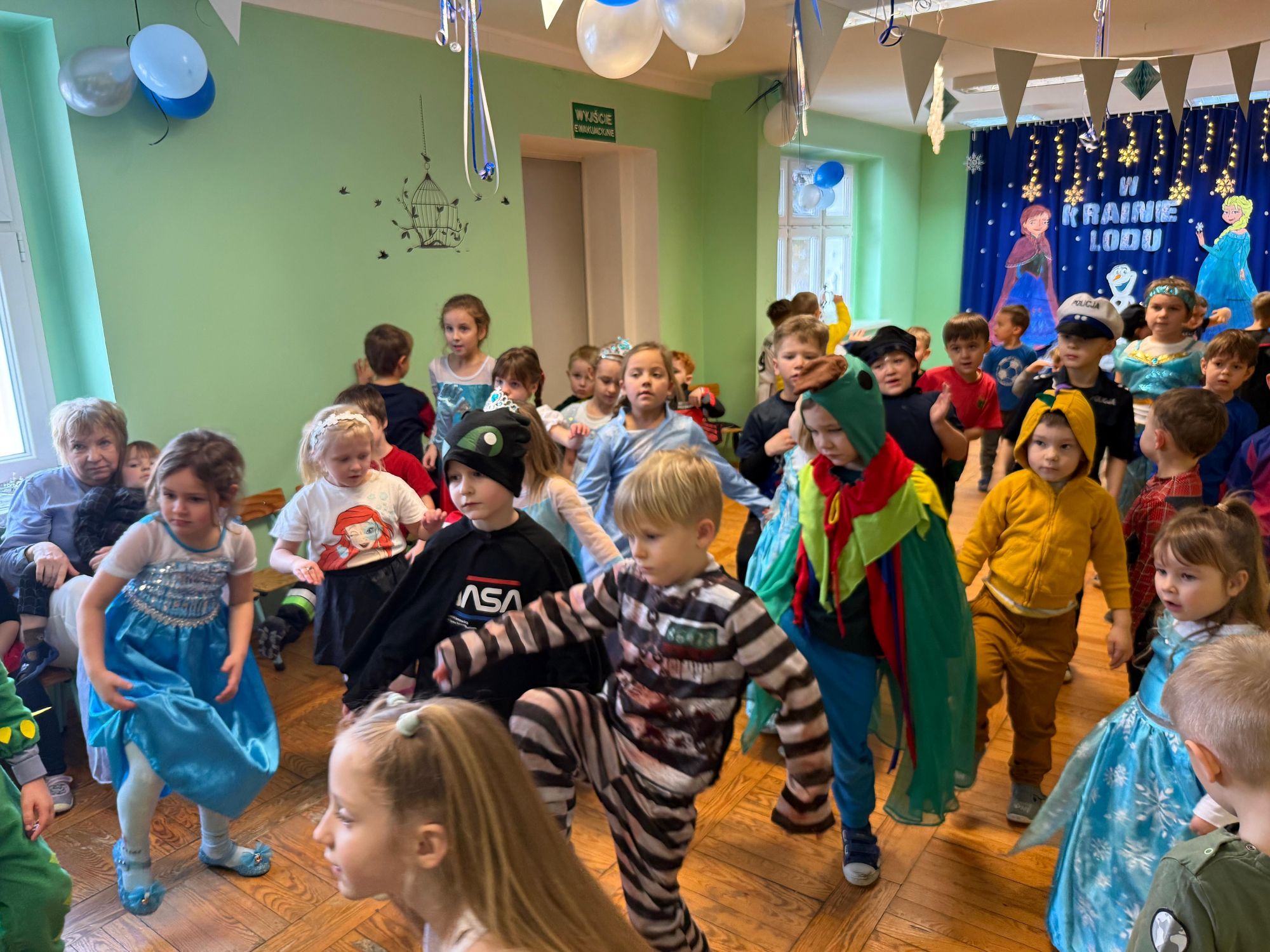 15 stycznia w naszym przedszkolu odbył się wyjątkowy bal karnawałowy pod hasłem „W krainie lodu”. To pełne radości i uśmiechu wydarzenie poprowadziła pani Barbara Koprek z firmy Skeleton, która zadbała o wspaniałą atmosferę oraz mnóstwo atrakcji dla najmłodszych. Tego dnia dzieci przyszły do przedszkola przebrane za swoich ulubionych bohaterów z bajek, filmów i nie tylko. Wśród barwnego tłumu można było spotkać m.in. Elsy, Królowe Śniegu, Olafa, bohaterów Psiego Patrolu, policjantów, piłkarzy oraz wiele innych fantastycznych postaci. Sala została specjalnie na tę okazję pięknie udekorowana balonami, girlandami i serpentynami, które doskonale wpisywały się w zimową tematykę balu. Na przedszkolaki czekało mnóstwo atrakcji – wspólne tańce, wesołe konkurencje oraz różnorodne zadania, w których dzieci chętnie brały udział razem z paniami. Nie zabrakło również chwili na odpoczynek i ugaszenie pragnienia. Po radosnych zabawach na dzieci czekał pyszny poczęstunek w postaci deseru „Śnieżna kraina”- kolorowej galaretki, która wszystkim bardzo smakowała. Zwieńczeniem tego wyjątkowego dnia była miła niespodzianka. Przedszkole odwiedził Stitch - kosmiczna postać z bajki Disneya, wywołując u dzieci ogromne emocje i szerokie uśmiechy. Bal karnawałowy był pełen radości, śmiechu i niezapomnianych wrażeń, a wspólna zabawa na długo pozostanie w pamięci wszystkich uczestników.