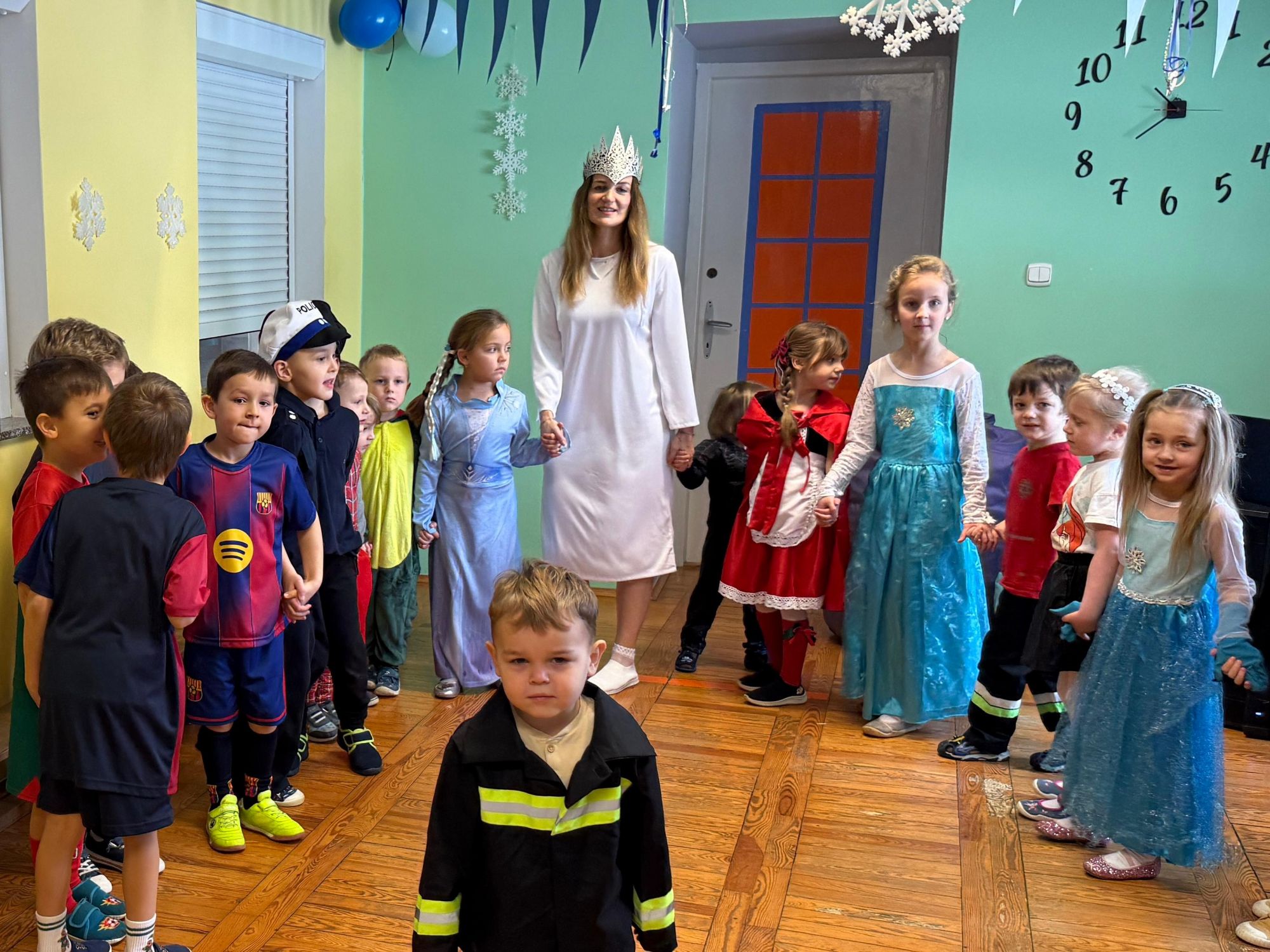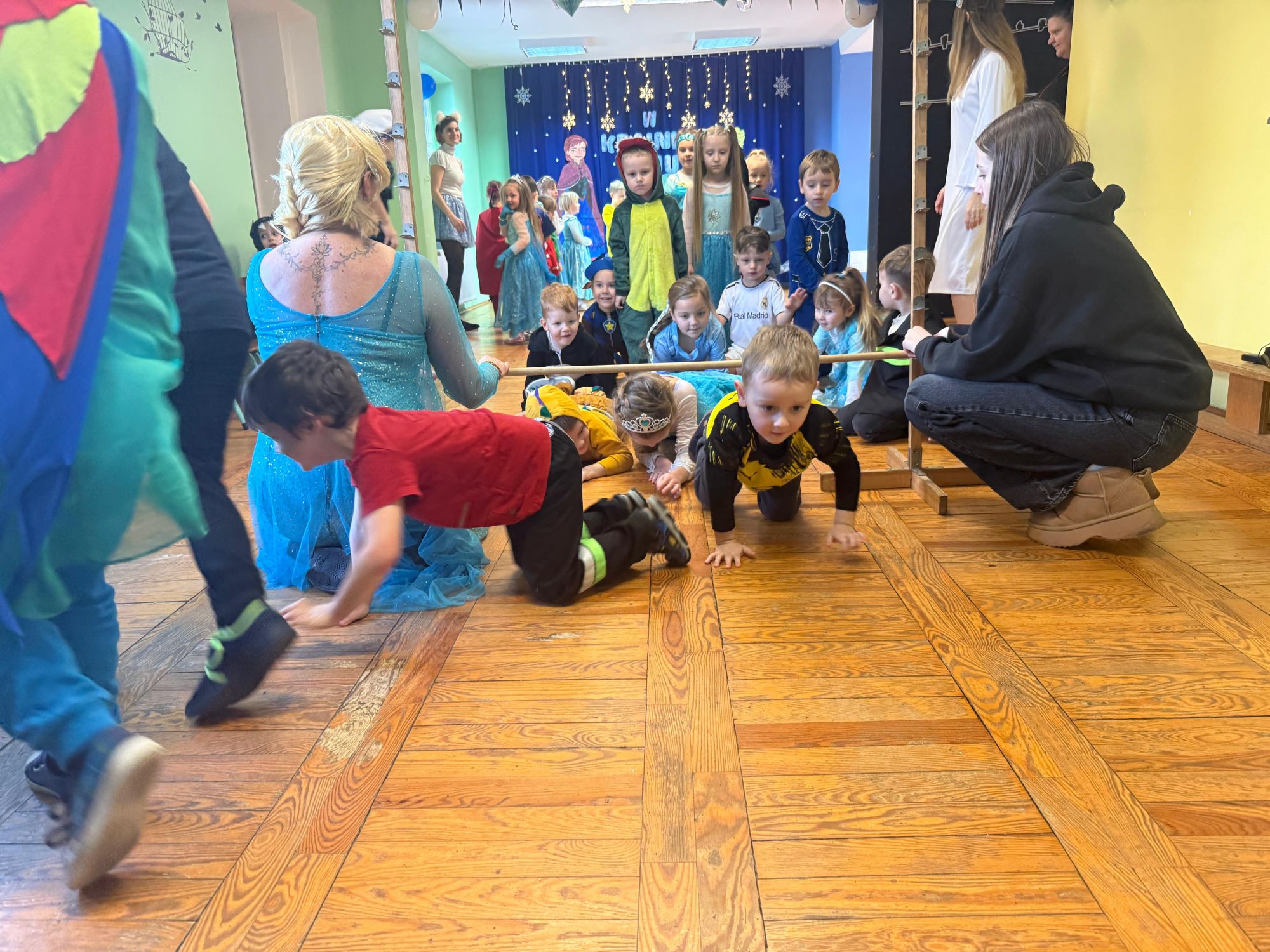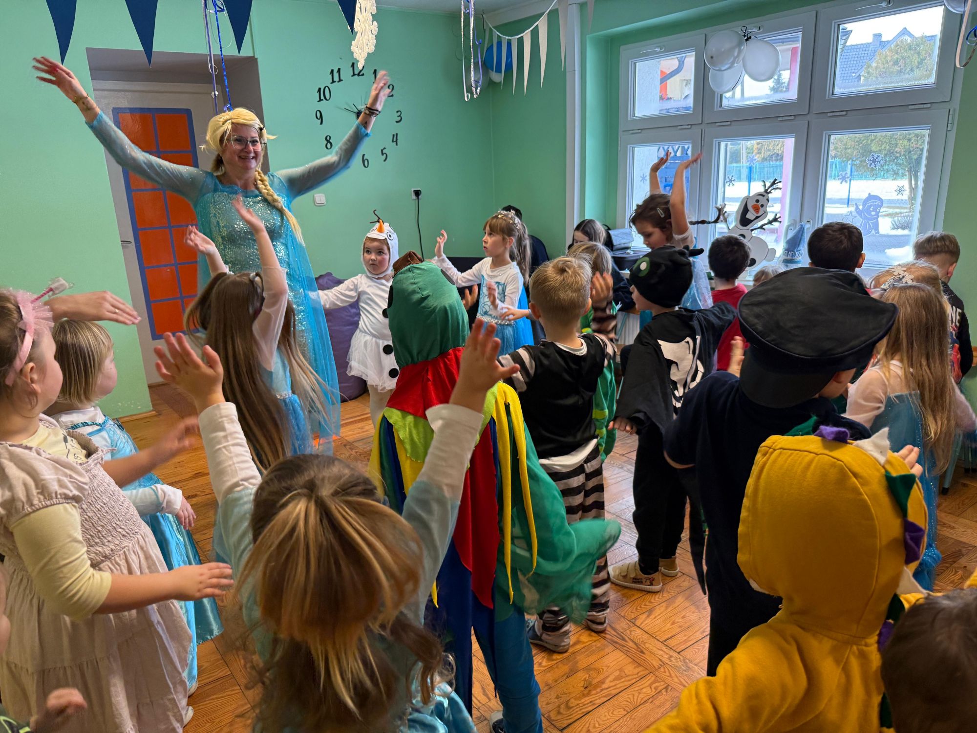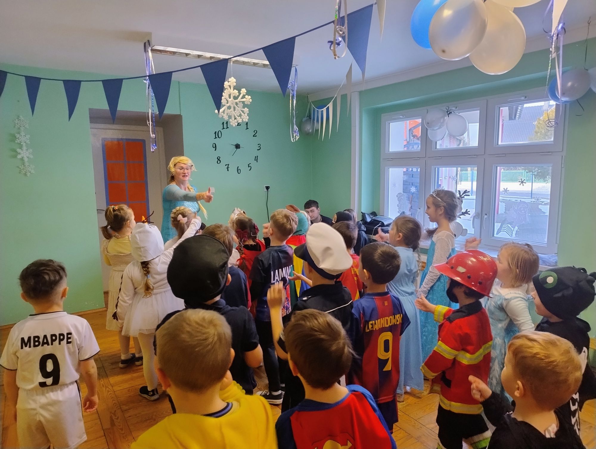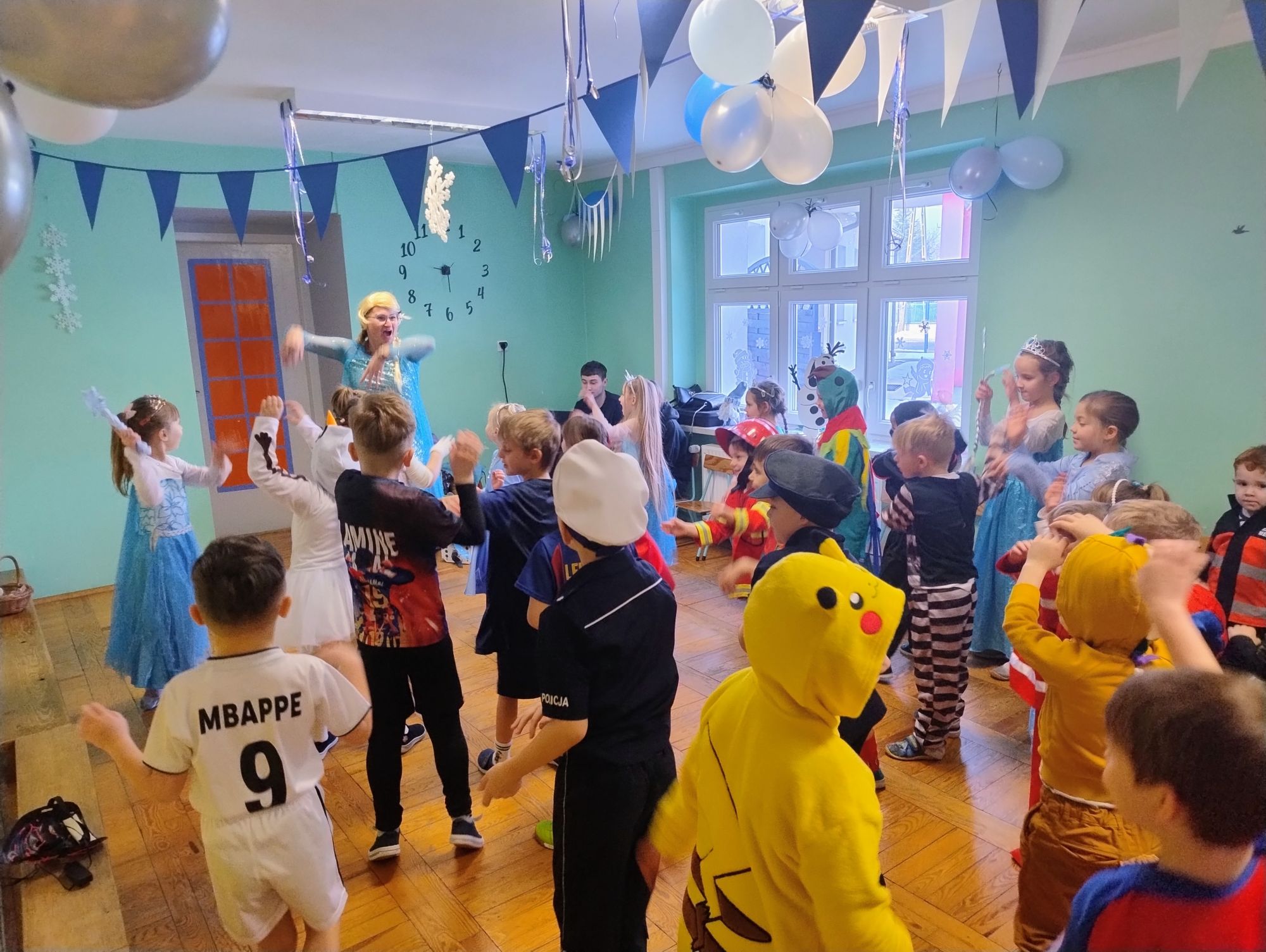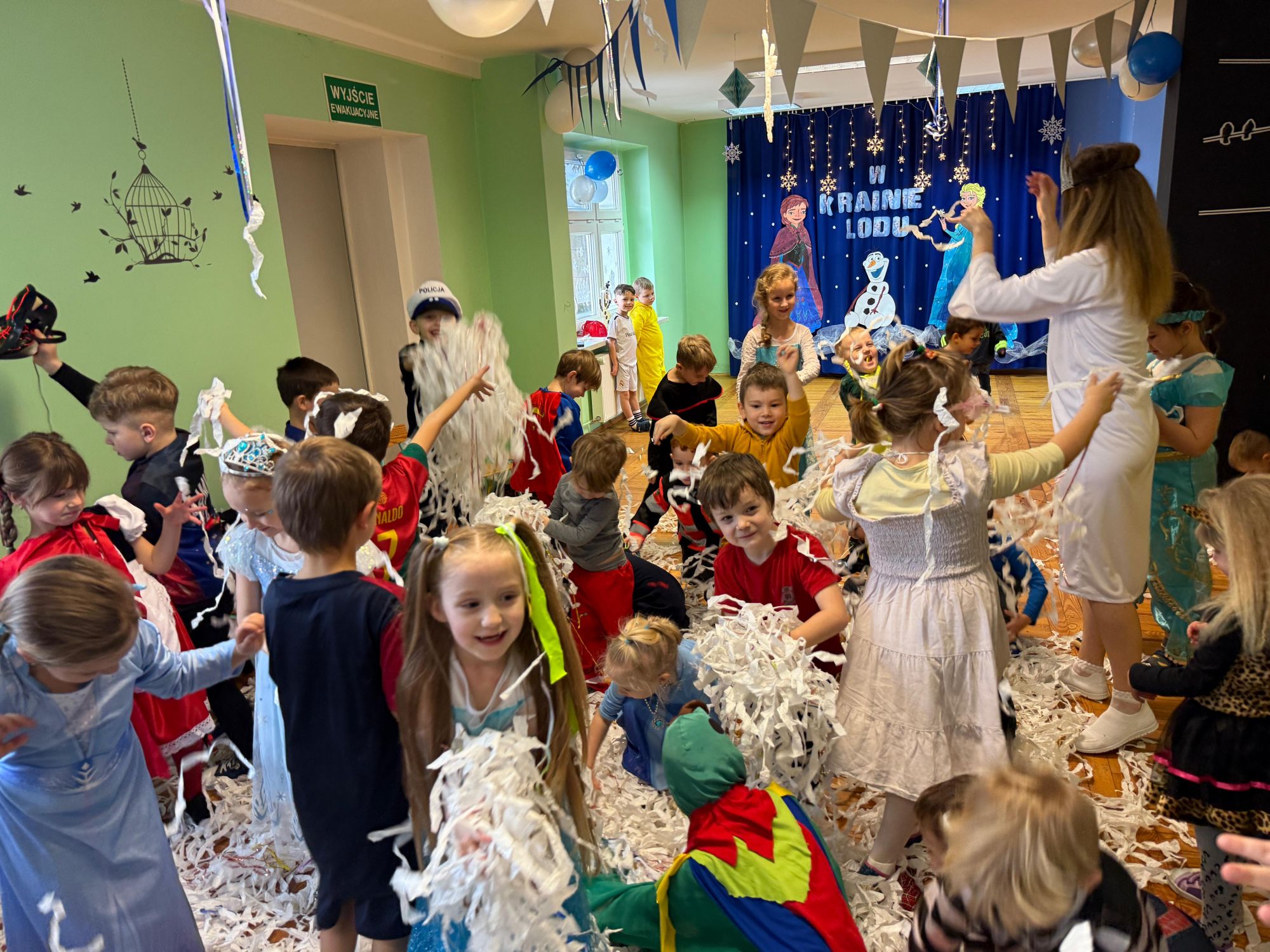 15 stycznia w naszym przedszkolu odbył się wyjątkowy bal karnawałowy pod hasłem „W krainie lodu”. To pełne radości i uśmiechu wydarzenie poprowadziła pani Barbara Koprek z firmy Skeleton, która zadbała o wspaniałą atmosferę oraz mnóstwo atrakcji dla najmłodszych. Tego dnia dzieci przyszły do przedszkola przebrane za swoich ulubionych bohaterów z bajek, filmów i nie tylko. Wśród barwnego tłumu można było spotkać m.in. Elsy, Królowe Śniegu, Olafa, bohaterów Psiego Patrolu, policjantów, piłkarzy oraz wiele innych fantastycznych postaci. Sala została specjalnie na tę okazję pięknie udekorowana balonami, girlandami i serpentynami, które doskonale wpisywały się w zimową tematykę balu. Na przedszkolaki czekało mnóstwo atrakcji – wspólne tańce, wesołe konkurencje oraz różnorodne zadania, w których dzieci chętnie brały udział razem z paniami. Nie zabrakło również chwili na odpoczynek i ugaszenie pragnienia. Po radosnych zabawach na dzieci czekał pyszny poczęstunek w postaci deseru „Śnieżna kraina”- kolorowej galaretki, która wszystkim bardzo smakowała. Zwieńczeniem tego wyjątkowego dnia była miła niespodzianka. Przedszkole odwiedził Stitch - kosmiczna postać z bajki Disneya, wywołując u dzieci ogromne emocje i szerokie uśmiechy. Bal karnawałowy był pełen radości, śmiechu i niezapomnianych wrażeń, a wspólna zabawa na długo pozostanie w pamięci wszystkich uczestników.