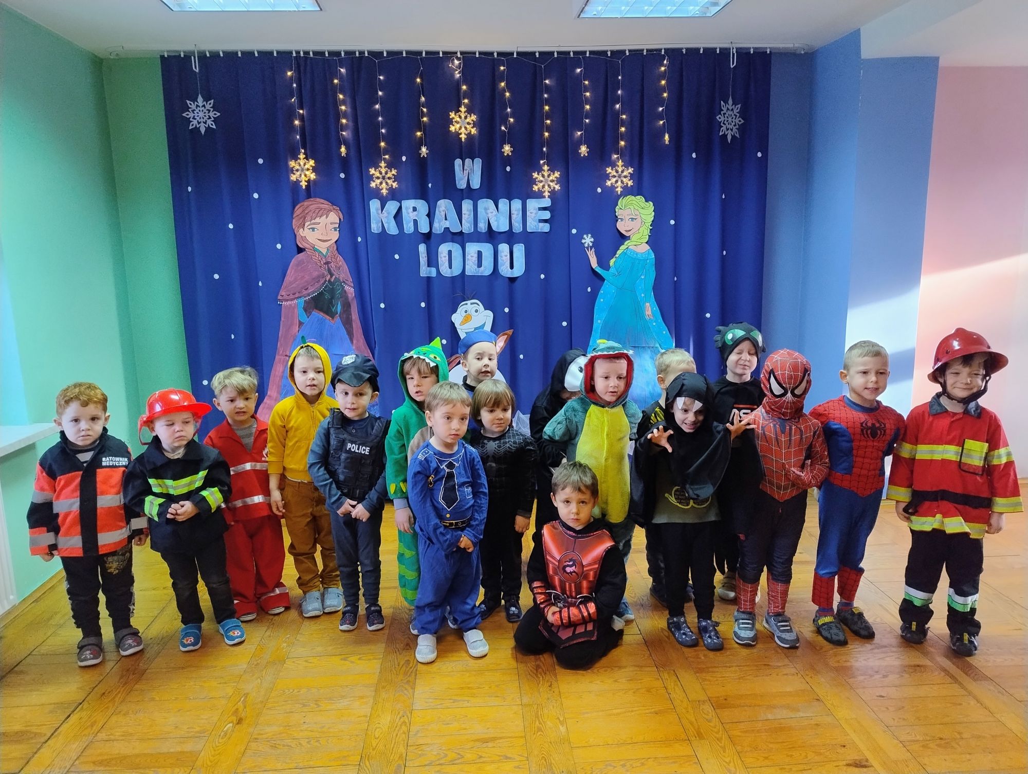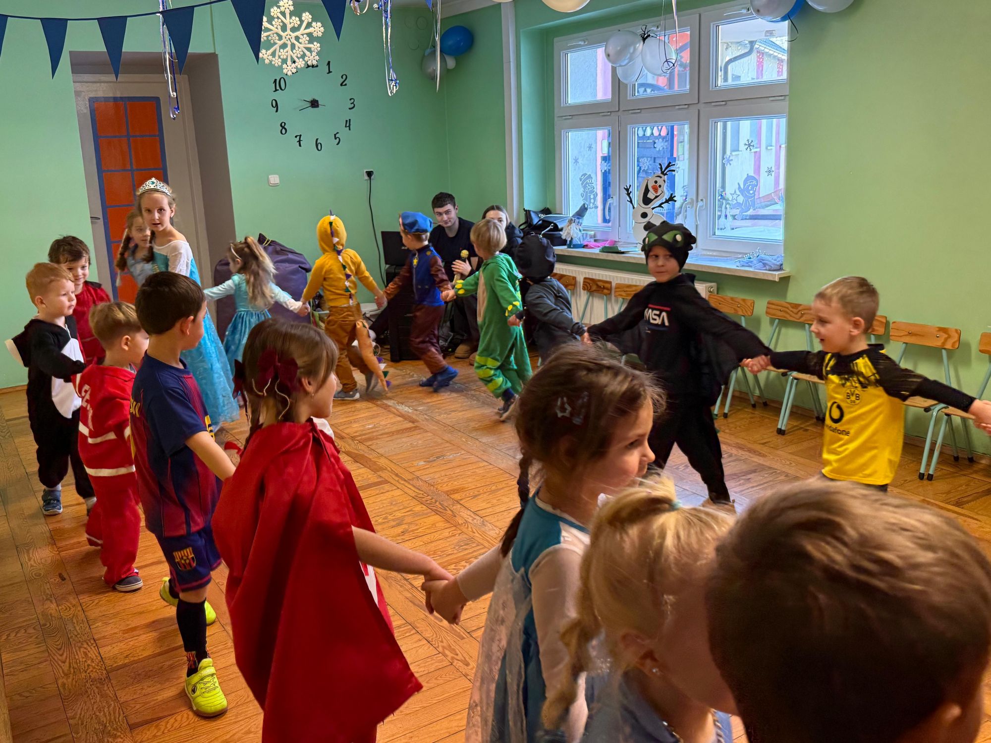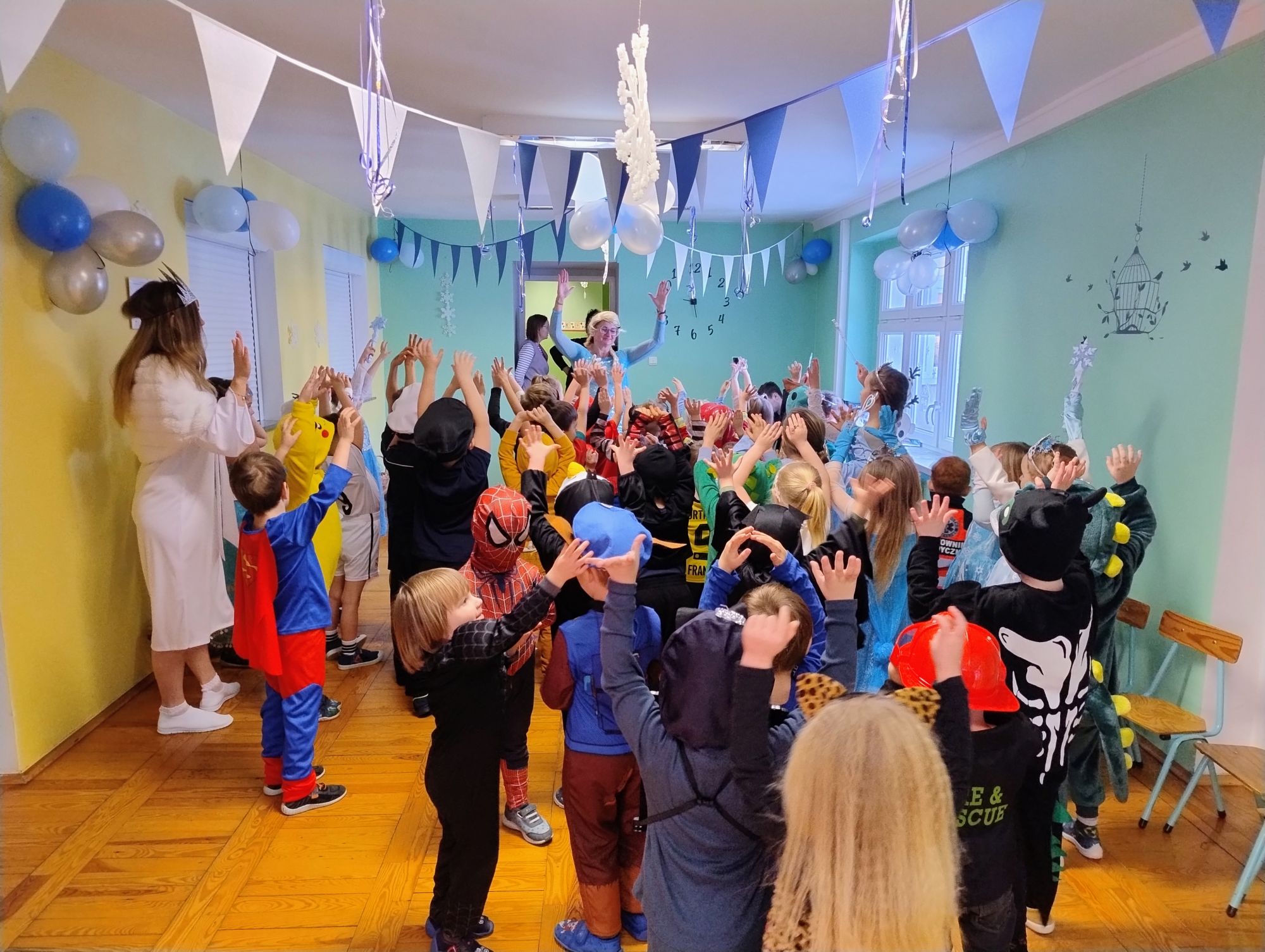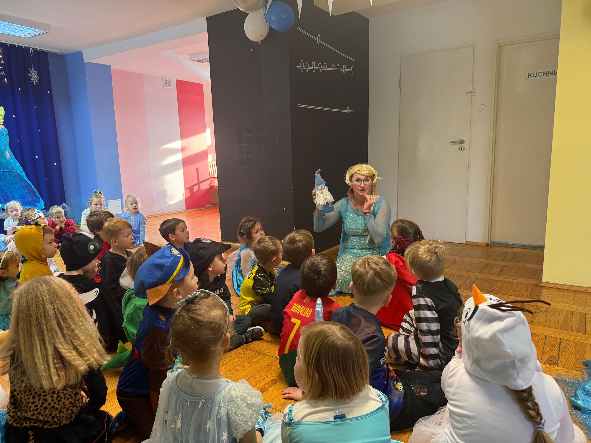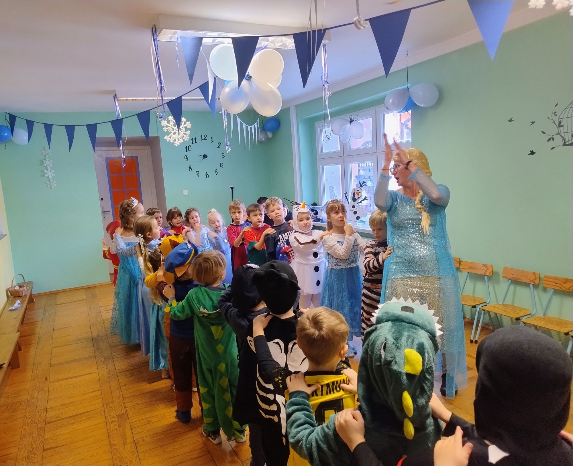 15 stycznia w naszym przedszkolu odbył się wyjątkowy bal karnawałowy pod hasłem „W krainie lodu”. To pełne radości i uśmiechu wydarzenie poprowadziła pani Barbara Koprek z firmy Skeleton, która zadbała o wspaniałą atmosferę oraz mnóstwo atrakcji dla najmłodszych. Tego dnia dzieci przyszły do przedszkola przebrane za swoich ulubionych bohaterów z bajek, filmów i nie tylko. Wśród barwnego tłumu można było spotkać m.in. Elsy, Królowe Śniegu, Olafa, bohaterów Psiego Patrolu, policjantów, piłkarzy oraz wiele innych fantastycznych postaci. Sala została specjalnie na tę okazję pięknie udekorowana balonami, girlandami i serpentynami, które doskonale wpisywały się w zimową tematykę balu. Na przedszkolaki czekało mnóstwo atrakcji – wspólne tańce, wesołe konkurencje oraz różnorodne zadania, w których dzieci chętnie brały udział razem z paniami. Nie zabrakło również chwili na odpoczynek i ugaszenie pragnienia. Po radosnych zabawach na dzieci czekał pyszny poczęstunek w postaci deseru „Śnieżna kraina”- kolorowej galaretki, która wszystkim bardzo smakowała. Zwieńczeniem tego wyjątkowego dnia była miła niespodzianka. Przedszkole odwiedził Stitch - kosmiczna postać z bajki Disneya, wywołując u dzieci ogromne emocje i szerokie uśmiechy. Bal karnawałowy był pełen radości, śmiechu i niezapomnianych wrażeń, a wspólna zabawa na długo pozostanie w pamięci wszystkich uczestników.