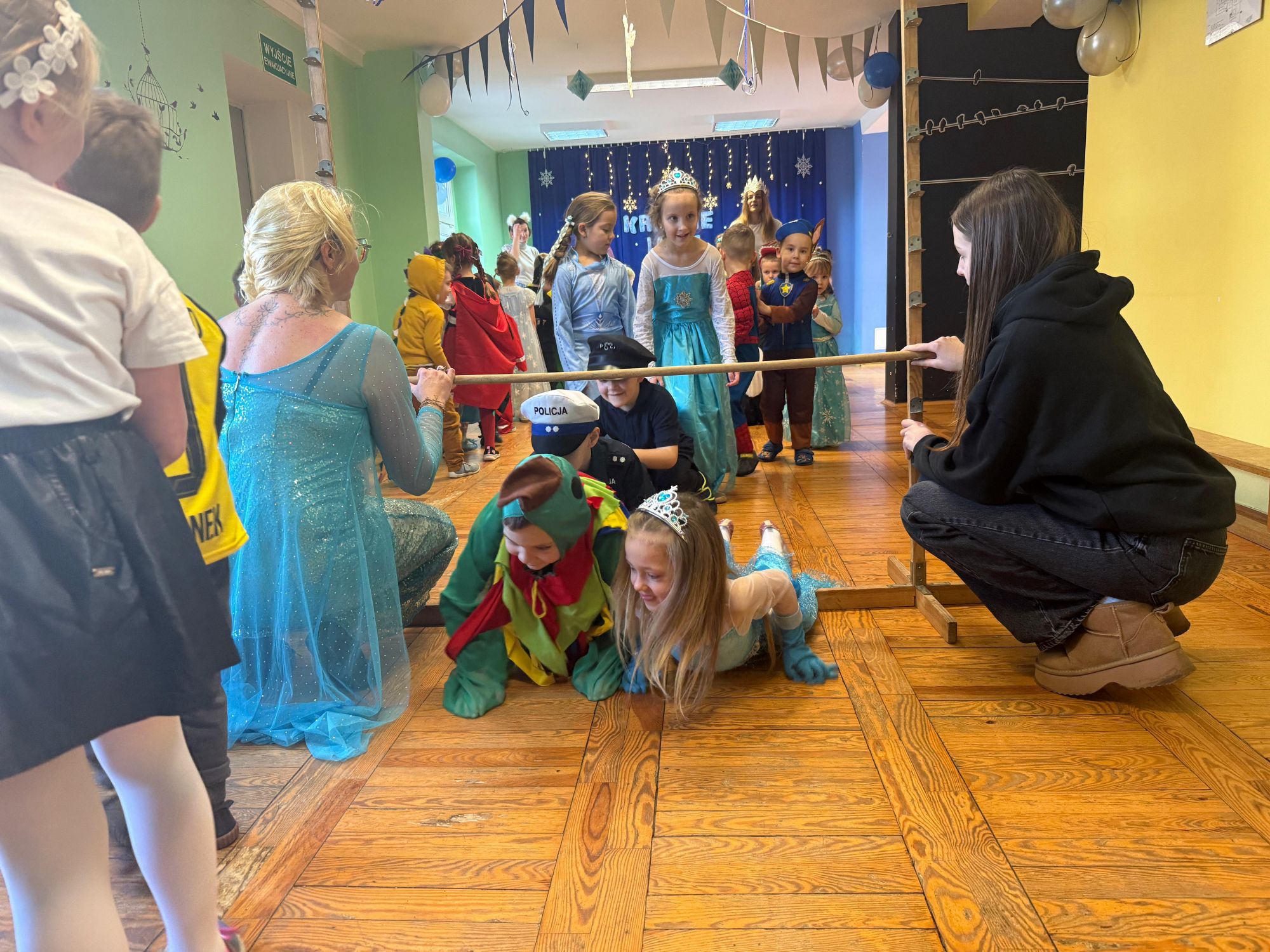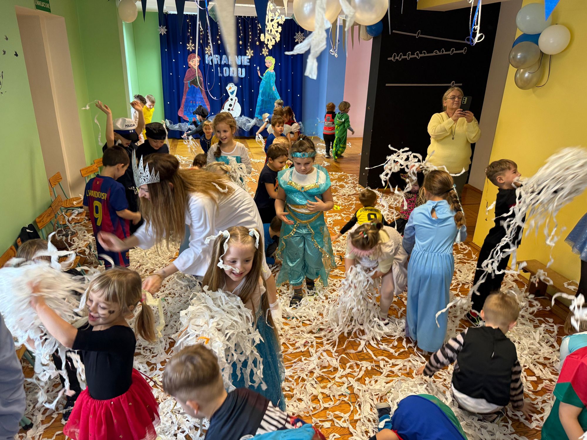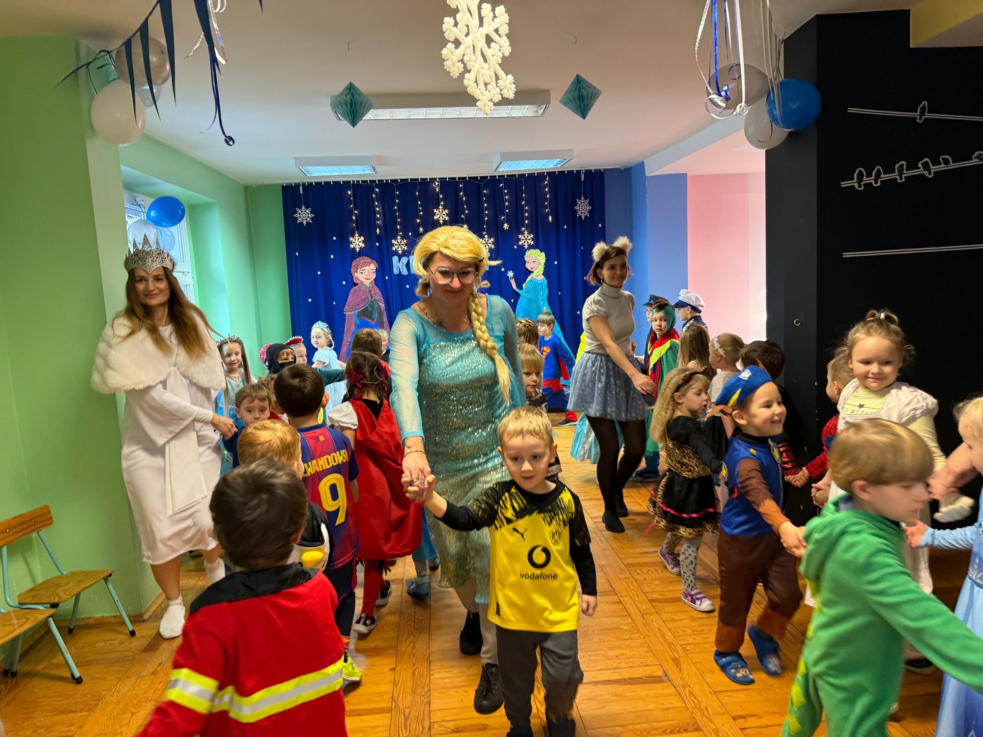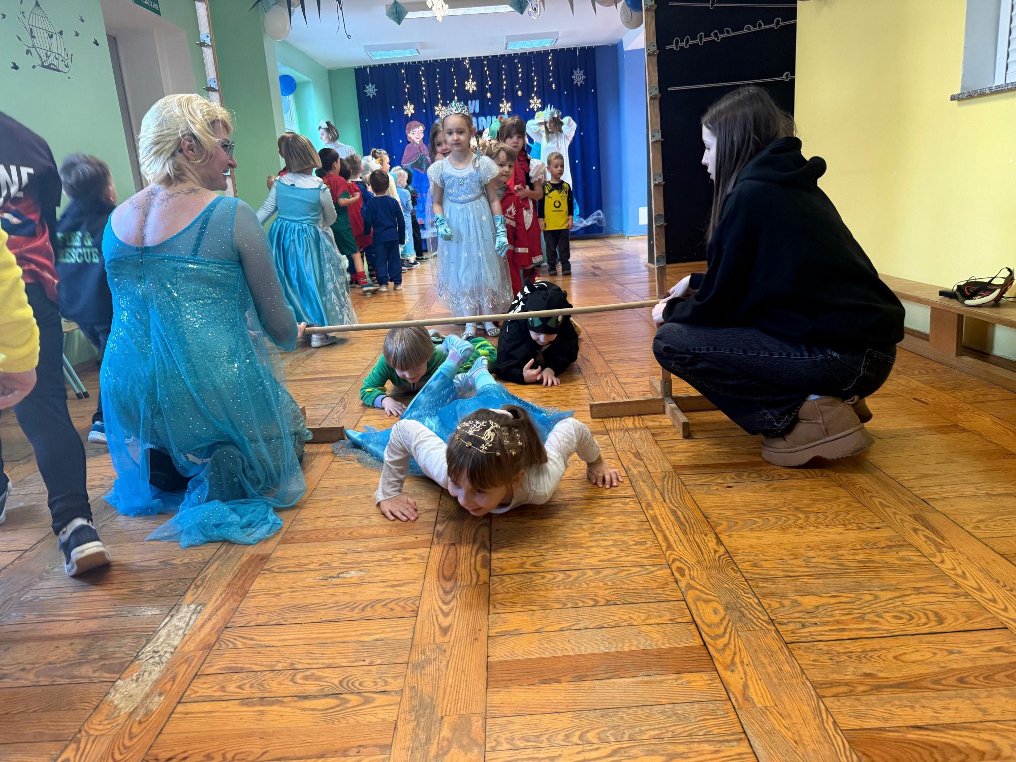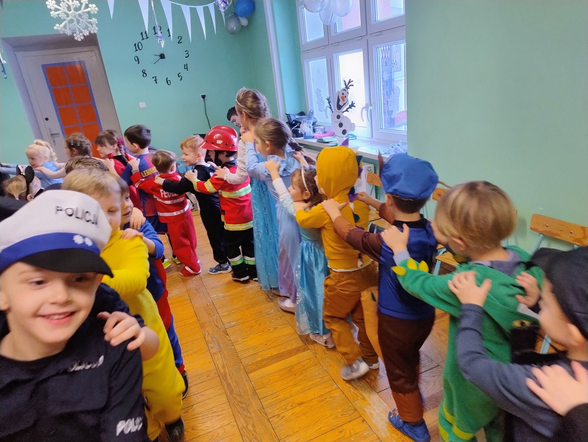 15 stycznia w naszym przedszkolu odbył się wyjątkowy bal karnawałowy pod hasłem „W krainie lodu”. To pełne radości i uśmiechu wydarzenie poprowadziła pani Barbara Koprek z firmy Skeleton, która zadbała o wspaniałą atmosferę oraz mnóstwo atrakcji dla najmłodszych. Tego dnia dzieci przyszły do przedszkola przebrane za swoich ulubionych bohaterów z bajek, filmów i nie tylko. Wśród barwnego tłumu można było spotkać m.in. Elsy, Królowe Śniegu, Olafa, bohaterów Psiego Patrolu, policjantów, piłkarzy oraz wiele innych fantastycznych postaci. Sala została specjalnie na tę okazję pięknie udekorowana balonami, girlandami i serpentynami, które doskonale wpisywały się w zimową tematykę balu. Na przedszkolaki czekało mnóstwo atrakcji – wspólne tańce, wesołe konkurencje oraz różnorodne zadania, w których dzieci chętnie brały udział razem z paniami. Nie zabrakło również chwili na odpoczynek i ugaszenie pragnienia. Po radosnych zabawach na dzieci czekał pyszny poczęstunek w postaci deseru „Śnieżna kraina”- kolorowej galaretki, która wszystkim bardzo smakowała. Zwieńczeniem tego wyjątkowego dnia była miła niespodzianka. Przedszkole odwiedził Stitch - kosmiczna postać z bajki Disneya, wywołując u dzieci ogromne emocje i szerokie uśmiechy. Bal karnawałowy był pełen radości, śmiechu i niezapomnianych wrażeń, a wspólna zabawa na długo pozostanie w pamięci wszystkich uczestników.