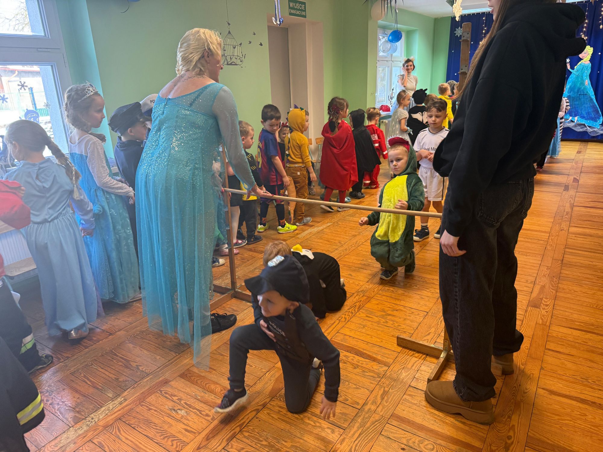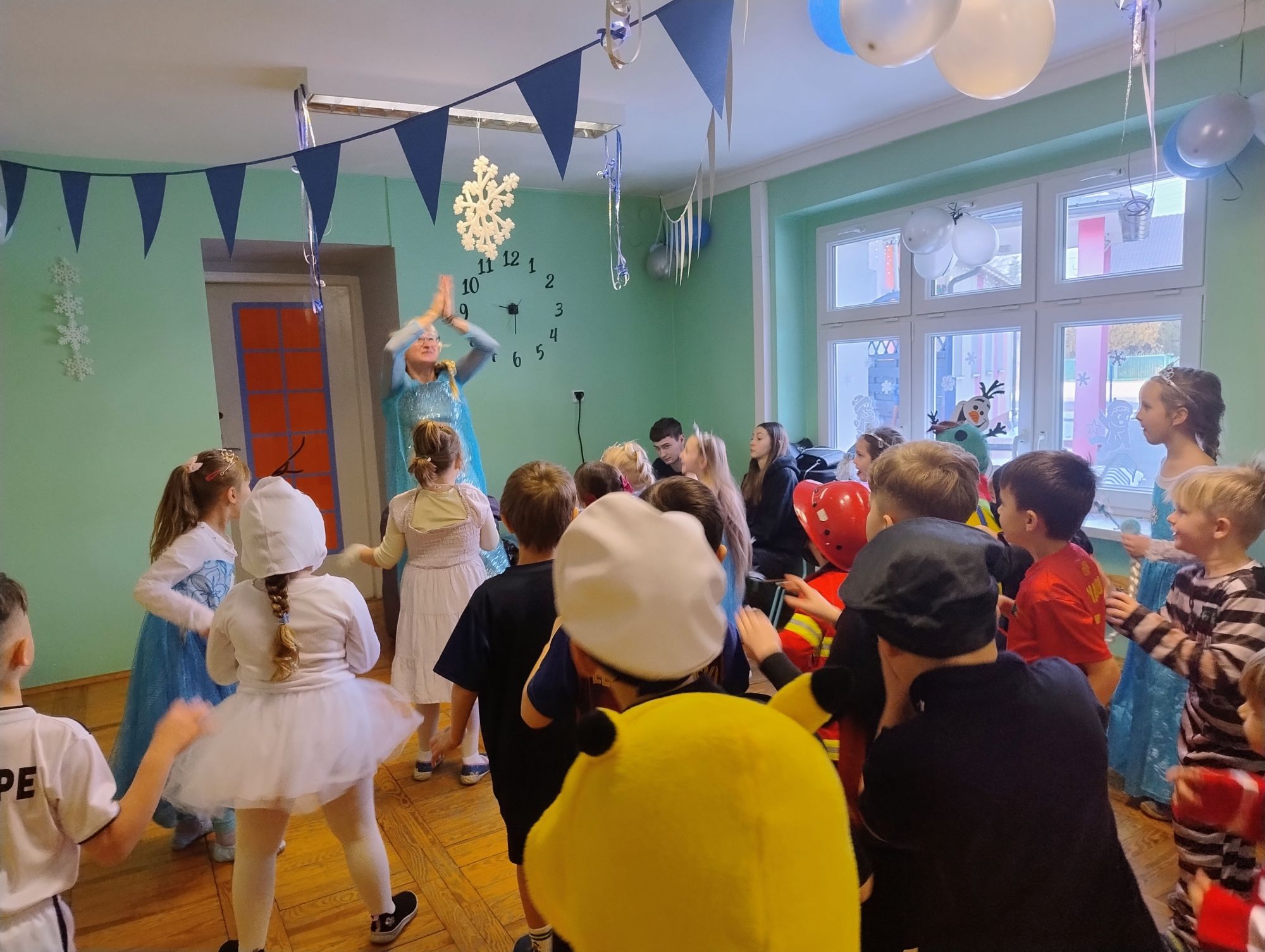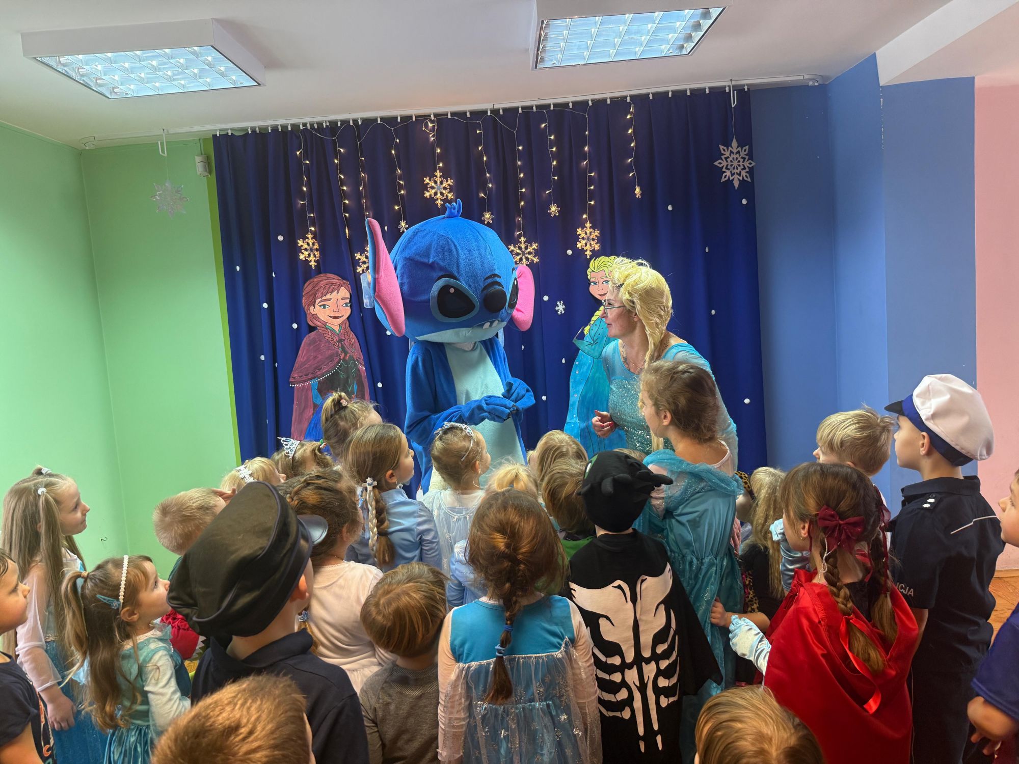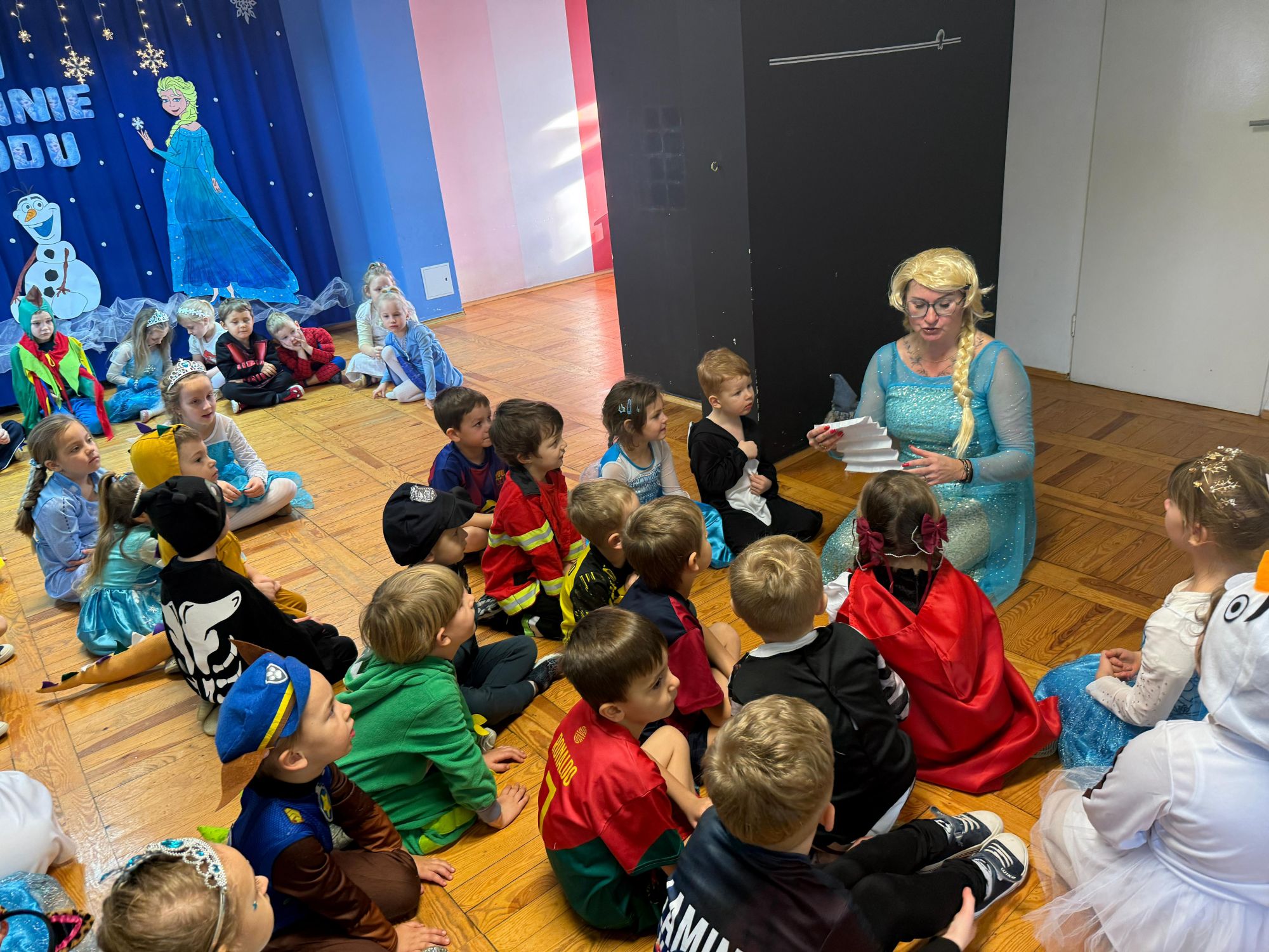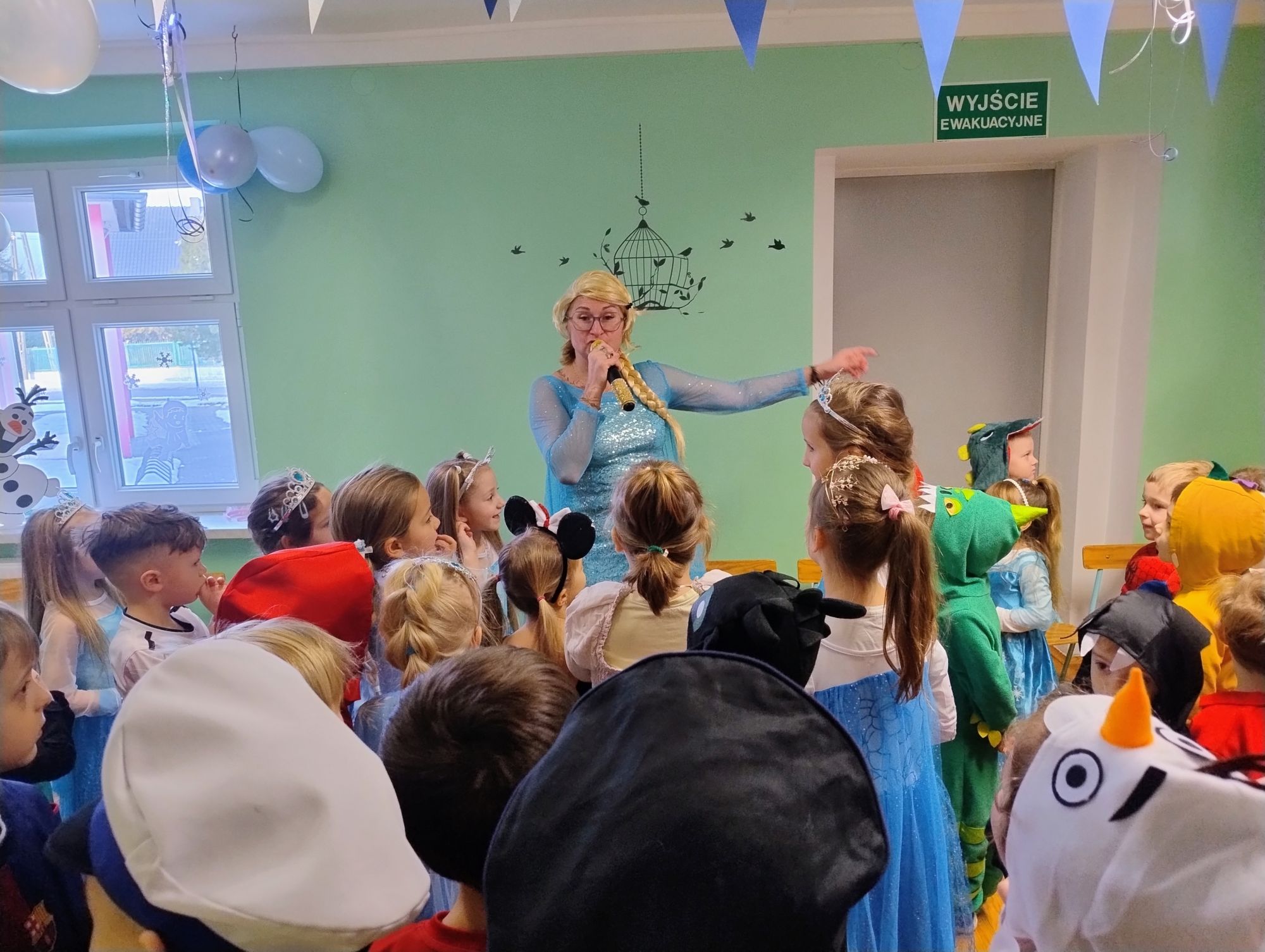 15 stycznia w naszym przedszkolu odbył się wyjątkowy bal karnawałowy pod hasłem „W krainie lodu”. To pełne radości i uśmiechu wydarzenie poprowadziła pani Barbara Koprek z firmy Skeleton, która zadbała o wspaniałą atmosferę oraz mnóstwo atrakcji dla najmłodszych. Tego dnia dzieci przyszły do przedszkola przebrane za swoich ulubionych bohaterów z bajek, filmów i nie tylko. Wśród barwnego tłumu można było spotkać m.in. Elsy, Królowe Śniegu, Olafa, bohaterów Psiego Patrolu, policjantów, piłkarzy oraz wiele innych fantastycznych postaci. Sala została specjalnie na tę okazję pięknie udekorowana balonami, girlandami i serpentynami, które doskonale wpisywały się w zimową tematykę balu. Na przedszkolaki czekało mnóstwo atrakcji – wspólne tańce, wesołe konkurencje oraz różnorodne zadania, w których dzieci chętnie brały udział razem z paniami. Nie zabrakło również chwili na odpoczynek i ugaszenie pragnienia. Po radosnych zabawach na dzieci czekał pyszny poczęstunek w postaci deseru „Śnieżna kraina”- kolorowej galaretki, która wszystkim bardzo smakowała. Zwieńczeniem tego wyjątkowego dnia była miła niespodzianka. Przedszkole odwiedził Stitch - kosmiczna postać z bajki Disneya, wywołując u dzieci ogromne emocje i szerokie uśmiechy. Bal karnawałowy był pełen radości, śmiechu i niezapomnianych wrażeń, a wspólna zabawa na długo pozostanie w pamięci wszystkich uczestników.