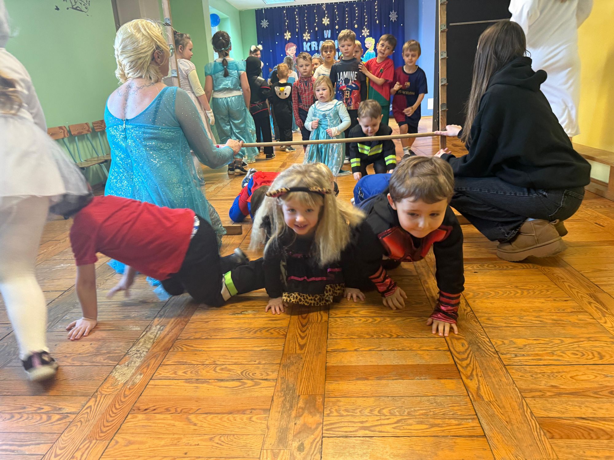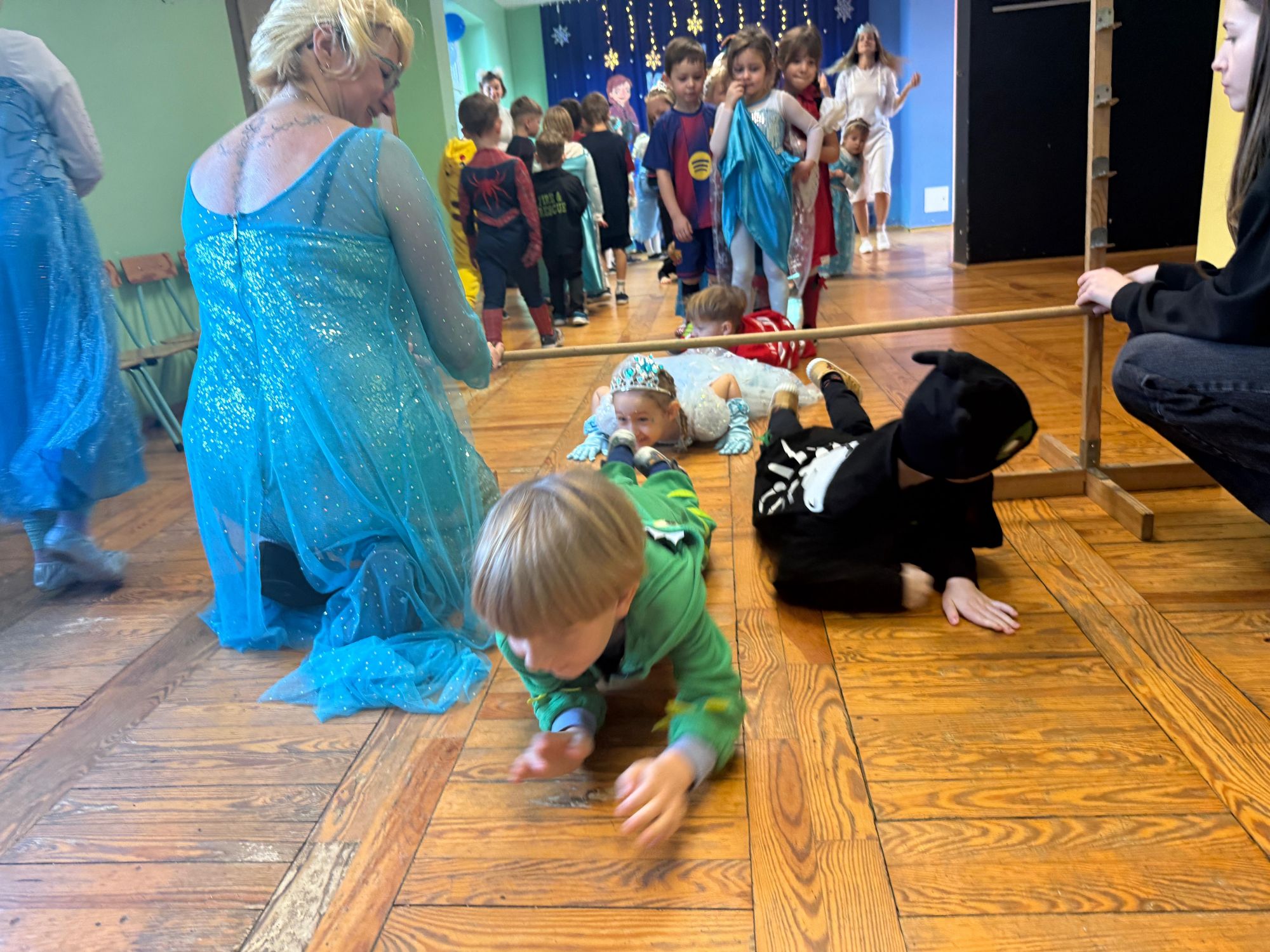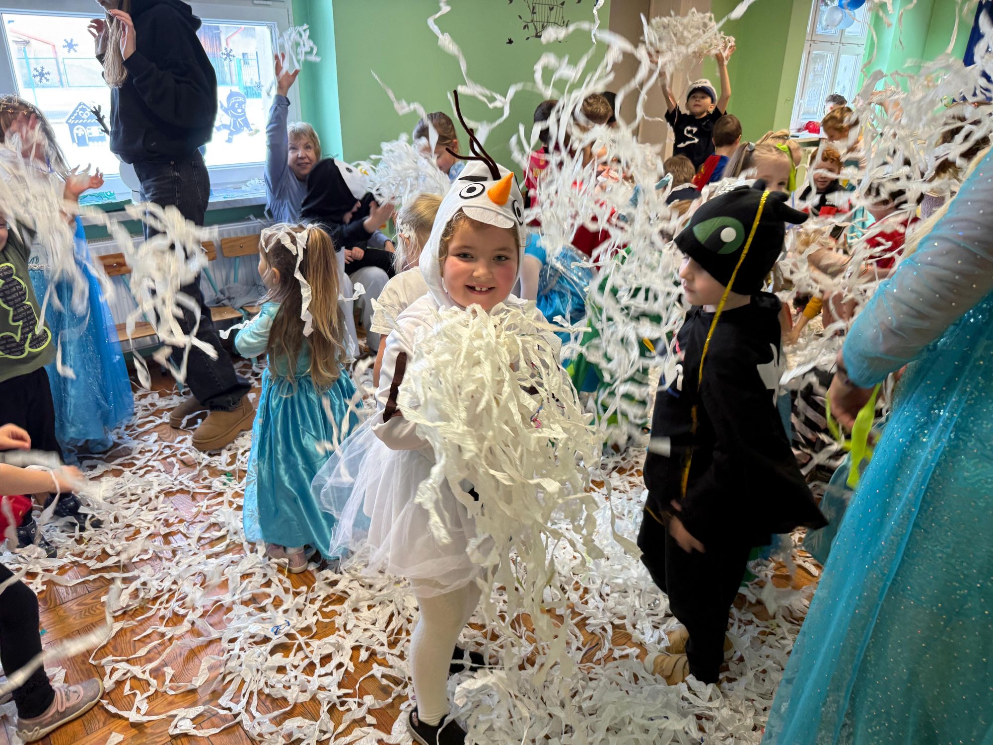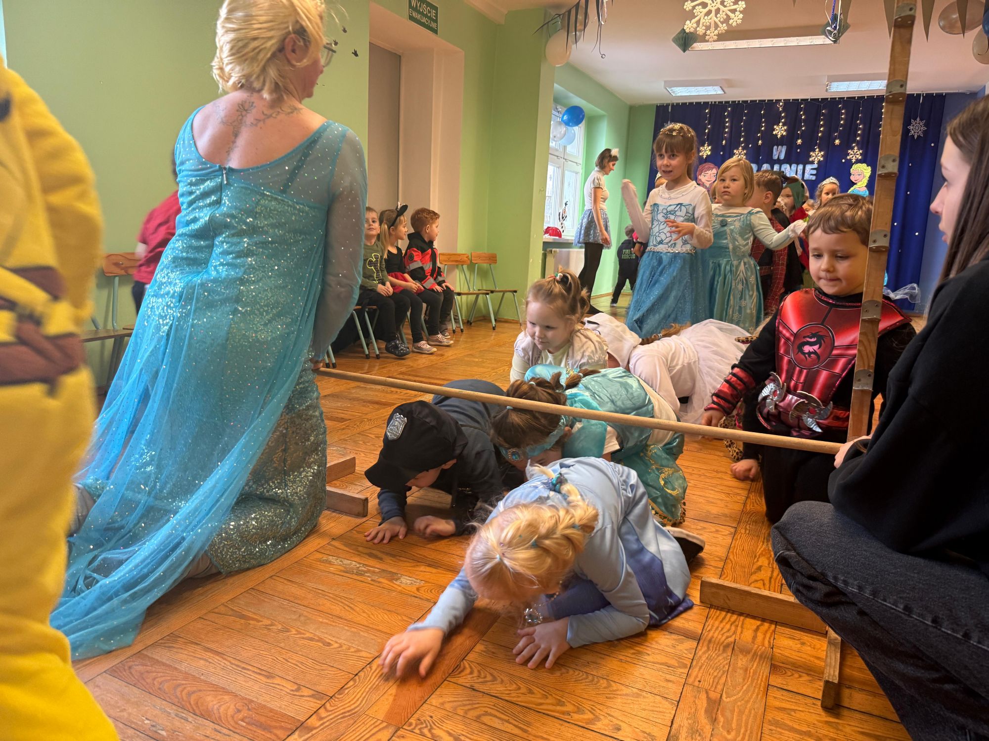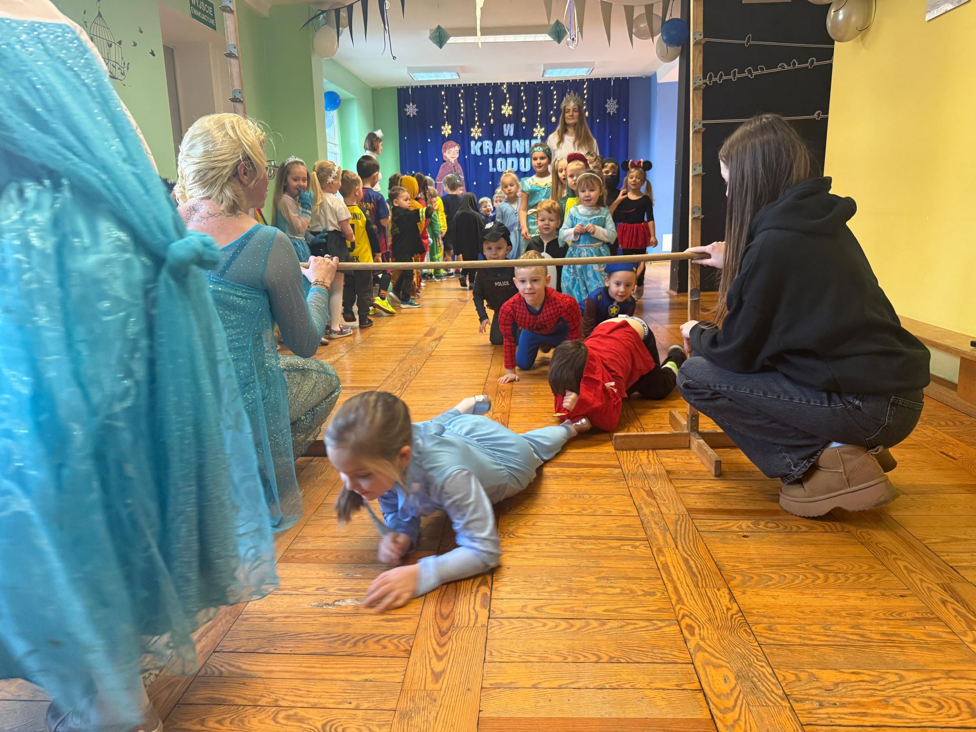 15 stycznia w naszym przedszkolu odbył się wyjątkowy bal karnawałowy pod hasłem „W krainie lodu”. To pełne radości i uśmiechu wydarzenie poprowadziła pani Barbara Koprek z firmy Skeleton, która zadbała o wspaniałą atmosferę oraz mnóstwo atrakcji dla najmłodszych. Tego dnia dzieci przyszły do przedszkola przebrane za swoich ulubionych bohaterów z bajek, filmów i nie tylko. Wśród barwnego tłumu można było spotkać m.in. Elsy, Królowe Śniegu, Olafa, bohaterów Psiego Patrolu, policjantów, piłkarzy oraz wiele innych fantastycznych postaci. Sala została specjalnie na tę okazję pięknie udekorowana balonami, girlandami i serpentynami, które doskonale wpisywały się w zimową tematykę balu. Na przedszkolaki czekało mnóstwo atrakcji – wspólne tańce, wesołe konkurencje oraz różnorodne zadania, w których dzieci chętnie brały udział razem z paniami. Nie zabrakło również chwili na odpoczynek i ugaszenie pragnienia. Po radosnych zabawach na dzieci czekał pyszny poczęstunek w postaci deseru „Śnieżna kraina”- kolorowej galaretki, która wszystkim bardzo smakowała. Zwieńczeniem tego wyjątkowego dnia była miła niespodzianka. Przedszkole odwiedził Stitch - kosmiczna postać z bajki Disneya, wywołując u dzieci ogromne emocje i szerokie uśmiechy. Bal karnawałowy był pełen radości, śmiechu i niezapomnianych wrażeń, a wspólna zabawa na długo pozostanie w pamięci wszystkich uczestników.