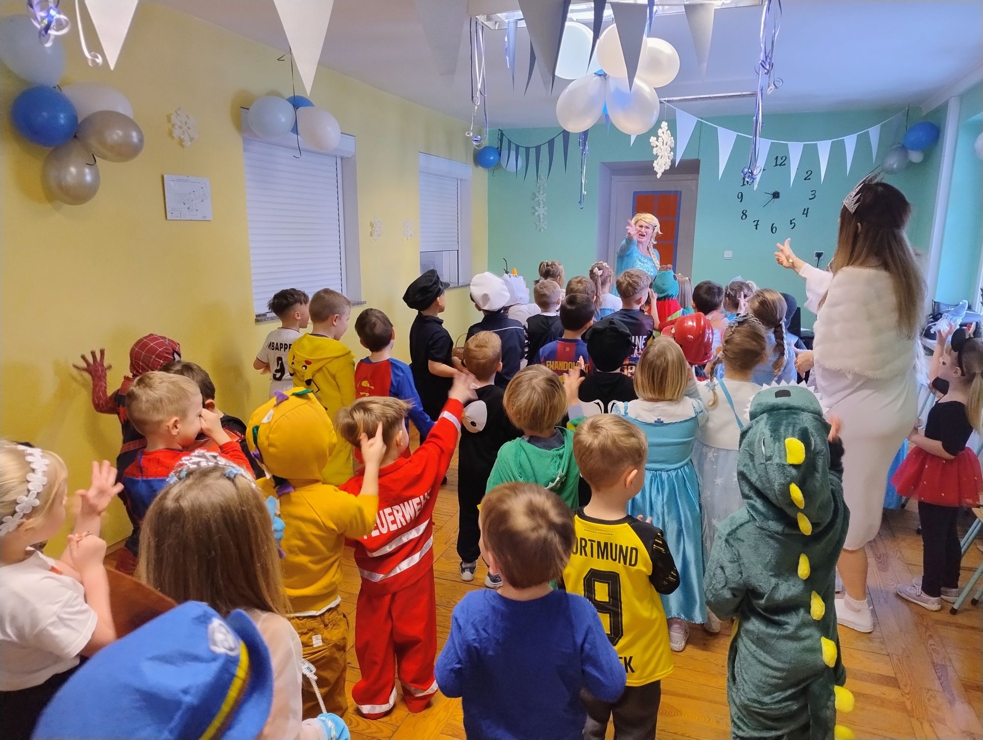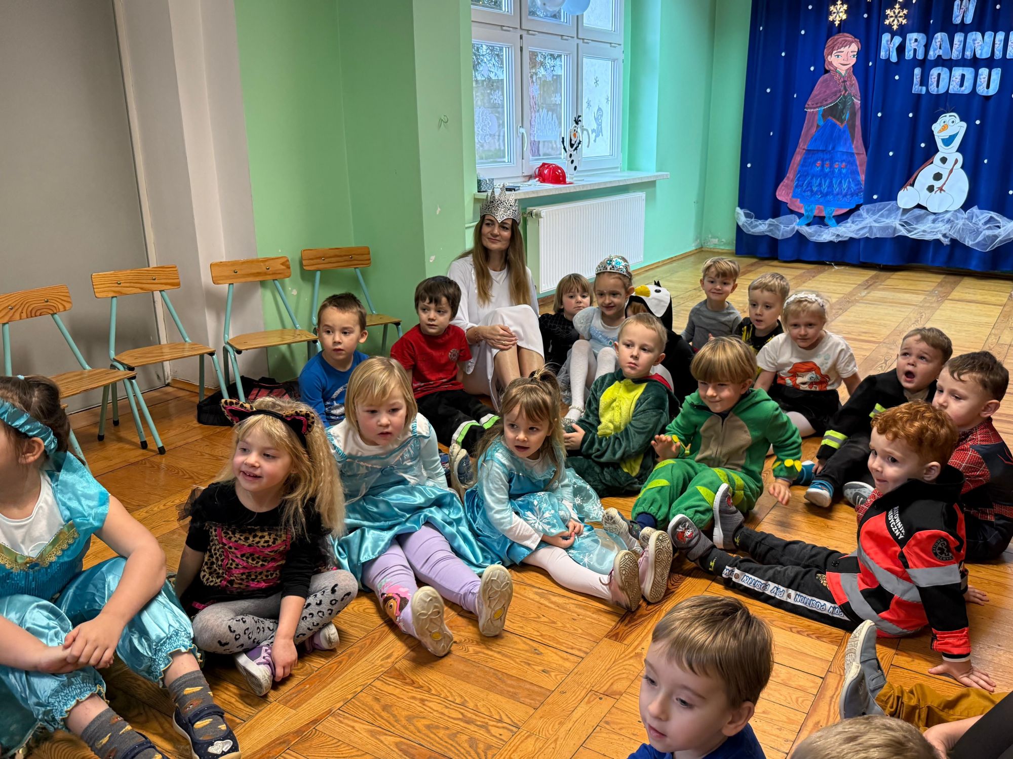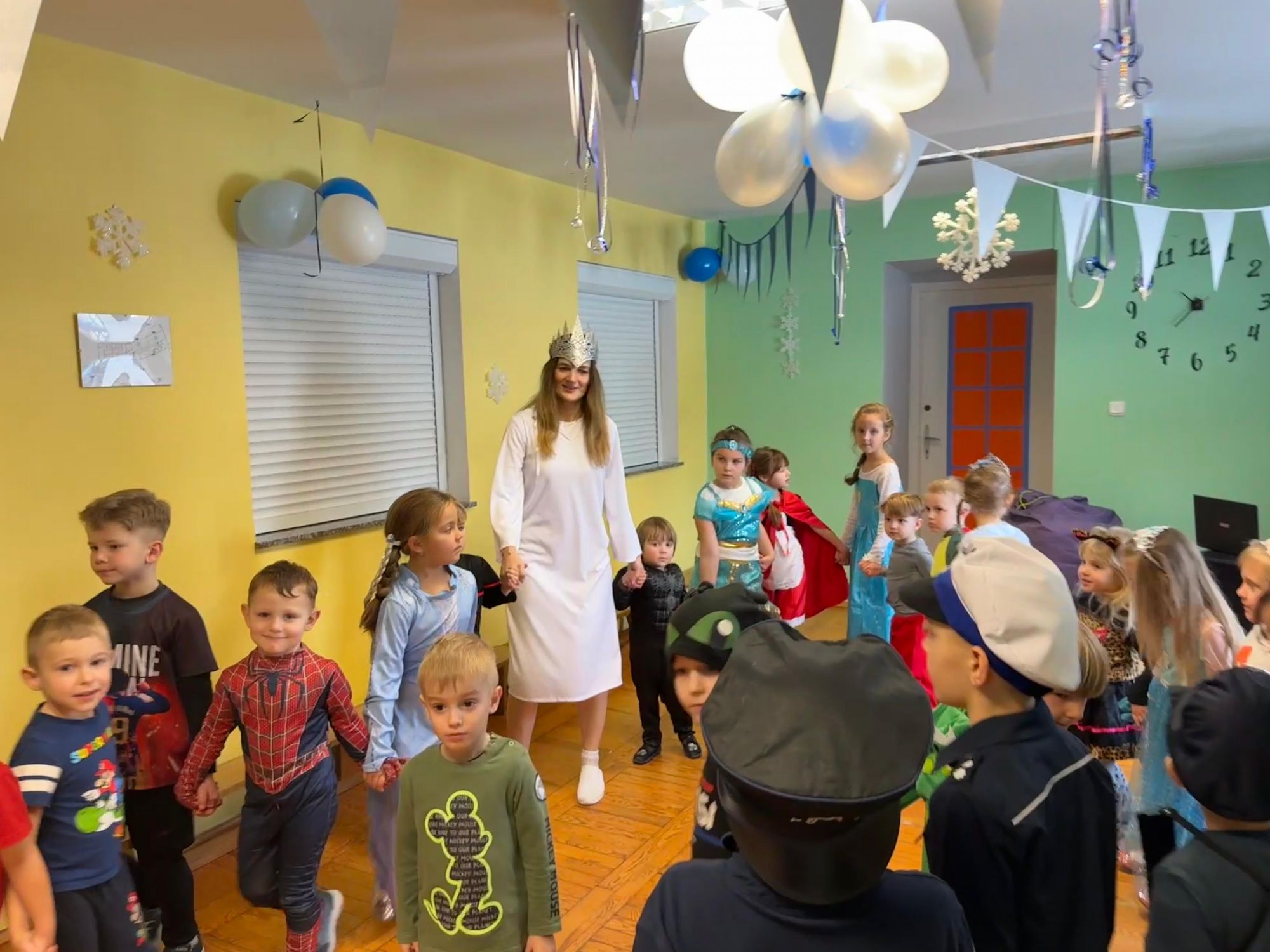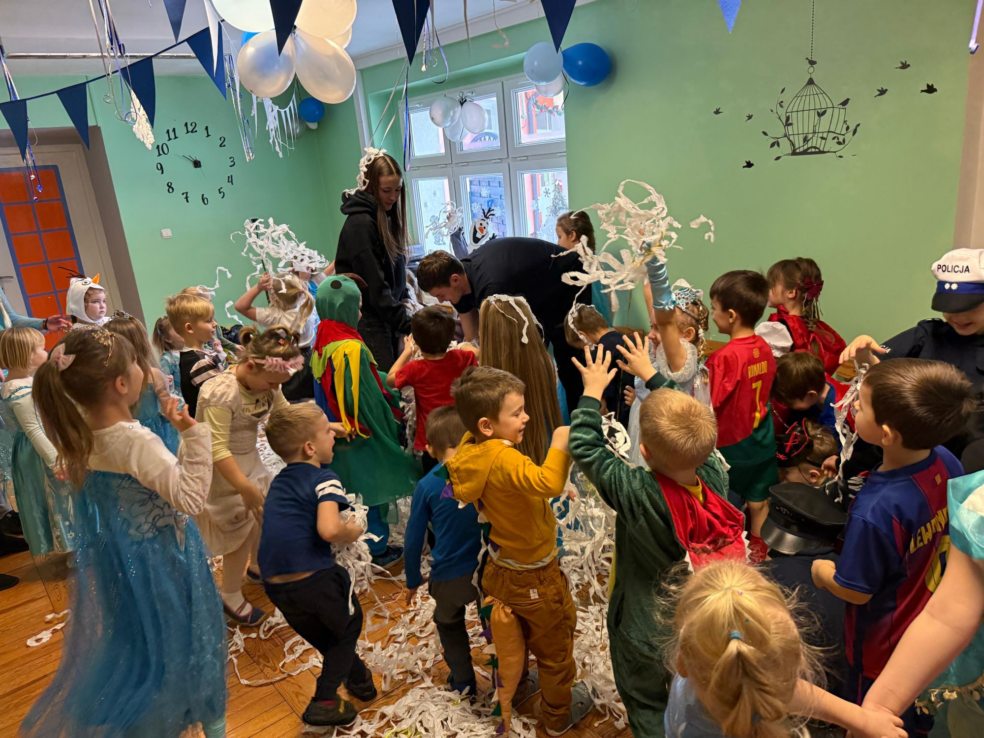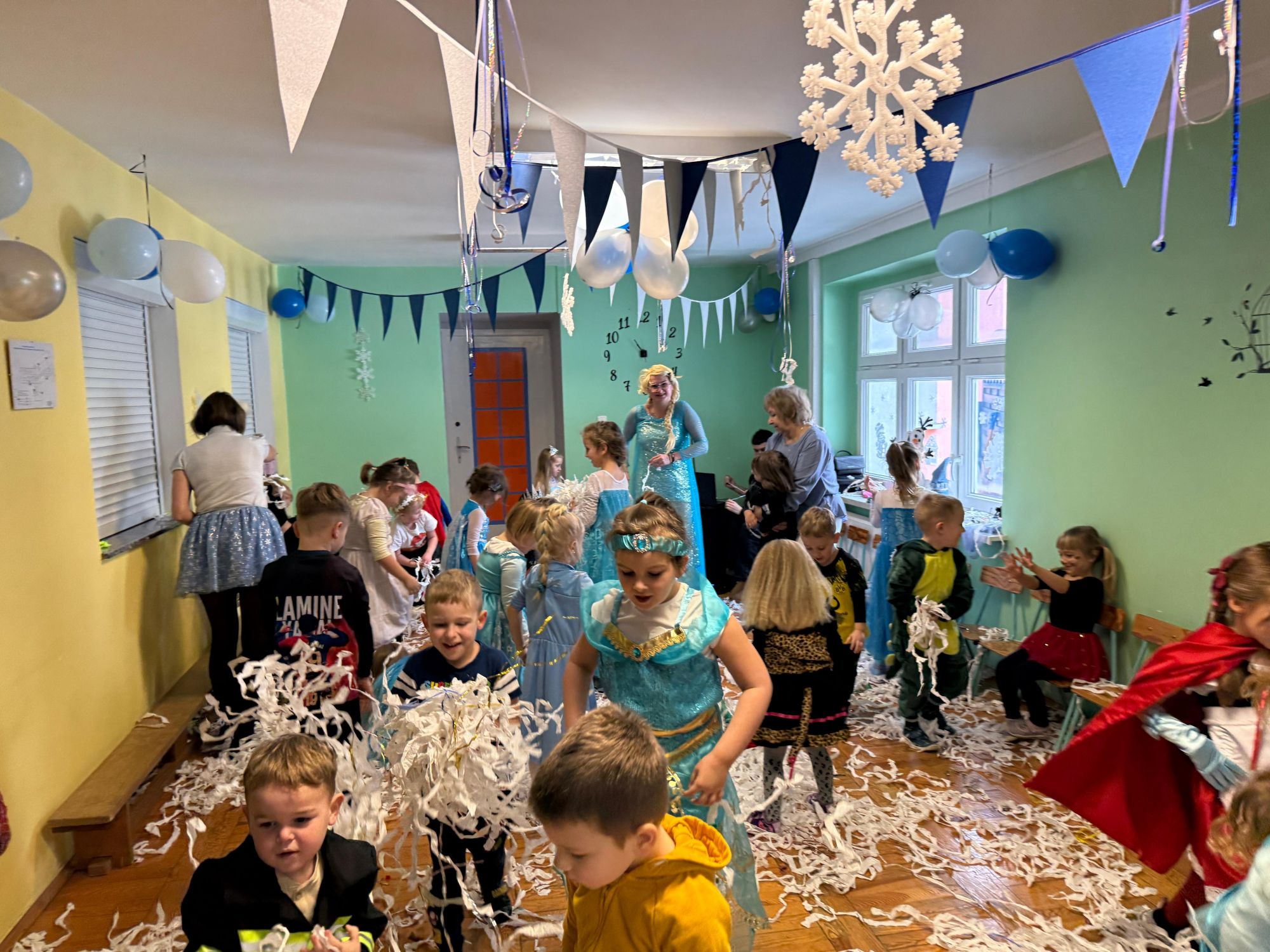15 stycznia w naszym przedszkolu odbył się wyjątkowy bal karnawałowy pod hasłem „W krainie lodu”. To pełne radości i uśmiechu wydarzenie poprowadziła pani Barbara Koprek z firmy Skeleton, która zadbała o wspaniałą atmosferę oraz mnóstwo atrakcji dla najmłodszych. Tego dnia dzieci przyszły do przedszkola przebrane za swoich ulubionych bohaterów z bajek, filmów i nie tylko. Wśród barwnego tłumu można było spotkać m.in. Elsy, Królowe Śniegu, Olafa, bohaterów Psiego Patrolu, policjantów, piłkarzy oraz wiele innych fantastycznych postaci. Sala została specjalnie na tę okazję pięknie udekorowana balonami, girlandami i serpentynami, które doskonale wpisywały się w zimową tematykę balu. Na przedszkolaki czekało mnóstwo atrakcji – wspólne tańce, wesołe konkurencje oraz różnorodne zadania, w których dzieci chętnie brały udział razem z paniami. Nie zabrakło również chwili na odpoczynek i ugaszenie pragnienia. Po radosnych zabawach na dzieci czekał pyszny poczęstunek w postaci deseru „Śnieżna kraina”- kolorowej galaretki, która wszystkim bardzo smakowała. Zwieńczeniem tego wyjątkowego dnia była miła niespodzianka. Przedszkole odwiedził Stitch - kosmiczna postać z bajki Disneya, wywołując u dzieci ogromne emocje i szerokie uśmiechy. Bal karnawałowy był pełen radości, śmiechu i niezapomnianych wrażeń, a wspólna zabawa na długo pozostanie w pamięci wszystkich uczestników.