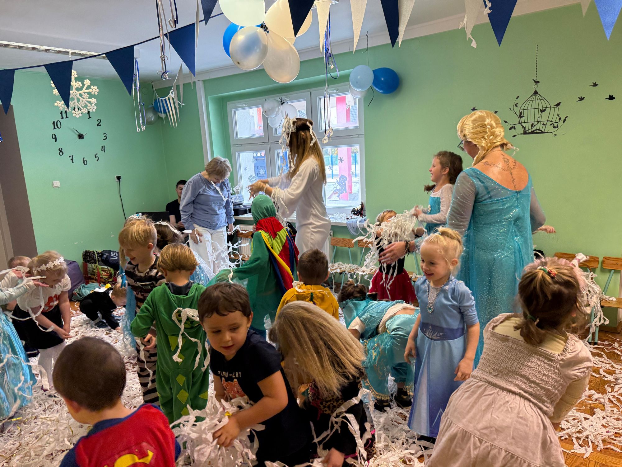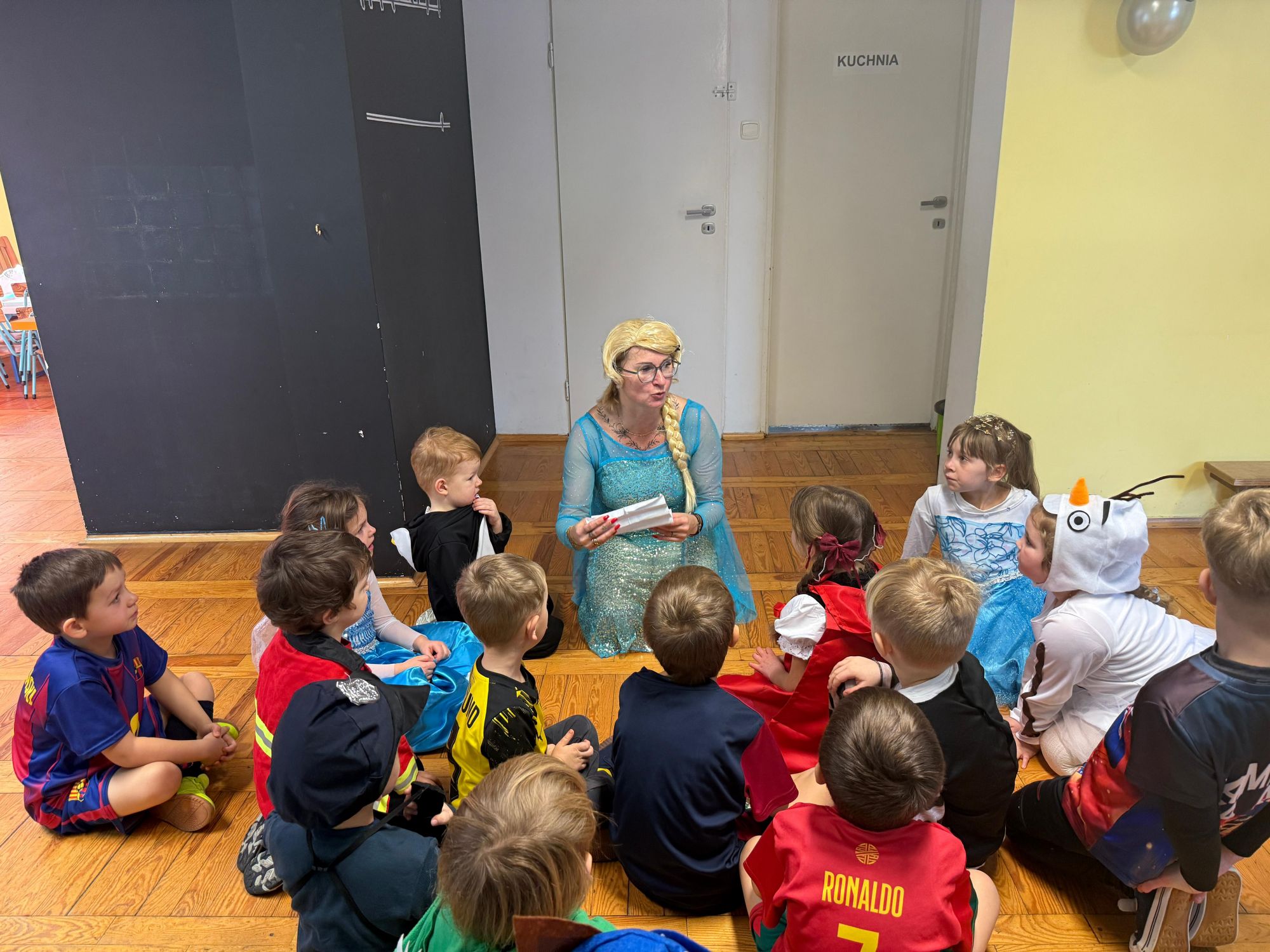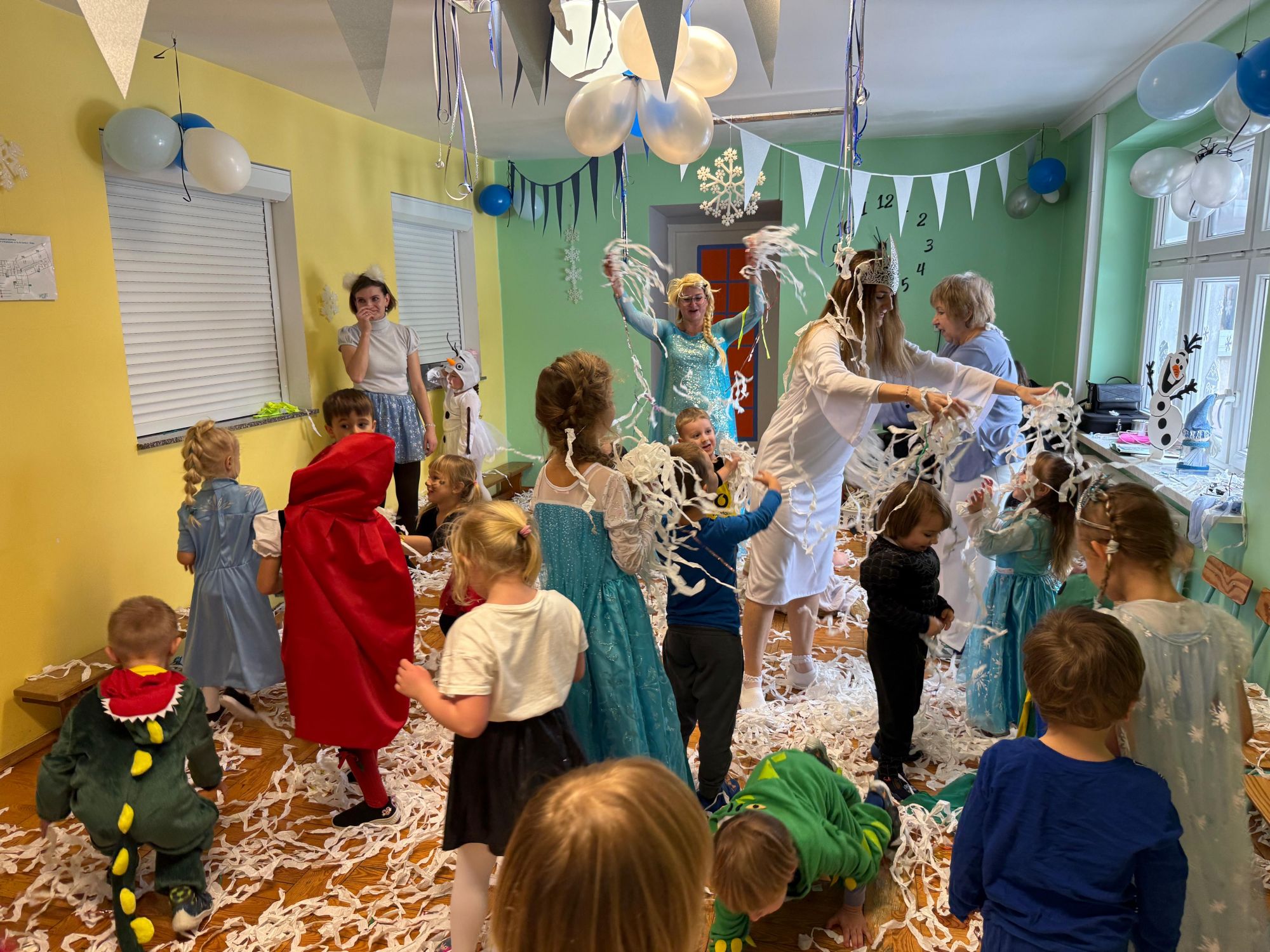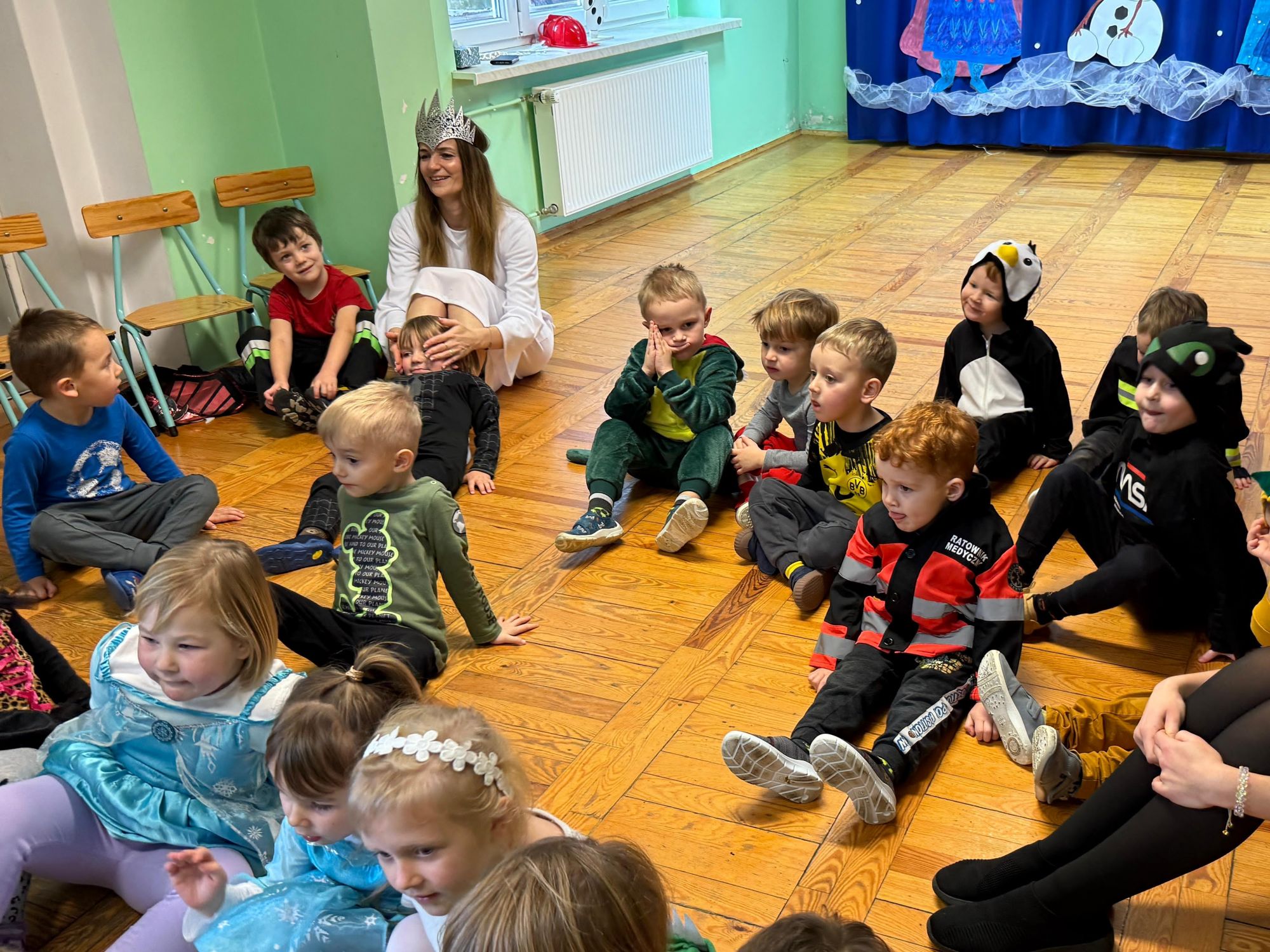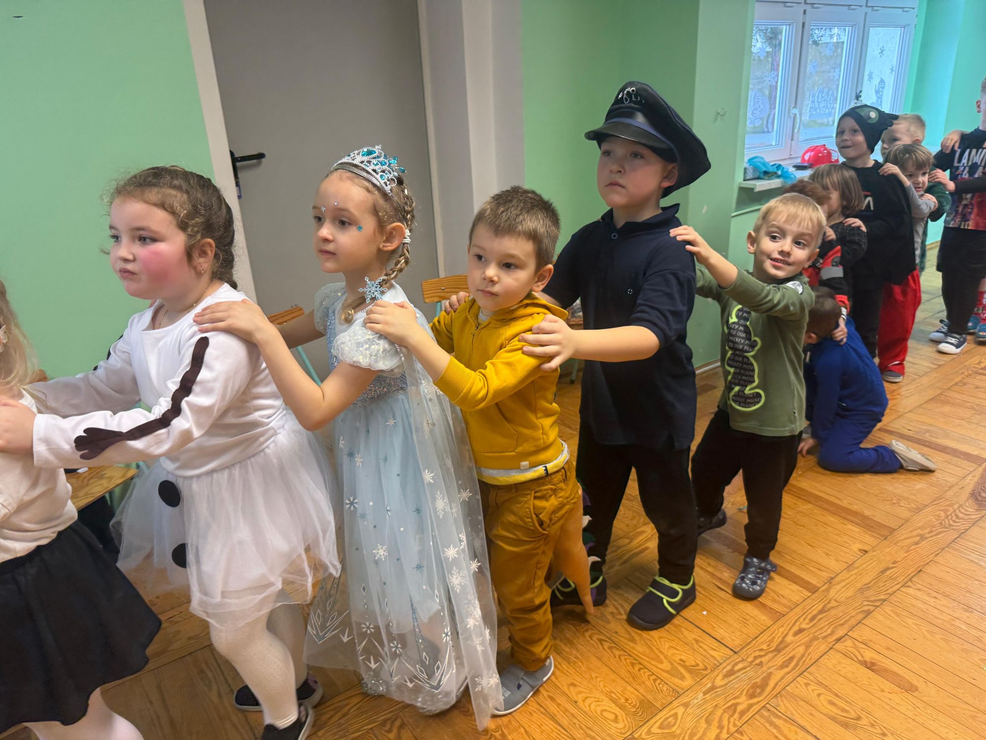 15 stycznia w naszym przedszkolu odbył się wyjątkowy bal karnawałowy pod hasłem „W krainie lodu”. To pełne radości i uśmiechu wydarzenie poprowadziła pani Barbara Koprek z firmy Skeleton, która zadbała o wspaniałą atmosferę oraz mnóstwo atrakcji dla najmłodszych. Tego dnia dzieci przyszły do przedszkola przebrane za swoich ulubionych bohaterów z bajek, filmów i nie tylko. Wśród barwnego tłumu można było spotkać m.in. Elsy, Królowe Śniegu, Olafa, bohaterów Psiego Patrolu, policjantów, piłkarzy oraz wiele innych fantastycznych postaci. Sala została specjalnie na tę okazję pięknie udekorowana balonami, girlandami i serpentynami, które doskonale wpisywały się w zimową tematykę balu. Na przedszkolaki czekało mnóstwo atrakcji – wspólne tańce, wesołe konkurencje oraz różnorodne zadania, w których dzieci chętnie brały udział razem z paniami. Nie zabrakło również chwili na odpoczynek i ugaszenie pragnienia. Po radosnych zabawach na dzieci czekał pyszny poczęstunek w postaci deseru „Śnieżna kraina”- kolorowej galaretki, która wszystkim bardzo smakowała. Zwieńczeniem tego wyjątkowego dnia była miła niespodzianka. Przedszkole odwiedził Stitch - kosmiczna postać z bajki Disneya, wywołując u dzieci ogromne emocje i szerokie uśmiechy. Bal karnawałowy był pełen radości, śmiechu i niezapomnianych wrażeń, a wspólna zabawa na długo pozostanie w pamięci wszystkich uczestników.