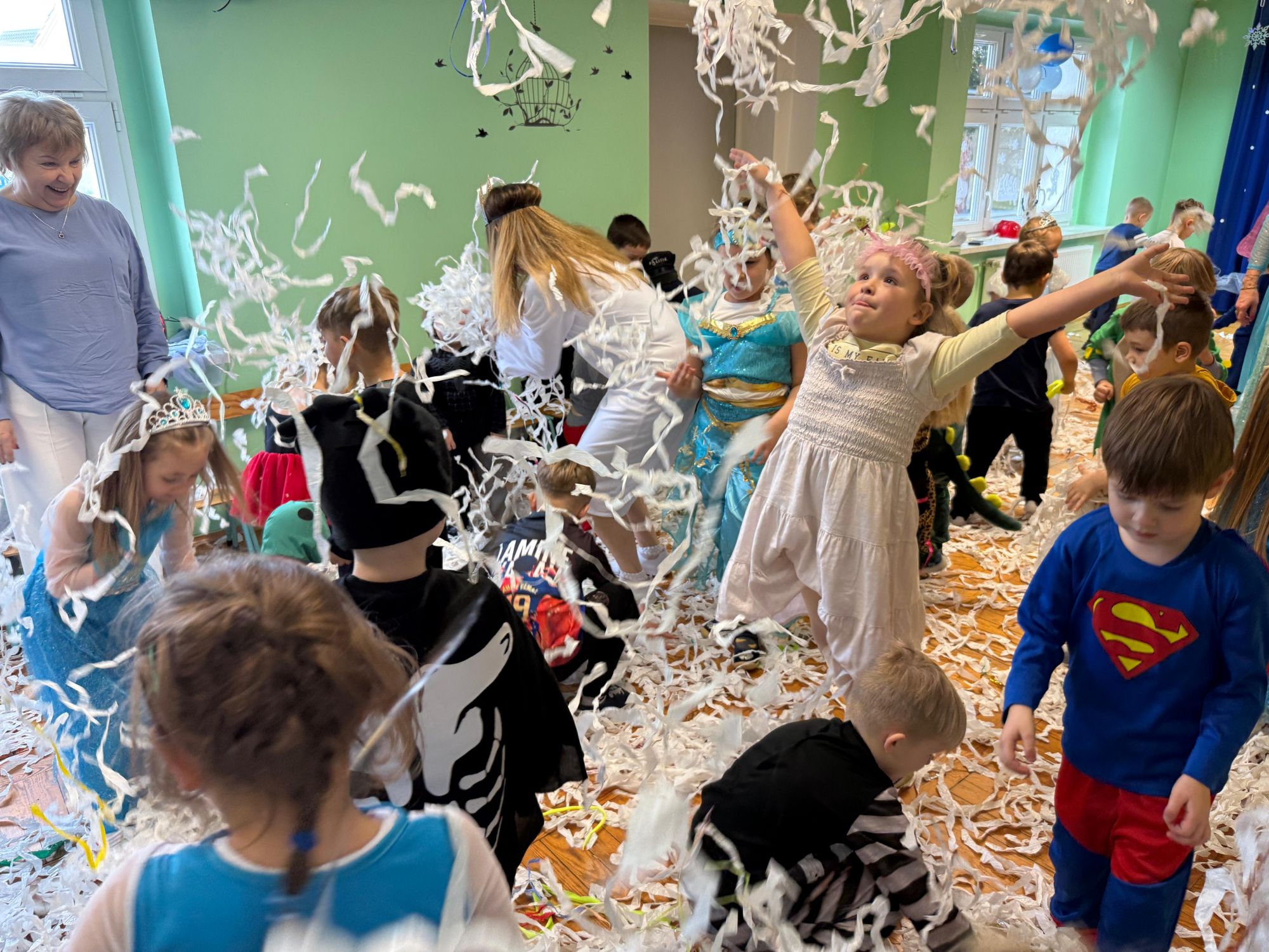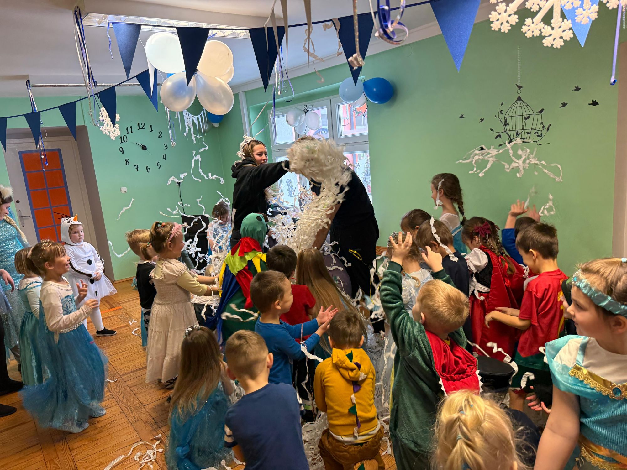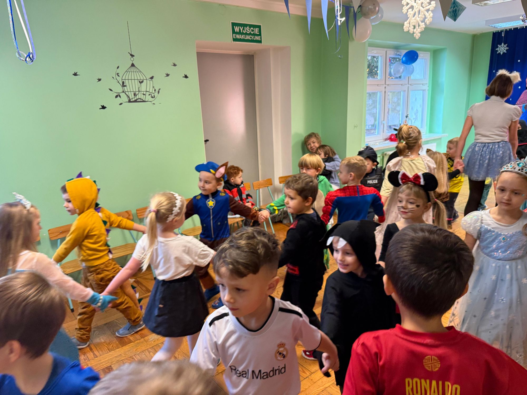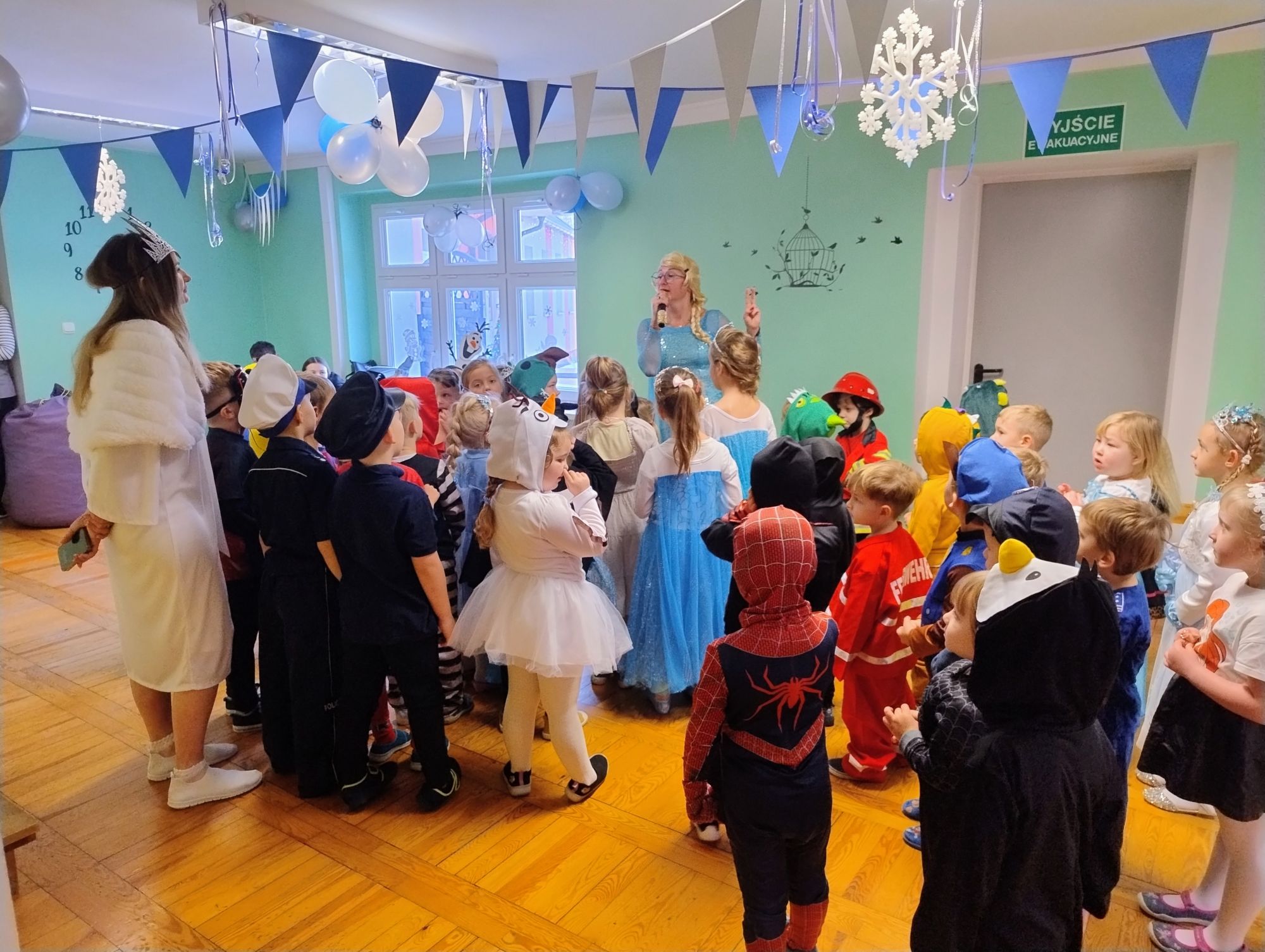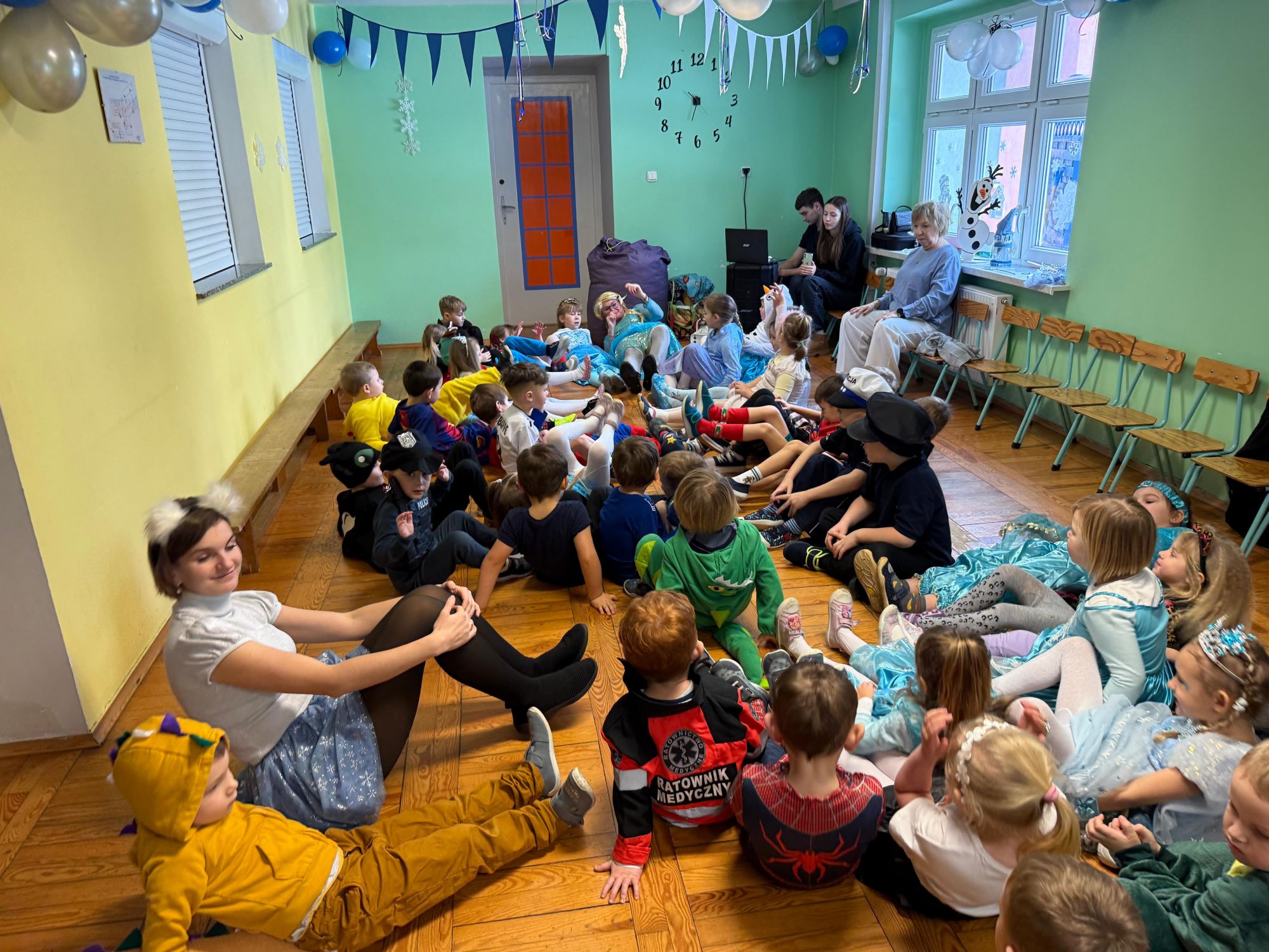 15 stycznia w naszym przedszkolu odbył się wyjątkowy bal karnawałowy pod hasłem „W krainie lodu”. To pełne radości i uśmiechu wydarzenie poprowadziła pani Barbara Koprek z firmy Skeleton, która zadbała o wspaniałą atmosferę oraz mnóstwo atrakcji dla najmłodszych. Tego dnia dzieci przyszły do przedszkola przebrane za swoich ulubionych bohaterów z bajek, filmów i nie tylko. Wśród barwnego tłumu można było spotkać m.in. Elsy, Królowe Śniegu, Olafa, bohaterów Psiego Patrolu, policjantów, piłkarzy oraz wiele innych fantastycznych postaci. Sala została specjalnie na tę okazję pięknie udekorowana balonami, girlandami i serpentynami, które doskonale wpisywały się w zimową tematykę balu. Na przedszkolaki czekało mnóstwo atrakcji – wspólne tańce, wesołe konkurencje oraz różnorodne zadania, w których dzieci chętnie brały udział razem z paniami. Nie zabrakło również chwili na odpoczynek i ugaszenie pragnienia. Po radosnych zabawach na dzieci czekał pyszny poczęstunek w postaci deseru „Śnieżna kraina”- kolorowej galaretki, która wszystkim bardzo smakowała. Zwieńczeniem tego wyjątkowego dnia była miła niespodzianka. Przedszkole odwiedził Stitch - kosmiczna postać z bajki Disneya, wywołując u dzieci ogromne emocje i szerokie uśmiechy. Bal karnawałowy był pełen radości, śmiechu i niezapomnianych wrażeń, a wspólna zabawa na długo pozostanie w pamięci wszystkich uczestników.
