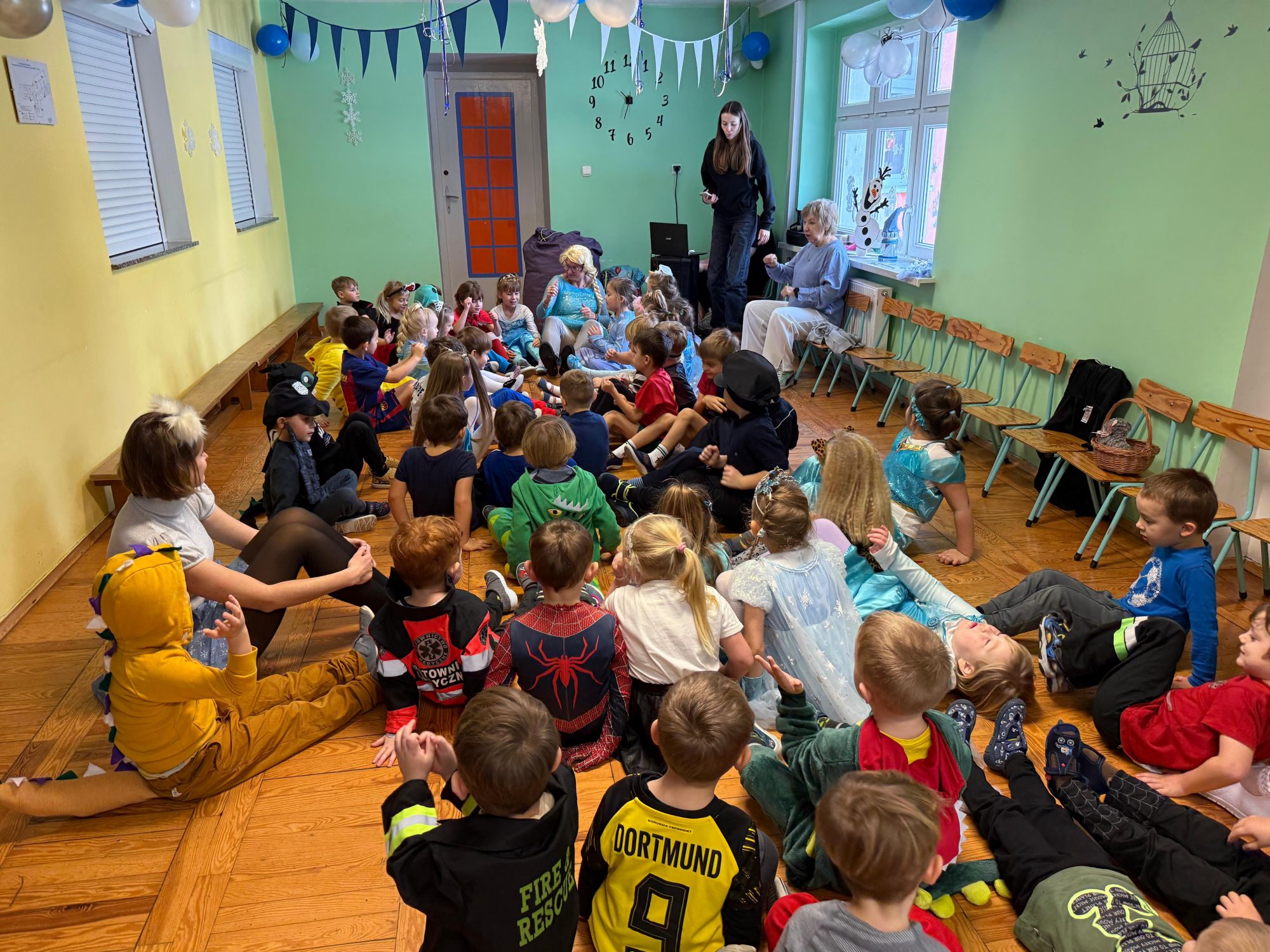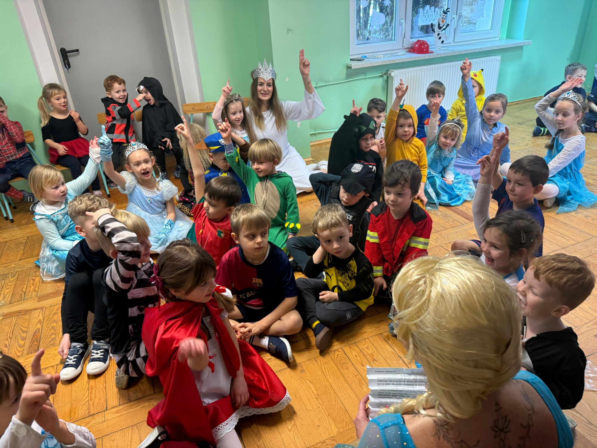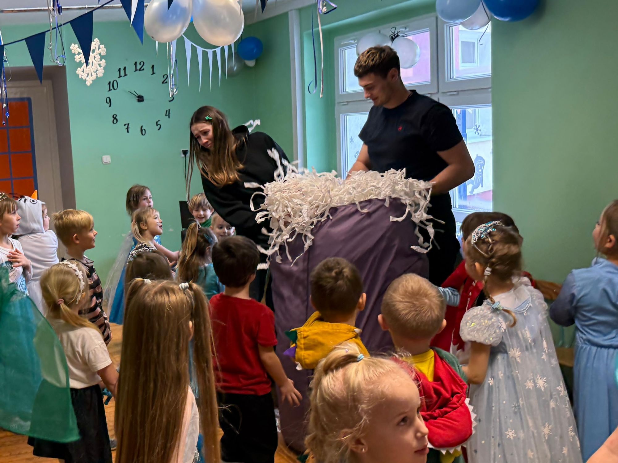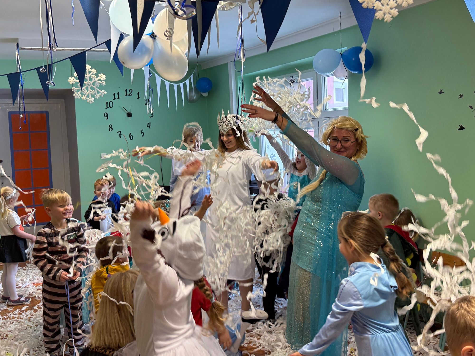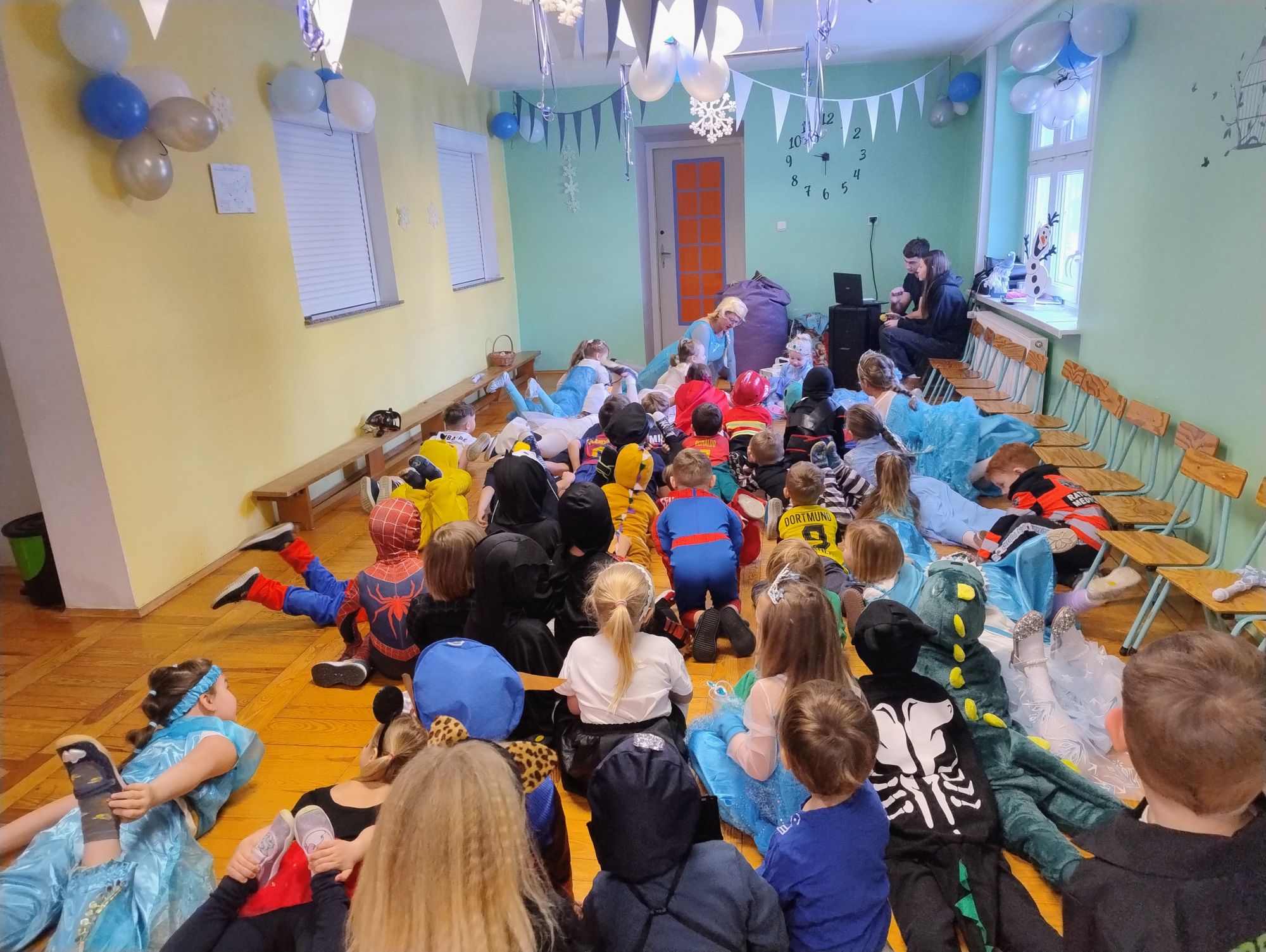15 stycznia w naszym przedszkolu odbył się wyjątkowy bal karnawałowy pod hasłem „W krainie lodu”. To pełne radości i uśmiechu wydarzenie poprowadziła pani Barbara Koprek z firmy Skeleton, która zadbała o wspaniałą atmosferę oraz mnóstwo atrakcji dla najmłodszych. Tego dnia dzieci przyszły do przedszkola przebrane za swoich ulubionych bohaterów z bajek, filmów i nie tylko. Wśród barwnego tłumu można było spotkać m.in. Elsy, Królowe Śniegu, Olafa, bohaterów Psiego Patrolu, policjantów, piłkarzy oraz wiele innych fantastycznych postaci. Sala została specjalnie na tę okazję pięknie udekorowana balonami, girlandami i serpentynami, które doskonale wpisywały się w zimową tematykę balu. Na przedszkolaki czekało mnóstwo atrakcji – wspólne tańce, wesołe konkurencje oraz różnorodne zadania, w których dzieci chętnie brały udział razem z paniami. Nie zabrakło również chwili na odpoczynek i ugaszenie pragnienia. Po radosnych zabawach na dzieci czekał pyszny poczęstunek w postaci deseru „Śnieżna kraina”- kolorowej galaretki, która wszystkim bardzo smakowała. Zwieńczeniem tego wyjątkowego dnia była miła niespodzianka. Przedszkole odwiedził Stitch - kosmiczna postać z bajki Disneya, wywołując u dzieci ogromne emocje i szerokie uśmiechy. Bal karnawałowy był pełen radości, śmiechu i niezapomnianych wrażeń, a wspólna zabawa na długo pozostanie w pamięci wszystkich uczestników.