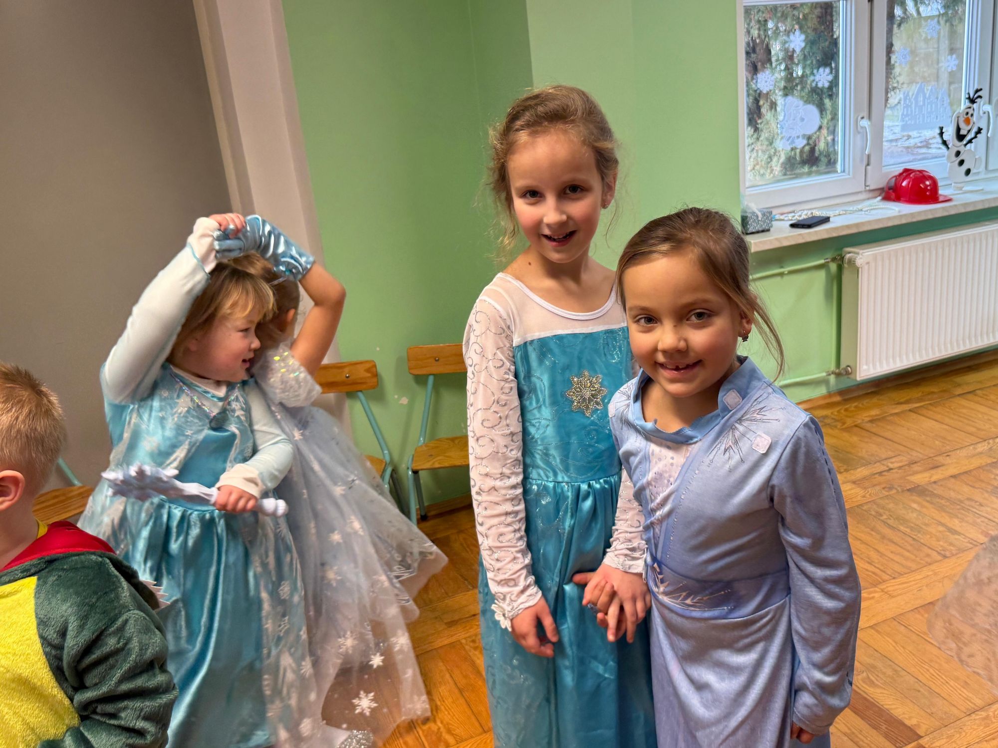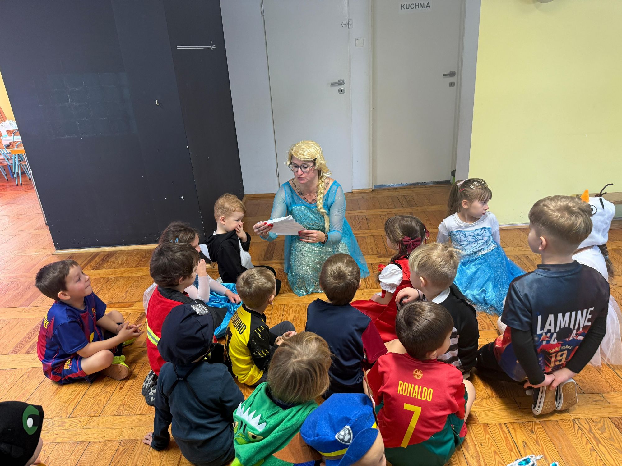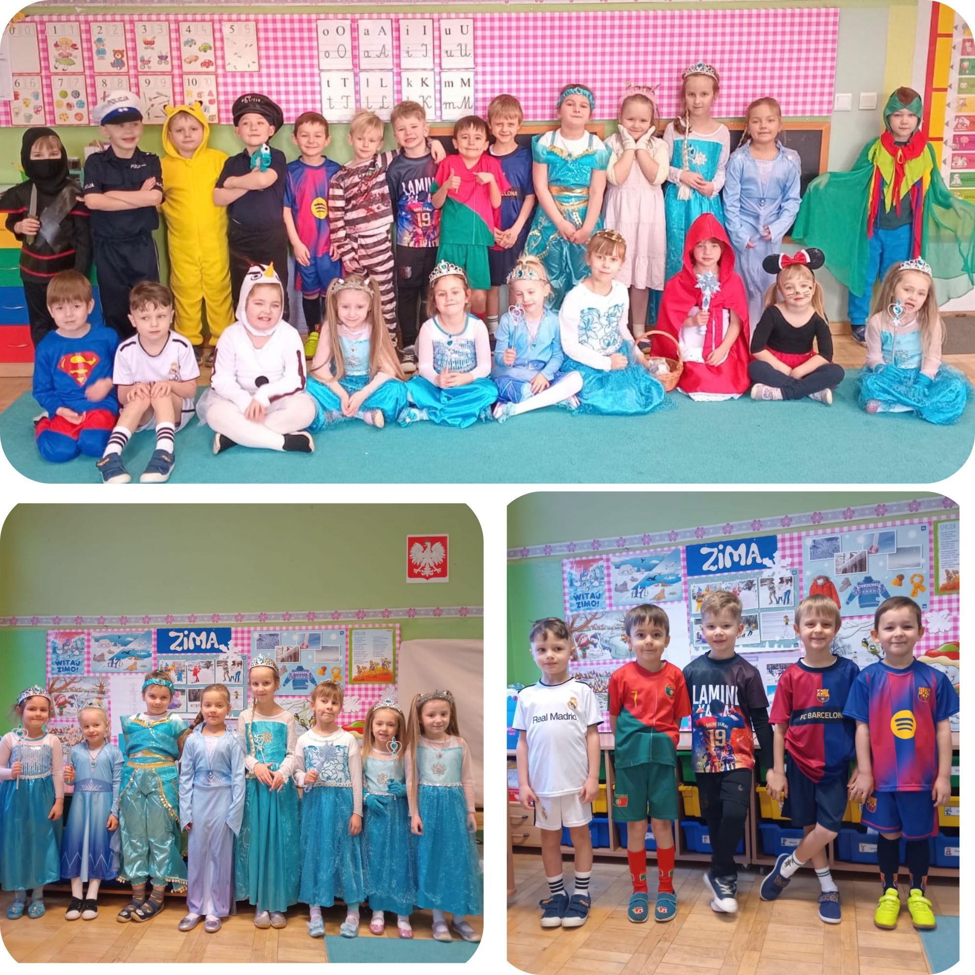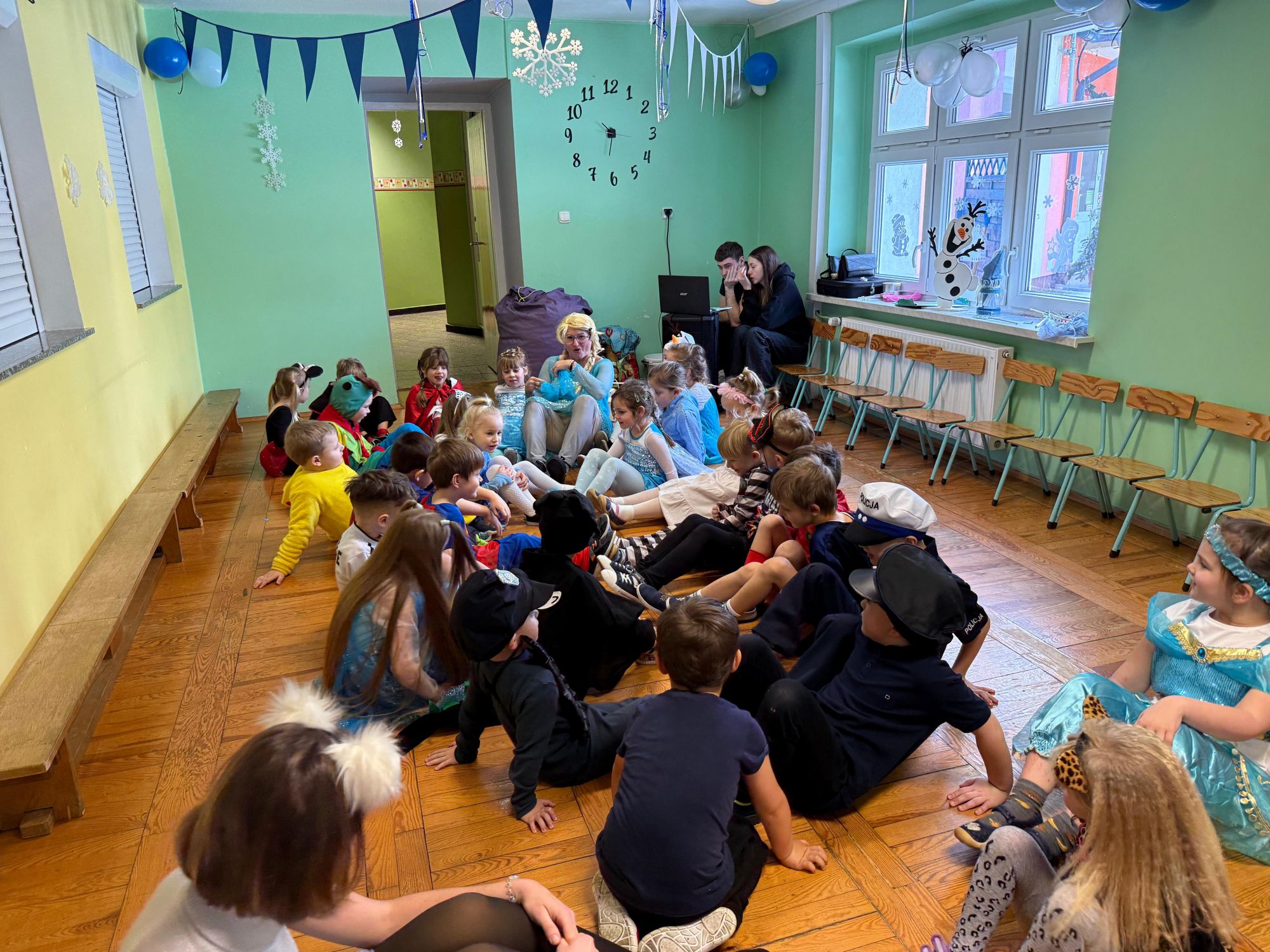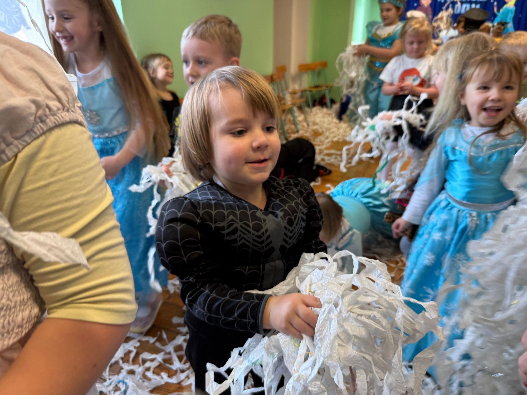 15 stycznia w naszym przedszkolu odbył się wyjątkowy bal karnawałowy pod hasłem „W krainie lodu”. To pełne radości i uśmiechu wydarzenie poprowadziła pani Barbara Koprek z firmy Skeleton, która zadbała o wspaniałą atmosferę oraz mnóstwo atrakcji dla najmłodszych. Tego dnia dzieci przyszły do przedszkola przebrane za swoich ulubionych bohaterów z bajek, filmów i nie tylko. Wśród barwnego tłumu można było spotkać m.in. Elsy, Królowe Śniegu, Olafa, bohaterów Psiego Patrolu, policjantów, piłkarzy oraz wiele innych fantastycznych postaci. Sala została specjalnie na tę okazję pięknie udekorowana balonami, girlandami i serpentynami, które doskonale wpisywały się w zimową tematykę balu. Na przedszkolaki czekało mnóstwo atrakcji – wspólne tańce, wesołe konkurencje oraz różnorodne zadania, w których dzieci chętnie brały udział razem z paniami. Nie zabrakło również chwili na odpoczynek i ugaszenie pragnienia. Po radosnych zabawach na dzieci czekał pyszny poczęstunek w postaci deseru „Śnieżna kraina”- kolorowej galaretki, która wszystkim bardzo smakowała. Zwieńczeniem tego wyjątkowego dnia była miła niespodzianka. Przedszkole odwiedził Stitch - kosmiczna postać z bajki Disneya, wywołując u dzieci ogromne emocje i szerokie uśmiechy. Bal karnawałowy był pełen radości, śmiechu i niezapomnianych wrażeń, a wspólna zabawa na długo pozostanie w pamięci wszystkich uczestników.