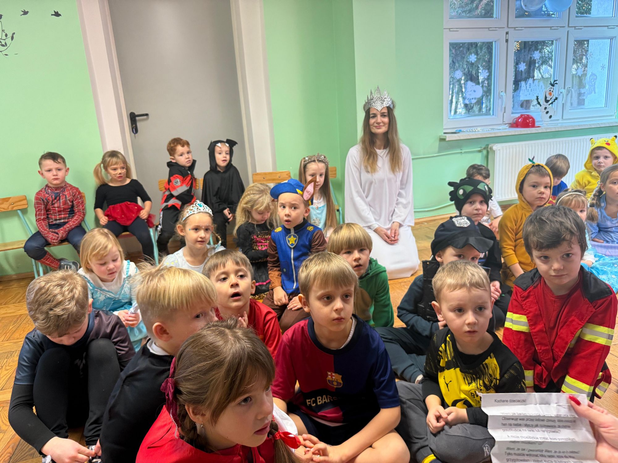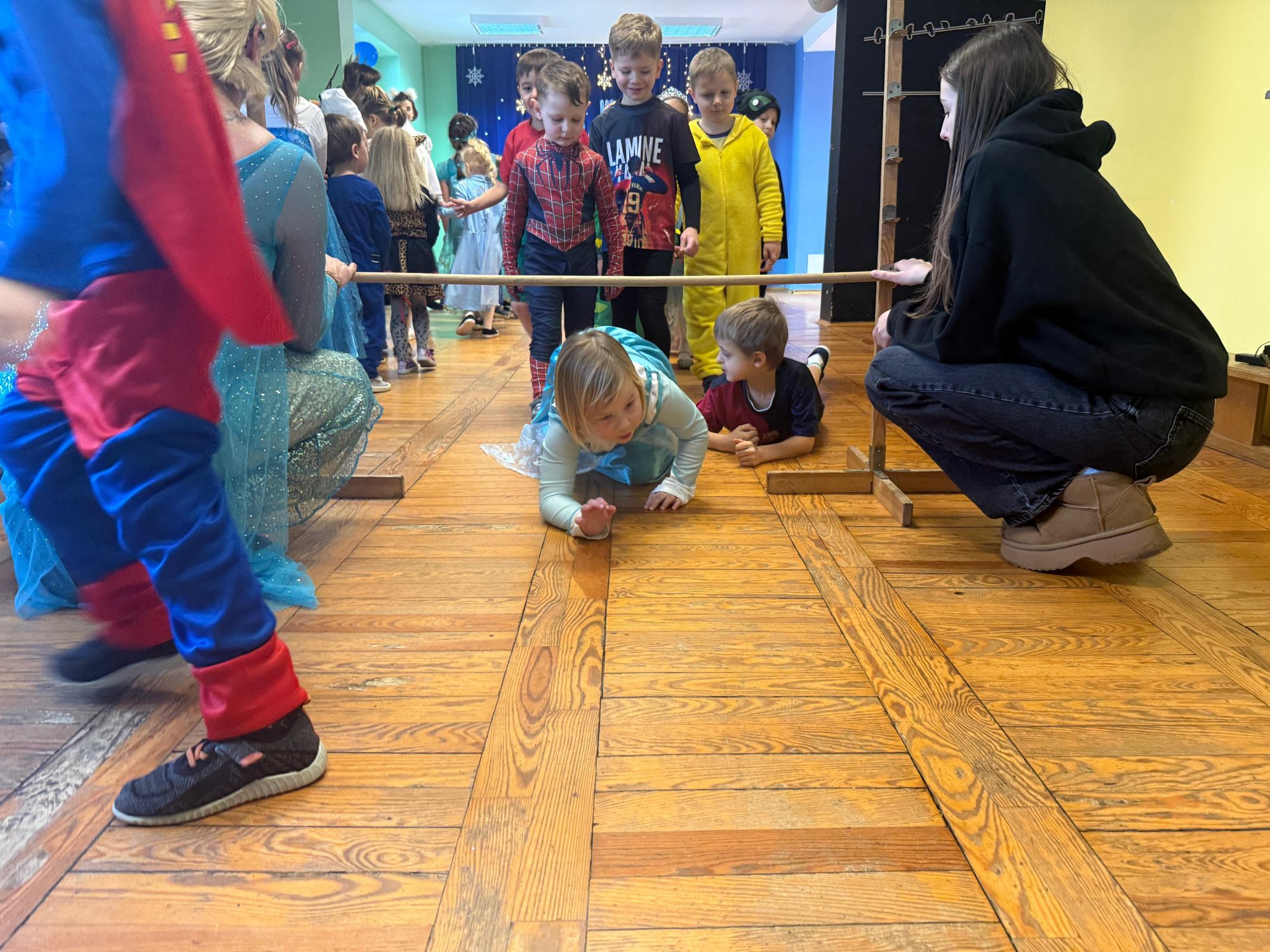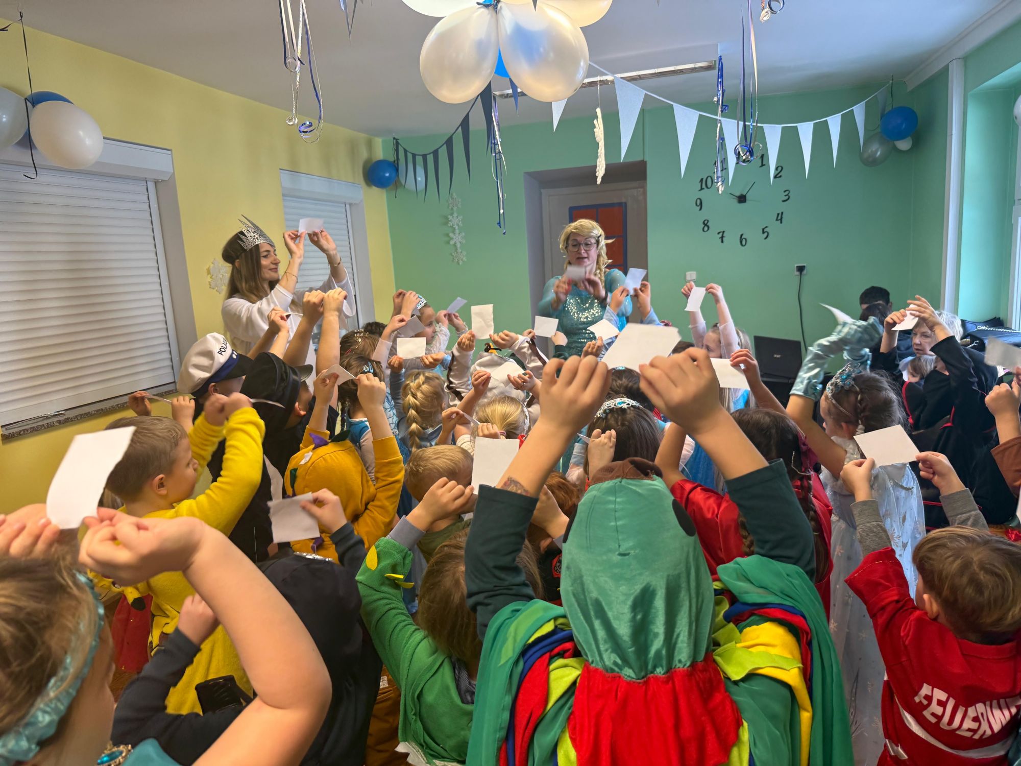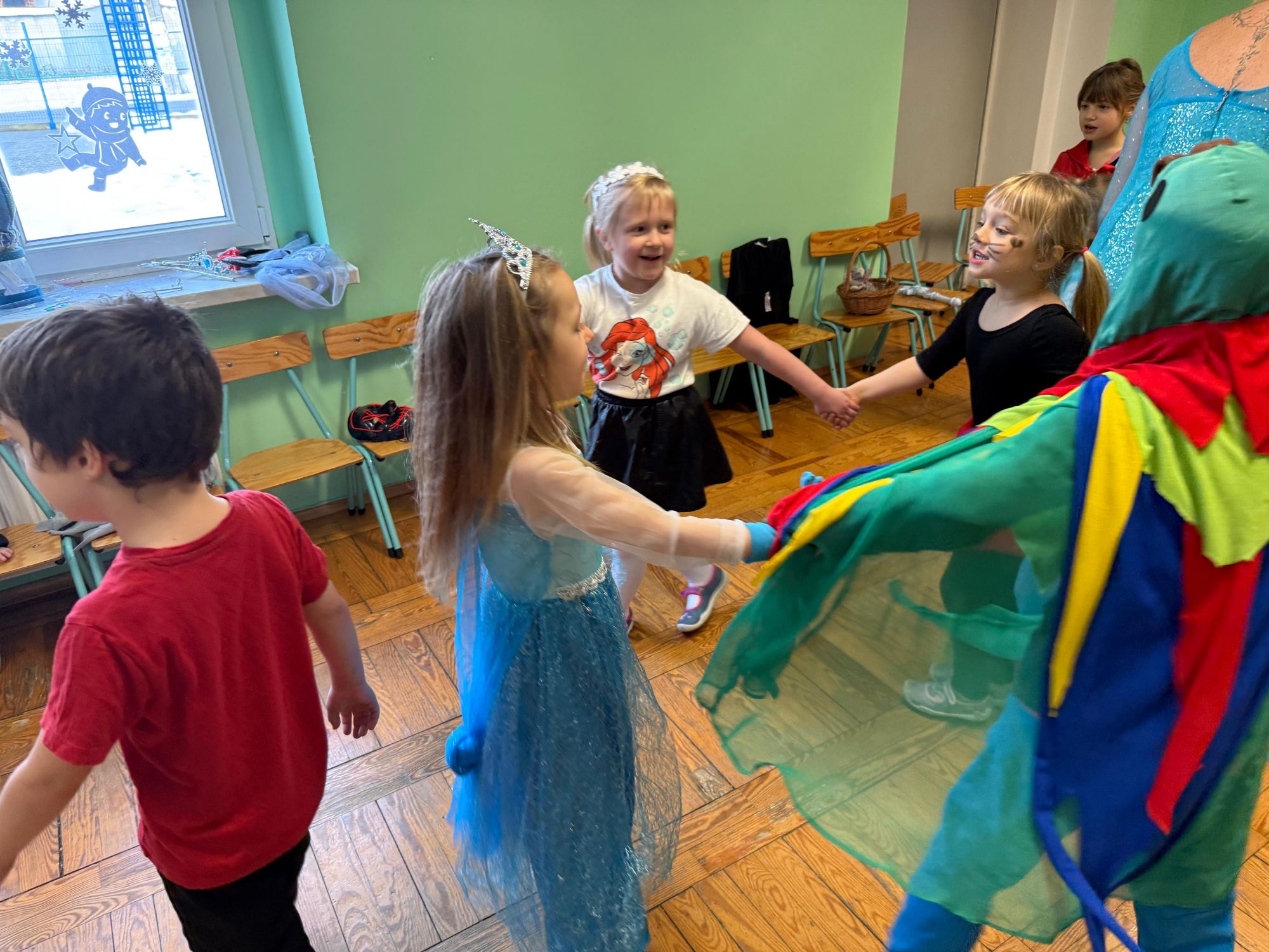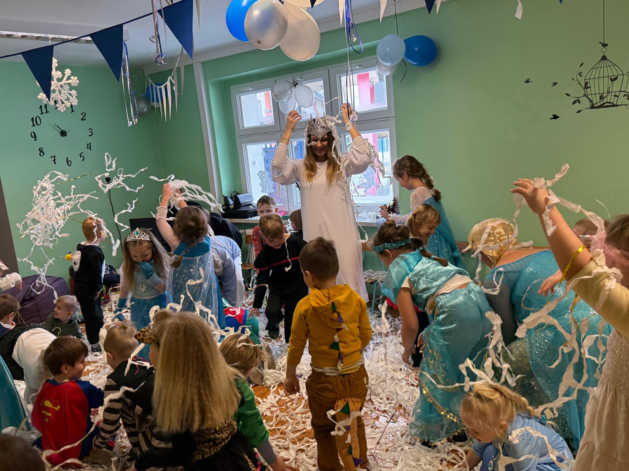 15 stycznia w naszym przedszkolu odbył się wyjątkowy bal karnawałowy pod hasłem „W krainie lodu”. To pełne radości i uśmiechu wydarzenie poprowadziła pani Barbara Koprek z firmy Skeleton, która zadbała o wspaniałą atmosferę oraz mnóstwo atrakcji dla najmłodszych. Tego dnia dzieci przyszły do przedszkola przebrane za swoich ulubionych bohaterów z bajek, filmów i nie tylko. Wśród barwnego tłumu można było spotkać m.in. Elsy, Królowe Śniegu, Olafa, bohaterów Psiego Patrolu, policjantów, piłkarzy oraz wiele innych fantastycznych postaci. Sala została specjalnie na tę okazję pięknie udekorowana balonami, girlandami i serpentynami, które doskonale wpisywały się w zimową tematykę balu. Na przedszkolaki czekało mnóstwo atrakcji – wspólne tańce, wesołe konkurencje oraz różnorodne zadania, w których dzieci chętnie brały udział razem z paniami. Nie zabrakło również chwili na odpoczynek i ugaszenie pragnienia. Po radosnych zabawach na dzieci czekał pyszny poczęstunek w postaci deseru „Śnieżna kraina”- kolorowej galaretki, która wszystkim bardzo smakowała. Zwieńczeniem tego wyjątkowego dnia była miła niespodzianka. Przedszkole odwiedził Stitch - kosmiczna postać z bajki Disneya, wywołując u dzieci ogromne emocje i szerokie uśmiechy. Bal karnawałowy był pełen radości, śmiechu i niezapomnianych wrażeń, a wspólna zabawa na długo pozostanie w pamięci wszystkich uczestników.