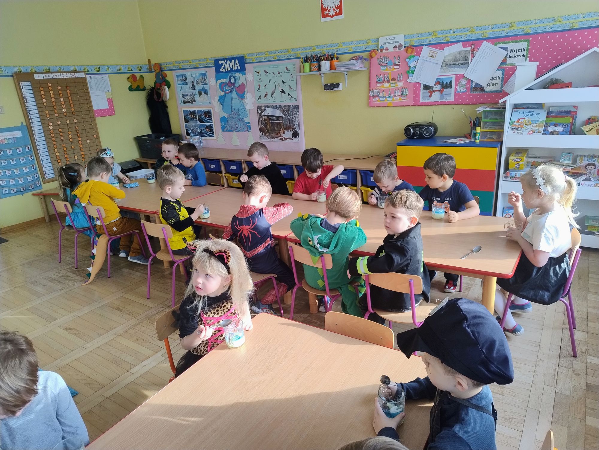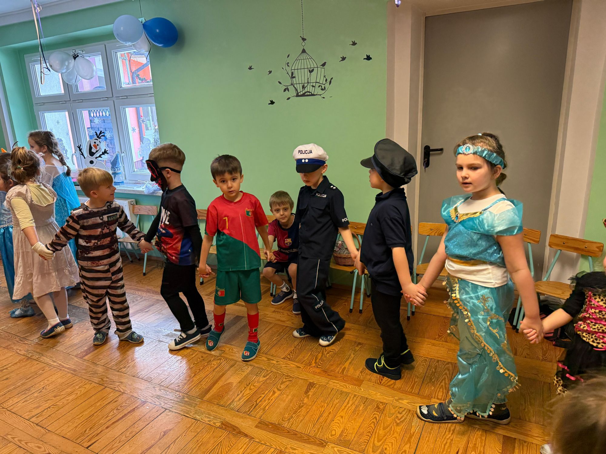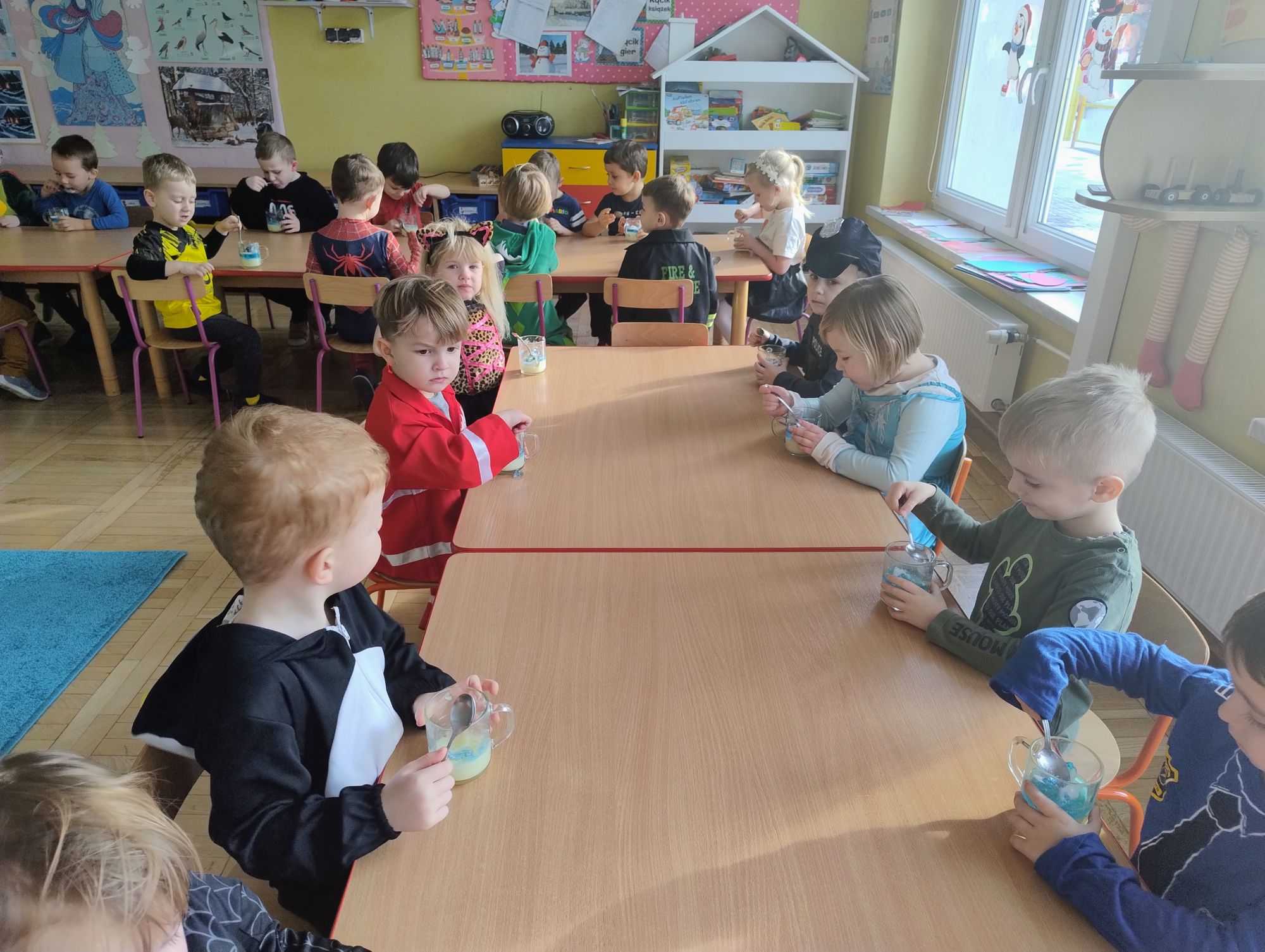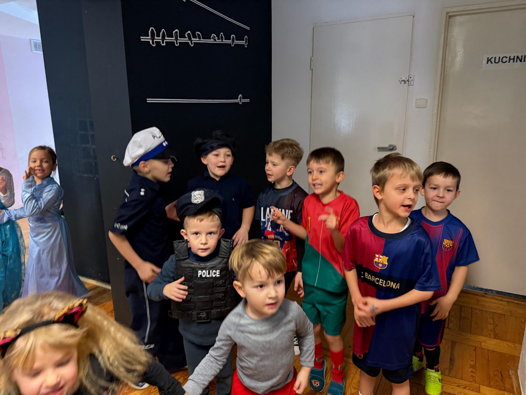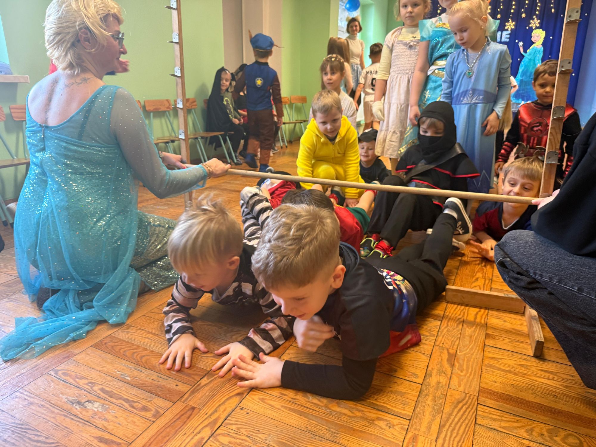 15 stycznia w naszym przedszkolu odbył się wyjątkowy bal karnawałowy pod hasłem „W krainie lodu”. To pełne radości i uśmiechu wydarzenie poprowadziła pani Barbara Koprek z firmy Skeleton, która zadbała o wspaniałą atmosferę oraz mnóstwo atrakcji dla najmłodszych. Tego dnia dzieci przyszły do przedszkola przebrane za swoich ulubionych bohaterów z bajek, filmów i nie tylko. Wśród barwnego tłumu można było spotkać m.in. Elsy, Królowe Śniegu, Olafa, bohaterów Psiego Patrolu, policjantów, piłkarzy oraz wiele innych fantastycznych postaci. Sala została specjalnie na tę okazję pięknie udekorowana balonami, girlandami i serpentynami, które doskonale wpisywały się w zimową tematykę balu. Na przedszkolaki czekało mnóstwo atrakcji – wspólne tańce, wesołe konkurencje oraz różnorodne zadania, w których dzieci chętnie brały udział razem z paniami. Nie zabrakło również chwili na odpoczynek i ugaszenie pragnienia. Po radosnych zabawach na dzieci czekał pyszny poczęstunek w postaci deseru „Śnieżna kraina”- kolorowej galaretki, która wszystkim bardzo smakowała. Zwieńczeniem tego wyjątkowego dnia była miła niespodzianka. Przedszkole odwiedził Stitch - kosmiczna postać z bajki Disneya, wywołując u dzieci ogromne emocje i szerokie uśmiechy. Bal karnawałowy był pełen radości, śmiechu i niezapomnianych wrażeń, a wspólna zabawa na długo pozostanie w pamięci wszystkich uczestników.