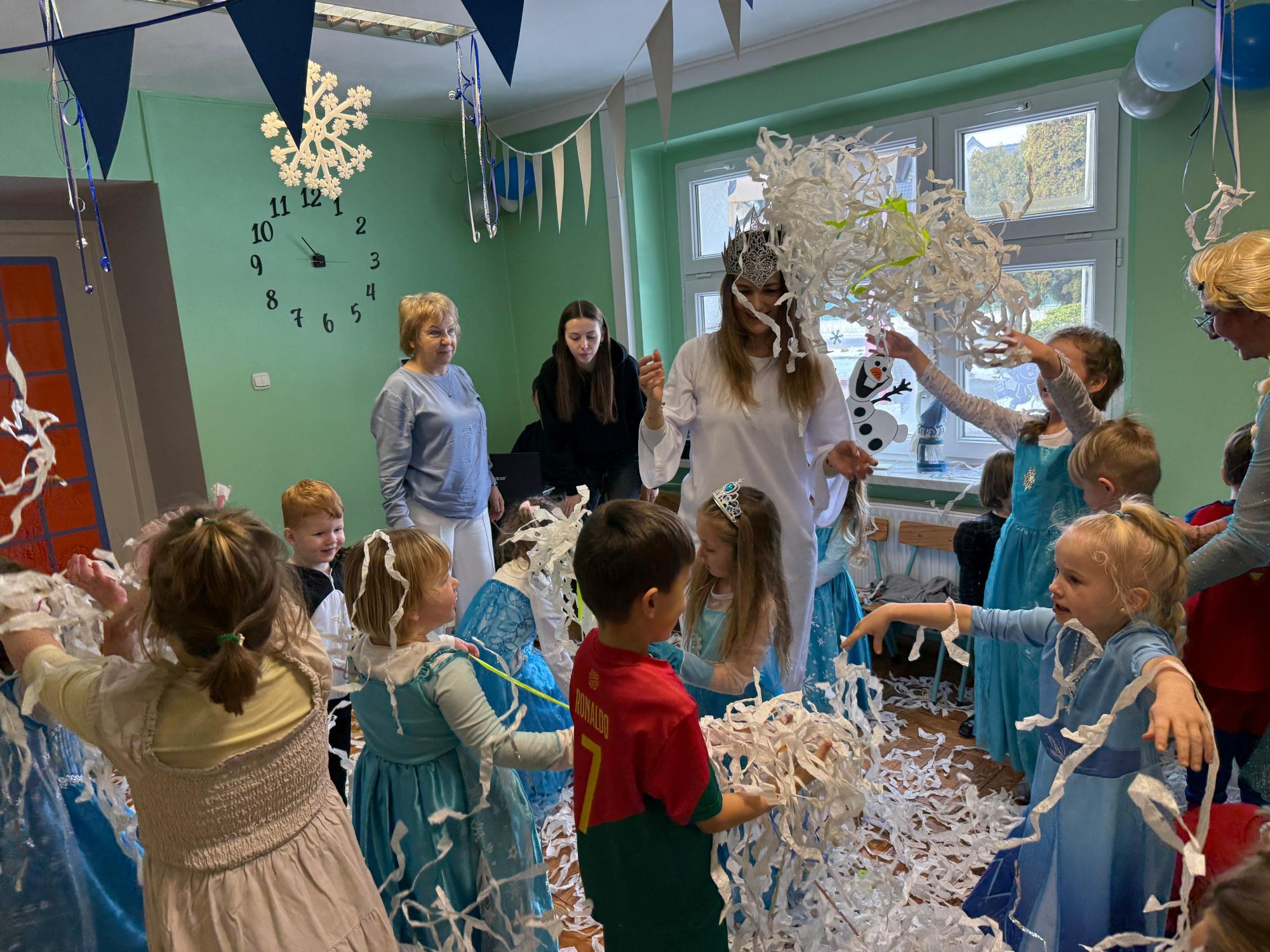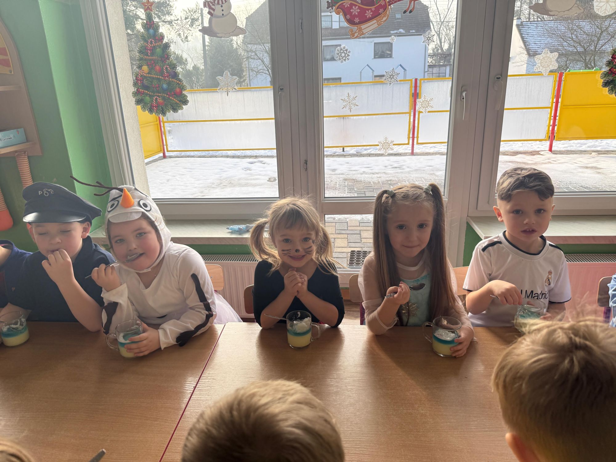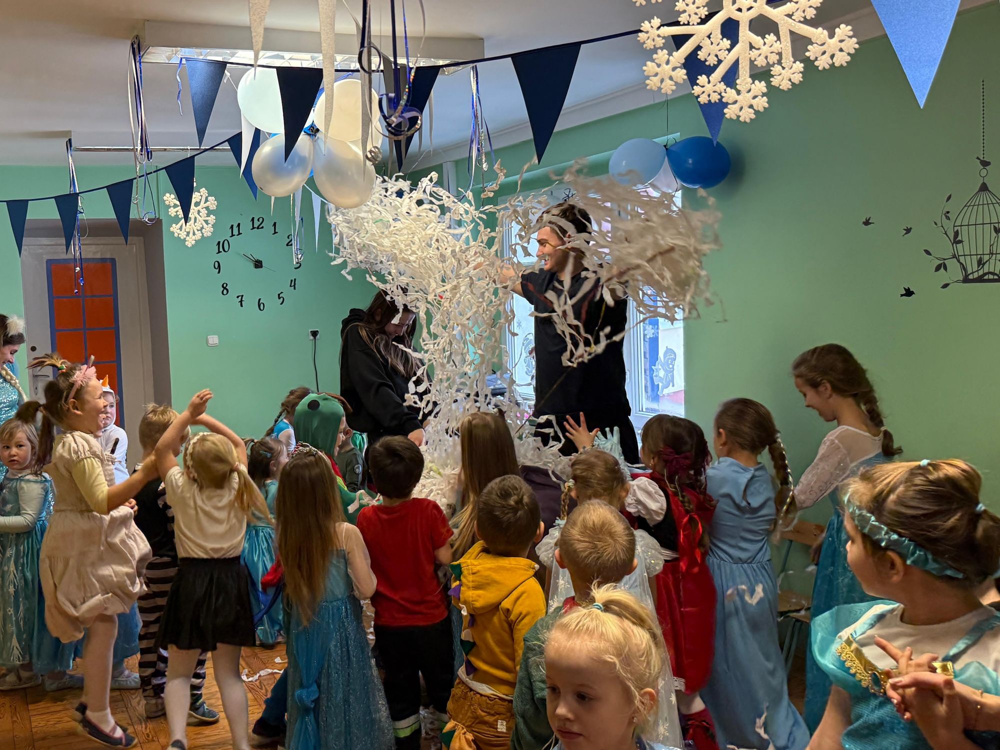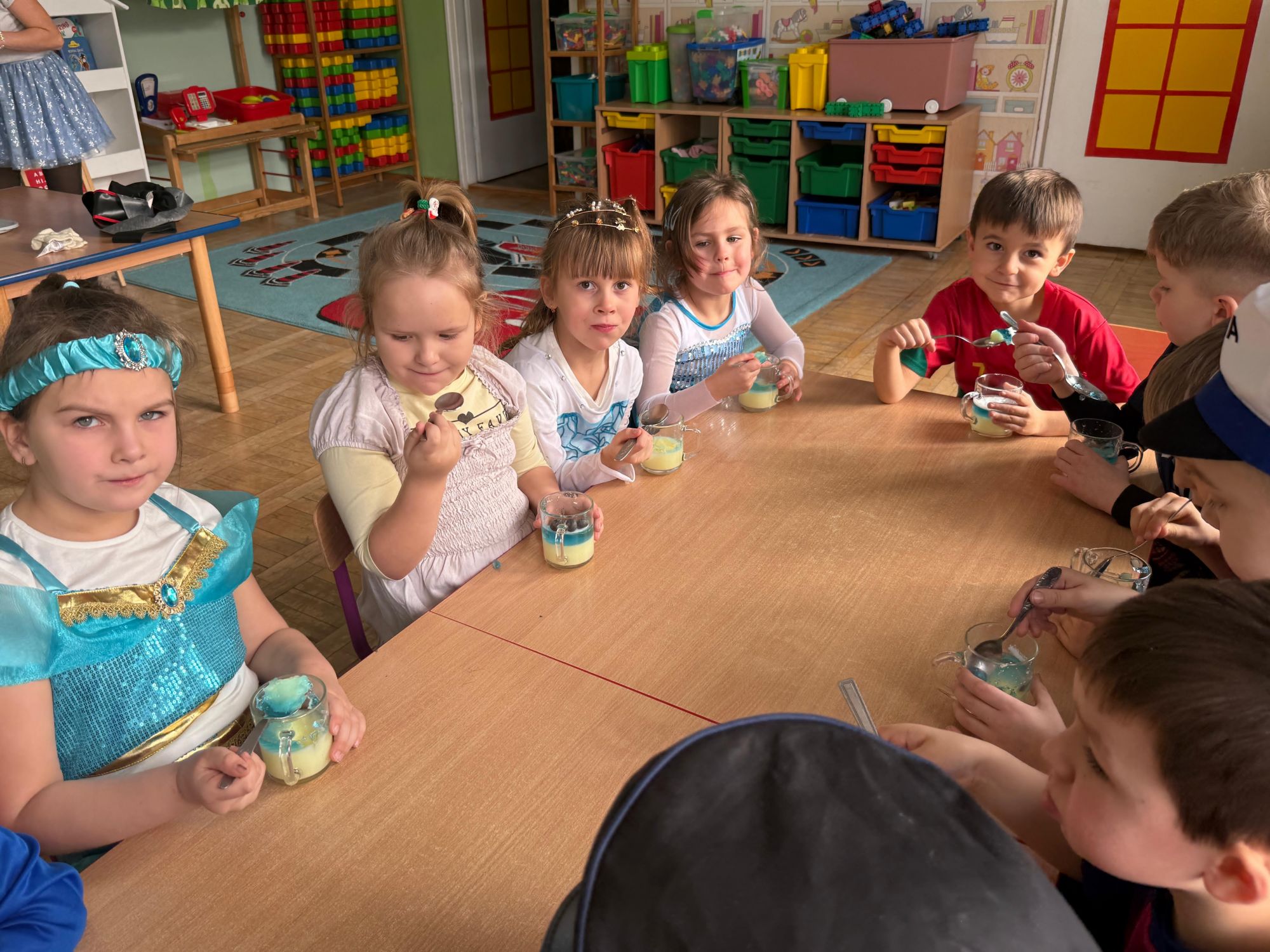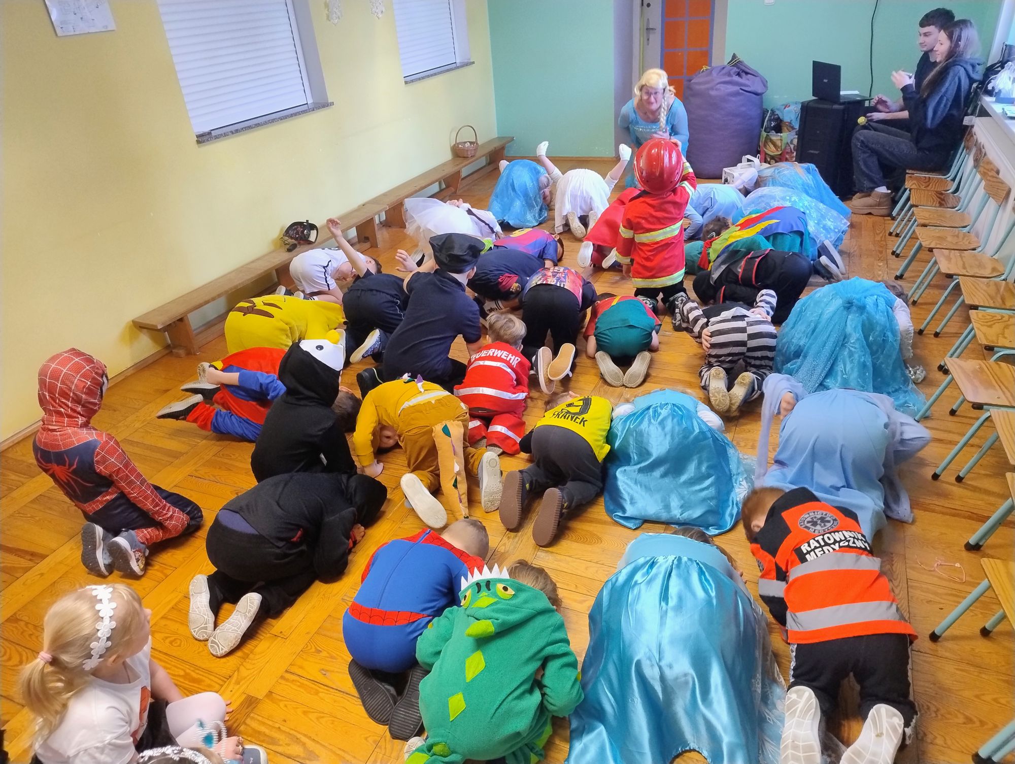 15 stycznia w naszym przedszkolu odbył się wyjątkowy bal karnawałowy pod hasłem „W krainie lodu”. To pełne radości i uśmiechu wydarzenie poprowadziła pani Barbara Koprek z firmy Skeleton, która zadbała o wspaniałą atmosferę oraz mnóstwo atrakcji dla najmłodszych. Tego dnia dzieci przyszły do przedszkola przebrane za swoich ulubionych bohaterów z bajek, filmów i nie tylko. Wśród barwnego tłumu można było spotkać m.in. Elsy, Królowe Śniegu, Olafa, bohaterów Psiego Patrolu, policjantów, piłkarzy oraz wiele innych fantastycznych postaci. Sala została specjalnie na tę okazję pięknie udekorowana balonami, girlandami i serpentynami, które doskonale wpisywały się w zimową tematykę balu. Na przedszkolaki czekało mnóstwo atrakcji – wspólne tańce, wesołe konkurencje oraz różnorodne zadania, w których dzieci chętnie brały udział razem z paniami. Nie zabrakło również chwili na odpoczynek i ugaszenie pragnienia. Po radosnych zabawach na dzieci czekał pyszny poczęstunek w postaci deseru „Śnieżna kraina”- kolorowej galaretki, która wszystkim bardzo smakowała. Zwieńczeniem tego wyjątkowego dnia była miła niespodzianka. Przedszkole odwiedził Stitch - kosmiczna postać z bajki Disneya, wywołując u dzieci ogromne emocje i szerokie uśmiechy. Bal karnawałowy był pełen radości, śmiechu i niezapomnianych wrażeń, a wspólna zabawa na długo pozostanie w pamięci wszystkich uczestników.