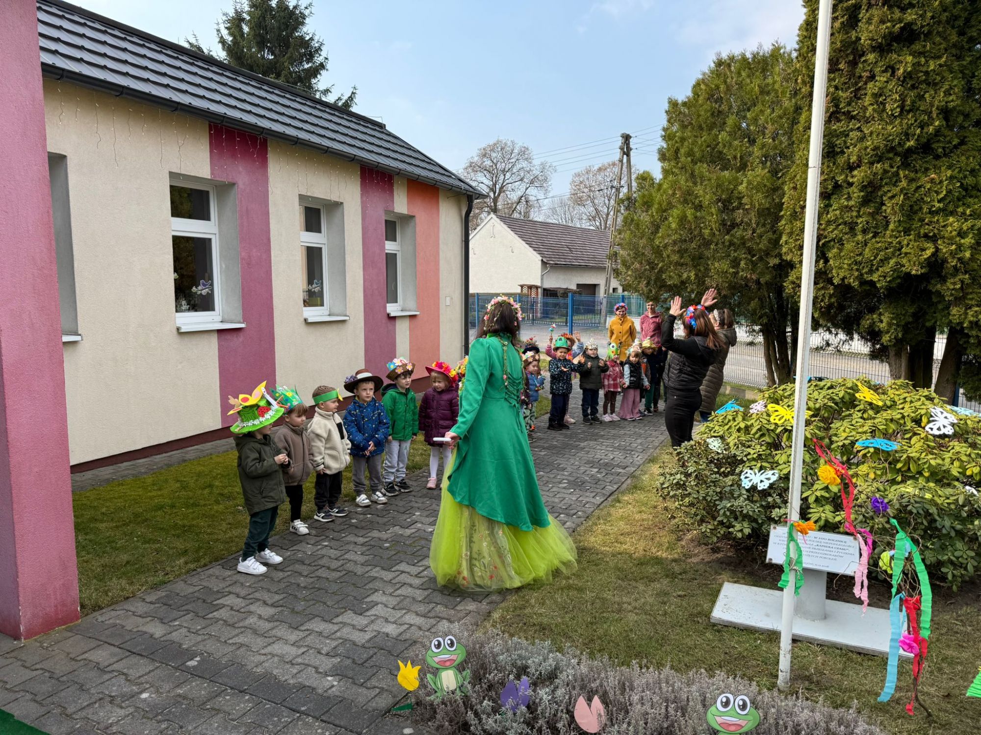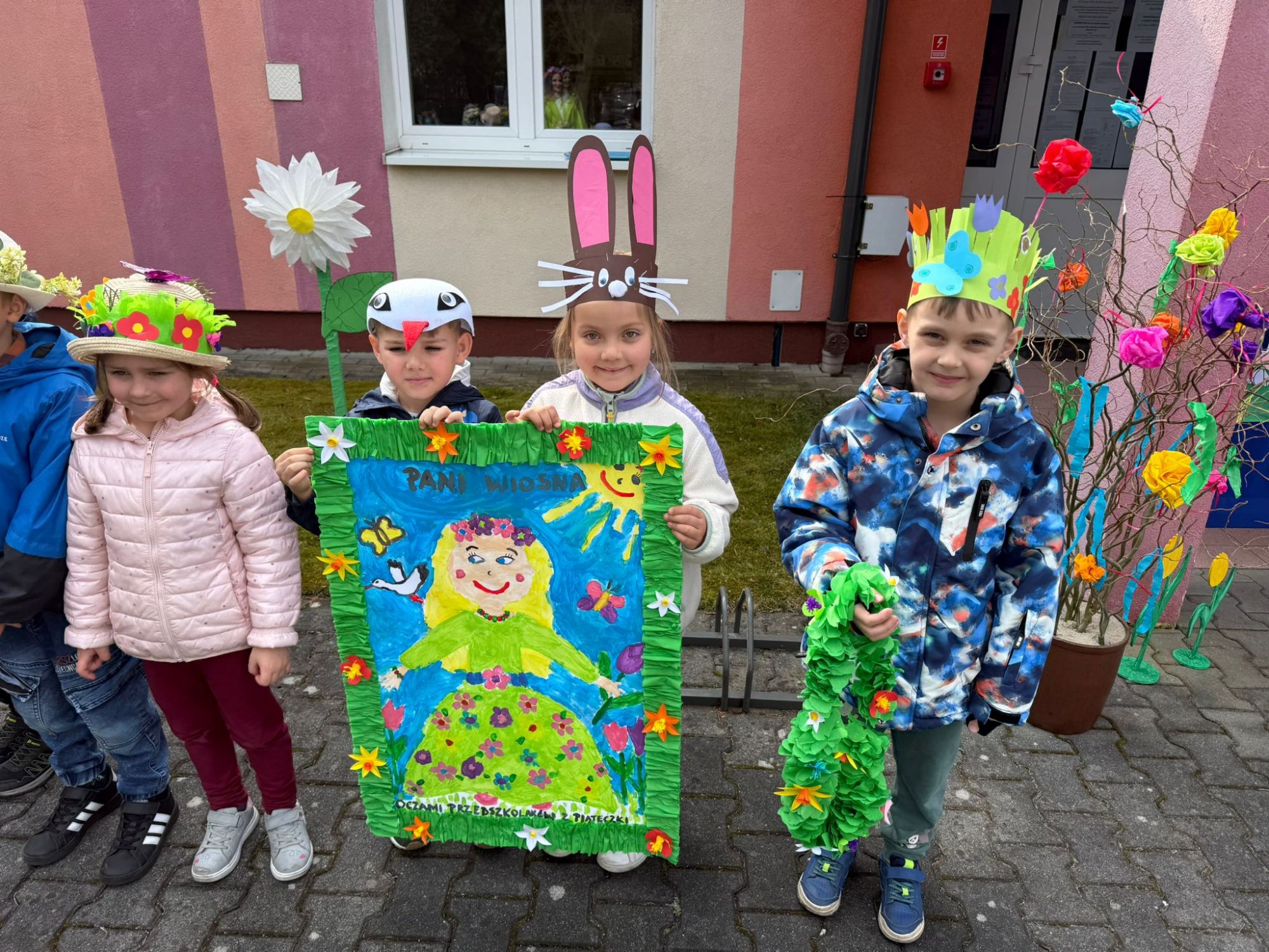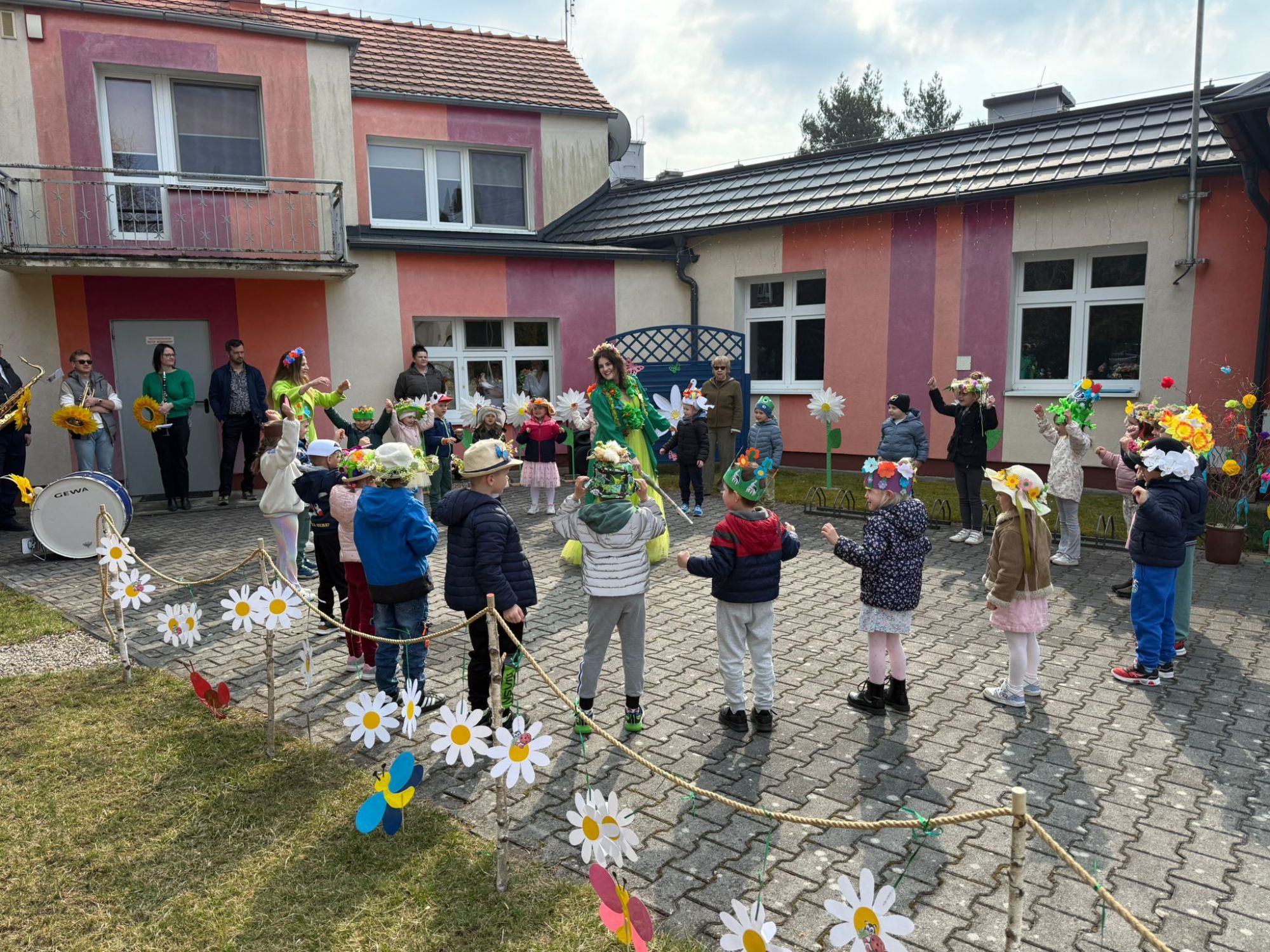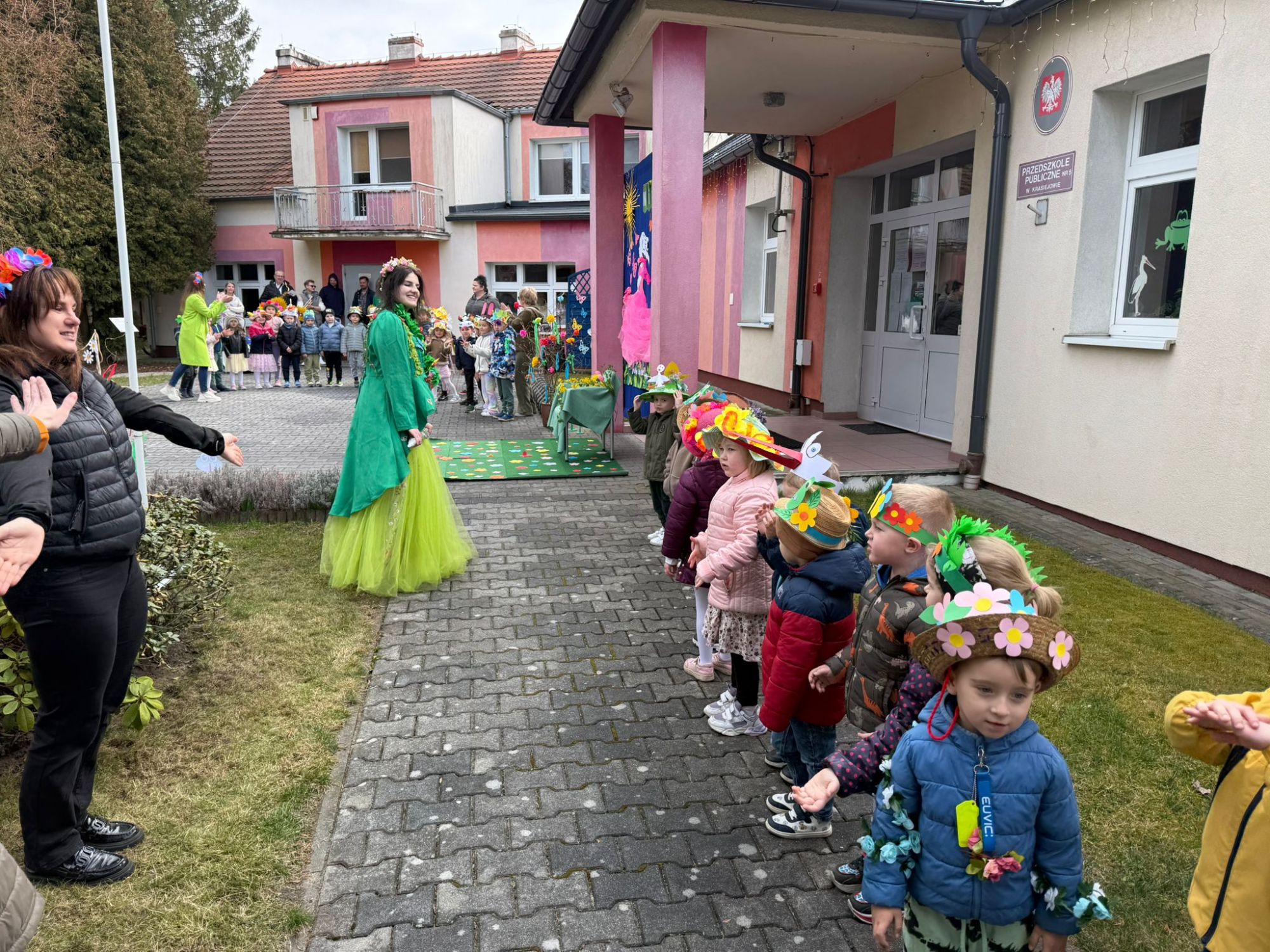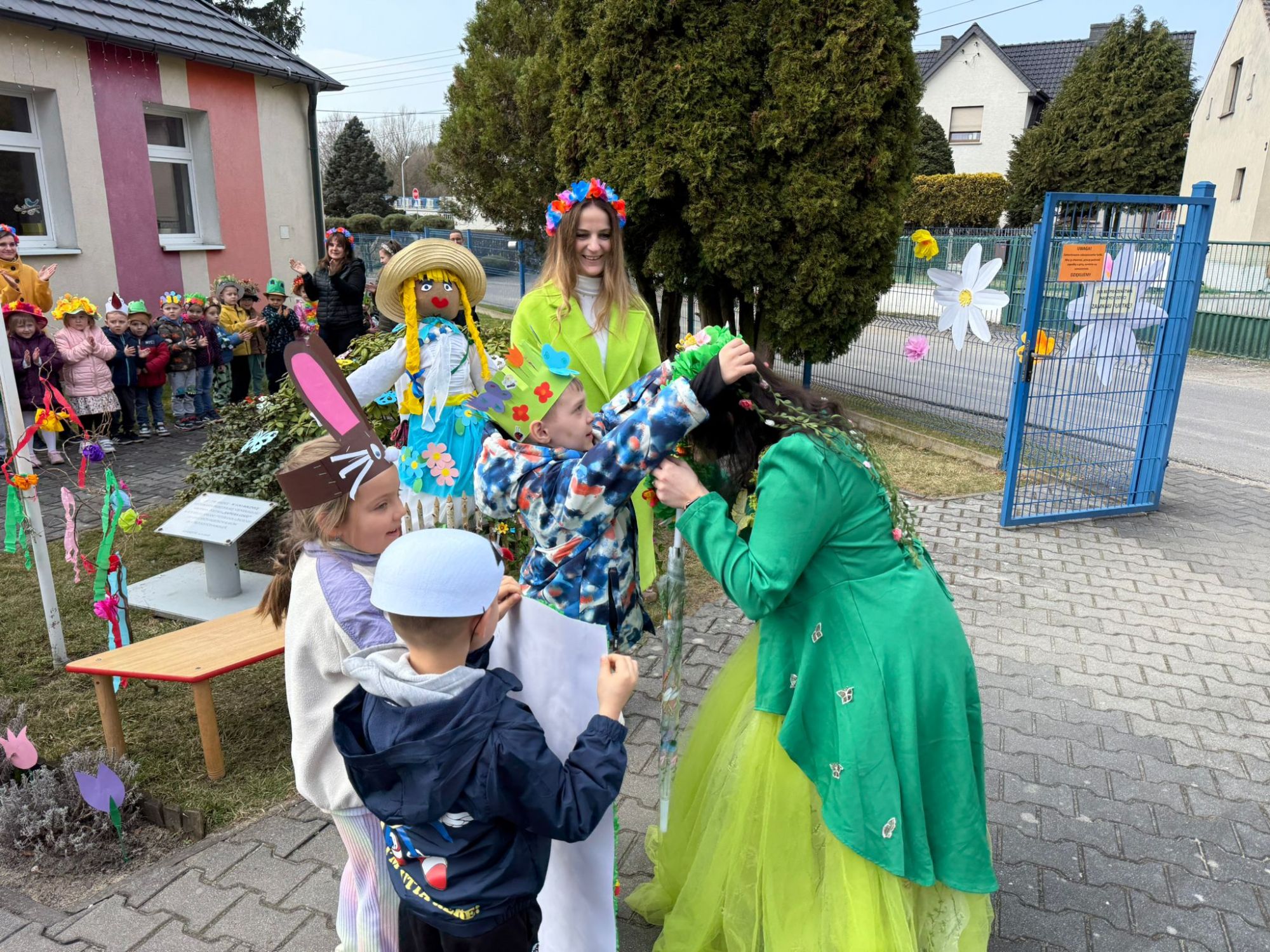 19 marca w naszym przedszkolu odbyło się wyjątkowe i pełne radości wydarzenie. Odwiedziła nas niezwykła gościni, Pani Wiosna, której towarzyszyła orkiestra dęta. Dzieci z ogromnym entuzjazmem i uśmiechem powitały nadejście nowej pory roku, tworząc ciepłą i serdeczną atmosferę na pięknie udekorowanym placu wejściowym. Wychowankowie przygotowali dla Pani Wiosny miłą niespodziankę, własnoręcznie wykonany portret oraz piękne kwiaty, które zawiesili na jej szyi. W ten sposób wyrazili swoją sympatię, radość oraz wdzięczność za przybycie i przyniesienie ze sobą wiosennego ciepła. Przedszkolaki z obu grup zaprezentowały część artystyczną. Z zaangażowaniem śpiewały wiosenne piosenki, wprowadzając wszystkich w pogodny, pełen energii nastrój. Ich występ został nagrodzony gromkimi brawami. Na zakończenie tego wyjątkowego wydarzenia wspólnie udaliśmy się nad rzekę, niosąc ze sobą Marzannę-symbol odchodzącej zimy. Tam, zgodnie z tradycją, dzieci uroczyście pożegnały zimę i z radością powitały wiosnę, mając nadzieję na słoneczne i pełne przygód dni.