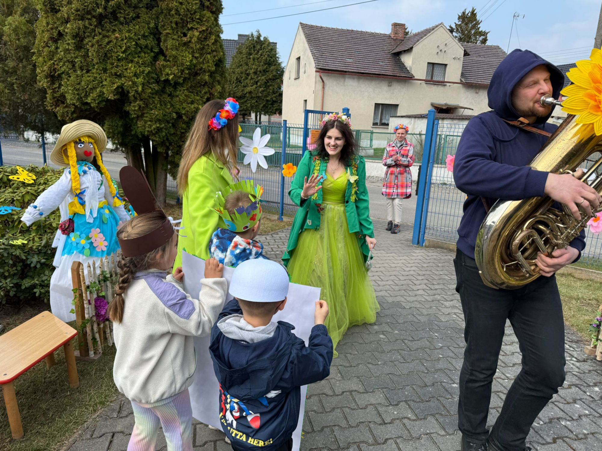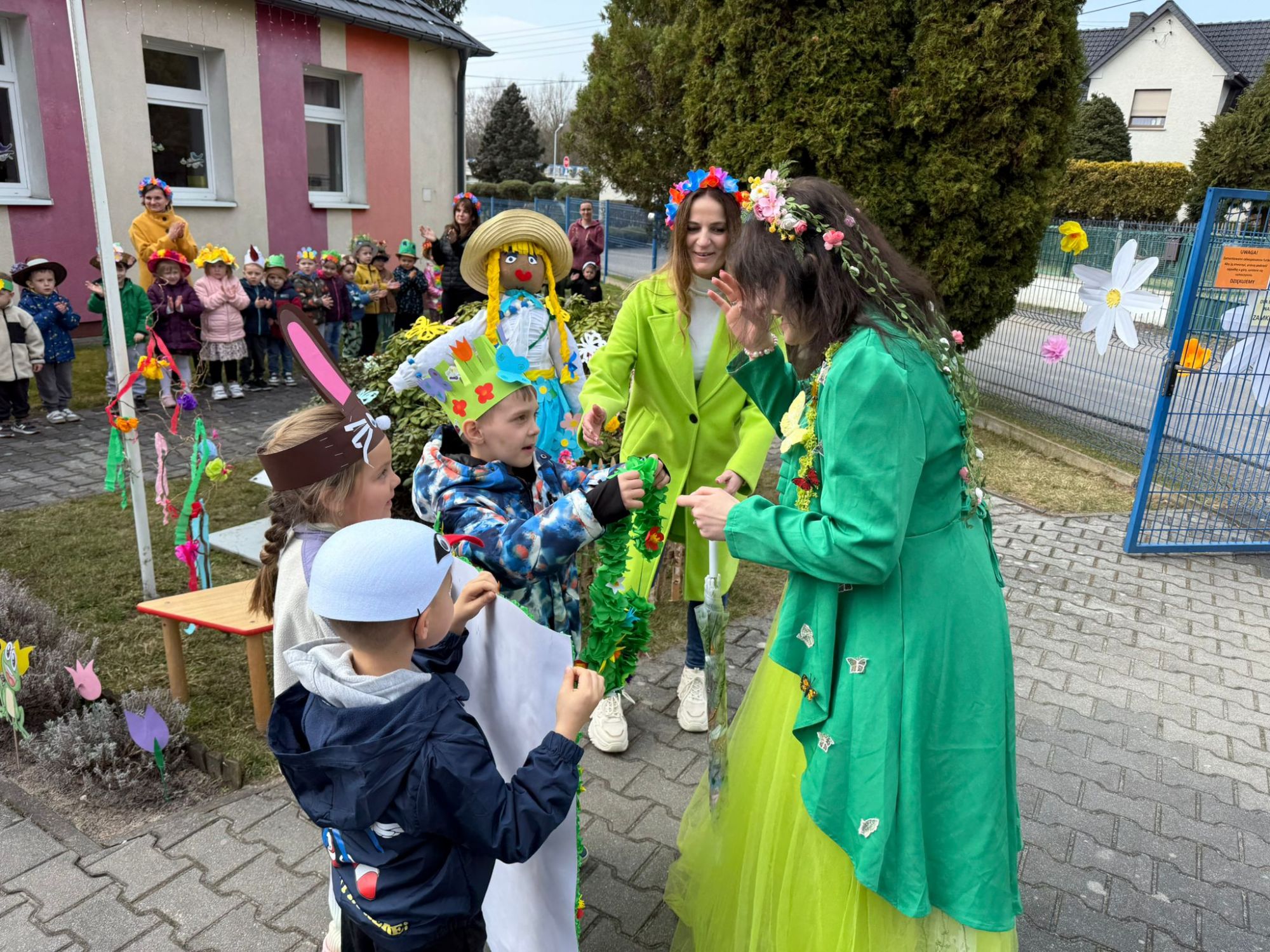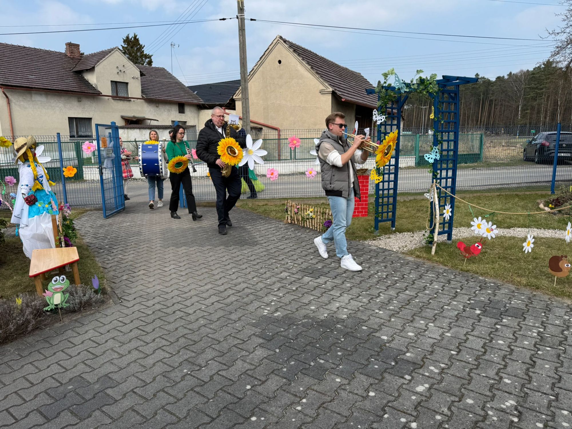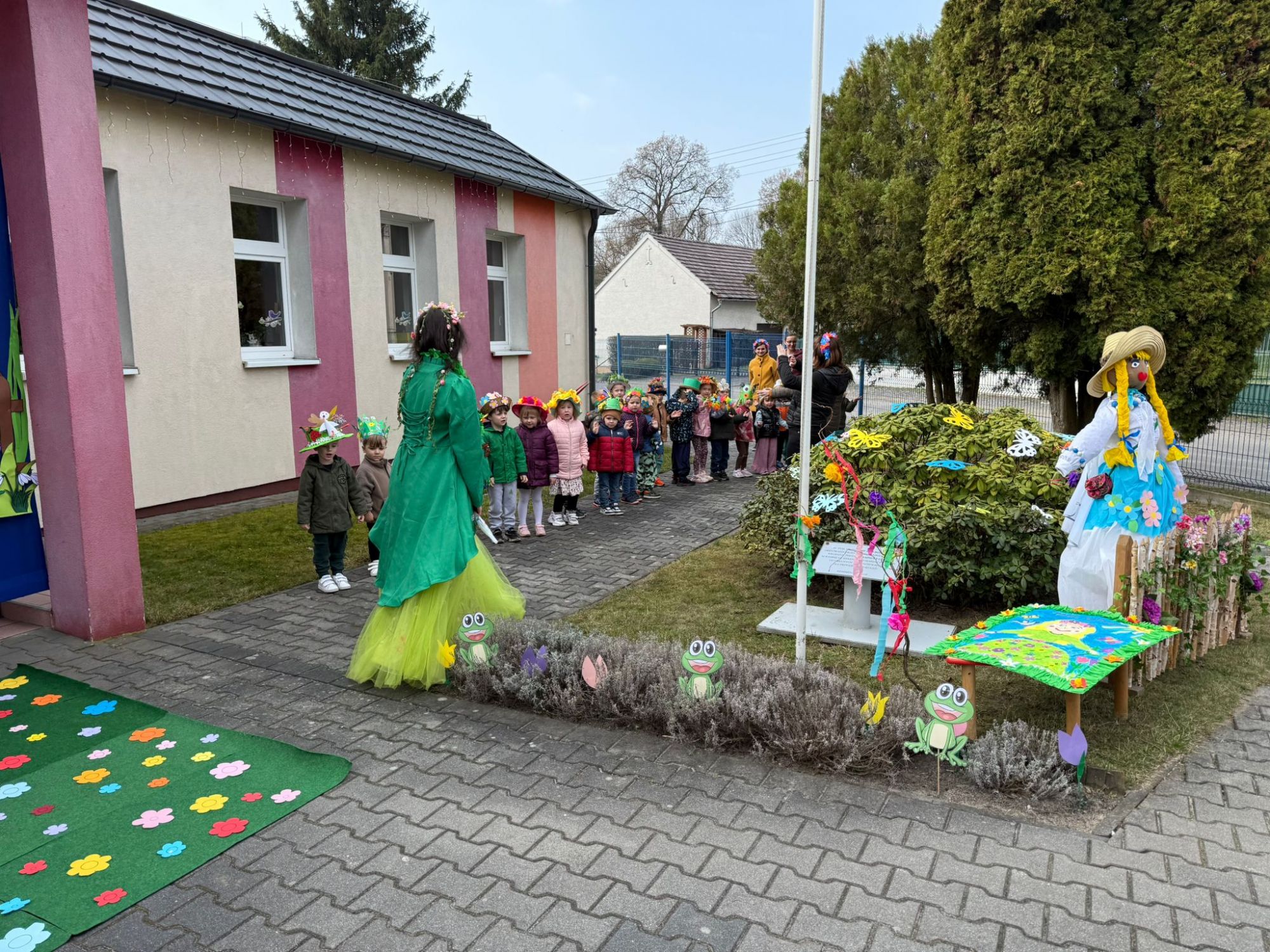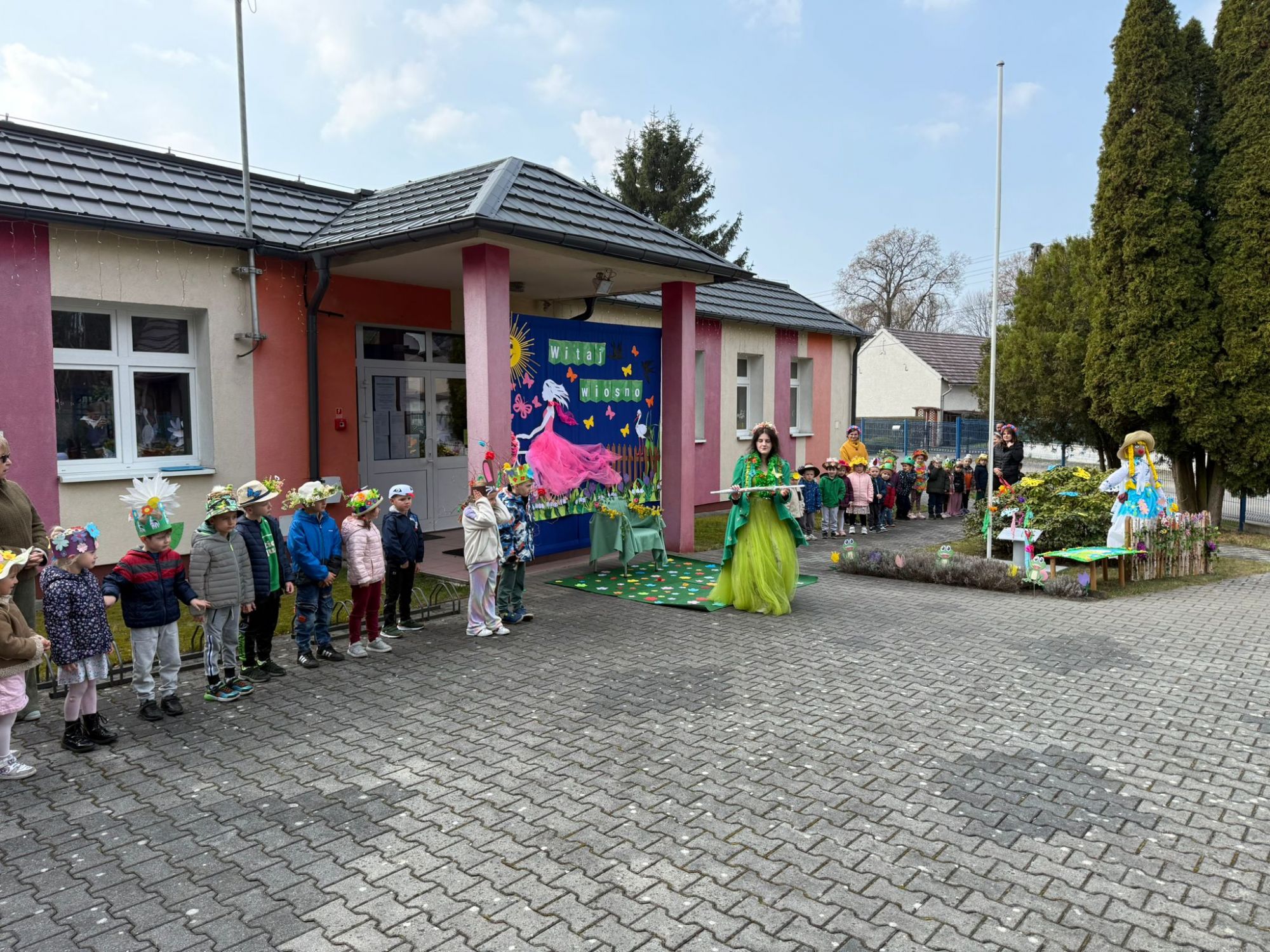 19 marca w naszym przedszkolu odbyło się wyjątkowe i pełne radości wydarzenie. Odwiedziła nas niezwykła gościni, Pani Wiosna, której towarzyszyła orkiestra dęta. Dzieci z ogromnym entuzjazmem i uśmiechem powitały nadejście nowej pory roku, tworząc ciepłą i serdeczną atmosferę na pięknie udekorowanym placu wejściowym. Wychowankowie przygotowali dla Pani Wiosny miłą niespodziankę, własnoręcznie wykonany portret oraz piękne kwiaty, które zawiesili na jej szyi. W ten sposób wyrazili swoją sympatię, radość oraz wdzięczność za przybycie i przyniesienie ze sobą wiosennego ciepła. Przedszkolaki z obu grup zaprezentowały część artystyczną. Z zaangażowaniem śpiewały wiosenne piosenki, wprowadzając wszystkich w pogodny, pełen energii nastrój. Ich występ został nagrodzony gromkimi brawami. Na zakończenie tego wyjątkowego wydarzenia wspólnie udaliśmy się nad rzekę, niosąc ze sobą Marzannę-symbol odchodzącej zimy. Tam, zgodnie z tradycją, dzieci uroczyście pożegnały zimę i z radością powitały wiosnę, mając nadzieję na słoneczne i pełne przygód dni.