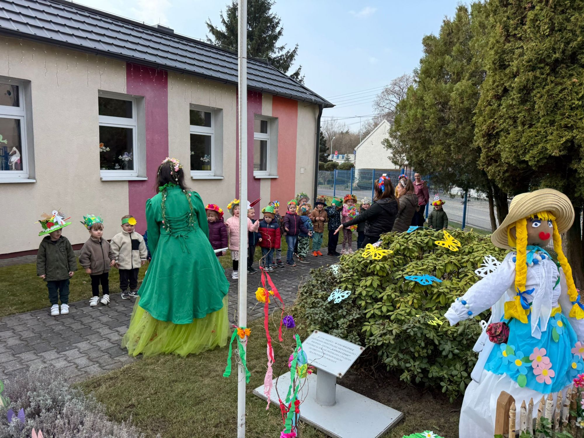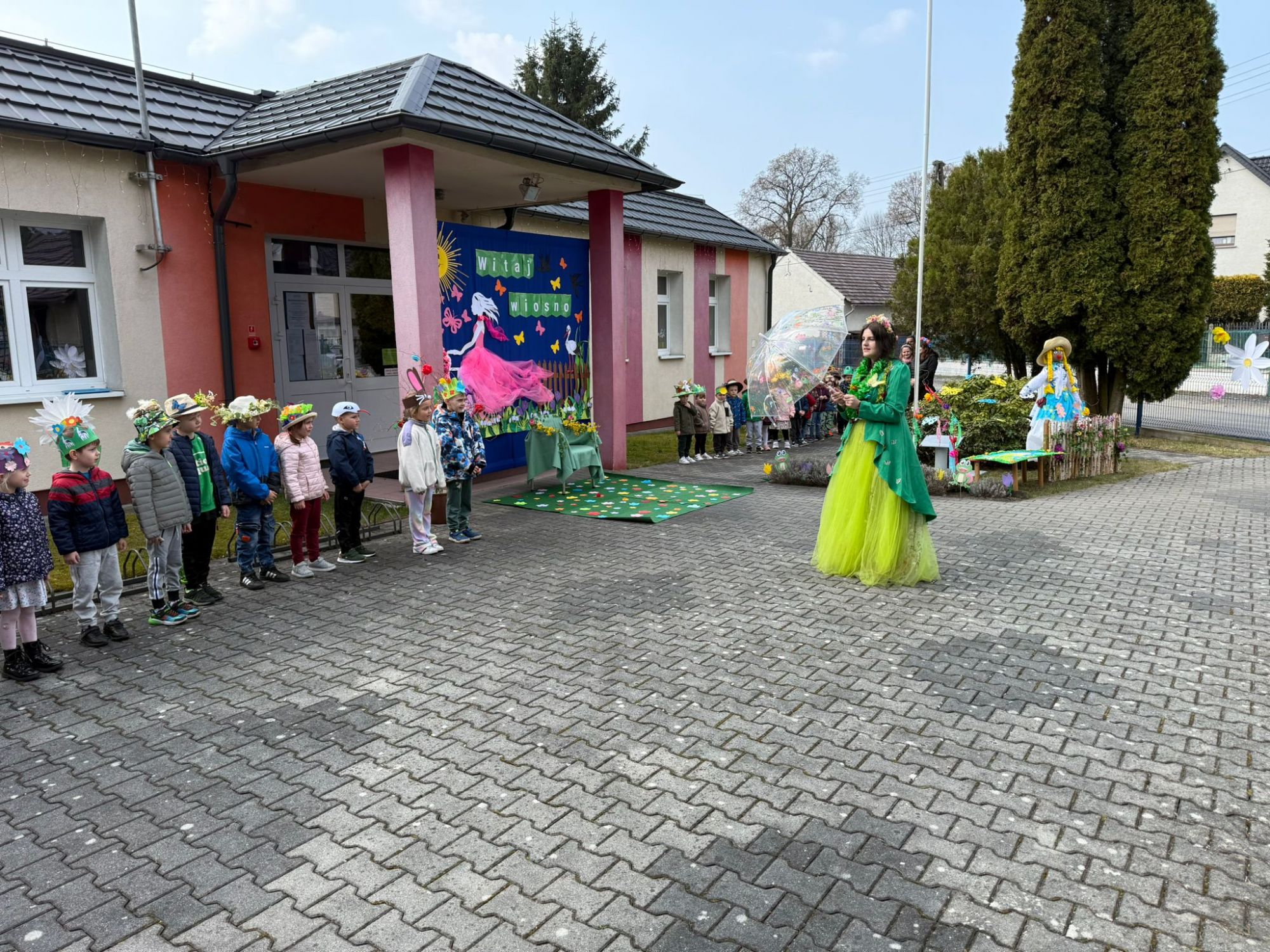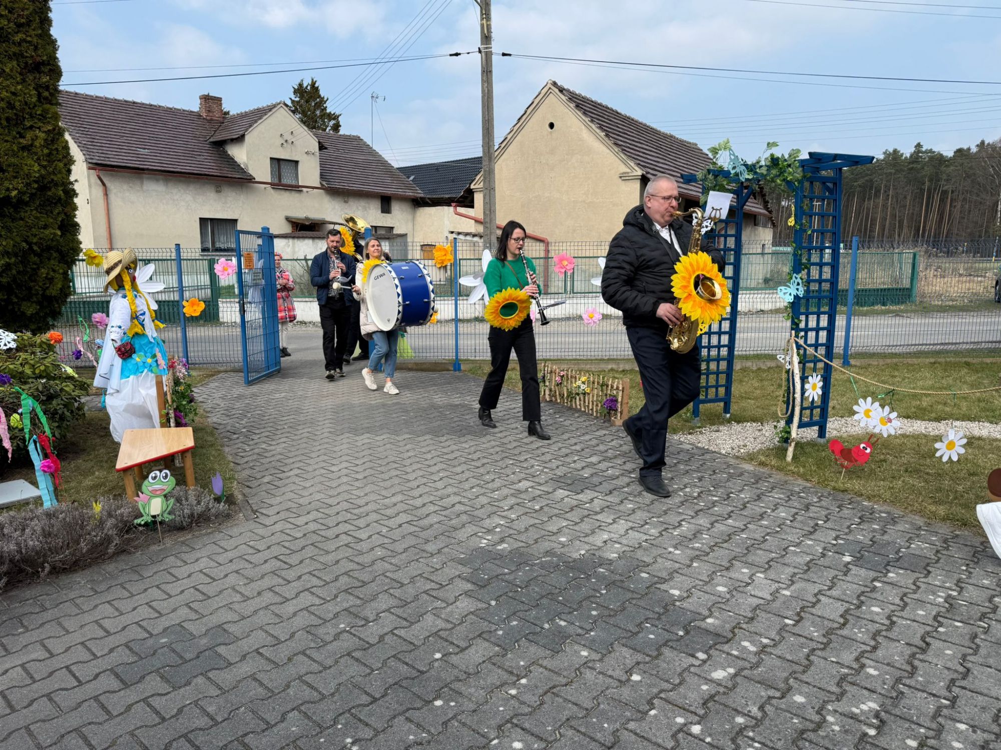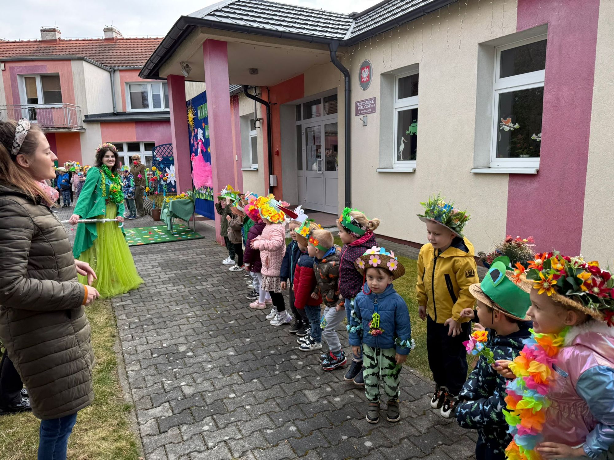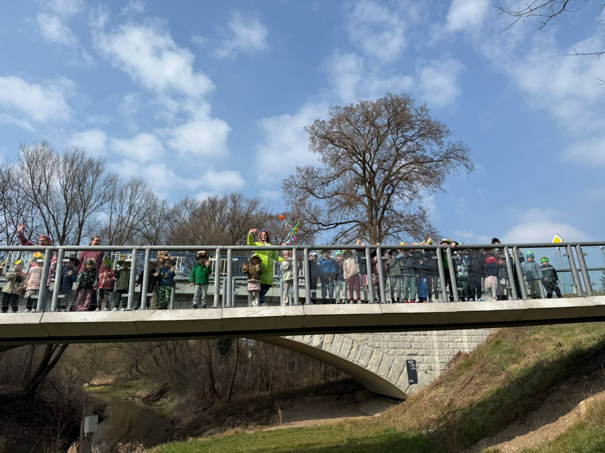 19 marca w naszym przedszkolu odbyło się wyjątkowe i pełne radości wydarzenie. Odwiedziła nas niezwykła gościni, Pani Wiosna, której towarzyszyła orkiestra dęta. Dzieci z ogromnym entuzjazmem i uśmiechem powitały nadejście nowej pory roku, tworząc ciepłą i serdeczną atmosferę na pięknie udekorowanym placu wejściowym. Wychowankowie przygotowali dla Pani Wiosny miłą niespodziankę, własnoręcznie wykonany portret oraz piękne kwiaty, które zawiesili na jej szyi. W ten sposób wyrazili swoją sympatię, radość oraz wdzięczność za przybycie i przyniesienie ze sobą wiosennego ciepła. Przedszkolaki z obu grup zaprezentowały część artystyczną. Z zaangażowaniem śpiewały wiosenne piosenki, wprowadzając wszystkich w pogodny, pełen energii nastrój. Ich występ został nagrodzony gromkimi brawami. Na zakończenie tego wyjątkowego wydarzenia wspólnie udaliśmy się nad rzekę, niosąc ze sobą Marzannę-symbol odchodzącej zimy. Tam, zgodnie z tradycją, dzieci uroczyście pożegnały zimę i z radością powitały wiosnę, mając nadzieję na słoneczne i pełne przygód dni.