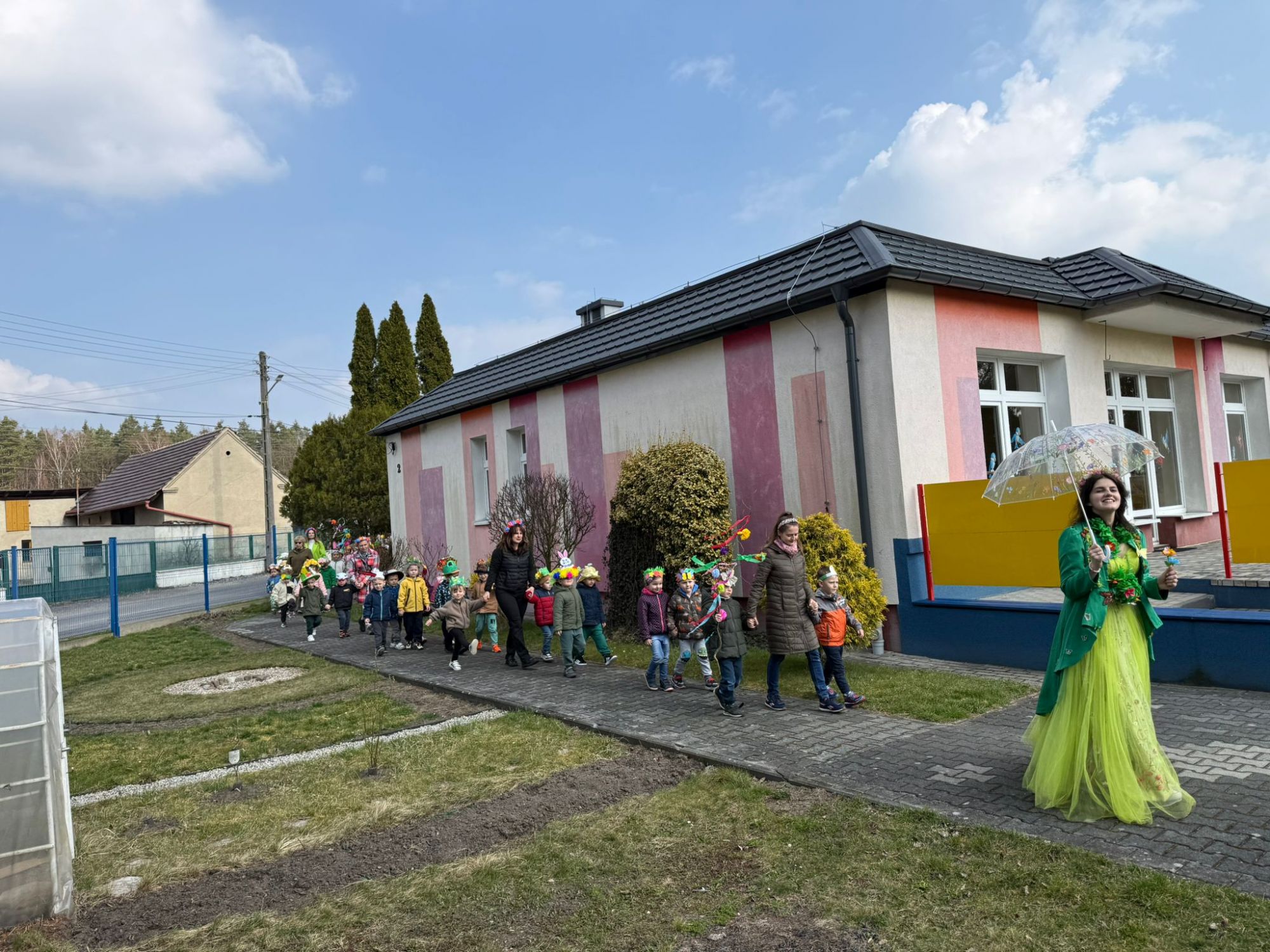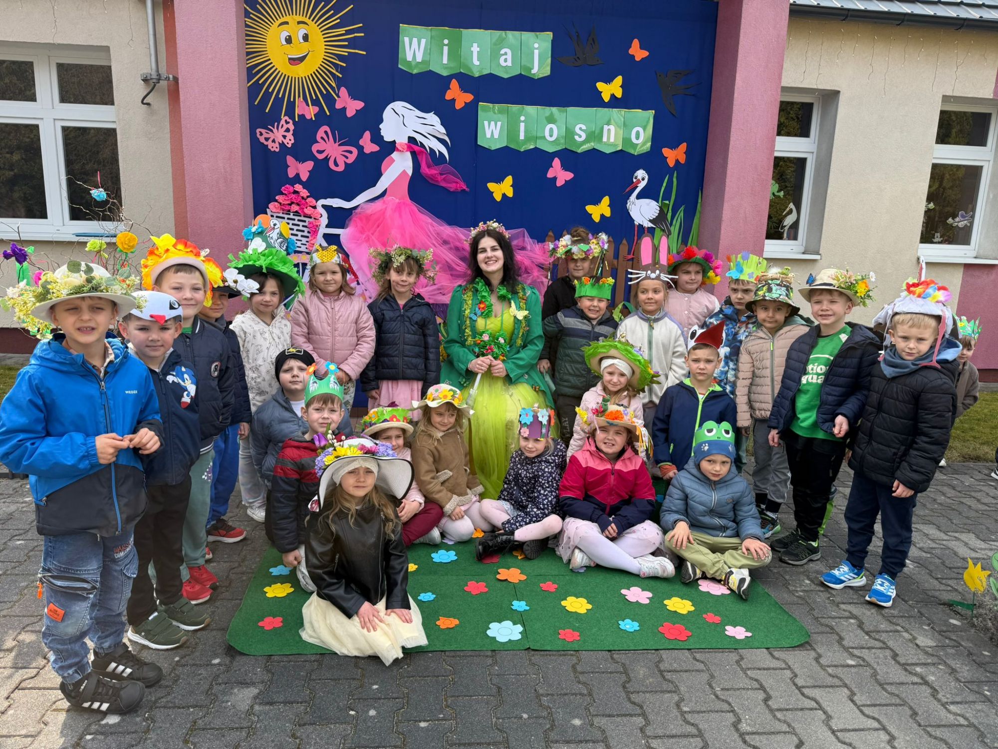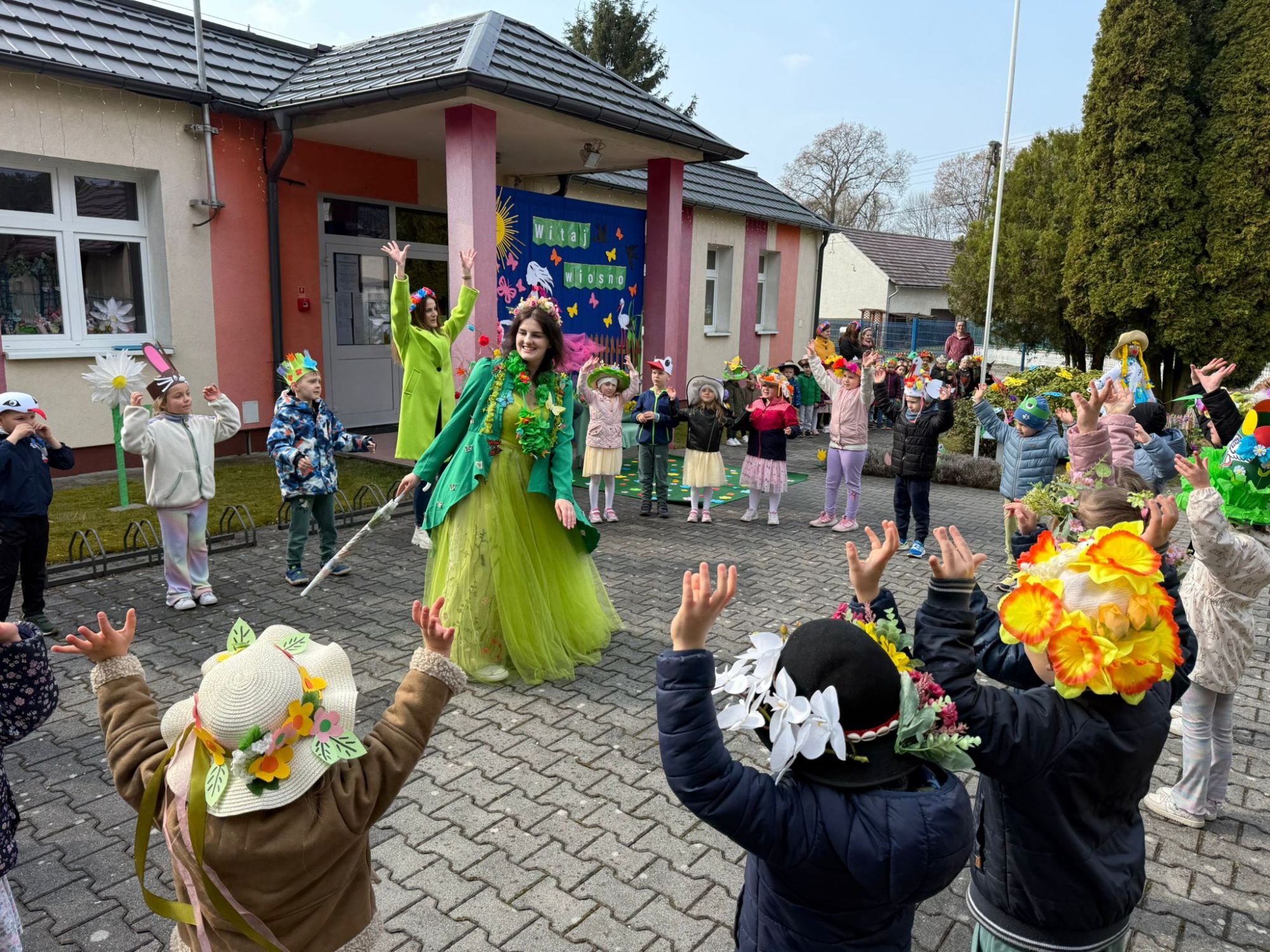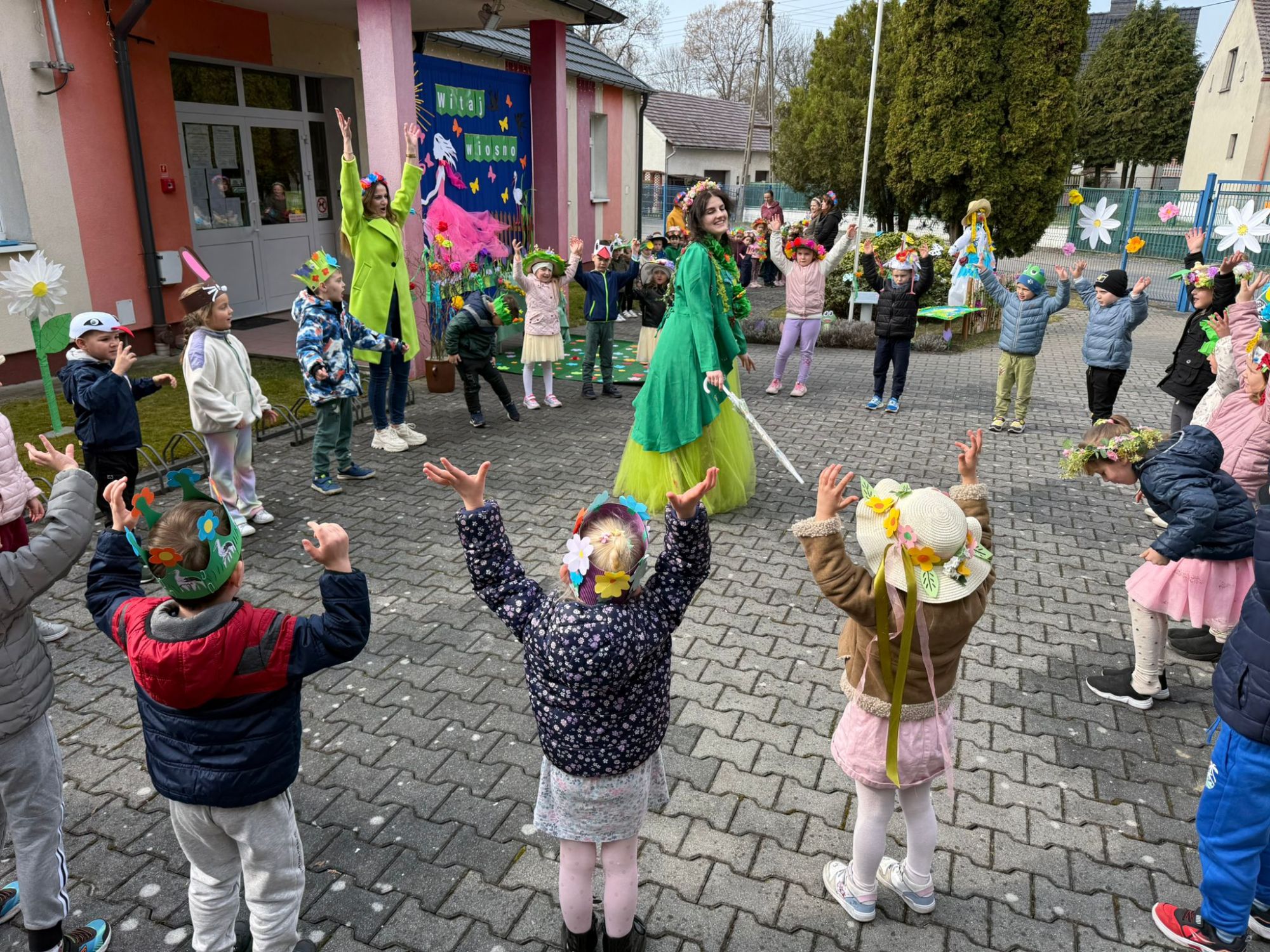 19 marca w naszym przedszkolu odbyło się wyjątkowe i pełne radości wydarzenie. Odwiedziła nas niezwykła gościni, Pani Wiosna, której towarzyszyła orkiestra dęta. Dzieci z ogromnym entuzjazmem i uśmiechem powitały nadejście nowej pory roku, tworząc ciepłą i serdeczną atmosferę na pięknie udekorowanym placu wejściowym. Wychowankowie przygotowali dla Pani Wiosny miłą niespodziankę, własnoręcznie wykonany portret oraz piękne kwiaty, które zawiesili na jej szyi. W ten sposób wyrazili swoją sympatię, radość oraz wdzięczność za przybycie i przyniesienie ze sobą wiosennego ciepła. Przedszkolaki z obu grup zaprezentowały część artystyczną. Z zaangażowaniem śpiewały wiosenne piosenki, wprowadzając wszystkich w pogodny, pełen energii nastrój. Ich występ został nagrodzony gromkimi brawami. Na zakończenie tego wyjątkowego wydarzenia wspólnie udaliśmy się nad rzekę, niosąc ze sobą Marzannę-symbol odchodzącej zimy. Tam, zgodnie z tradycją, dzieci uroczyście pożegnały zimę i z radością powitały wiosnę, mając nadzieję na słoneczne i pełne przygód dni.