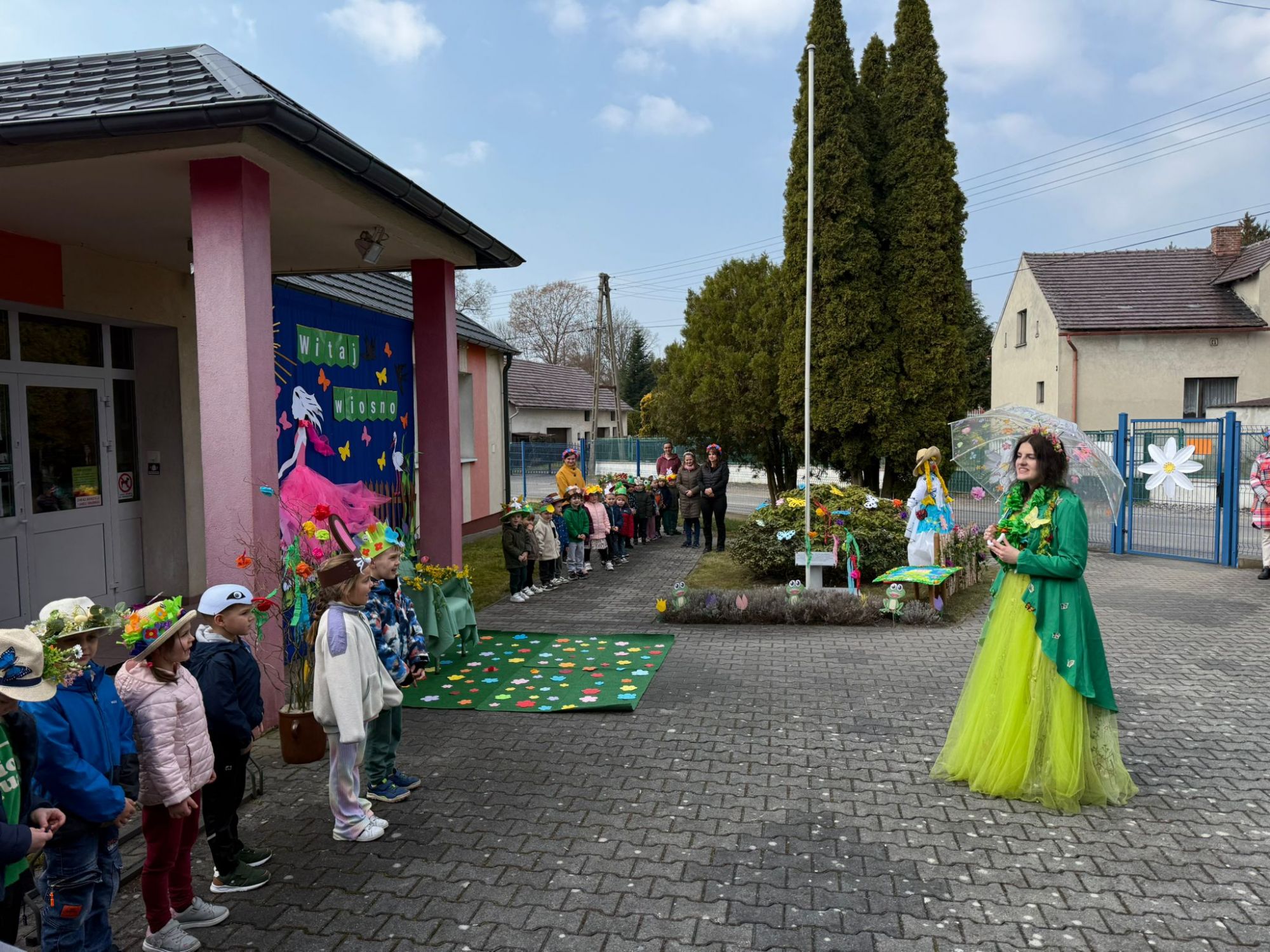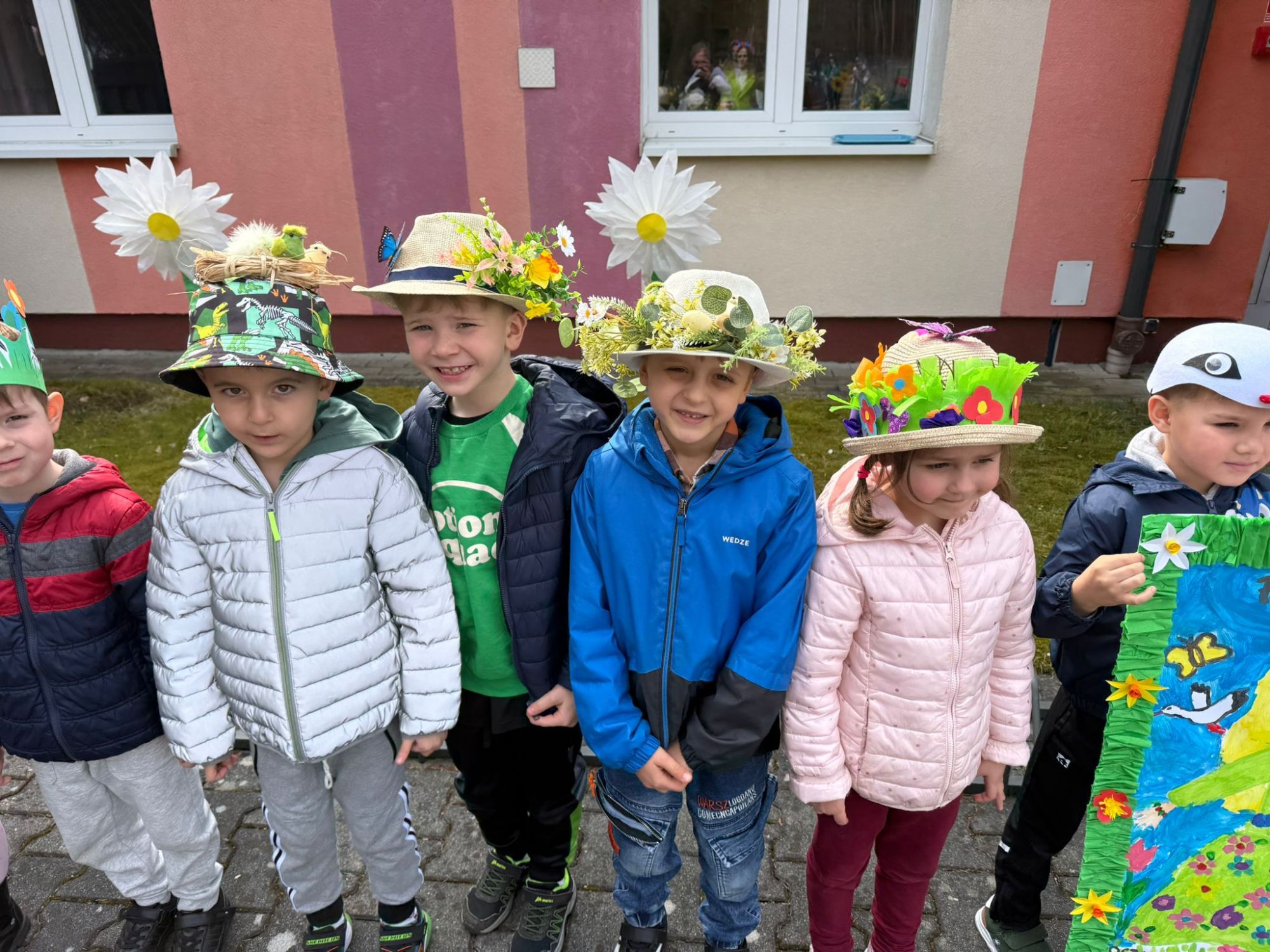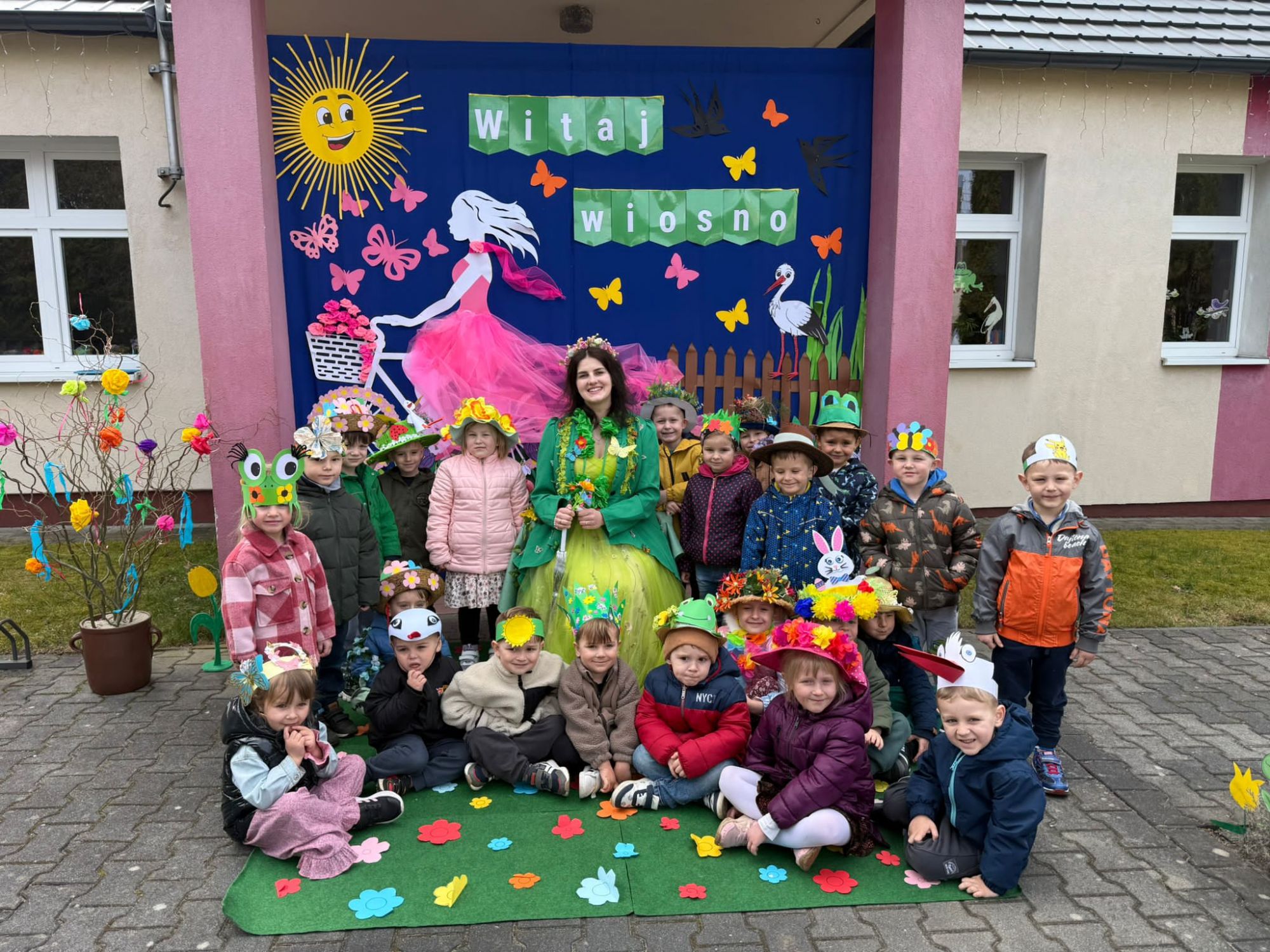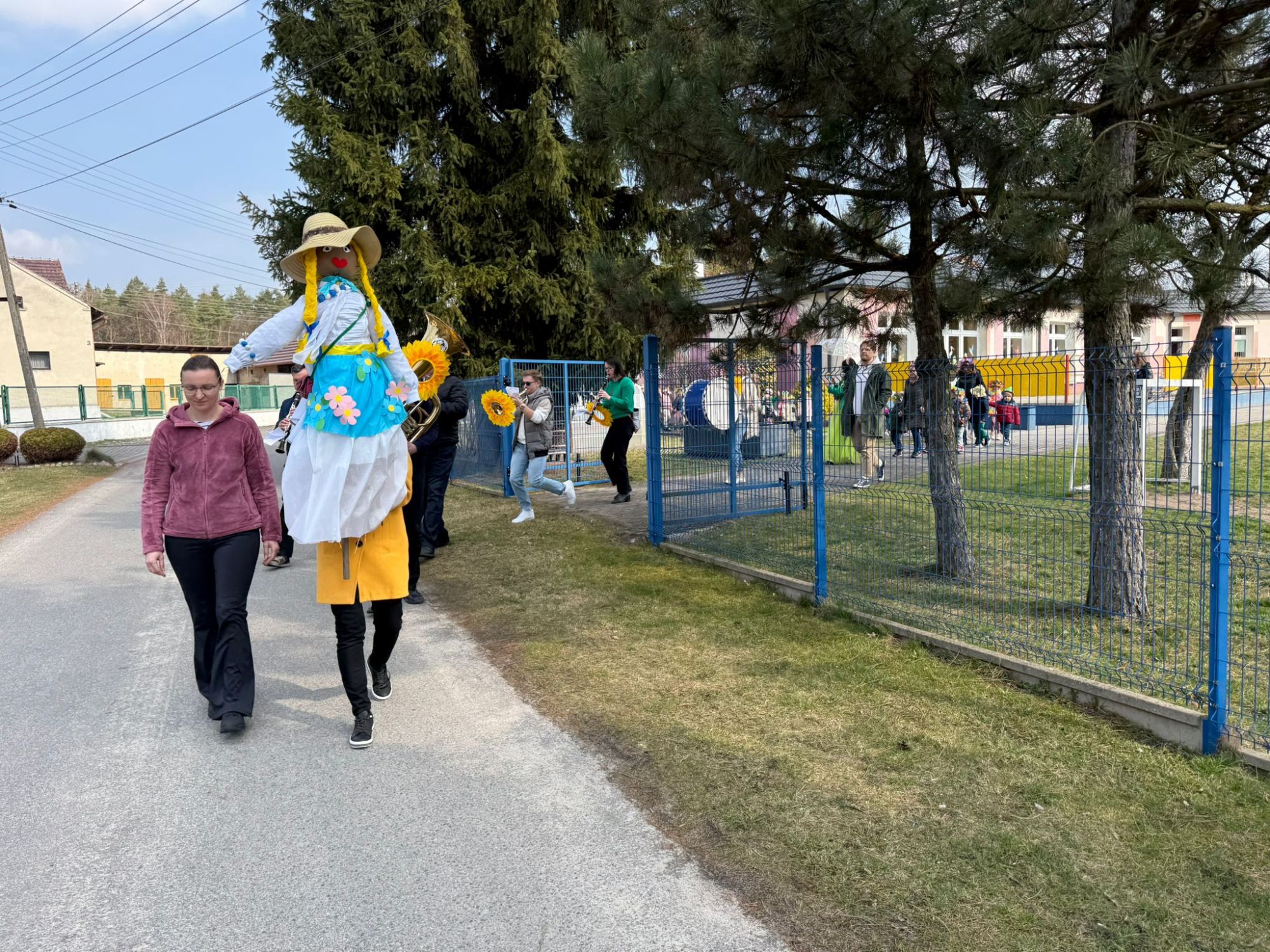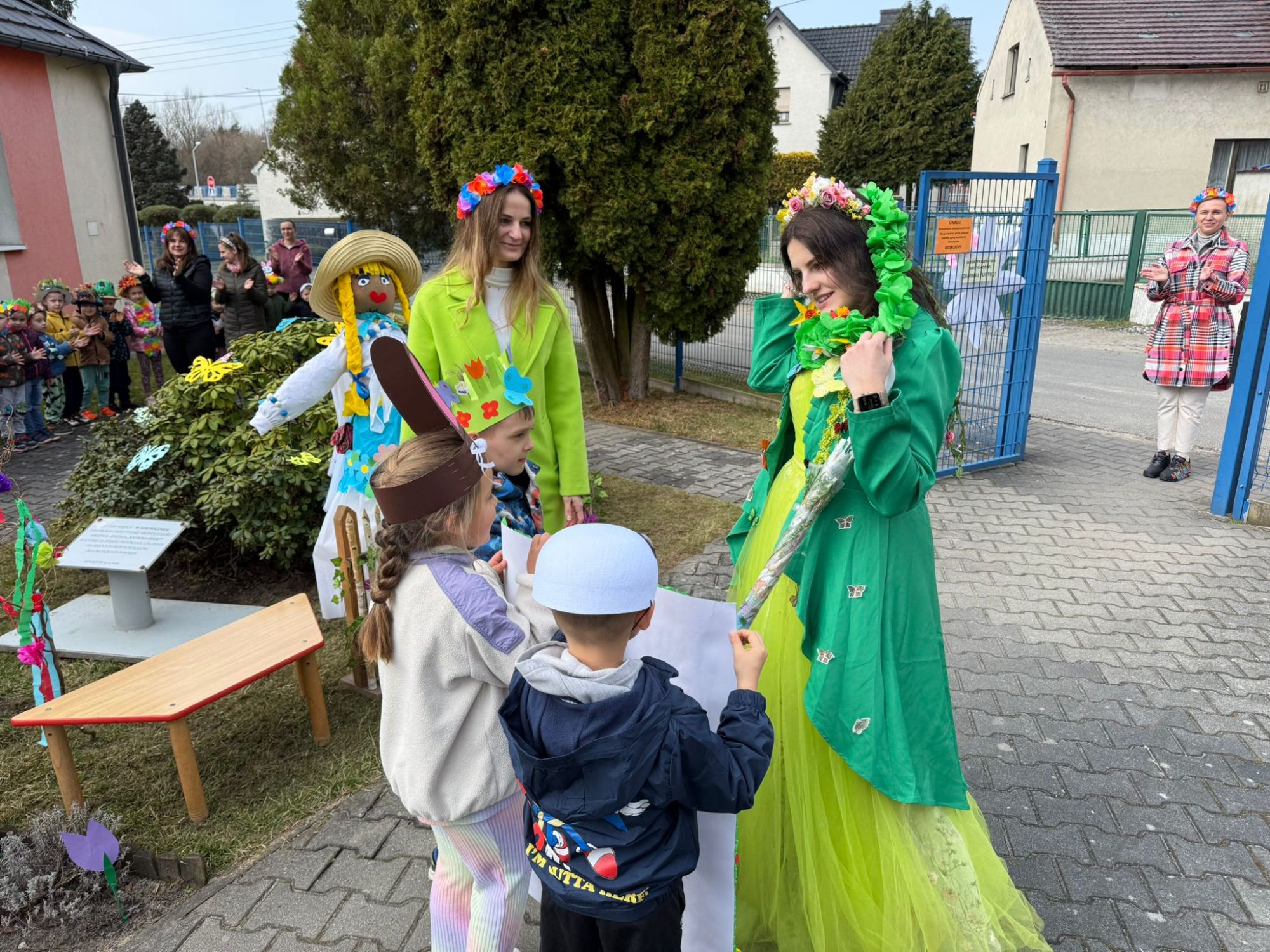 19 marca w naszym przedszkolu odbyło się wyjątkowe i pełne radości wydarzenie. Odwiedziła nas niezwykła gościni, Pani Wiosna, której towarzyszyła orkiestra dęta. Dzieci z ogromnym entuzjazmem i uśmiechem powitały nadejście nowej pory roku, tworząc ciepłą i serdeczną atmosferę na pięknie udekorowanym placu wejściowym. Wychowankowie przygotowali dla Pani Wiosny miłą niespodziankę, własnoręcznie wykonany portret oraz piękne kwiaty, które zawiesili na jej szyi. W ten sposób wyrazili swoją sympatię, radość oraz wdzięczność za przybycie i przyniesienie ze sobą wiosennego ciepła. Przedszkolaki z obu grup zaprezentowały część artystyczną. Z zaangażowaniem śpiewały wiosenne piosenki, wprowadzając wszystkich w pogodny, pełen energii nastrój. Ich występ został nagrodzony gromkimi brawami. Na zakończenie tego wyjątkowego wydarzenia wspólnie udaliśmy się nad rzekę, niosąc ze sobą Marzannę-symbol odchodzącej zimy. Tam, zgodnie z tradycją, dzieci uroczyście pożegnały zimę i z radością powitały wiosnę, mając nadzieję na słoneczne i pełne przygód dni.