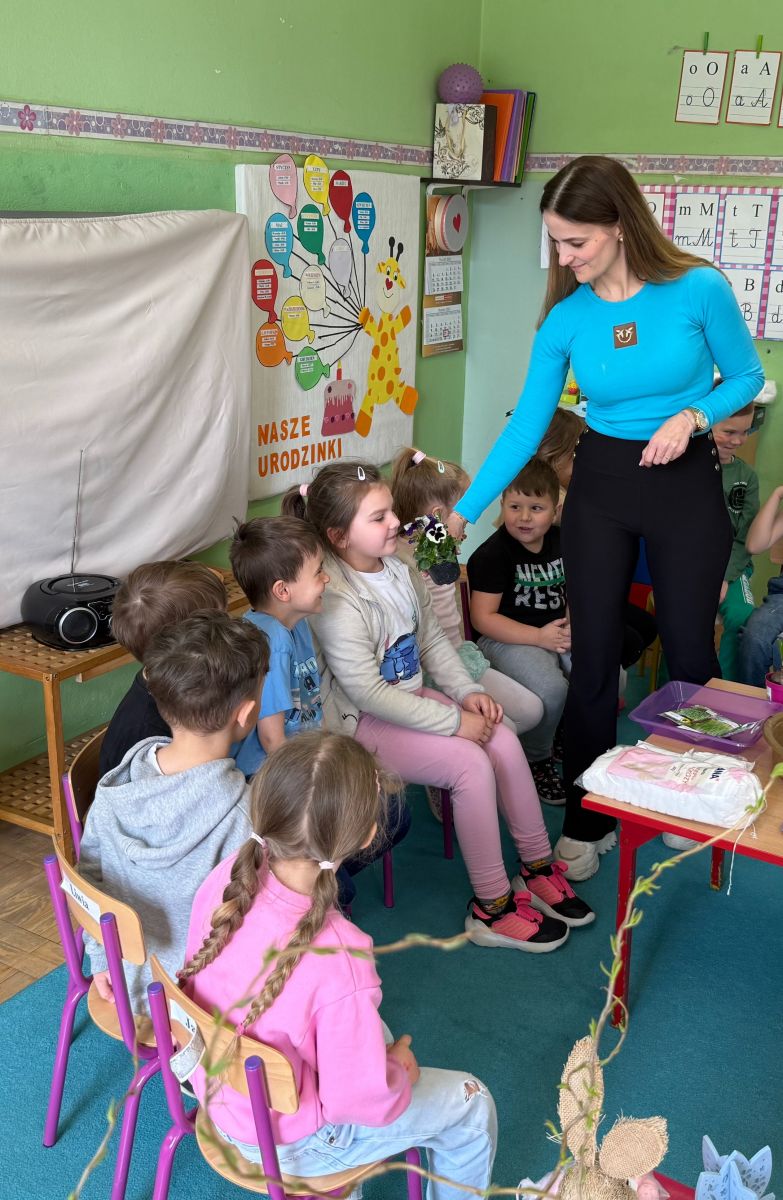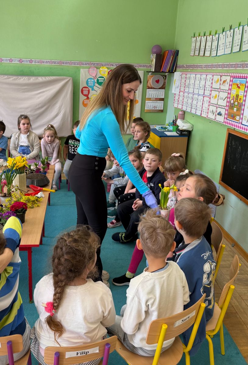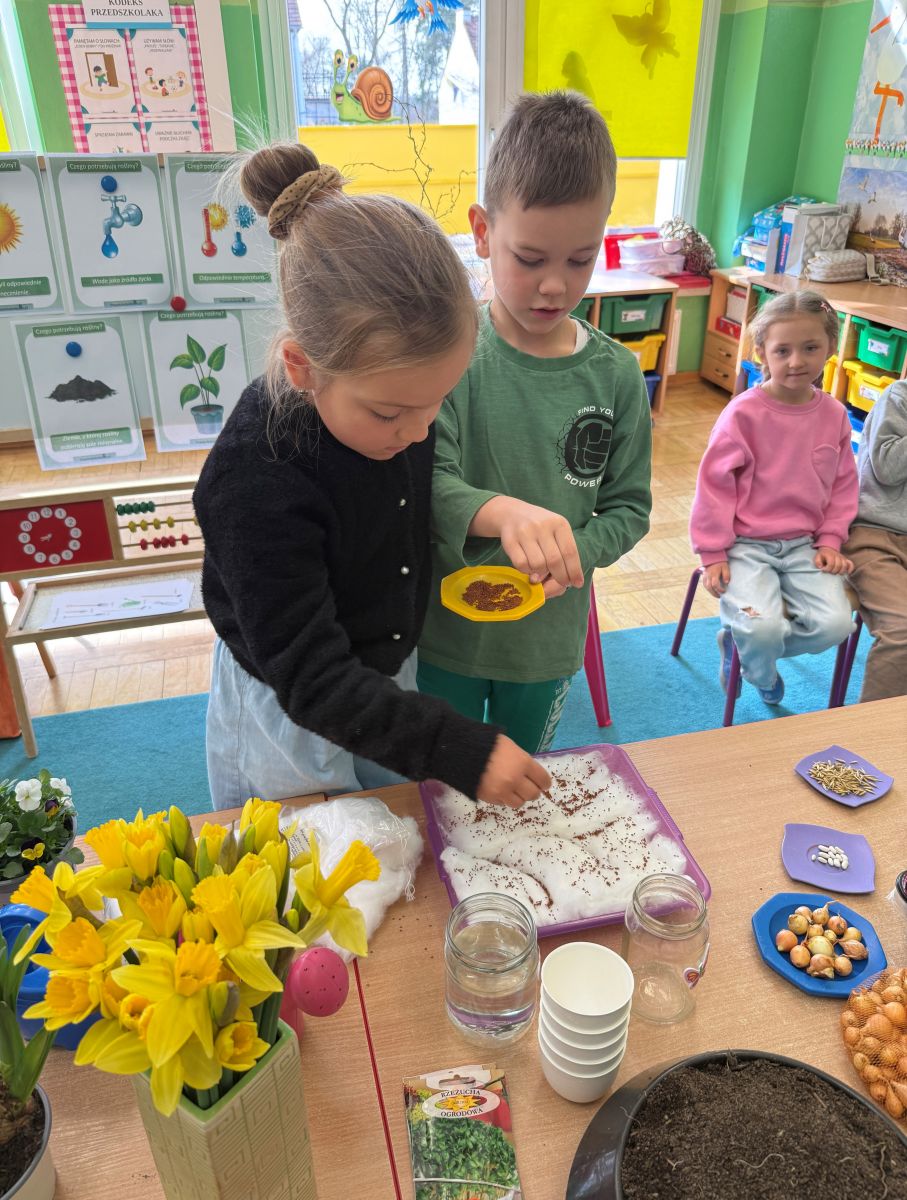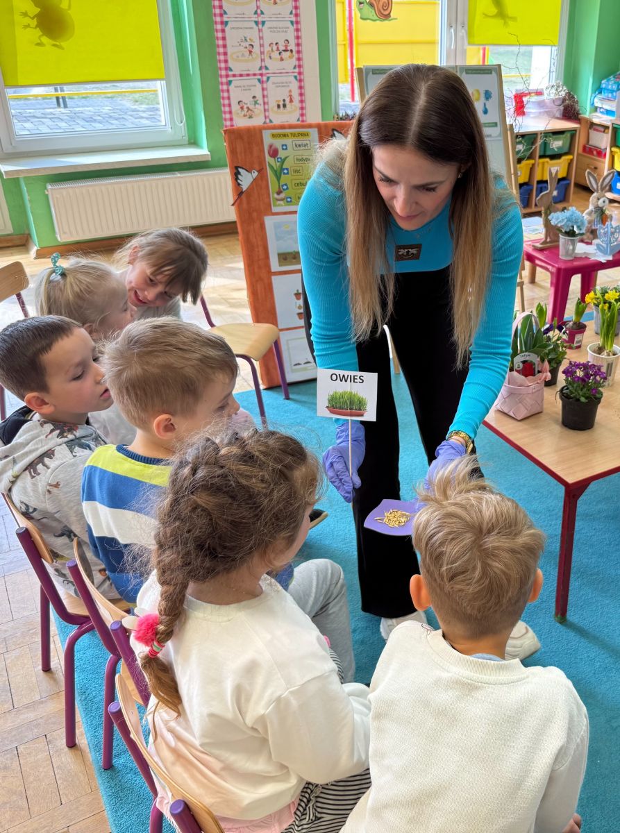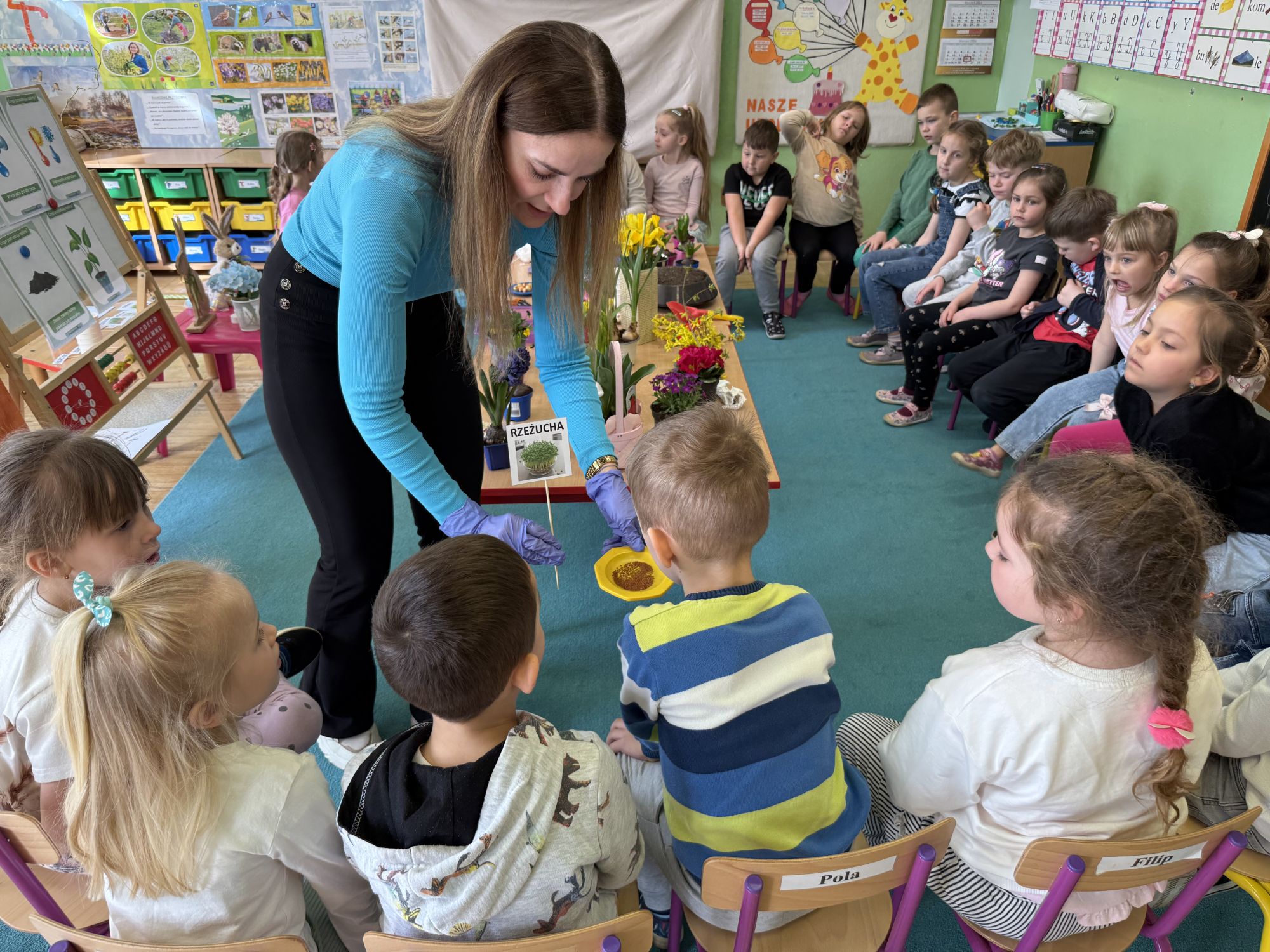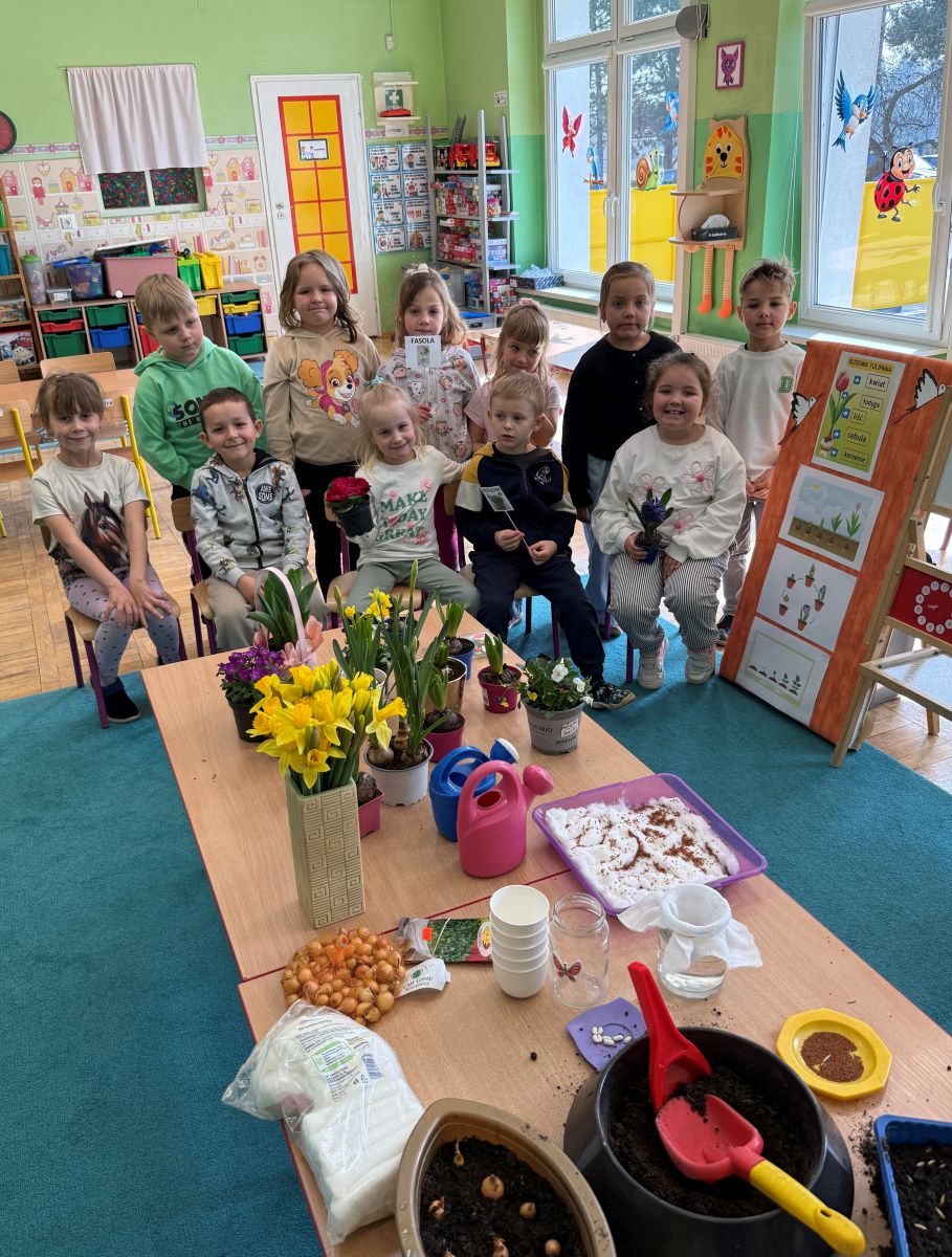 W czwartym tygodniu marca, w grupie starszej zagościła długo wyczekiwana wiosna. Dzieci z ogromnym zaciekawieniem odkrywały jej pierwsze oznaki. Rozmawiały o zmianach zachodzących w przyrodzie, poznawały wiosenne kwiaty oraz dowiadywały się, jakie prace wykonuje się w ogrodzie o tej porze roku. Szczególną radość sprawiło przedszkolakom założenie własnego ogródka w sali. Na stoliku, wspólnie z nauczycielem, zgromadziły wszystkie potrzebne rzeczy – pojemniki, słoiki, łopatki, nasiona i cebulki. Zanim jednak rozpoczęły pracę, z dużym zainteresowaniem oglądały nasionka, przyglądały się ich kształtom i kolorom, dzieląc się swoimi spostrzeżeniami. Dowiedziały się również, czym różni się sianie od sadzenia oraz poznały kolejne etapy wzrostu roślin – od momentu umieszczenia cebulki w glebie aż po jej stopniowy rozwój. Gdy wszystko było już gotowe, dzieci z wielkim zaangażowaniem przystąpiły do działania. Z radością siały rzeżuchę i owies, sadziły cebulkę, a także założyły hodowlę fasoli, układając nasiona na wilgotnej gazie w słoiku z wodą. Na zakończenie ustaliły dyżury, dzięki którym będą mogły troszczyć się o swoje rośliny każdego dnia. Nie zabrakło również rozmów o pięknych, wiosennych kwiatach. Na stole pojawiły się hiacynty, bratki, żonkile, prymulki oraz stokrotki. Dzieci z zachwytem je oglądały, opisywały ich wygląd i zapach, poznawały ich nazwy oraz budowę. Dowiedziały się także, czego rośliny potrzebują, aby rosnąć i pięknie kwitnąć. Kolejnego dnia starszaki wybrały się do przedszkolnego ogrodu, gdzie spotkały się z panem Witkiem, który z troską dba o otoczenie przedszkola. Wychowankowie z zainteresowaniem słuchały opowieści o wiosennych pracach ogrodowych oraz oglądały narzędzia i sprzęt do pielęgnacji terenu. Z bliska mogły zobaczyć m.in. sekator, łopatę, motykę, nożyce, grabie, rozsiewacz do nawozu lub nasion, a także wertykulator do trawnika. Następnie wybrały się na spacer wokół przedszkola, poszukując pierwszych wiosennych kwiatów. Na zakończenie dzieci wyraziły swoją radość poprzez twórczość plastyczną, malując farbami kolorowe kwiaty na folii stretch. Powstały piękne, barwne prace, które stały się kolorową ozdobą sali. Był to czas pełen radości, odkrywania i wspólnego działania. Takie zajęcia uczą najmłodszych cierpliwości, odpowiedzialności oraz uważnej obserwacji świata przyrody, rozwijając jednocześnie ich ciekawość i wrażliwość.