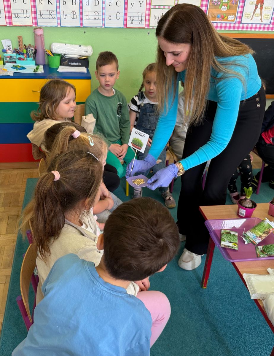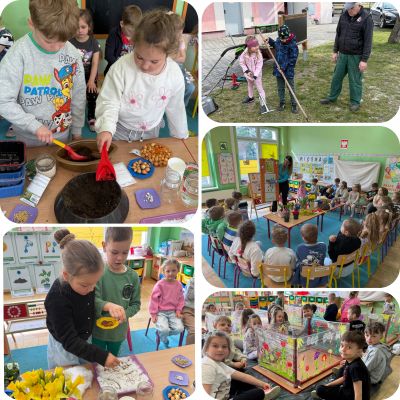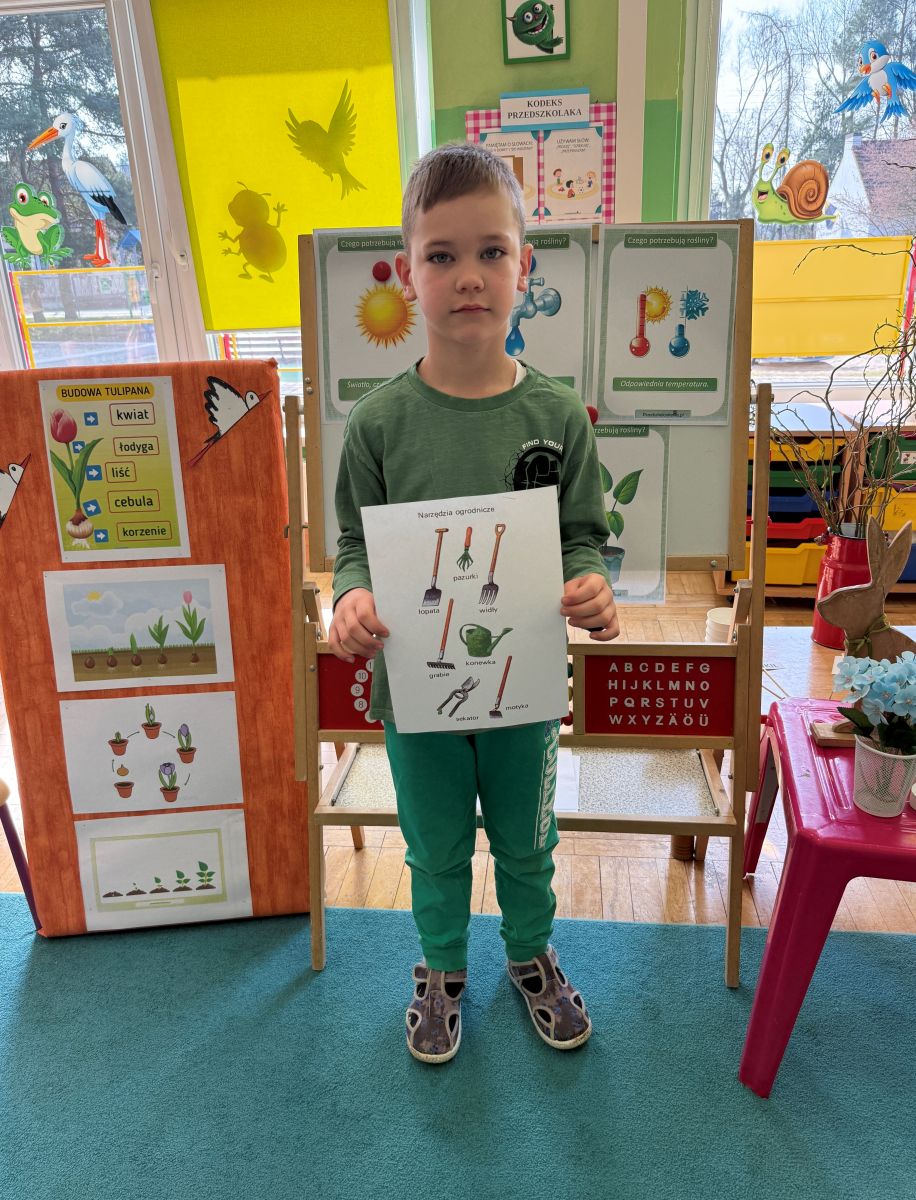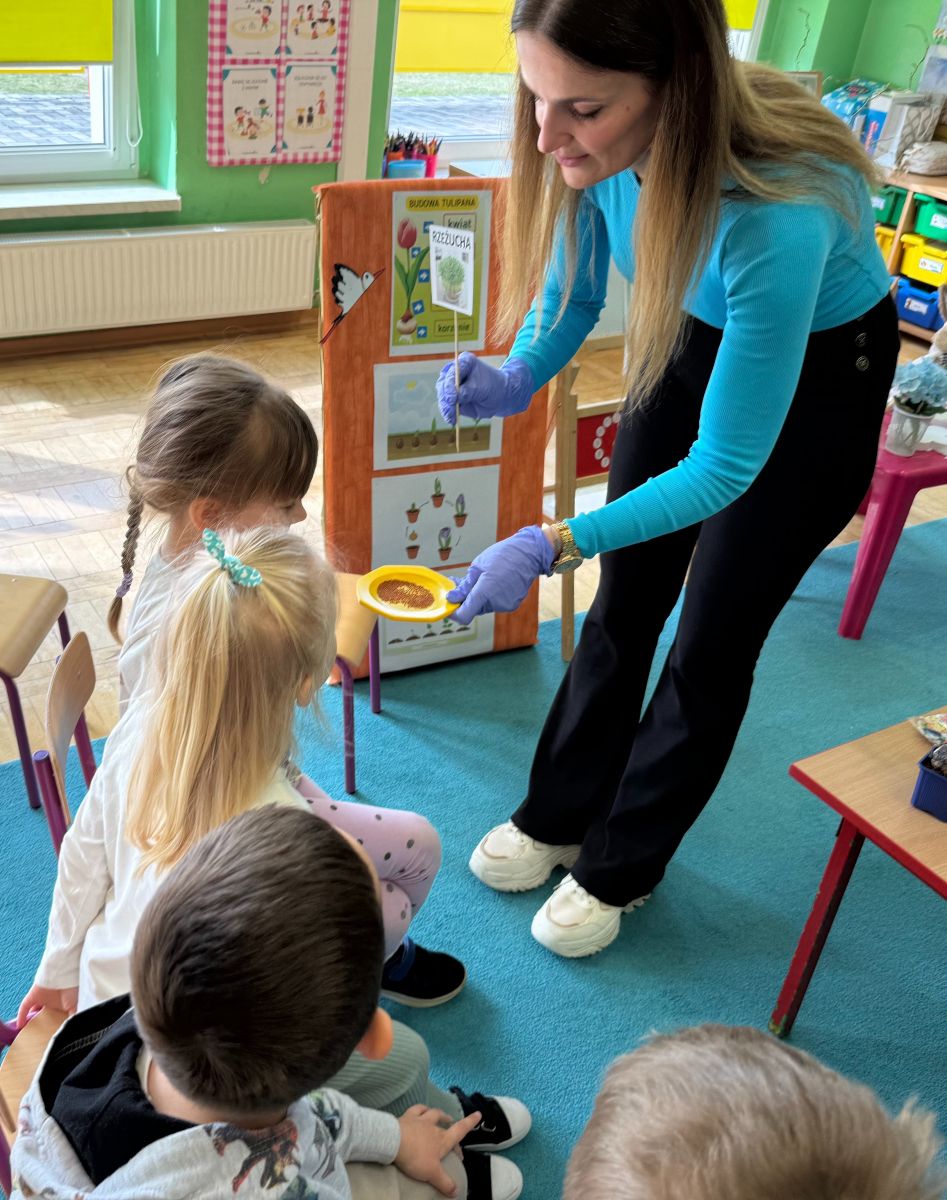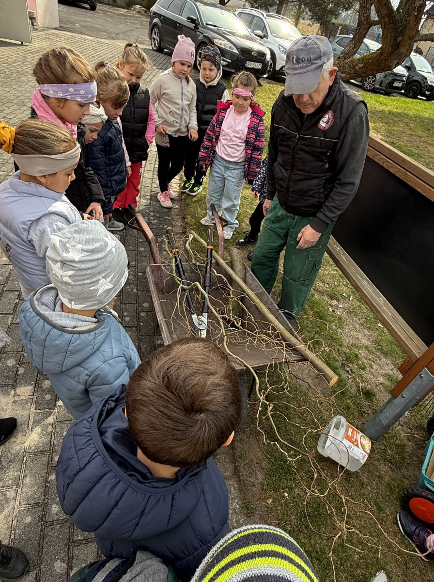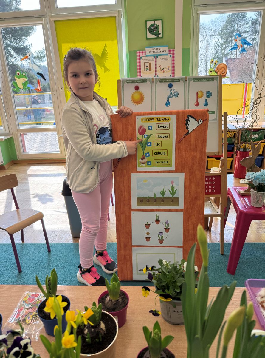 W czwartym tygodniu marca, w grupie starszej zagościła długo wyczekiwana wiosna. Dzieci z ogromnym zaciekawieniem odkrywały jej pierwsze oznaki. Rozmawiały o zmianach zachodzących w przyrodzie, poznawały wiosenne kwiaty oraz dowiadywały się, jakie prace wykonuje się w ogrodzie o tej porze roku. Szczególną radość sprawiło przedszkolakom założenie własnego ogródka w sali. Na stoliku, wspólnie z nauczycielem, zgromadziły wszystkie potrzebne rzeczy – pojemniki, słoiki, łopatki, nasiona i cebulki. Zanim jednak rozpoczęły pracę, z dużym zainteresowaniem oglądały nasionka, przyglądały się ich kształtom i kolorom, dzieląc się swoimi spostrzeżeniami. Dowiedziały się również, czym różni się sianie od sadzenia oraz poznały kolejne etapy wzrostu roślin – od momentu umieszczenia cebulki w glebie aż po jej stopniowy rozwój. Gdy wszystko było już gotowe, dzieci z wielkim zaangażowaniem przystąpiły do działania. Z radością siały rzeżuchę i owies, sadziły cebulkę, a także założyły hodowlę fasoli, układając nasiona na wilgotnej gazie w słoiku z wodą. Na zakończenie ustaliły dyżury, dzięki którym będą mogły troszczyć się o swoje rośliny każdego dnia. Nie zabrakło również rozmów o pięknych, wiosennych kwiatach. Na stole pojawiły się hiacynty, bratki, żonkile, prymulki oraz stokrotki. Dzieci z zachwytem je oglądały, opisywały ich wygląd i zapach, poznawały ich nazwy oraz budowę. Dowiedziały się także, czego rośliny potrzebują, aby rosnąć i pięknie kwitnąć. Kolejnego dnia starszaki wybrały się do przedszkolnego ogrodu, gdzie spotkały się z panem Witkiem, który z troską dba o otoczenie przedszkola. Wychowankowie z zainteresowaniem słuchały opowieści o wiosennych pracach ogrodowych oraz oglądały narzędzia i sprzęt do pielęgnacji terenu. Z bliska mogły zobaczyć m.in. sekator, łopatę, motykę, nożyce, grabie, rozsiewacz do nawozu lub nasion, a także wertykulator do trawnika. Następnie wybrały się na spacer wokół przedszkola, poszukując pierwszych wiosennych kwiatów. Na zakończenie dzieci wyraziły swoją radość poprzez twórczość plastyczną, malując farbami kolorowe kwiaty na folii stretch. Powstały piękne, barwne prace, które stały się kolorową ozdobą sali. Był to czas pełen radości, odkrywania i wspólnego działania. Takie zajęcia uczą najmłodszych cierpliwości, odpowiedzialności oraz uważnej obserwacji świata przyrody, rozwijając jednocześnie ich ciekawość i wrażliwość.