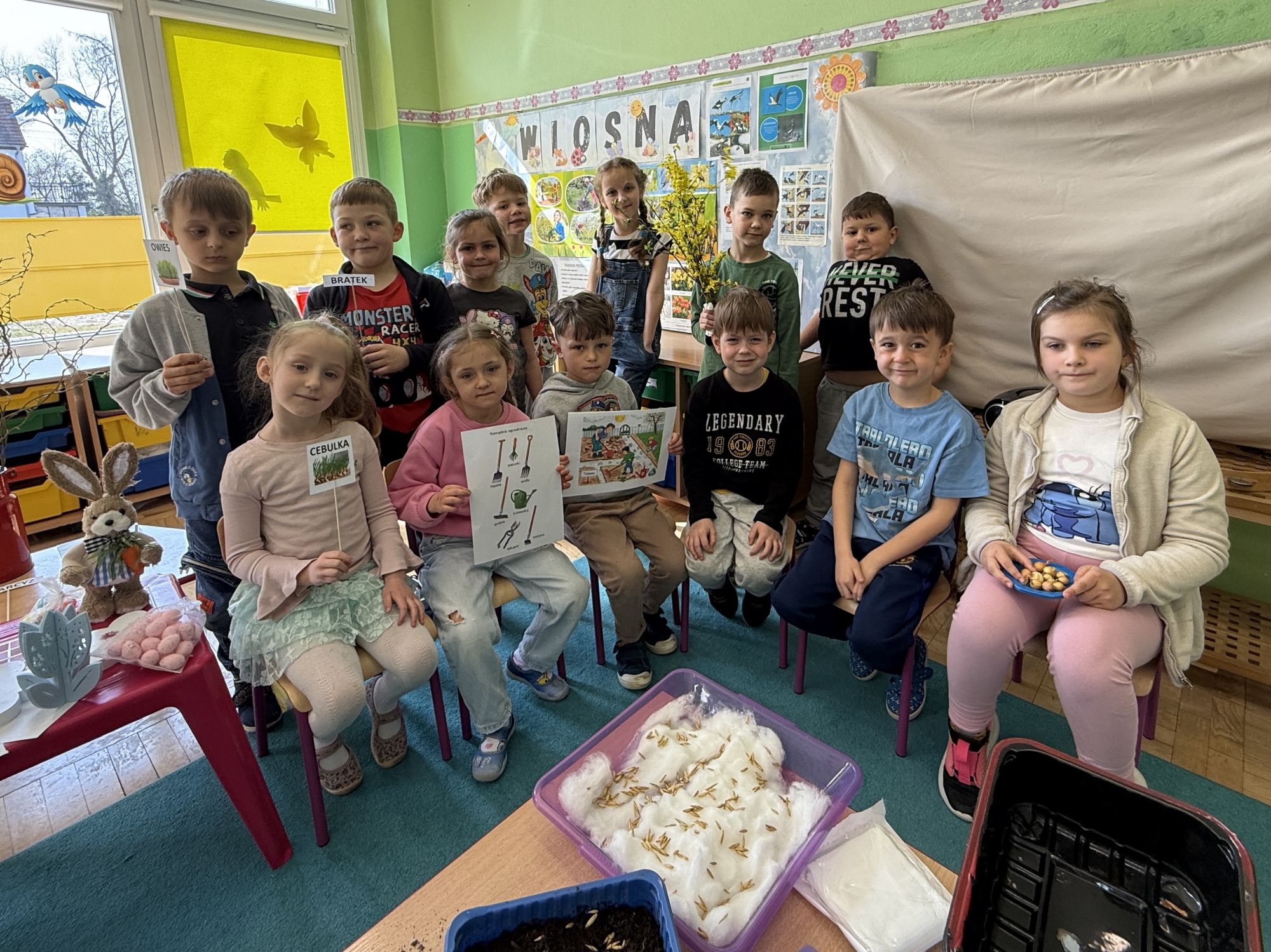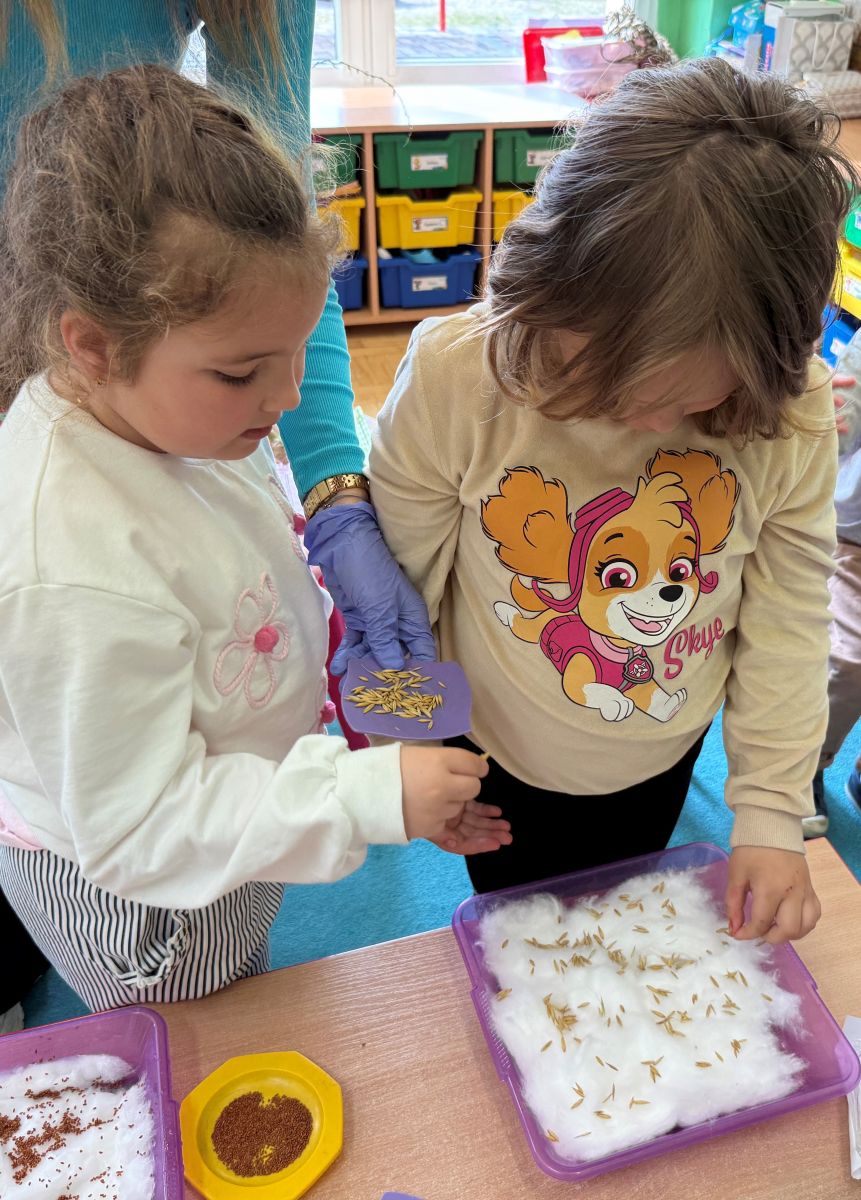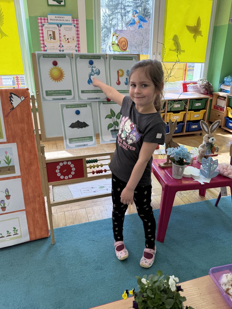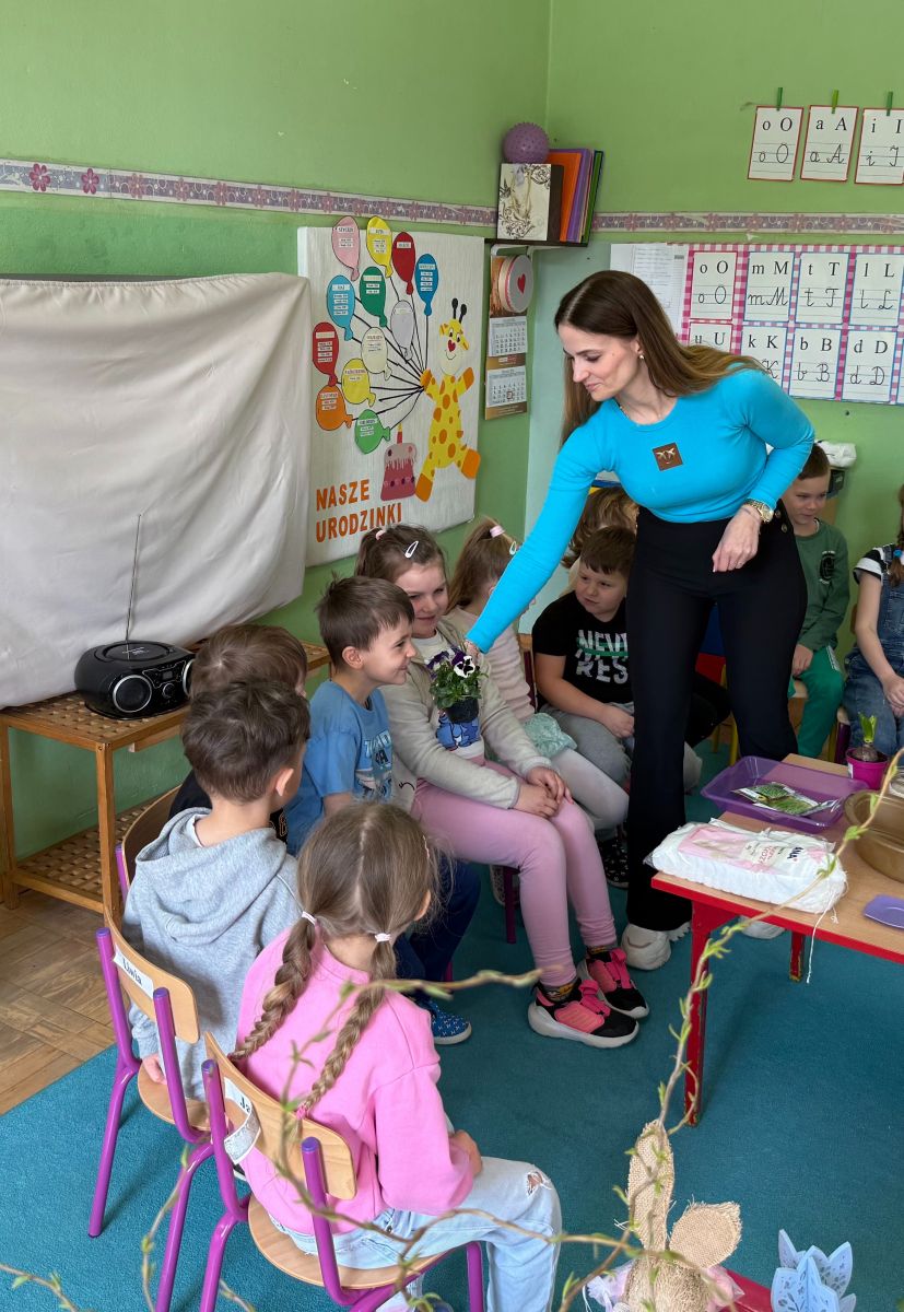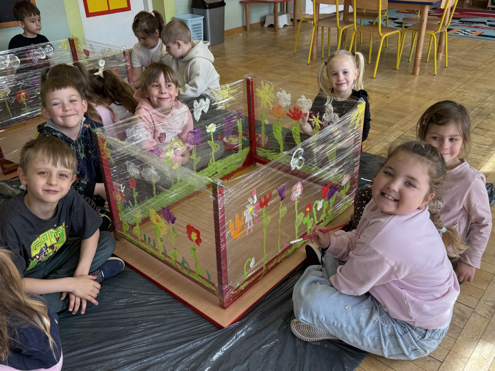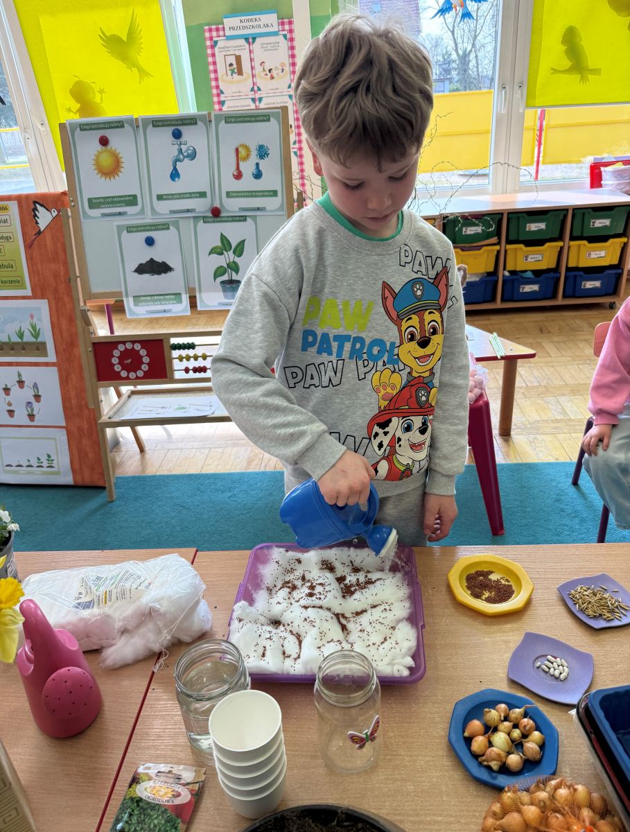 W czwartym tygodniu marca, w grupie starszej zagościła długo wyczekiwana wiosna. Dzieci z ogromnym zaciekawieniem odkrywały jej pierwsze oznaki. Rozmawiały o zmianach zachodzących w przyrodzie, poznawały wiosenne kwiaty oraz dowiadywały się, jakie prace wykonuje się w ogrodzie o tej porze roku. Szczególną radość sprawiło przedszkolakom założenie własnego ogródka w sali. Na stoliku, wspólnie z nauczycielem, zgromadziły wszystkie potrzebne rzeczy – pojemniki, słoiki, łopatki, nasiona i cebulki. Zanim jednak rozpoczęły pracę, z dużym zainteresowaniem oglądały nasionka, przyglądały się ich kształtom i kolorom, dzieląc się swoimi spostrzeżeniami. Dowiedziały się również, czym różni się sianie od sadzenia oraz poznały kolejne etapy wzrostu roślin – od momentu umieszczenia cebulki w glebie aż po jej stopniowy rozwój. Gdy wszystko było już gotowe, dzieci z wielkim zaangażowaniem przystąpiły do działania. Z radością siały rzeżuchę i owies, sadziły cebulkę, a także założyły hodowlę fasoli, układając nasiona na wilgotnej gazie w słoiku z wodą. Na zakończenie ustaliły dyżury, dzięki którym będą mogły troszczyć się o swoje rośliny każdego dnia. Nie zabrakło również rozmów o pięknych, wiosennych kwiatach. Na stole pojawiły się hiacynty, bratki, żonkile, prymulki oraz stokrotki. Dzieci z zachwytem je oglądały, opisywały ich wygląd i zapach, poznawały ich nazwy oraz budowę. Dowiedziały się także, czego rośliny potrzebują, aby rosnąć i pięknie kwitnąć. Kolejnego dnia starszaki wybrały się do przedszkolnego ogrodu, gdzie spotkały się z panem Witkiem, który z troską dba o otoczenie przedszkola. Wychowankowie z zainteresowaniem słuchały opowieści o wiosennych pracach ogrodowych oraz oglądały narzędzia i sprzęt do pielęgnacji terenu. Z bliska mogły zobaczyć m.in. sekator, łopatę, motykę, nożyce, grabie, rozsiewacz do nawozu lub nasion, a także wertykulator do trawnika. Następnie wybrały się na spacer wokół przedszkola, poszukując pierwszych wiosennych kwiatów. Na zakończenie dzieci wyraziły swoją radość poprzez twórczość plastyczną, malując farbami kolorowe kwiaty na folii stretch. Powstały piękne, barwne prace, które stały się kolorową ozdobą sali. Był to czas pełen radości, odkrywania i wspólnego działania. Takie zajęcia uczą najmłodszych cierpliwości, odpowiedzialności oraz uważnej obserwacji świata przyrody, rozwijając jednocześnie ich ciekawość i wrażliwość.