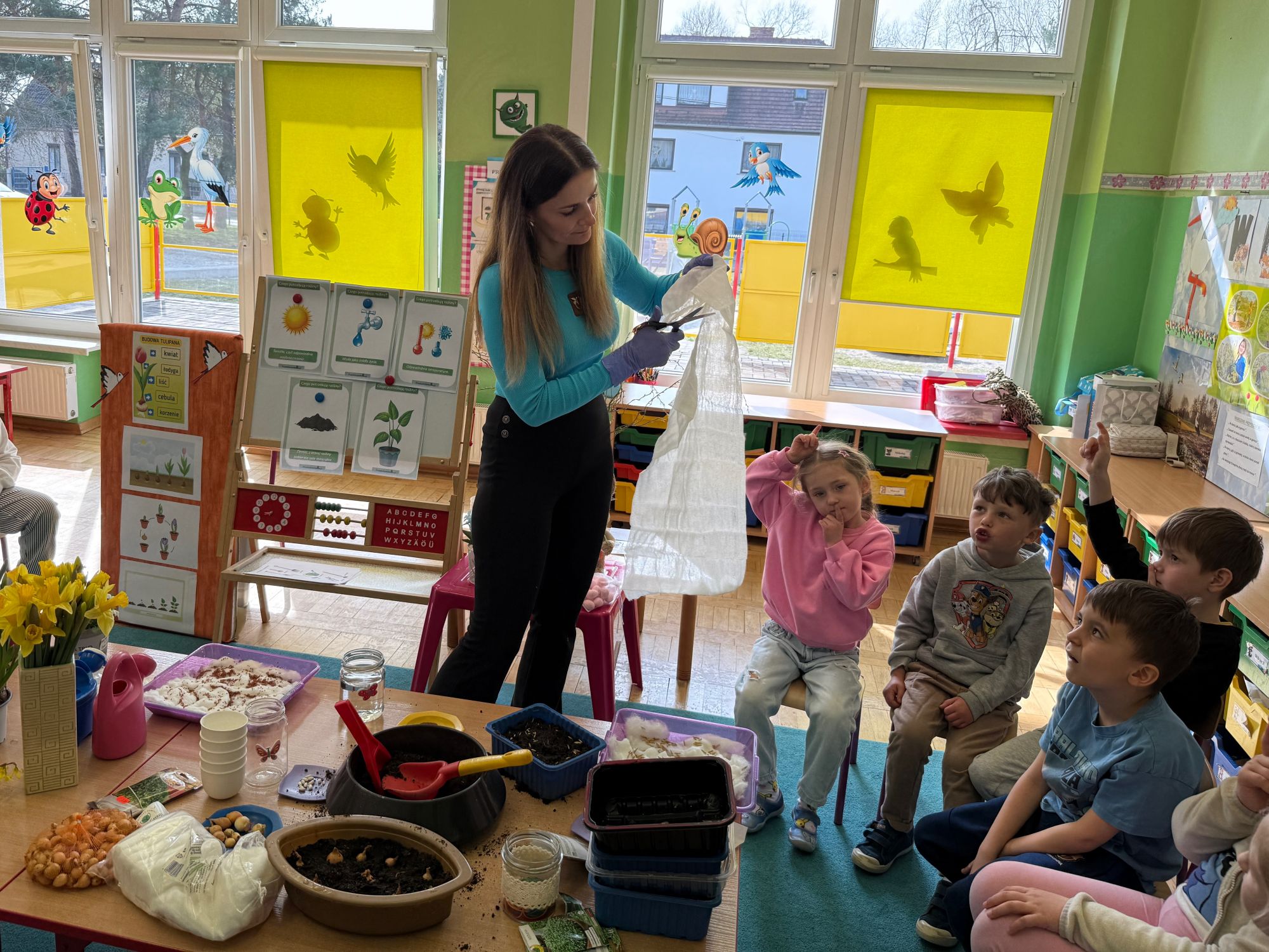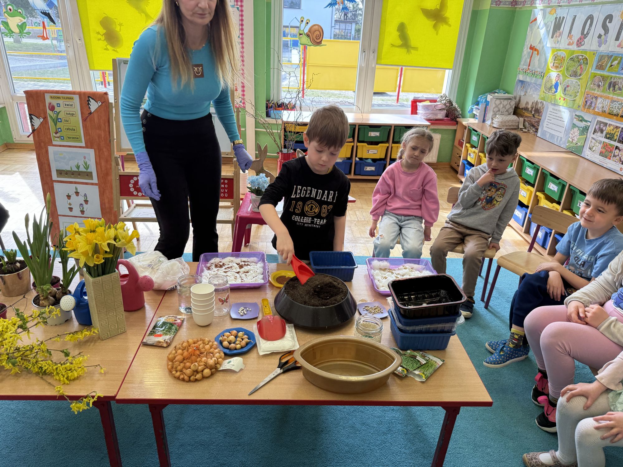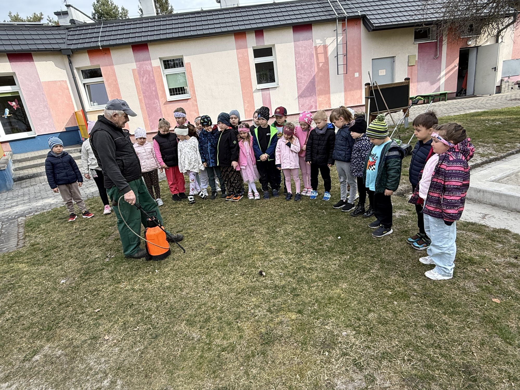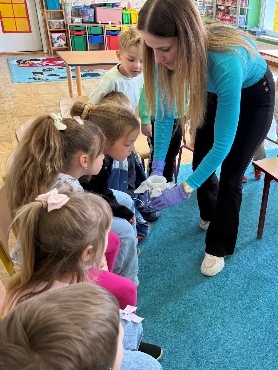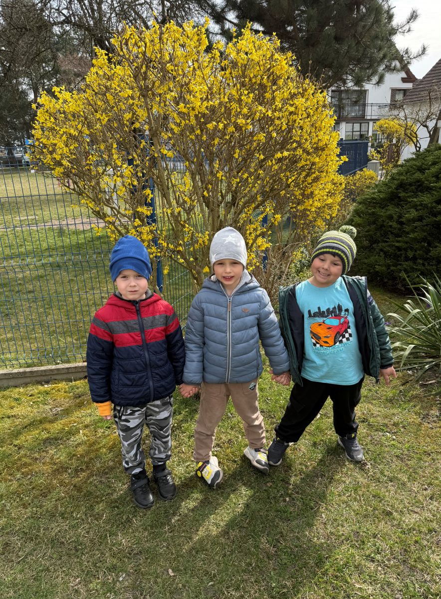 W czwartym tygodniu marca, w grupie starszej zagościła długo wyczekiwana wiosna. Dzieci z ogromnym zaciekawieniem odkrywały jej pierwsze oznaki. Rozmawiały o zmianach zachodzących w przyrodzie, poznawały wiosenne kwiaty oraz dowiadywały się, jakie prace wykonuje się w ogrodzie o tej porze roku. Szczególną radość sprawiło przedszkolakom założenie własnego ogródka w sali. Na stoliku, wspólnie z nauczycielem, zgromadziły wszystkie potrzebne rzeczy – pojemniki, słoiki, łopatki, nasiona i cebulki. Zanim jednak rozpoczęły pracę, z dużym zainteresowaniem oglądały nasionka, przyglądały się ich kształtom i kolorom, dzieląc się swoimi spostrzeżeniami. Dowiedziały się również, czym różni się sianie od sadzenia oraz poznały kolejne etapy wzrostu roślin – od momentu umieszczenia cebulki w glebie aż po jej stopniowy rozwój. Gdy wszystko było już gotowe, dzieci z wielkim zaangażowaniem przystąpiły do działania. Z radością siały rzeżuchę i owies, sadziły cebulkę, a także założyły hodowlę fasoli, układając nasiona na wilgotnej gazie w słoiku z wodą. Na zakończenie ustaliły dyżury, dzięki którym będą mogły troszczyć się o swoje rośliny każdego dnia. Nie zabrakło również rozmów o pięknych, wiosennych kwiatach. Na stole pojawiły się hiacynty, bratki, żonkile, prymulki oraz stokrotki. Dzieci z zachwytem je oglądały, opisywały ich wygląd i zapach, poznawały ich nazwy oraz budowę. Dowiedziały się także, czego rośliny potrzebują, aby rosnąć i pięknie kwitnąć. Kolejnego dnia starszaki wybrały się do przedszkolnego ogrodu, gdzie spotkały się z panem Witkiem, który z troską dba o otoczenie przedszkola. Wychowankowie z zainteresowaniem słuchały opowieści o wiosennych pracach ogrodowych oraz oglądały narzędzia i sprzęt do pielęgnacji terenu. Z bliska mogły zobaczyć m.in. sekator, łopatę, motykę, nożyce, grabie, rozsiewacz do nawozu lub nasion, a także wertykulator do trawnika. Następnie wybrały się na spacer wokół przedszkola, poszukując pierwszych wiosennych kwiatów. Na zakończenie dzieci wyraziły swoją radość poprzez twórczość plastyczną, malując farbami kolorowe kwiaty na folii stretch. Powstały piękne, barwne prace, które stały się kolorową ozdobą sali. Był to czas pełen radości, odkrywania i wspólnego działania. Takie zajęcia uczą najmłodszych cierpliwości, odpowiedzialności oraz uważnej obserwacji świata przyrody, rozwijając jednocześnie ich ciekawość i wrażliwość.