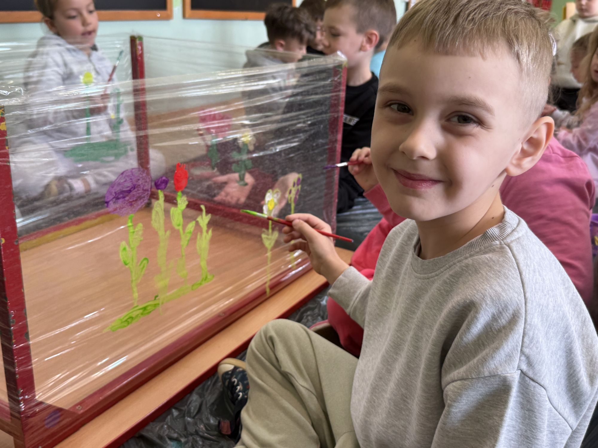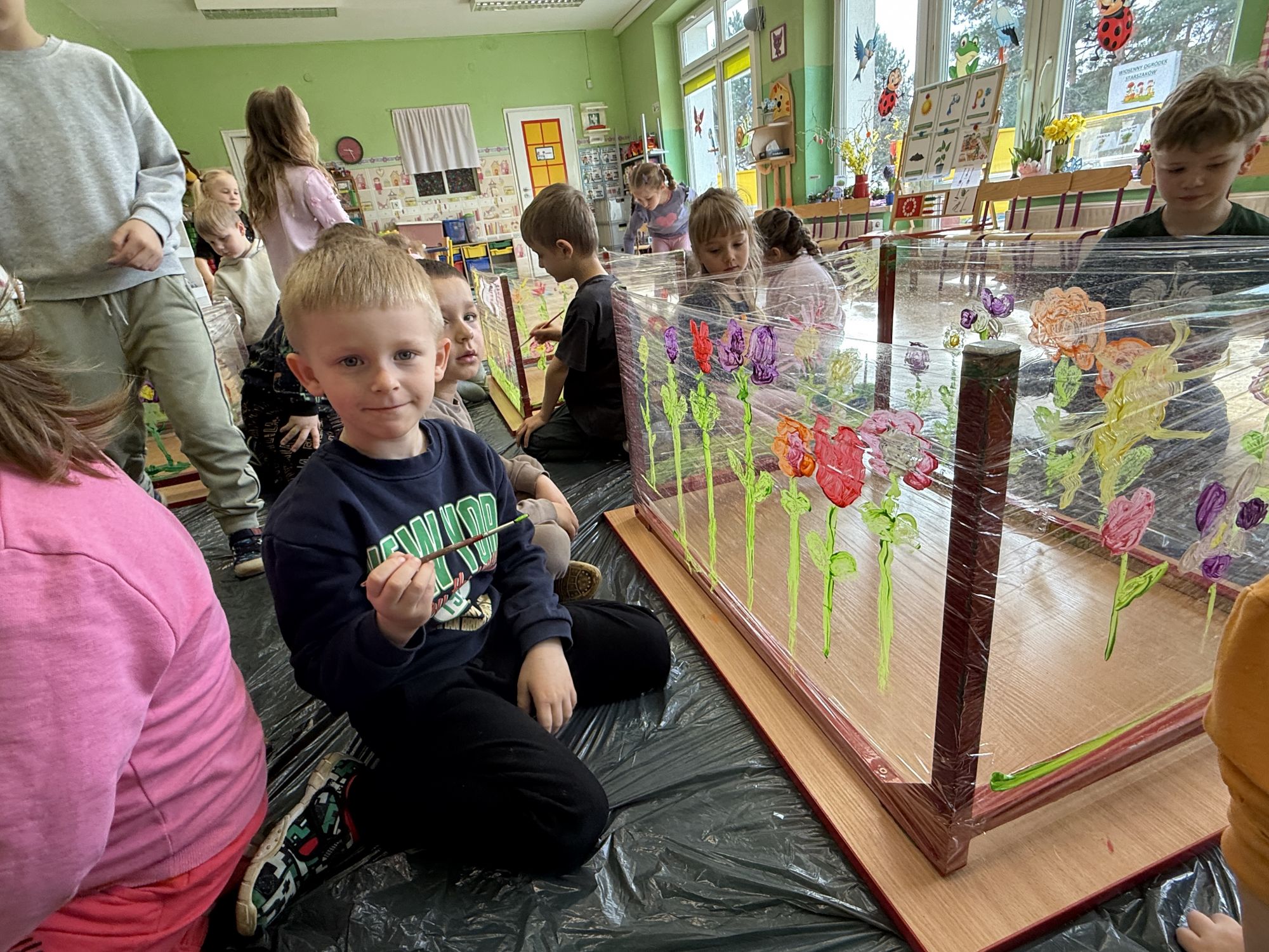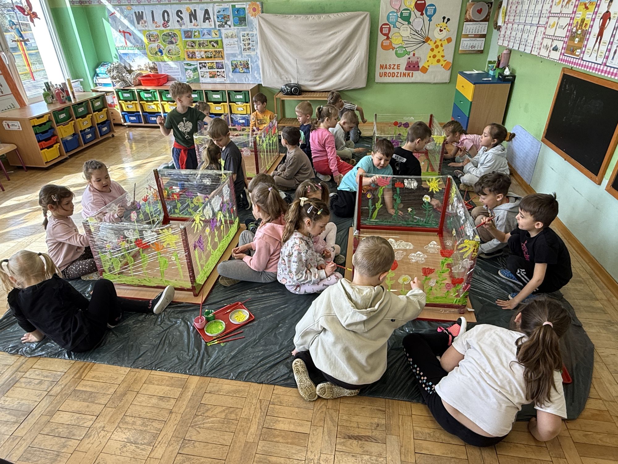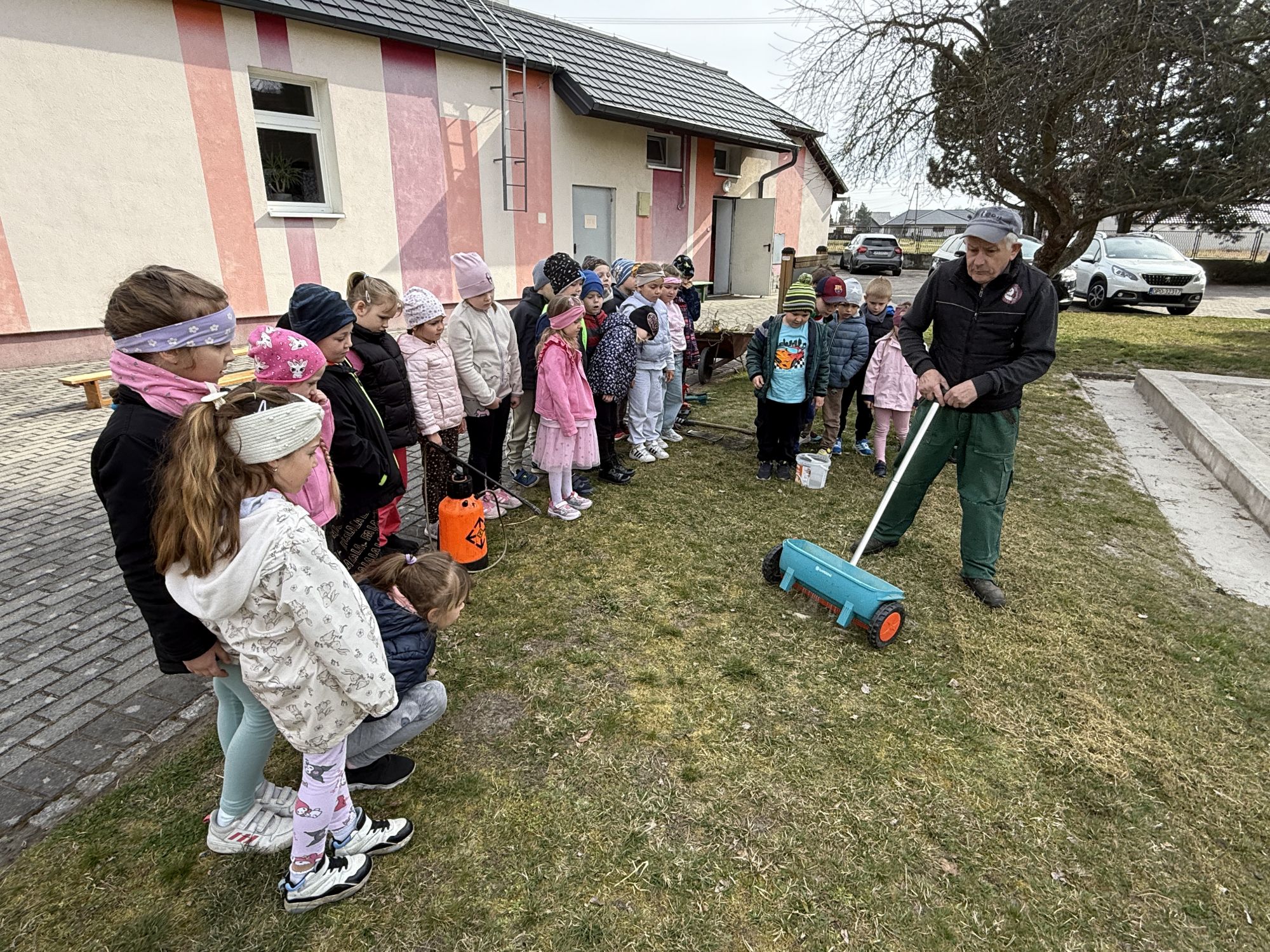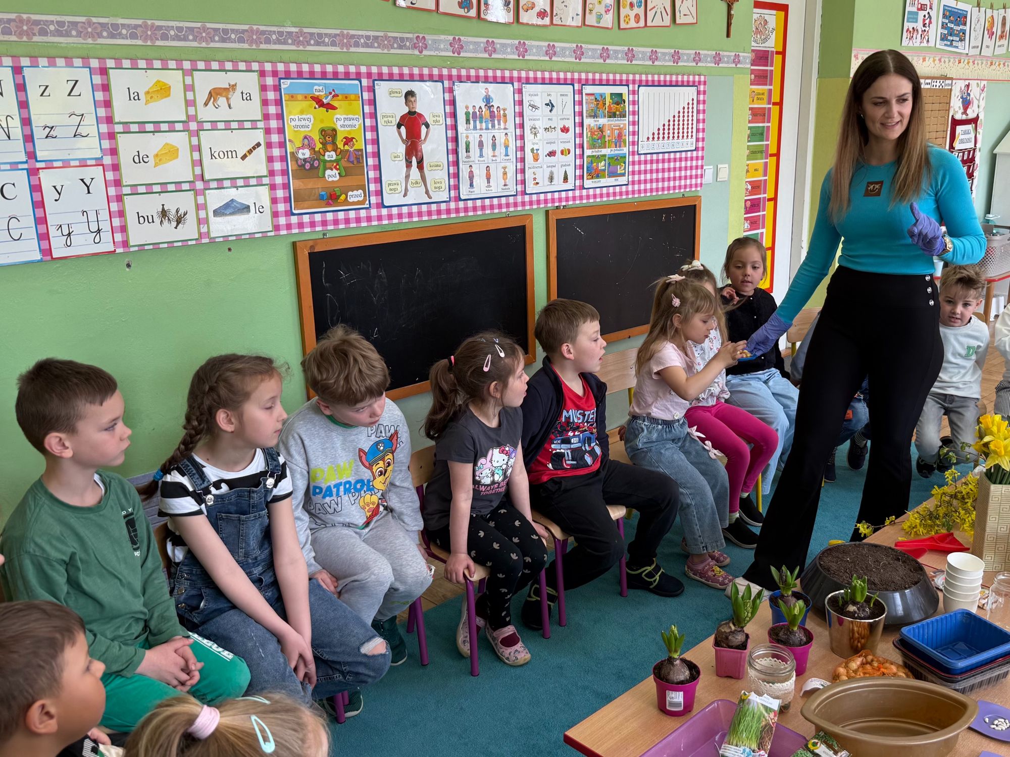 W czwartym tygodniu marca, w grupie starszej zagościła długo wyczekiwana wiosna. Dzieci z ogromnym zaciekawieniem odkrywały jej pierwsze oznaki. Rozmawiały o zmianach zachodzących w przyrodzie, poznawały wiosenne kwiaty oraz dowiadywały się, jakie prace wykonuje się w ogrodzie o tej porze roku. Szczególną radość sprawiło przedszkolakom założenie własnego ogródka w sali. Na stoliku, wspólnie z nauczycielem, zgromadziły wszystkie potrzebne rzeczy – pojemniki, słoiki, łopatki, nasiona i cebulki. Zanim jednak rozpoczęły pracę, z dużym zainteresowaniem oglądały nasionka, przyglądały się ich kształtom i kolorom, dzieląc się swoimi spostrzeżeniami. Dowiedziały się również, czym różni się sianie od sadzenia oraz poznały kolejne etapy wzrostu roślin – od momentu umieszczenia cebulki w glebie aż po jej stopniowy rozwój. Gdy wszystko było już gotowe, dzieci z wielkim zaangażowaniem przystąpiły do działania. Z radością siały rzeżuchę i owies, sadziły cebulkę, a także założyły hodowlę fasoli, układając nasiona na wilgotnej gazie w słoiku z wodą. Na zakończenie ustaliły dyżury, dzięki którym będą mogły troszczyć się o swoje rośliny każdego dnia. Nie zabrakło również rozmów o pięknych, wiosennych kwiatach. Na stole pojawiły się hiacynty, bratki, żonkile, prymulki oraz stokrotki. Dzieci z zachwytem je oglądały, opisywały ich wygląd i zapach, poznawały ich nazwy oraz budowę. Dowiedziały się także, czego rośliny potrzebują, aby rosnąć i pięknie kwitnąć. Kolejnego dnia starszaki wybrały się do przedszkolnego ogrodu, gdzie spotkały się z panem Witkiem, który z troską dba o otoczenie przedszkola. Wychowankowie z zainteresowaniem słuchały opowieści o wiosennych pracach ogrodowych oraz oglądały narzędzia i sprzęt do pielęgnacji terenu. Z bliska mogły zobaczyć m.in. sekator, łopatę, motykę, nożyce, grabie, rozsiewacz do nawozu lub nasion, a także wertykulator do trawnika. Następnie wybrały się na spacer wokół przedszkola, poszukując pierwszych wiosennych kwiatów. Na zakończenie dzieci wyraziły swoją radość poprzez twórczość plastyczną, malując farbami kolorowe kwiaty na folii stretch. Powstały piękne, barwne prace, które stały się kolorową ozdobą sali. Był to czas pełen radości, odkrywania i wspólnego działania. Takie zajęcia uczą najmłodszych cierpliwości, odpowiedzialności oraz uważnej obserwacji świata przyrody, rozwijając jednocześnie ich ciekawość i wrażliwość.