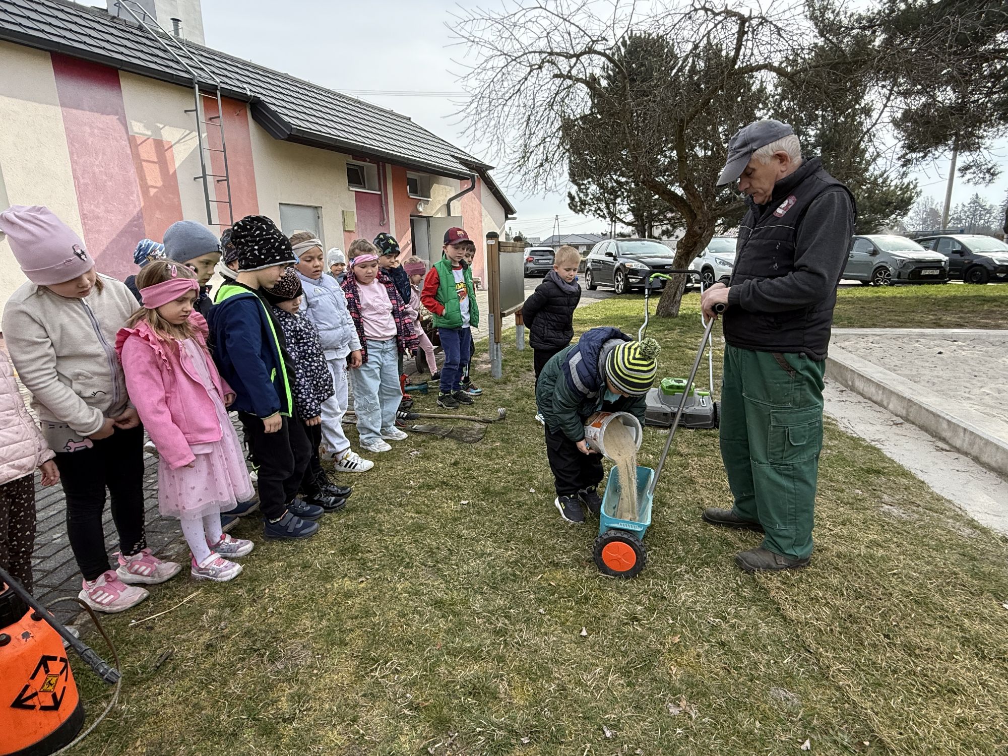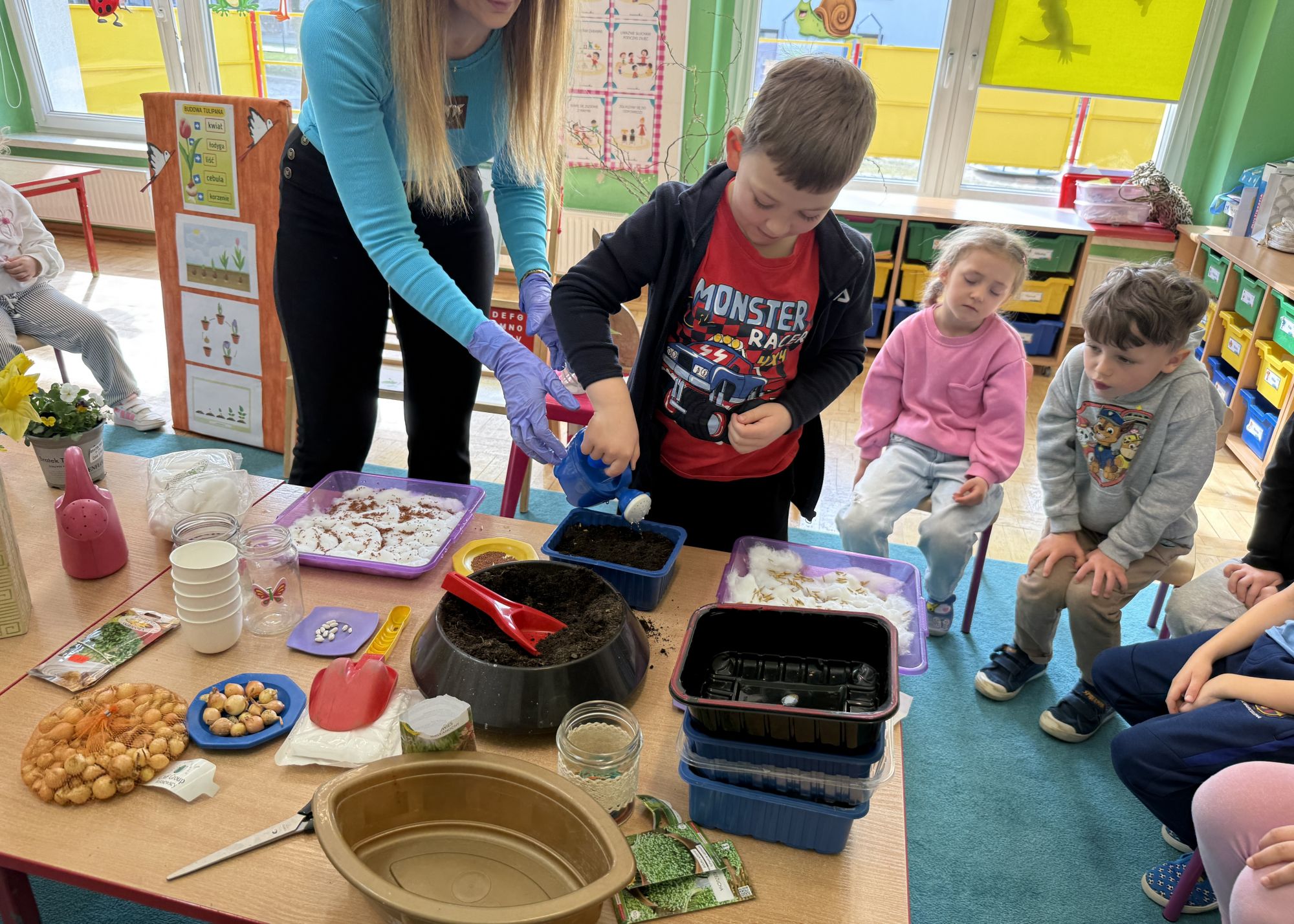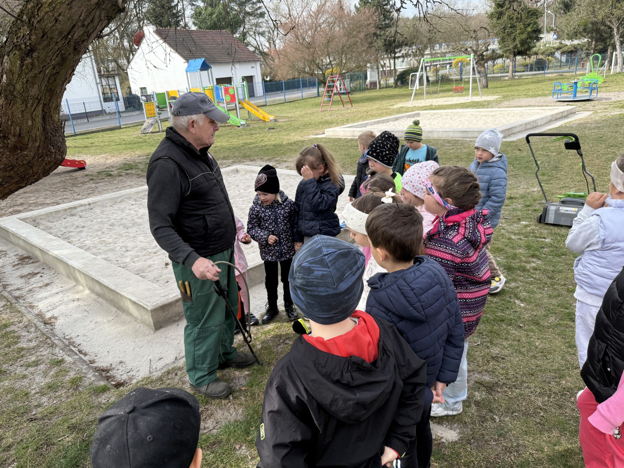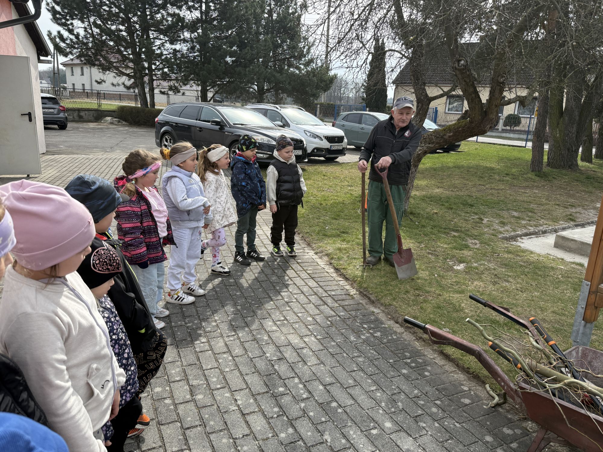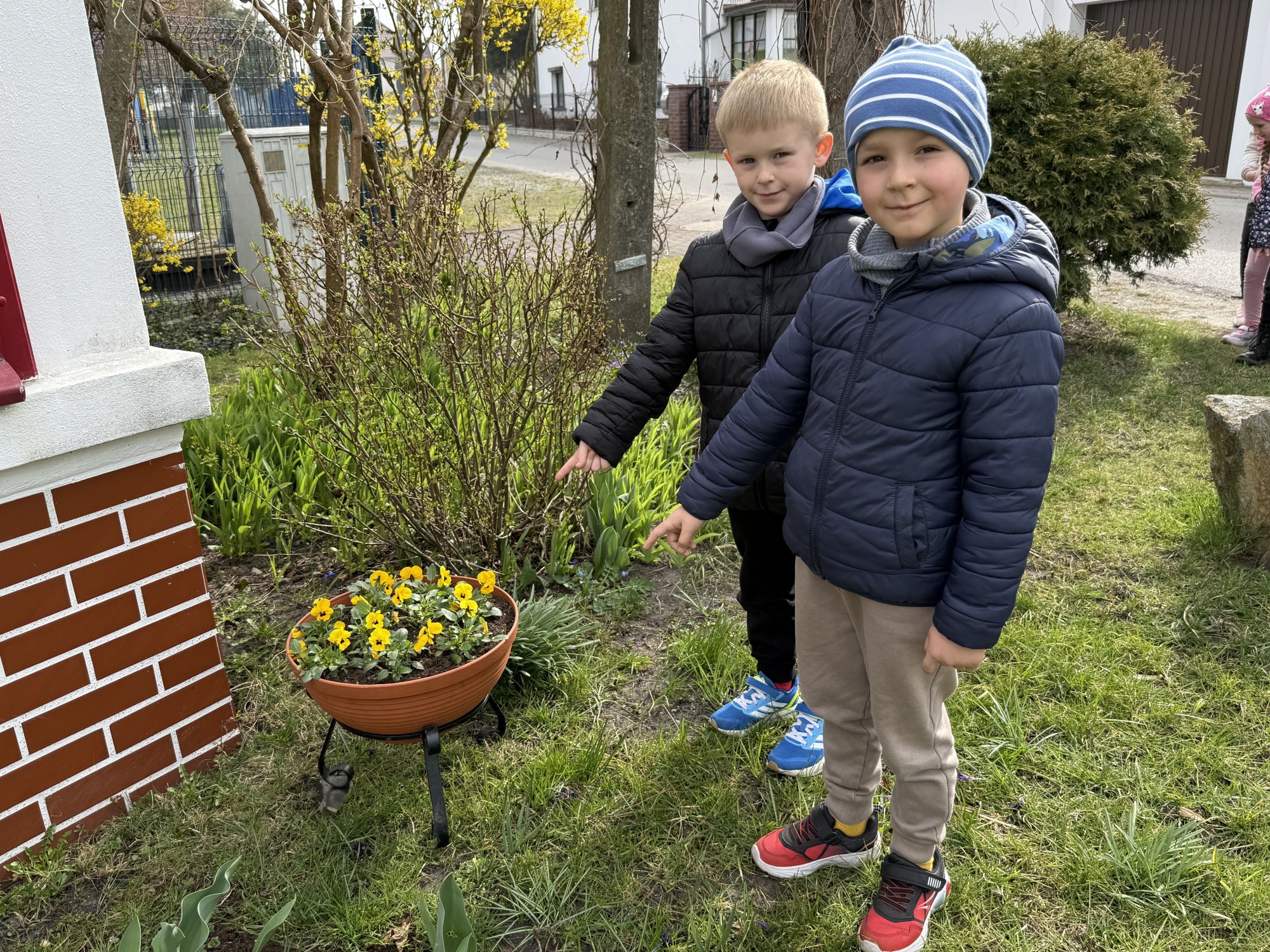 W czwartym tygodniu marca, w grupie starszej zagościła długo wyczekiwana wiosna. Dzieci z ogromnym zaciekawieniem odkrywały jej pierwsze oznaki. Rozmawiały o zmianach zachodzących w przyrodzie, poznawały wiosenne kwiaty oraz dowiadywały się, jakie prace wykonuje się w ogrodzie o tej porze roku. Szczególną radość sprawiło przedszkolakom założenie własnego ogródka w sali. Na stoliku, wspólnie z nauczycielem, zgromadziły wszystkie potrzebne rzeczy – pojemniki, słoiki, łopatki, nasiona i cebulki. Zanim jednak rozpoczęły pracę, z dużym zainteresowaniem oglądały nasionka, przyglądały się ich kształtom i kolorom, dzieląc się swoimi spostrzeżeniami. Dowiedziały się również, czym różni się sianie od sadzenia oraz poznały kolejne etapy wzrostu roślin – od momentu umieszczenia cebulki w glebie aż po jej stopniowy rozwój. Gdy wszystko było już gotowe, dzieci z wielkim zaangażowaniem przystąpiły do działania. Z radością siały rzeżuchę i owies, sadziły cebulkę, a także założyły hodowlę fasoli, układając nasiona na wilgotnej gazie w słoiku z wodą. Na zakończenie ustaliły dyżury, dzięki którym będą mogły troszczyć się o swoje rośliny każdego dnia. Nie zabrakło również rozmów o pięknych, wiosennych kwiatach. Na stole pojawiły się hiacynty, bratki, żonkile, prymulki oraz stokrotki. Dzieci z zachwytem je oglądały, opisywały ich wygląd i zapach, poznawały ich nazwy oraz budowę. Dowiedziały się także, czego rośliny potrzebują, aby rosnąć i pięknie kwitnąć. Kolejnego dnia starszaki wybrały się do przedszkolnego ogrodu, gdzie spotkały się z panem Witkiem, który z troską dba o otoczenie przedszkola. Wychowankowie z zainteresowaniem słuchały opowieści o wiosennych pracach ogrodowych oraz oglądały narzędzia i sprzęt do pielęgnacji terenu. Z bliska mogły zobaczyć m.in. sekator, łopatę, motykę, nożyce, grabie, rozsiewacz do nawozu lub nasion, a także wertykulator do trawnika. Następnie wybrały się na spacer wokół przedszkola, poszukując pierwszych wiosennych kwiatów. Na zakończenie dzieci wyraziły swoją radość poprzez twórczość plastyczną, malując farbami kolorowe kwiaty na folii stretch. Powstały piękne, barwne prace, które stały się kolorową ozdobą sali. Był to czas pełen radości, odkrywania i wspólnego działania. Takie zajęcia uczą najmłodszych cierpliwości, odpowiedzialności oraz uważnej obserwacji świata przyrody, rozwijając jednocześnie ich ciekawość i wrażliwość.