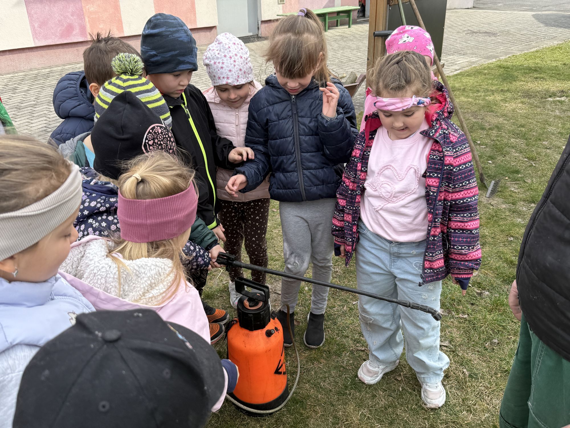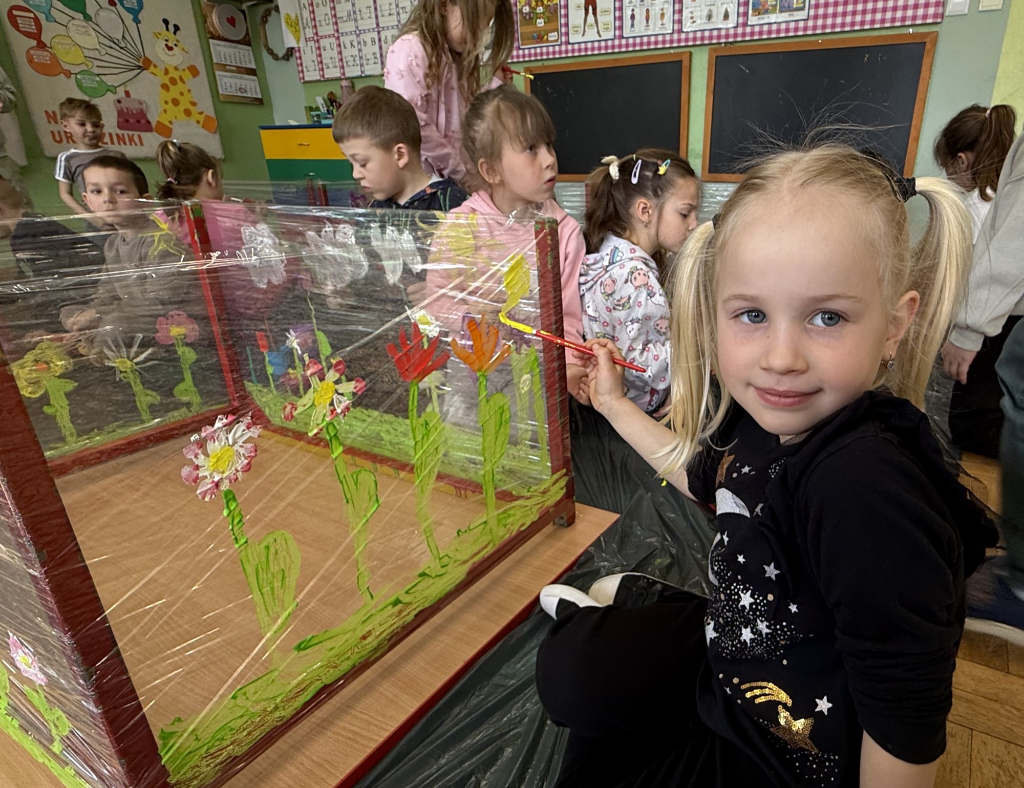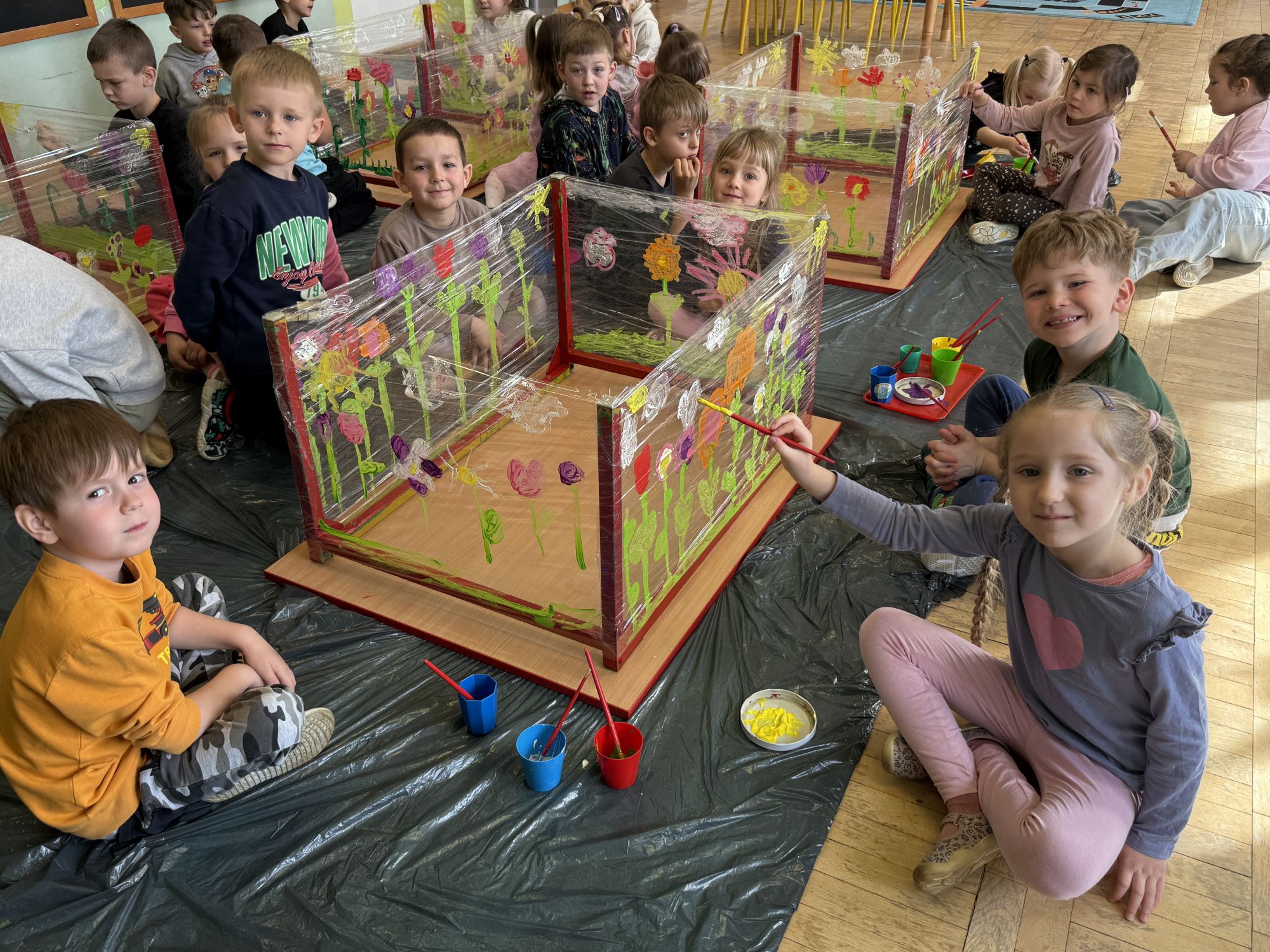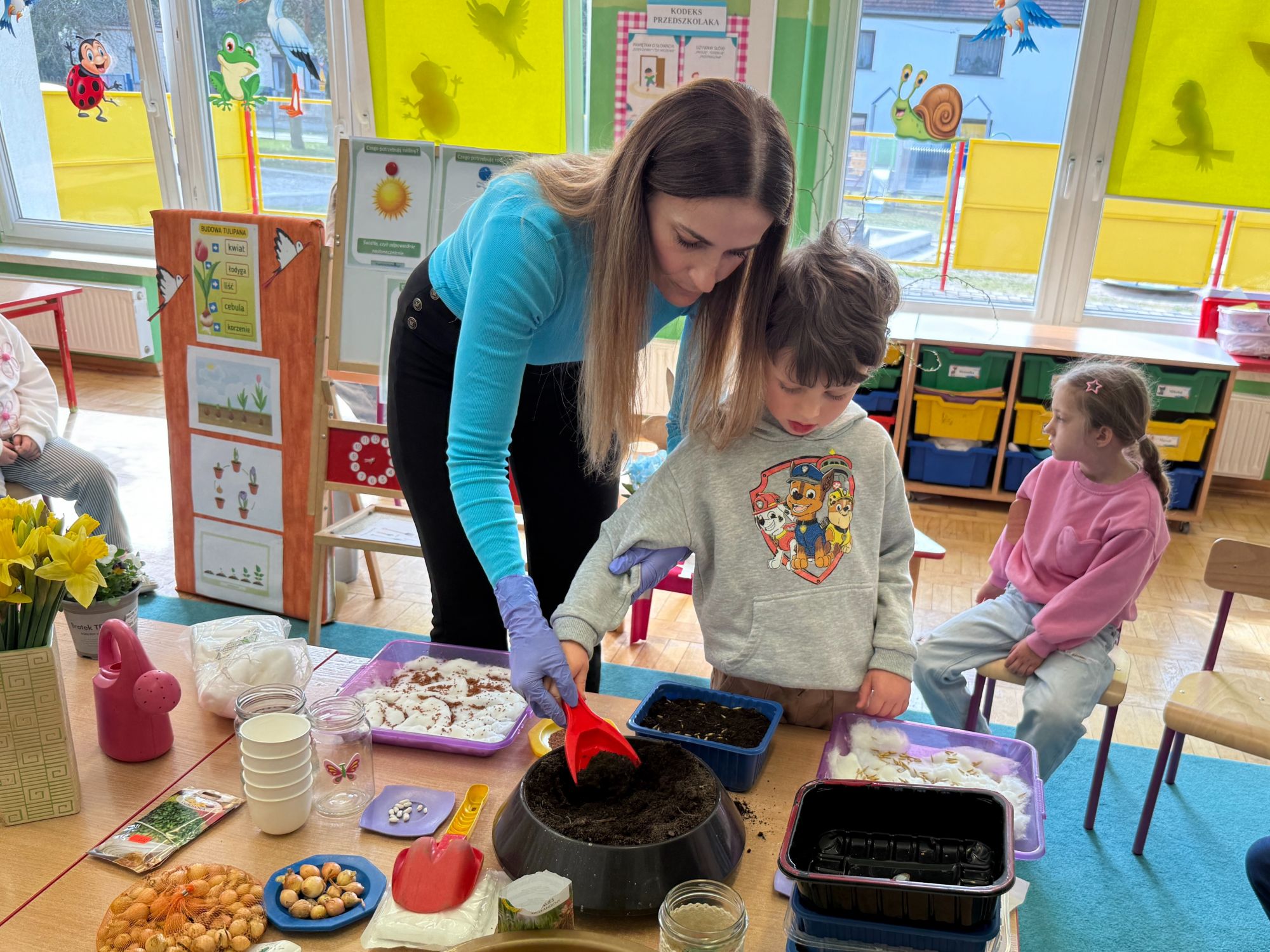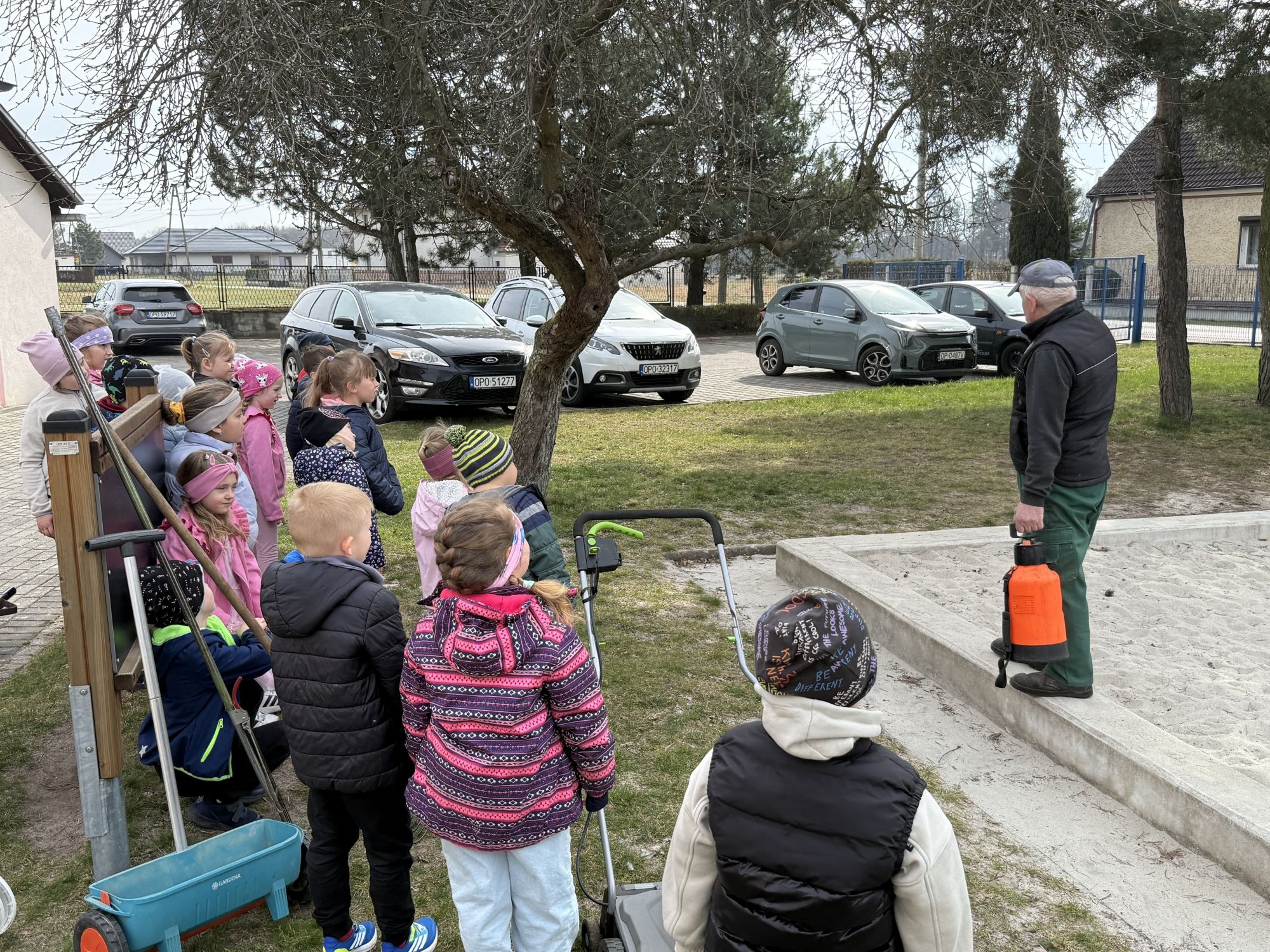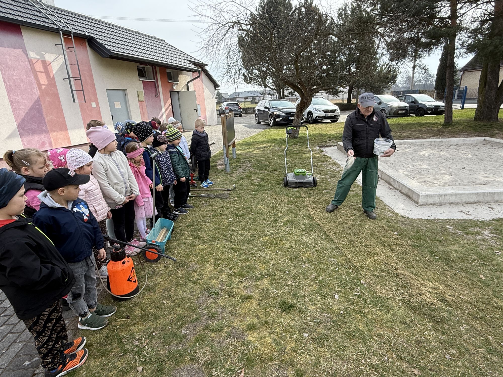 W czwartym tygodniu marca, w grupie starszej zagościła długo wyczekiwana wiosna. Dzieci z ogromnym zaciekawieniem odkrywały jej pierwsze oznaki. Rozmawiały o zmianach zachodzących w przyrodzie, poznawały wiosenne kwiaty oraz dowiadywały się, jakie prace wykonuje się w ogrodzie o tej porze roku. Szczególną radość sprawiło przedszkolakom założenie własnego ogródka w sali. Na stoliku, wspólnie z nauczycielem, zgromadziły wszystkie potrzebne rzeczy – pojemniki, słoiki, łopatki, nasiona i cebulki. Zanim jednak rozpoczęły pracę, z dużym zainteresowaniem oglądały nasionka, przyglądały się ich kształtom i kolorom, dzieląc się swoimi spostrzeżeniami. Dowiedziały się również, czym różni się sianie od sadzenia oraz poznały kolejne etapy wzrostu roślin – od momentu umieszczenia cebulki w glebie aż po jej stopniowy rozwój. Gdy wszystko było już gotowe, dzieci z wielkim zaangażowaniem przystąpiły do działania. Z radością siały rzeżuchę i owies, sadziły cebulkę, a także założyły hodowlę fasoli, układając nasiona na wilgotnej gazie w słoiku z wodą. Na zakończenie ustaliły dyżury, dzięki którym będą mogły troszczyć się o swoje rośliny każdego dnia. Nie zabrakło również rozmów o pięknych, wiosennych kwiatach. Na stole pojawiły się hiacynty, bratki, żonkile, prymulki oraz stokrotki. Dzieci z zachwytem je oglądały, opisywały ich wygląd i zapach, poznawały ich nazwy oraz budowę. Dowiedziały się także, czego rośliny potrzebują, aby rosnąć i pięknie kwitnąć. Kolejnego dnia starszaki wybrały się do przedszkolnego ogrodu, gdzie spotkały się z panem Witkiem, który z troską dba o otoczenie przedszkola. Wychowankowie z zainteresowaniem słuchały opowieści o wiosennych pracach ogrodowych oraz oglądały narzędzia i sprzęt do pielęgnacji terenu. Z bliska mogły zobaczyć m.in. sekator, łopatę, motykę, nożyce, grabie, rozsiewacz do nawozu lub nasion, a także wertykulator do trawnika. Następnie wybrały się na spacer wokół przedszkola, poszukując pierwszych wiosennych kwiatów. Na zakończenie dzieci wyraziły swoją radość poprzez twórczość plastyczną, malując farbami kolorowe kwiaty na folii stretch. Powstały piękne, barwne prace, które stały się kolorową ozdobą sali. Był to czas pełen radości, odkrywania i wspólnego działania. Takie zajęcia uczą najmłodszych cierpliwości, odpowiedzialności oraz uważnej obserwacji świata przyrody, rozwijając jednocześnie ich ciekawość i wrażliwość.