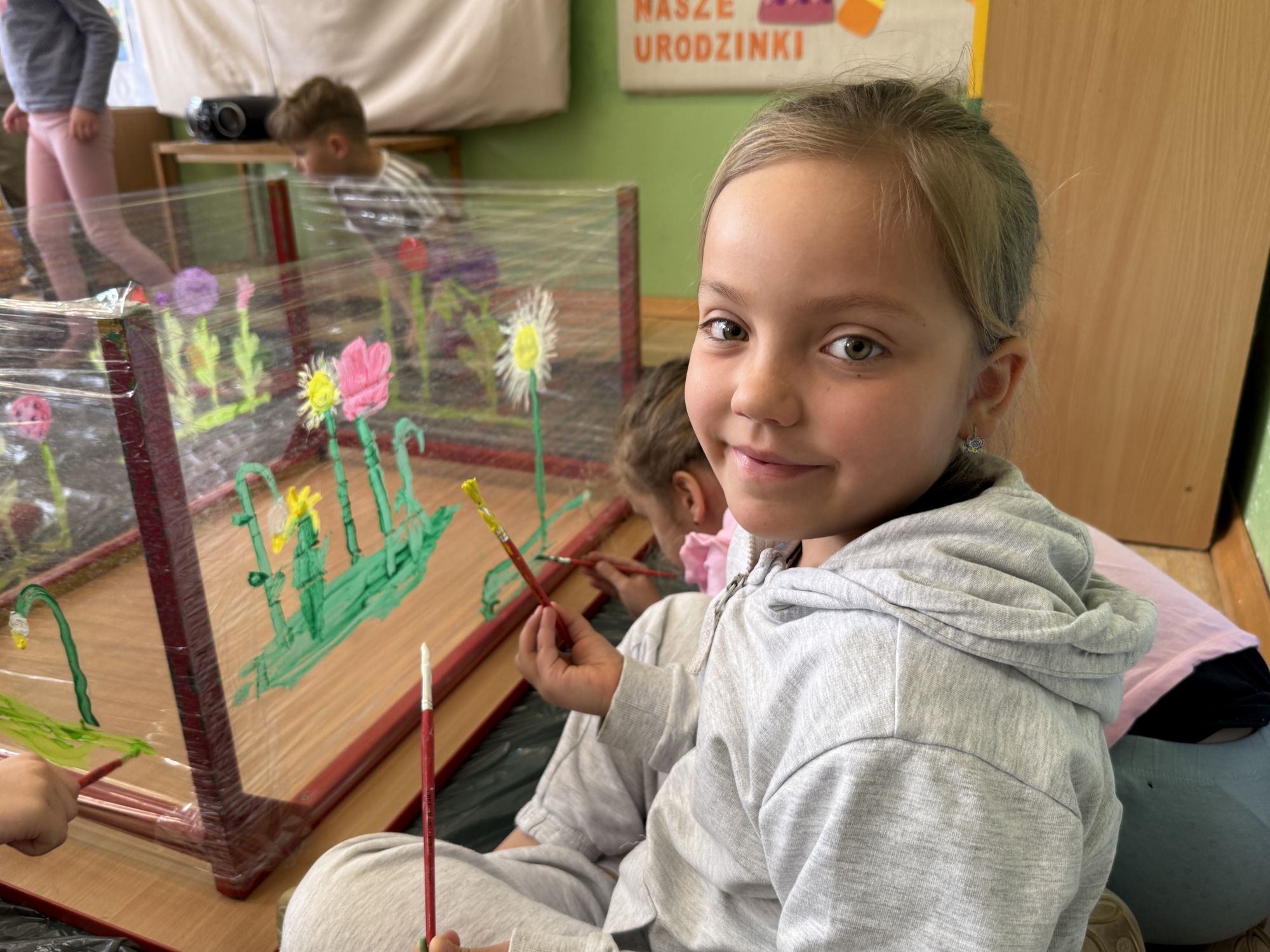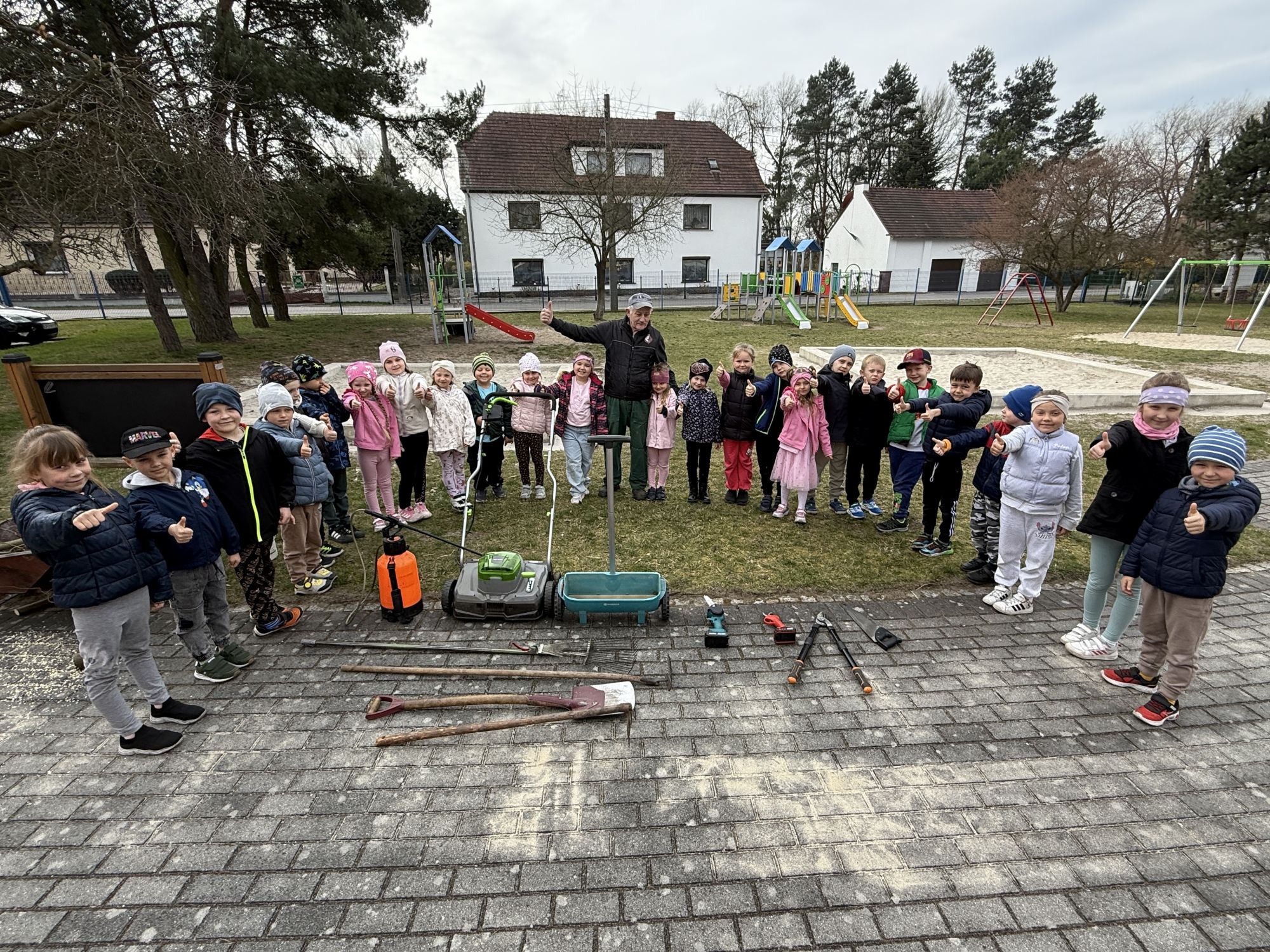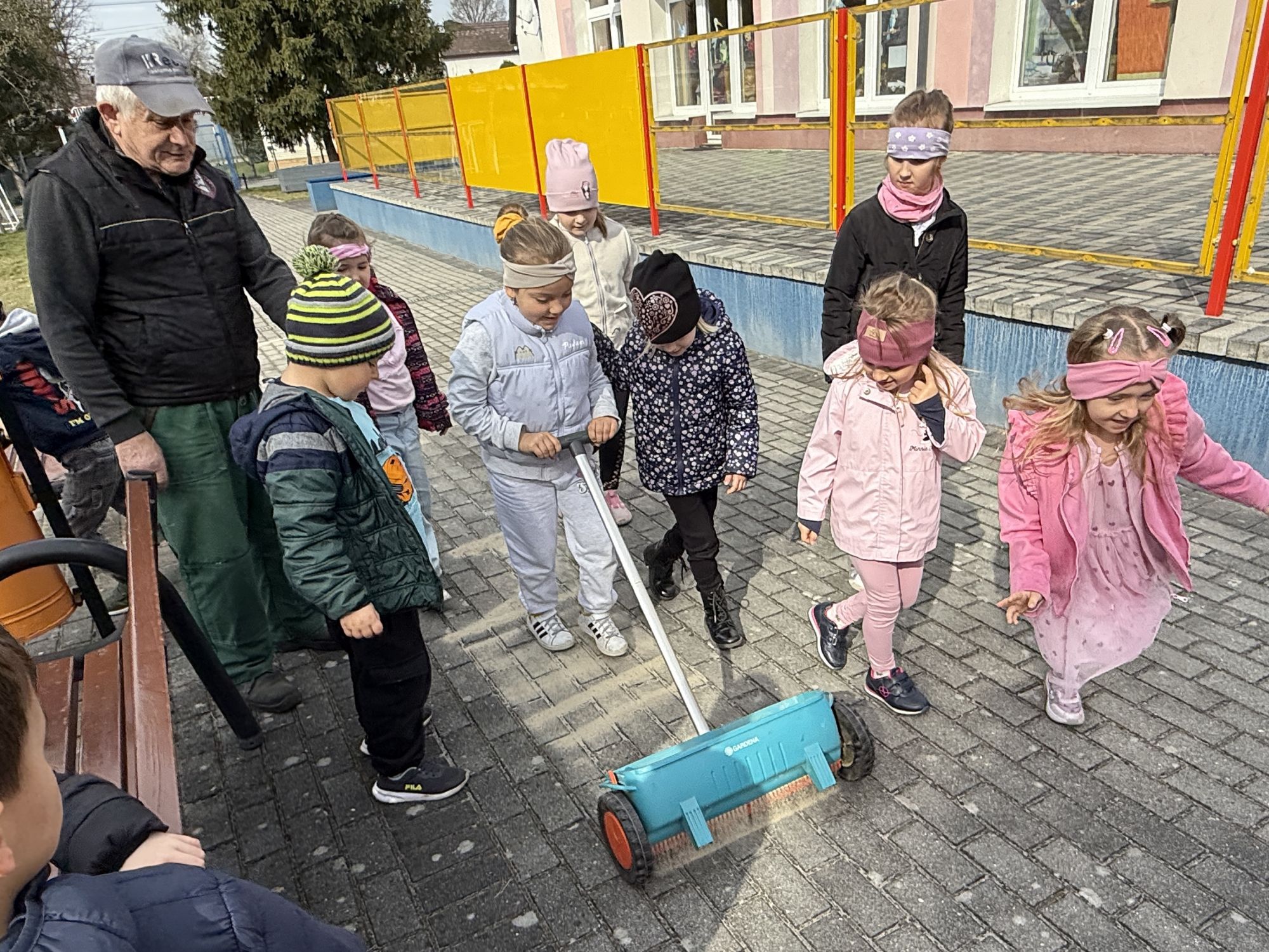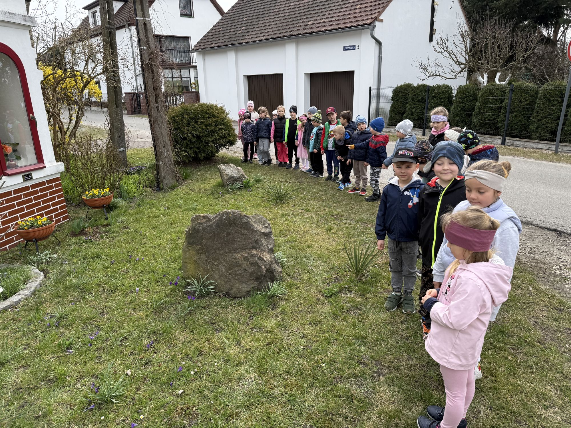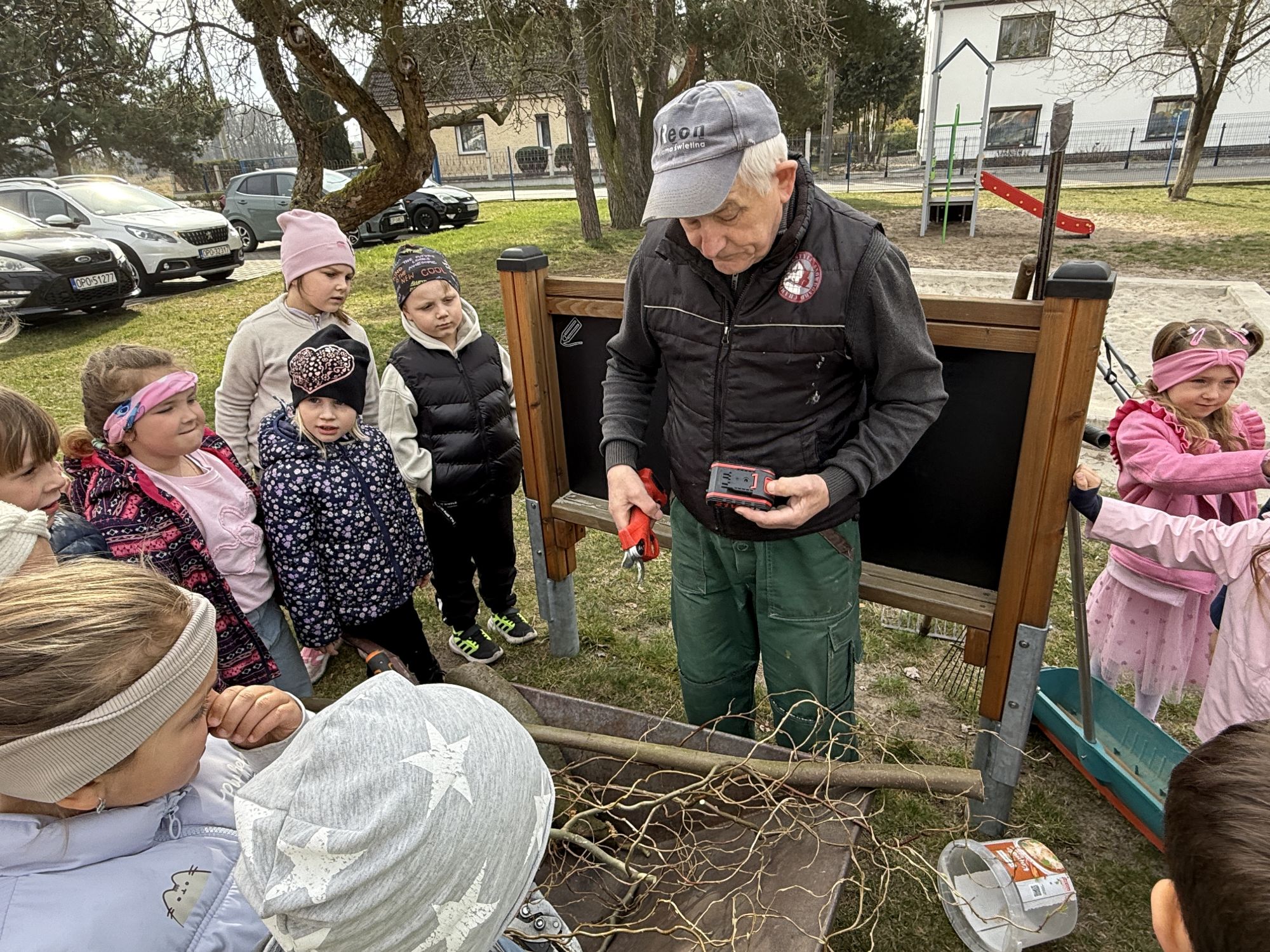 W czwartym tygodniu marca, w grupie starszej zagościła długo wyczekiwana wiosna. Dzieci z ogromnym zaciekawieniem odkrywały jej pierwsze oznaki. Rozmawiały o zmianach zachodzących w przyrodzie, poznawały wiosenne kwiaty oraz dowiadywały się, jakie prace wykonuje się w ogrodzie o tej porze roku. Szczególną radość sprawiło przedszkolakom założenie własnego ogródka w sali. Na stoliku, wspólnie z nauczycielem, zgromadziły wszystkie potrzebne rzeczy – pojemniki, słoiki, łopatki, nasiona i cebulki. Zanim jednak rozpoczęły pracę, z dużym zainteresowaniem oglądały nasionka, przyglądały się ich kształtom i kolorom, dzieląc się swoimi spostrzeżeniami. Dowiedziały się również, czym różni się sianie od sadzenia oraz poznały kolejne etapy wzrostu roślin – od momentu umieszczenia cebulki w glebie aż po jej stopniowy rozwój. Gdy wszystko było już gotowe, dzieci z wielkim zaangażowaniem przystąpiły do działania. Z radością siały rzeżuchę i owies, sadziły cebulkę, a także założyły hodowlę fasoli, układając nasiona na wilgotnej gazie w słoiku z wodą. Na zakończenie ustaliły dyżury, dzięki którym będą mogły troszczyć się o swoje rośliny każdego dnia. Nie zabrakło również rozmów o pięknych, wiosennych kwiatach. Na stole pojawiły się hiacynty, bratki, żonkile, prymulki oraz stokrotki. Dzieci z zachwytem je oglądały, opisywały ich wygląd i zapach, poznawały ich nazwy oraz budowę. Dowiedziały się także, czego rośliny potrzebują, aby rosnąć i pięknie kwitnąć. Kolejnego dnia starszaki wybrały się do przedszkolnego ogrodu, gdzie spotkały się z panem Witkiem, który z troską dba o otoczenie przedszkola. Wychowankowie z zainteresowaniem słuchały opowieści o wiosennych pracach ogrodowych oraz oglądały narzędzia i sprzęt do pielęgnacji terenu. Z bliska mogły zobaczyć m.in. sekator, łopatę, motykę, nożyce, grabie, rozsiewacz do nawozu lub nasion, a także wertykulator do trawnika. Następnie wybrały się na spacer wokół przedszkola, poszukując pierwszych wiosennych kwiatów. Na zakończenie dzieci wyraziły swoją radość poprzez twórczość plastyczną, malując farbami kolorowe kwiaty na folii stretch. Powstały piękne, barwne prace, które stały się kolorową ozdobą sali. Był to czas pełen radości, odkrywania i wspólnego działania. Takie zajęcia uczą najmłodszych cierpliwości, odpowiedzialności oraz uważnej obserwacji świata przyrody, rozwijając jednocześnie ich ciekawość i wrażliwość.