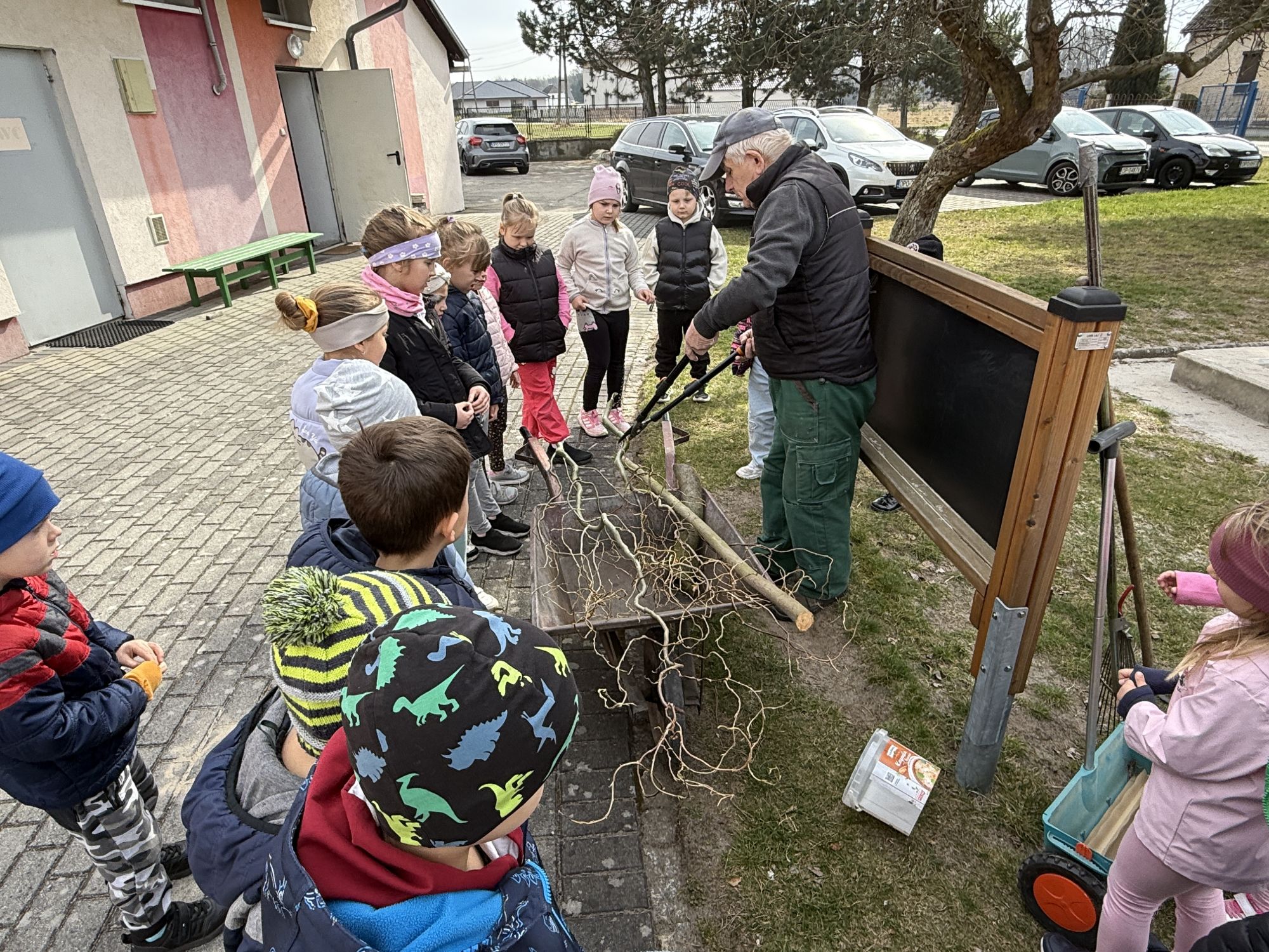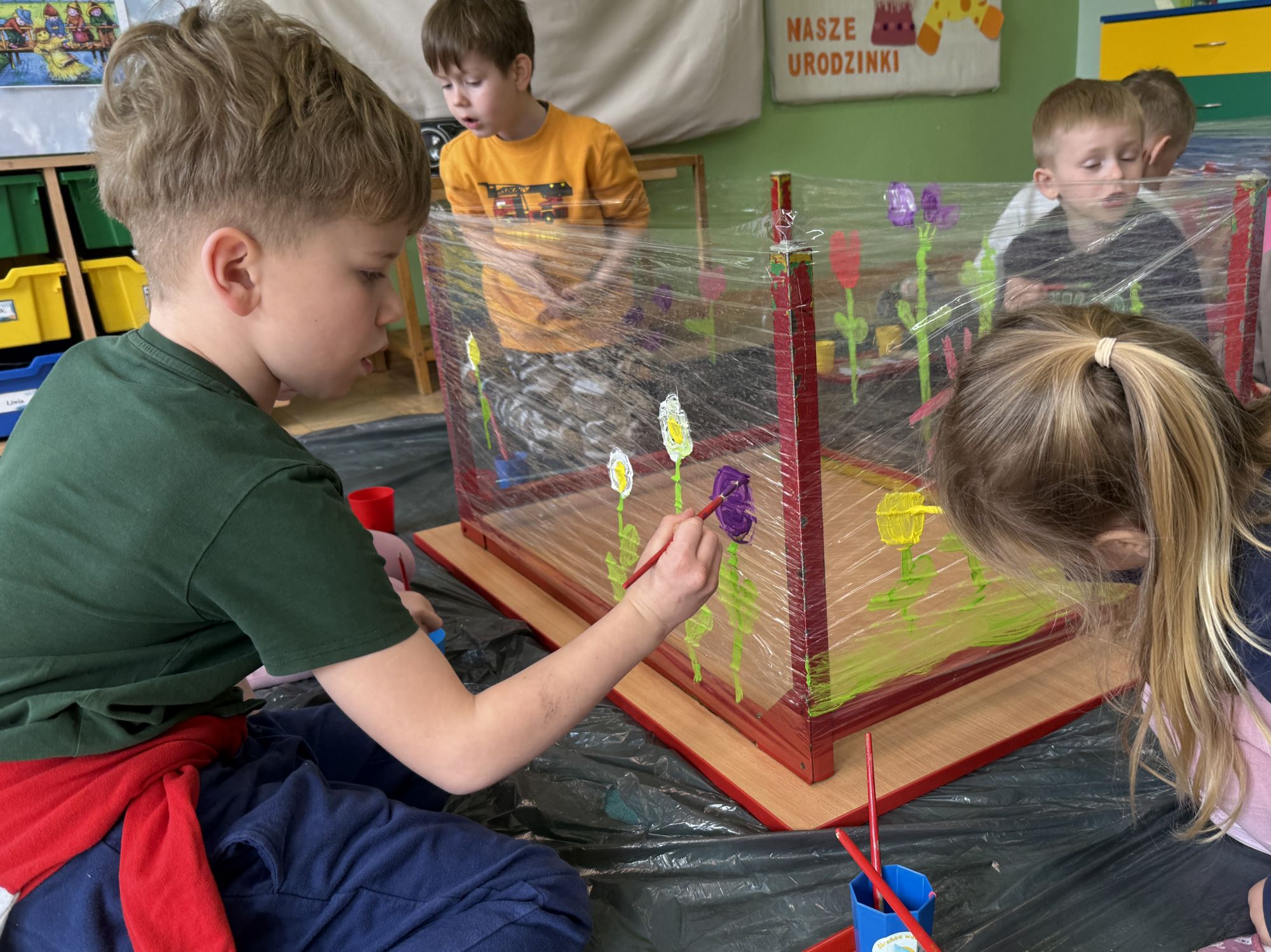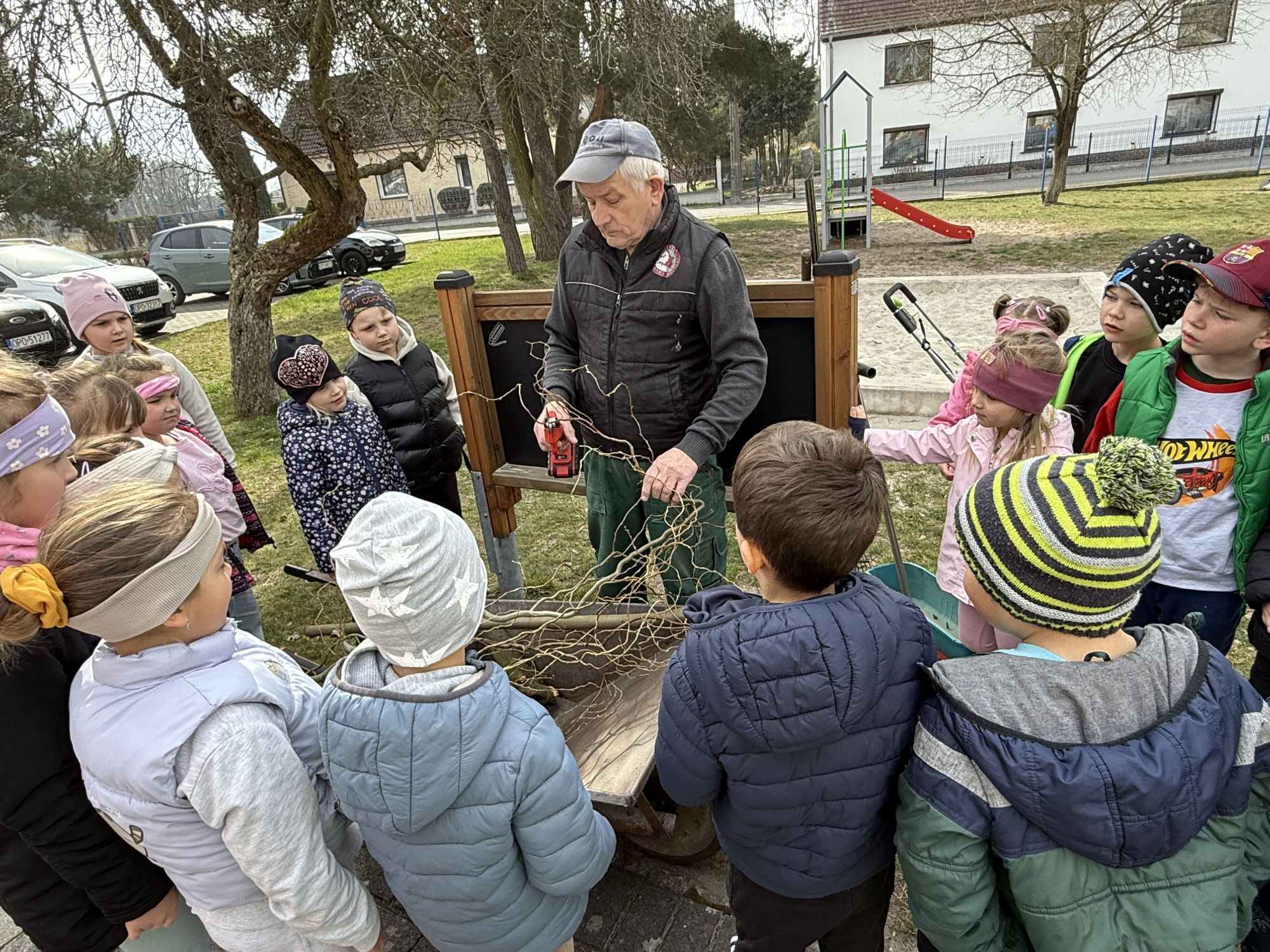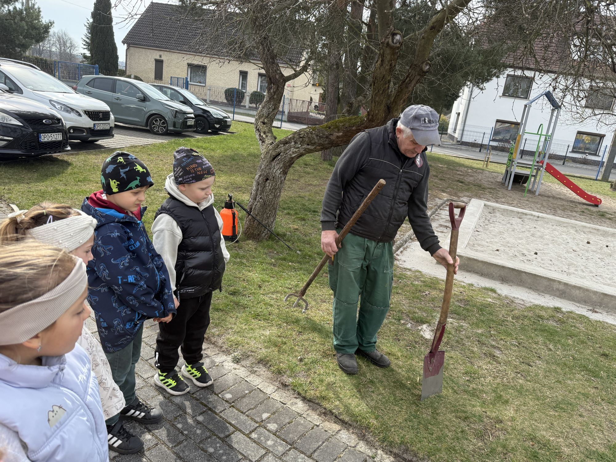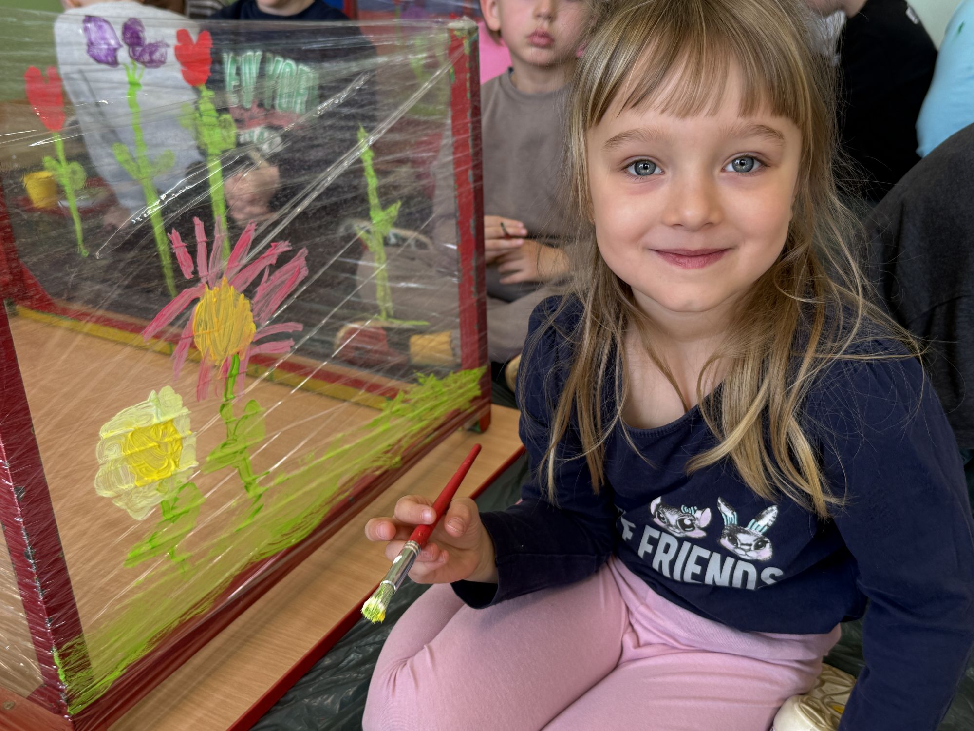 W czwartym tygodniu marca, w grupie starszej zagościła długo wyczekiwana wiosna. Dzieci z ogromnym zaciekawieniem odkrywały jej pierwsze oznaki. Rozmawiały o zmianach zachodzących w przyrodzie, poznawały wiosenne kwiaty oraz dowiadywały się, jakie prace wykonuje się w ogrodzie o tej porze roku. Szczególną radość sprawiło przedszkolakom założenie własnego ogródka w sali. Na stoliku, wspólnie z nauczycielem, zgromadziły wszystkie potrzebne rzeczy – pojemniki, słoiki, łopatki, nasiona i cebulki. Zanim jednak rozpoczęły pracę, z dużym zainteresowaniem oglądały nasionka, przyglądały się ich kształtom i kolorom, dzieląc się swoimi spostrzeżeniami. Dowiedziały się również, czym różni się sianie od sadzenia oraz poznały kolejne etapy wzrostu roślin – od momentu umieszczenia cebulki w glebie aż po jej stopniowy rozwój. Gdy wszystko było już gotowe, dzieci z wielkim zaangażowaniem przystąpiły do działania. Z radością siały rzeżuchę i owies, sadziły cebulkę, a także założyły hodowlę fasoli, układając nasiona na wilgotnej gazie w słoiku z wodą. Na zakończenie ustaliły dyżury, dzięki którym będą mogły troszczyć się o swoje rośliny każdego dnia. Nie zabrakło również rozmów o pięknych, wiosennych kwiatach. Na stole pojawiły się hiacynty, bratki, żonkile, prymulki oraz stokrotki. Dzieci z zachwytem je oglądały, opisywały ich wygląd i zapach, poznawały ich nazwy oraz budowę. Dowiedziały się także, czego rośliny potrzebują, aby rosnąć i pięknie kwitnąć. Kolejnego dnia starszaki wybrały się do przedszkolnego ogrodu, gdzie spotkały się z panem Witkiem, który z troską dba o otoczenie przedszkola. Wychowankowie z zainteresowaniem słuchały opowieści o wiosennych pracach ogrodowych oraz oglądały narzędzia i sprzęt do pielęgnacji terenu. Z bliska mogły zobaczyć m.in. sekator, łopatę, motykę, nożyce, grabie, rozsiewacz do nawozu lub nasion, a także wertykulator do trawnika. Następnie wybrały się na spacer wokół przedszkola, poszukując pierwszych wiosennych kwiatów. Na zakończenie dzieci wyraziły swoją radość poprzez twórczość plastyczną, malując farbami kolorowe kwiaty na folii stretch. Powstały piękne, barwne prace, które stały się kolorową ozdobą sali. Był to czas pełen radości, odkrywania i wspólnego działania. Takie zajęcia uczą najmłodszych cierpliwości, odpowiedzialności oraz uważnej obserwacji świata przyrody, rozwijając jednocześnie ich ciekawość i wrażliwość.