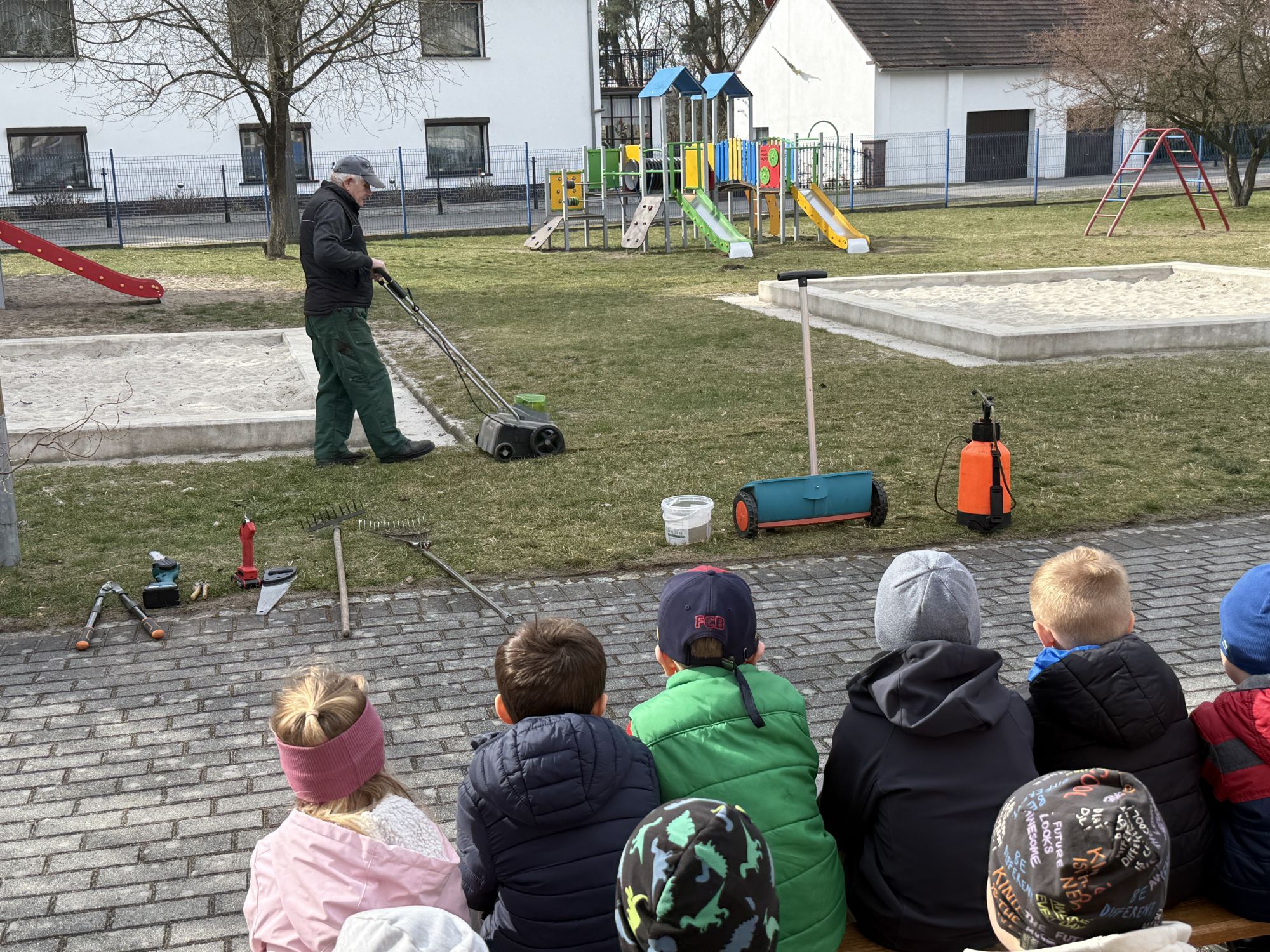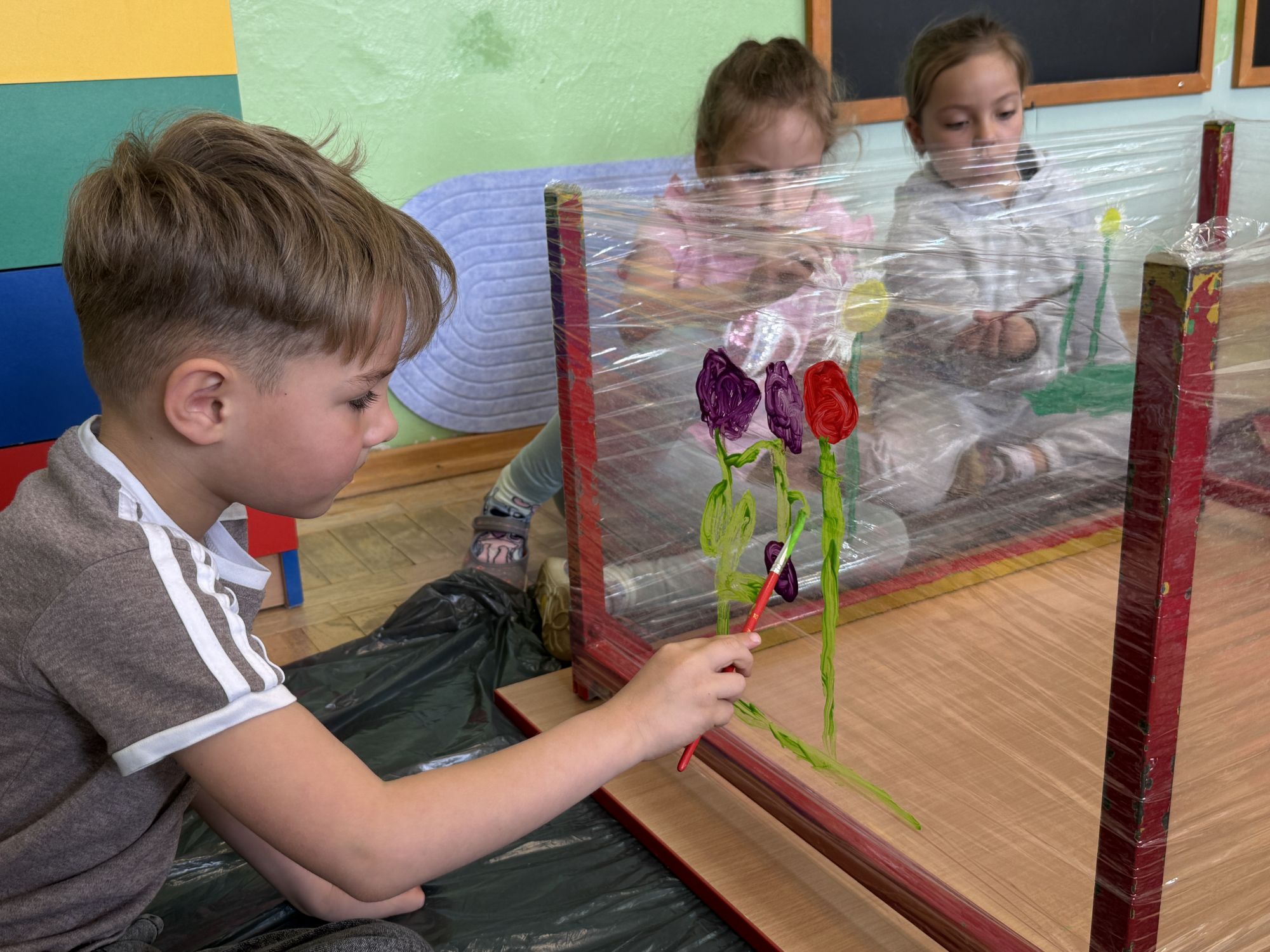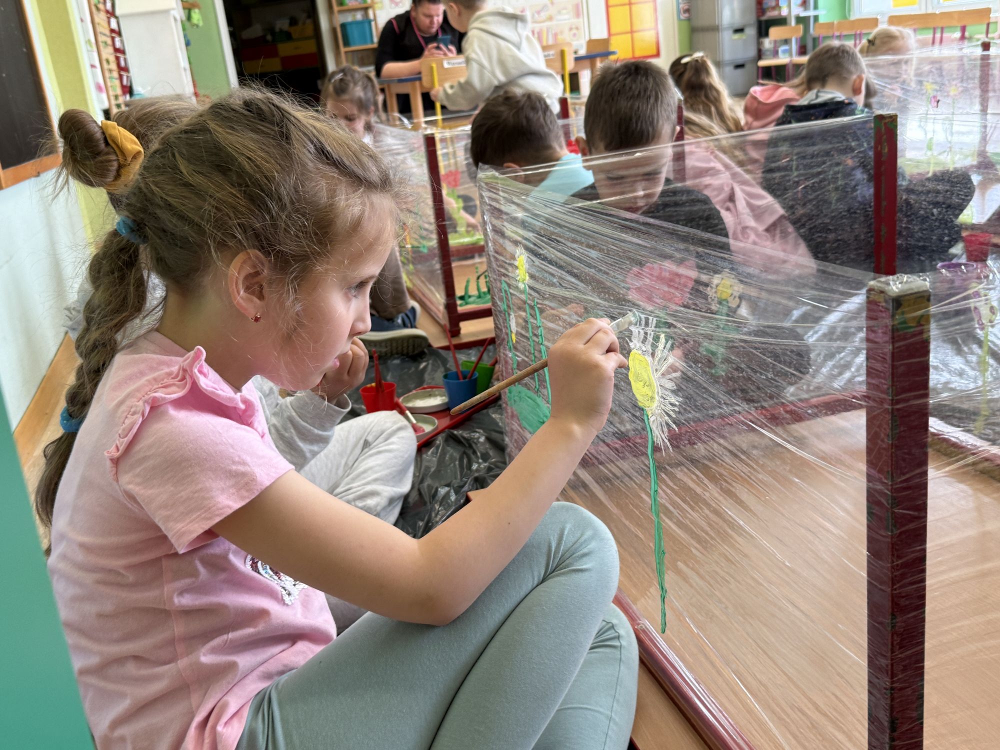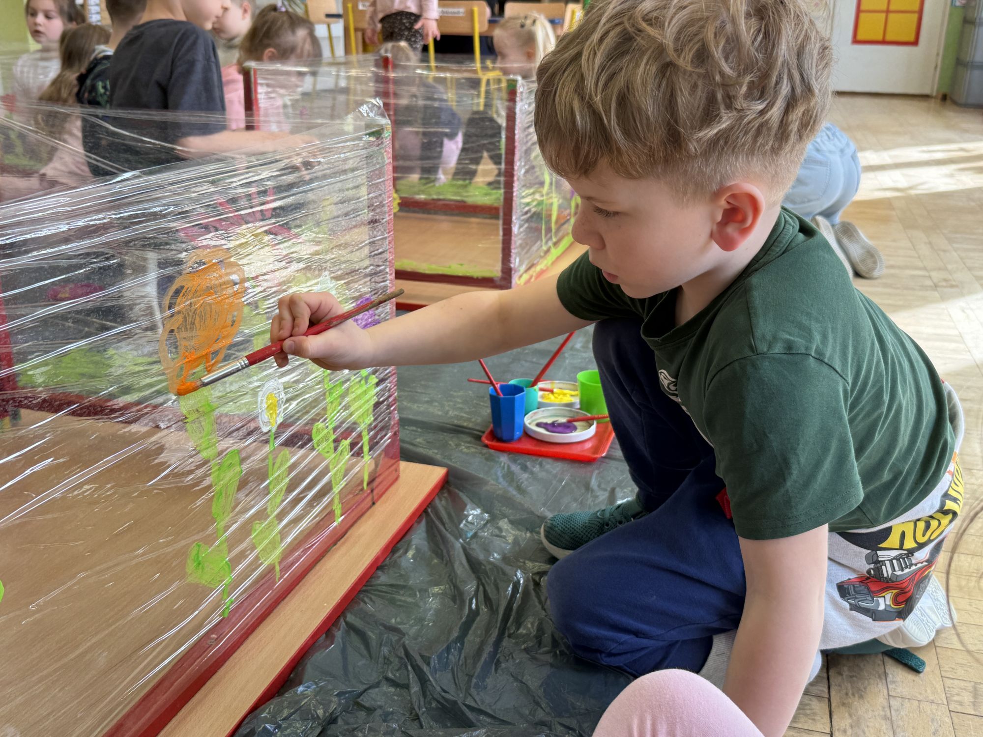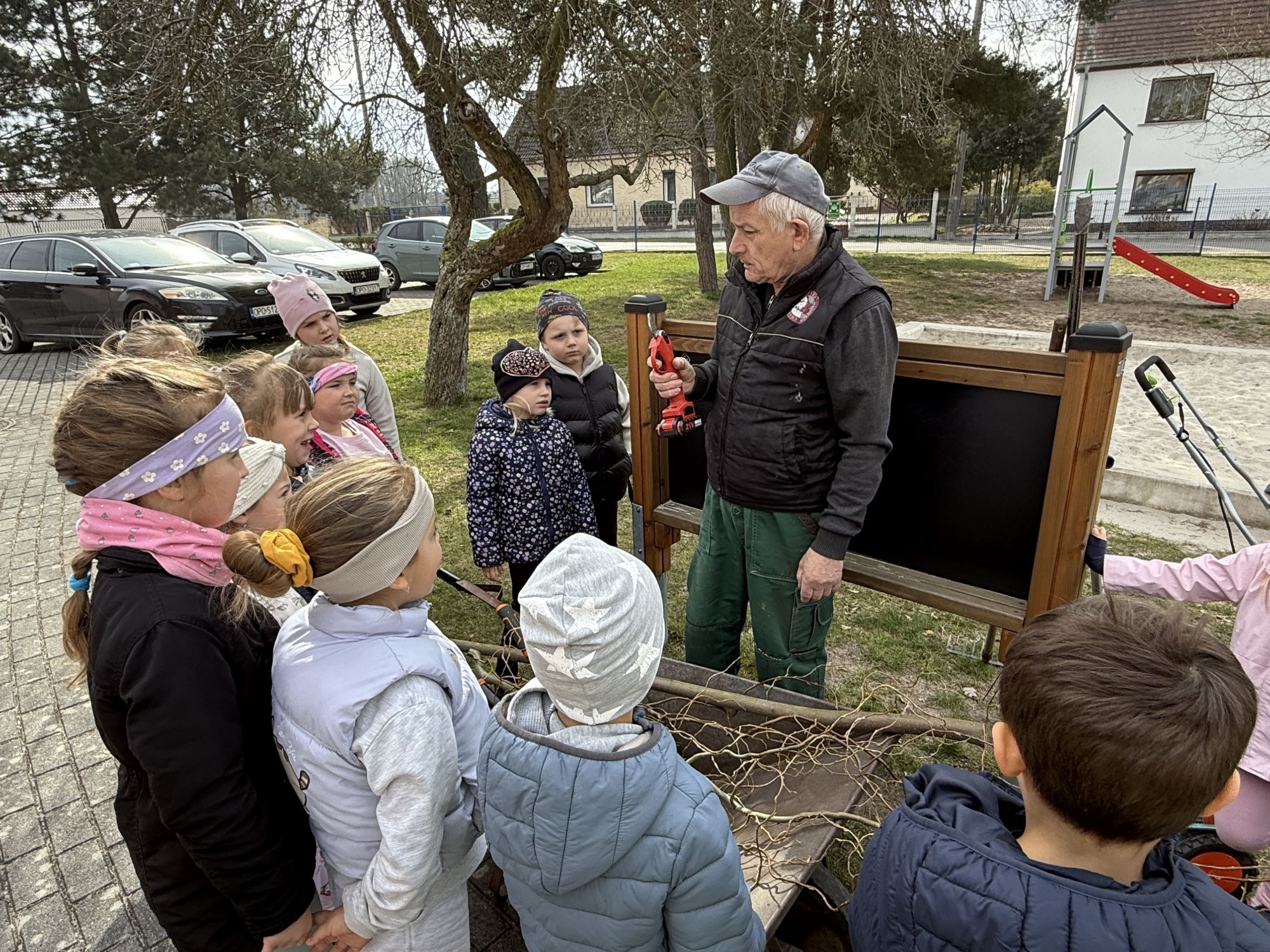 W czwartym tygodniu marca, w grupie starszej zagościła długo wyczekiwana wiosna. Dzieci z ogromnym zaciekawieniem odkrywały jej pierwsze oznaki. Rozmawiały o zmianach zachodzących w przyrodzie, poznawały wiosenne kwiaty oraz dowiadywały się, jakie prace wykonuje się w ogrodzie o tej porze roku. Szczególną radość sprawiło przedszkolakom założenie własnego ogródka w sali. Na stoliku, wspólnie z nauczycielem, zgromadziły wszystkie potrzebne rzeczy – pojemniki, słoiki, łopatki, nasiona i cebulki. Zanim jednak rozpoczęły pracę, z dużym zainteresowaniem oglądały nasionka, przyglądały się ich kształtom i kolorom, dzieląc się swoimi spostrzeżeniami. Dowiedziały się również, czym różni się sianie od sadzenia oraz poznały kolejne etapy wzrostu roślin – od momentu umieszczenia cebulki w glebie aż po jej stopniowy rozwój. Gdy wszystko było już gotowe, dzieci z wielkim zaangażowaniem przystąpiły do działania. Z radością siały rzeżuchę i owies, sadziły cebulkę, a także założyły hodowlę fasoli, układając nasiona na wilgotnej gazie w słoiku z wodą. Na zakończenie ustaliły dyżury, dzięki którym będą mogły troszczyć się o swoje rośliny każdego dnia. Nie zabrakło również rozmów o pięknych, wiosennych kwiatach. Na stole pojawiły się hiacynty, bratki, żonkile, prymulki oraz stokrotki. Dzieci z zachwytem je oglądały, opisywały ich wygląd i zapach, poznawały ich nazwy oraz budowę. Dowiedziały się także, czego rośliny potrzebują, aby rosnąć i pięknie kwitnąć. Kolejnego dnia starszaki wybrały się do przedszkolnego ogrodu, gdzie spotkały się z panem Witkiem, który z troską dba o otoczenie przedszkola. Wychowankowie z zainteresowaniem słuchały opowieści o wiosennych pracach ogrodowych oraz oglądały narzędzia i sprzęt do pielęgnacji terenu. Z bliska mogły zobaczyć m.in. sekator, łopatę, motykę, nożyce, grabie, rozsiewacz do nawozu lub nasion, a także wertykulator do trawnika. Następnie wybrały się na spacer wokół przedszkola, poszukując pierwszych wiosennych kwiatów. Na zakończenie dzieci wyraziły swoją radość poprzez twórczość plastyczną, malując farbami kolorowe kwiaty na folii stretch. Powstały piękne, barwne prace, które stały się kolorową ozdobą sali. Był to czas pełen radości, odkrywania i wspólnego działania. Takie zajęcia uczą najmłodszych cierpliwości, odpowiedzialności oraz uważnej obserwacji świata przyrody, rozwijając jednocześnie ich ciekawość i wrażliwość.