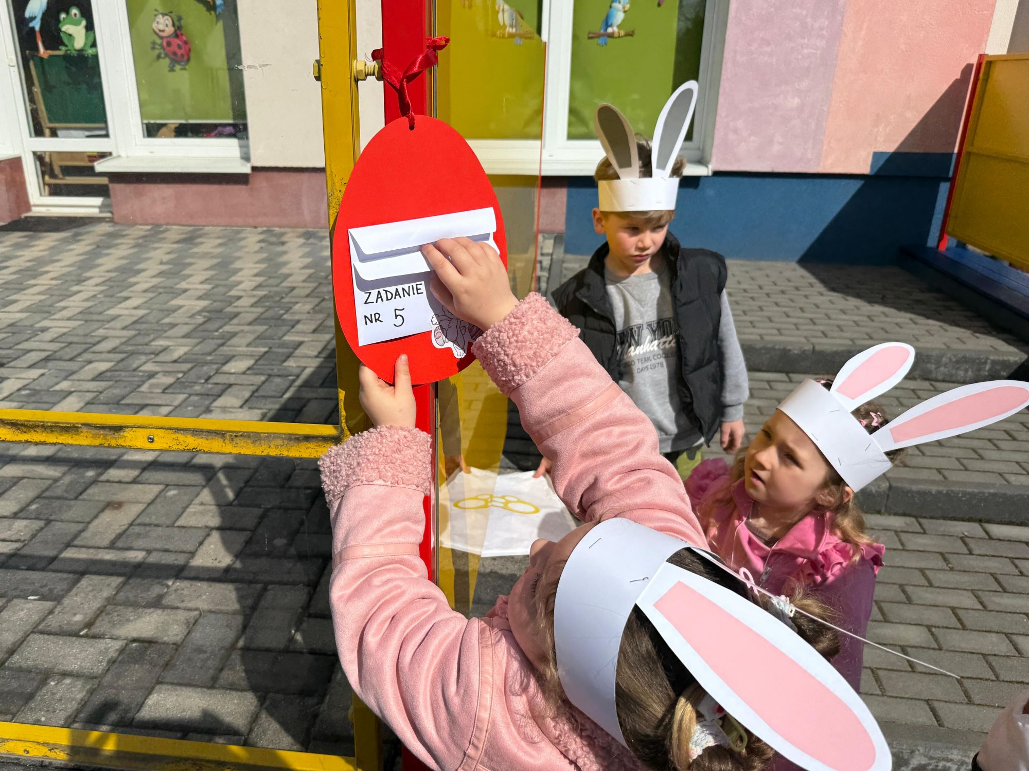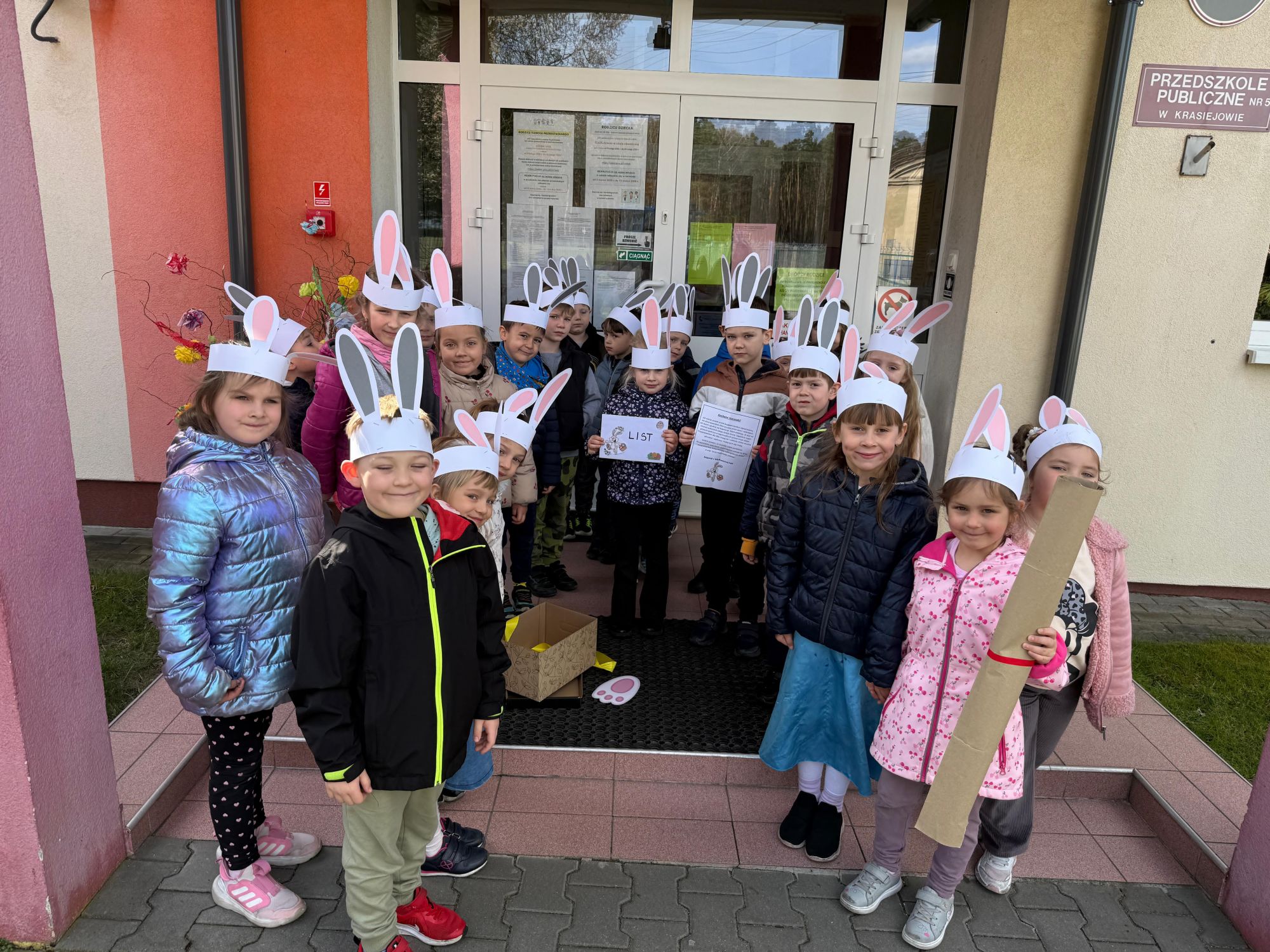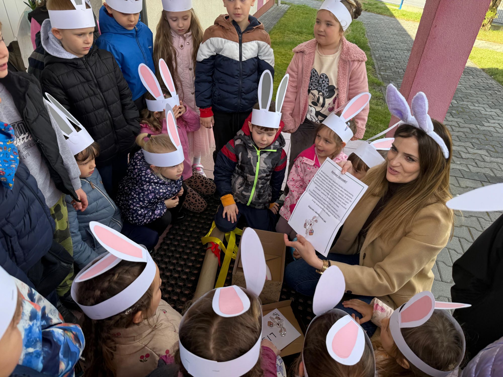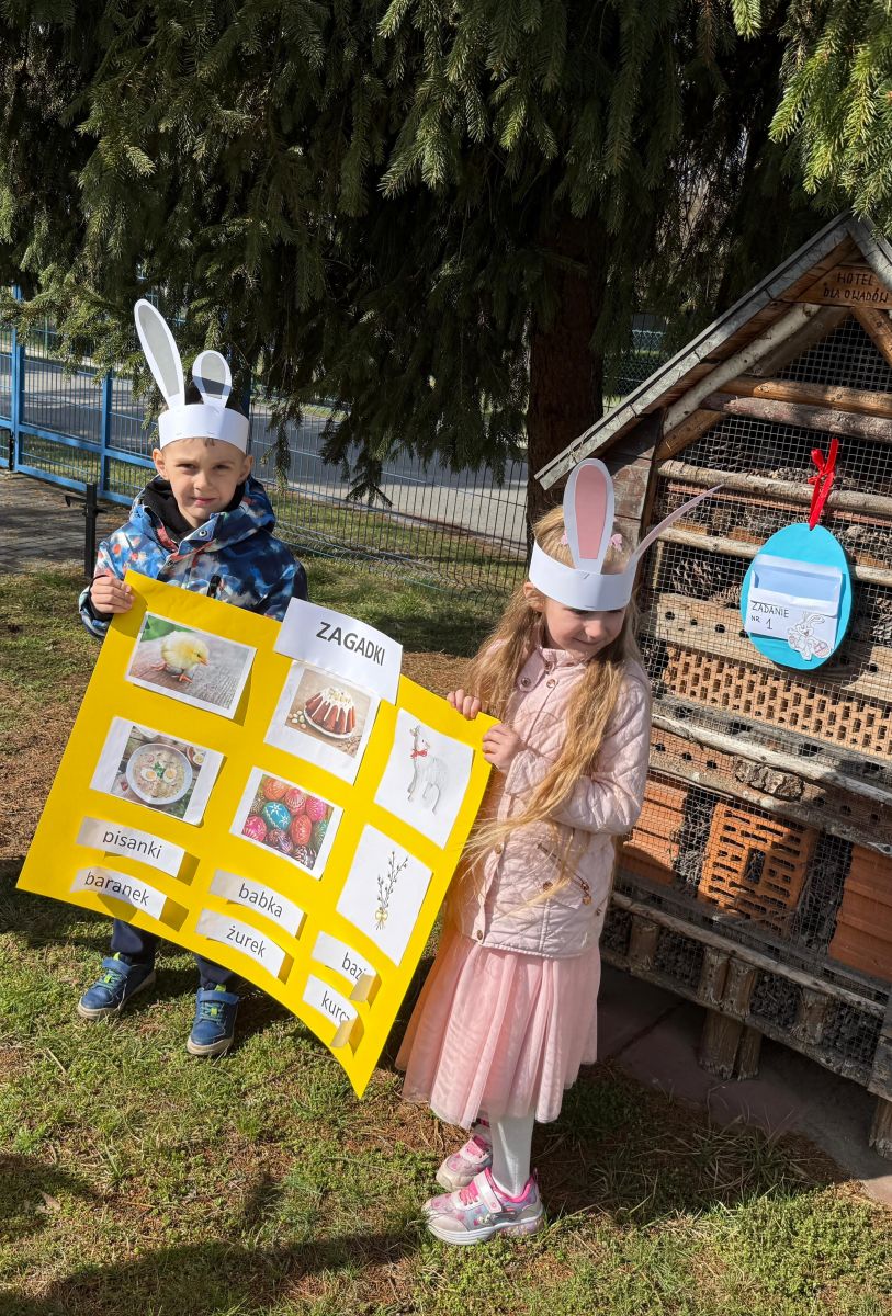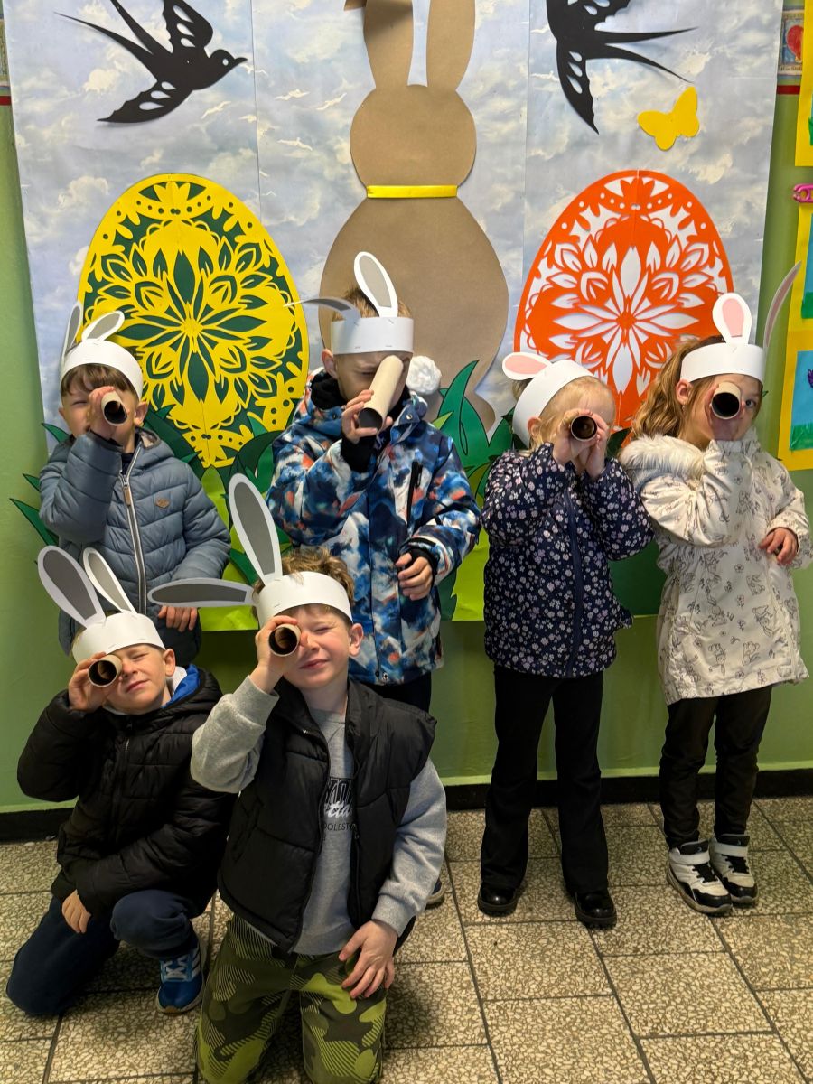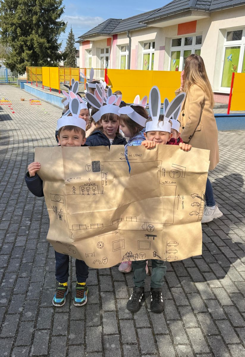 Każdego roku, tuż przed Świętami Wielkanocnymi, starszaków odwiedza wyjątkowy gość – Zajączek Wielkanocny. W tym roku, 1 kwietnia, dzieci już od samego rana z niecierpliwością wypatrywały jego przyjścia. Zaglądały przez okna i zastanawiały się, kiedy się pojawi. Po drugim śniadaniu ubrały się i założyły opaski z uszami zajączka, aby jeszcze lepiej poczuć wielkanocny nastrój. Chwilę później wyszły przed budynek przedszkola, gdzie czekała na nie niespodzianka – pięknie udekorowane wstążką pudełko oraz tajemnicza mapa. Po otwarciu pudełka przedszkolaki znalazły list, który odczytały wspólnie z panią Eweliną. Następnie rozłożyły mapę wskazującą trasę poszukiwania upominków i zgodnie z jej wskazówkami wyruszyły w drogę. Podczas wyprawy odnajdywały kolejne koperty pozostawione przez Zajączka. Z ogromnym zaangażowaniem wykonywały ukryte w nich zadania. Rozwiązywały zagadki, układały puzzle, pokonywały tory przeszkód, tworzyły wspólną pisankę z wykorzystaniem sznura, figur oraz przyborów gimnastycznych, takich jak szarfy czy woreczki. Uczestniczyły w zabawach matematycznych - przeliczały kropki na pisankach i dopasowywały do nich odpowiednie cyfry. Nie zabrakło także zabaw ruchowych, śpiewu piosenek oraz recytacji wierszy. Gdy dzieci dotarły do celu i odnalazły ostatni list, Zajączek postanowił zrobić im małego psikusa. Najpierw natrafiły na pusty koszyk z napisem „Prima Aprilis – szukajcie dalej!”. Ostatecznie udało się odnaleźć prawdziwy skarb – koszyk pełen słodkich upominków, który sprawił wszystkim ogromną radość. Poszukiwanie wskazówek okazało się doskonałą zabawą, która dostarczyła wszystkim wielu niezapomnianych wrażeń.