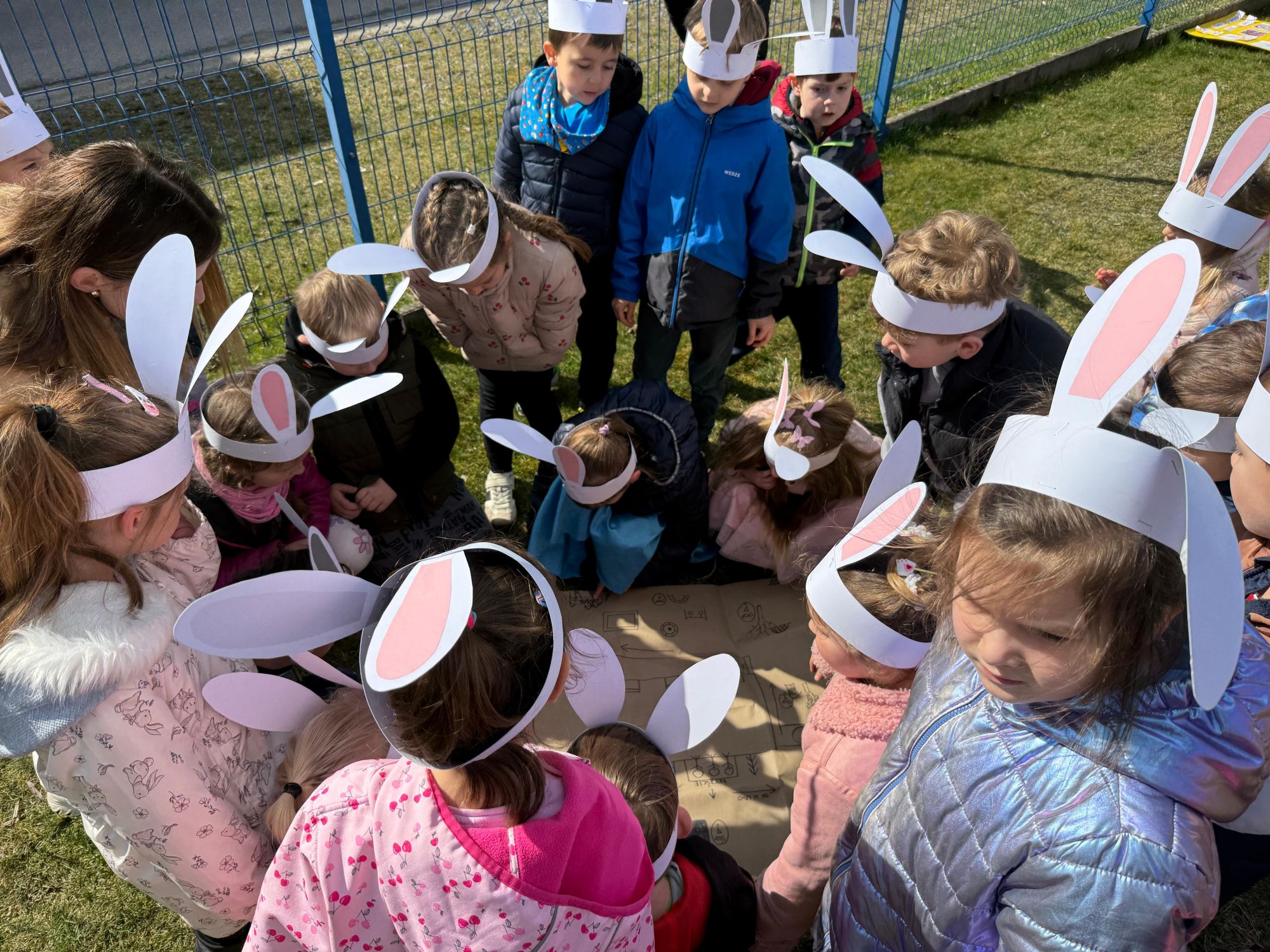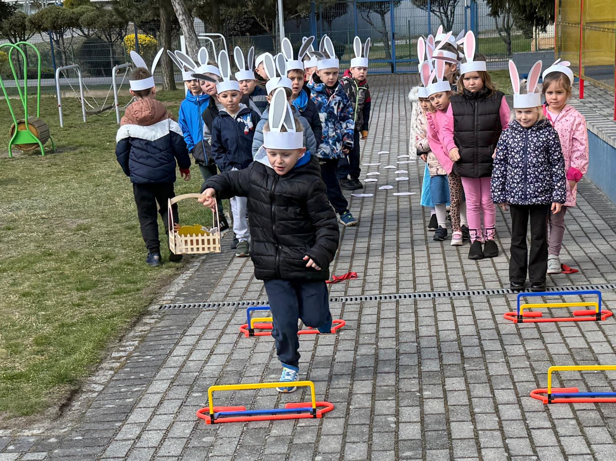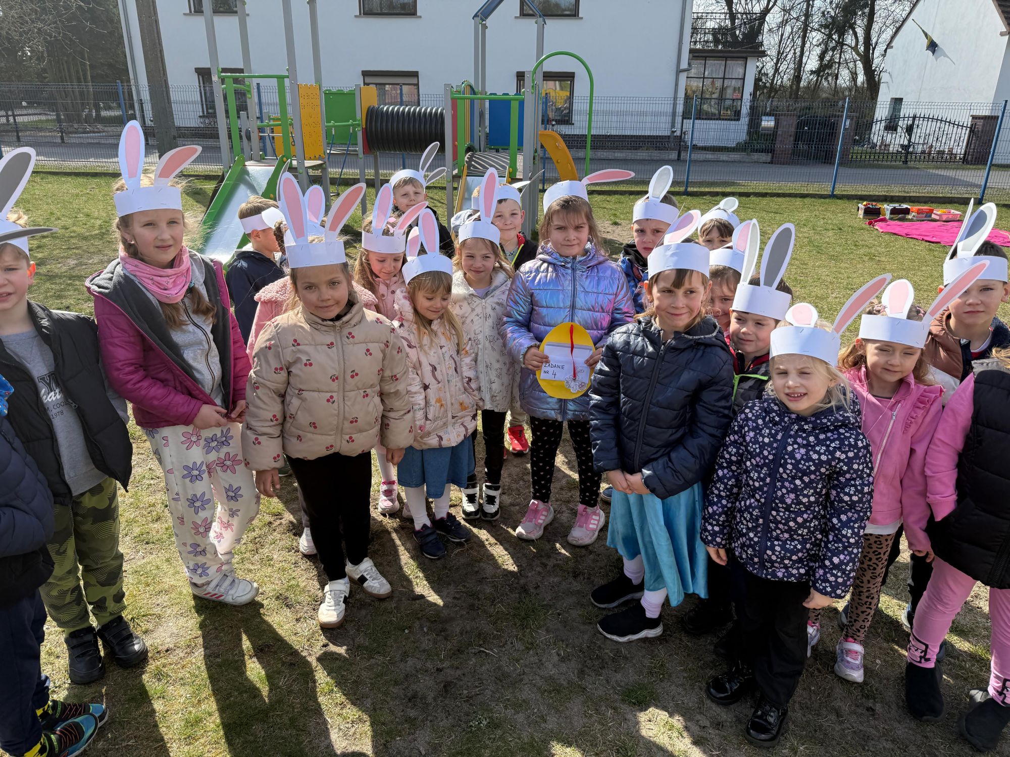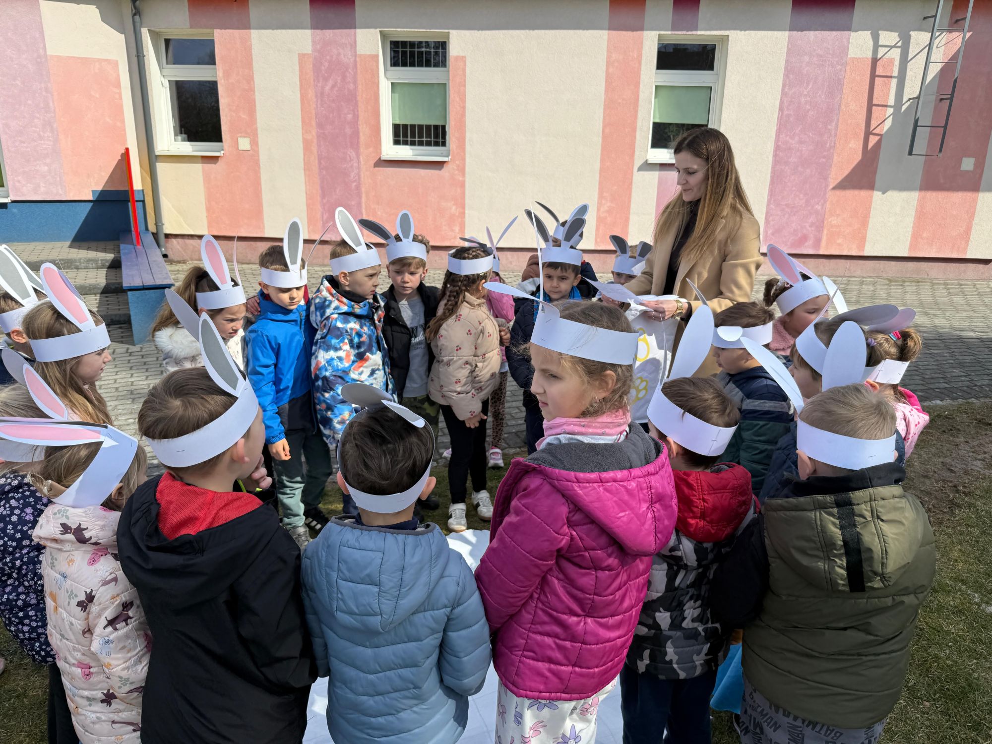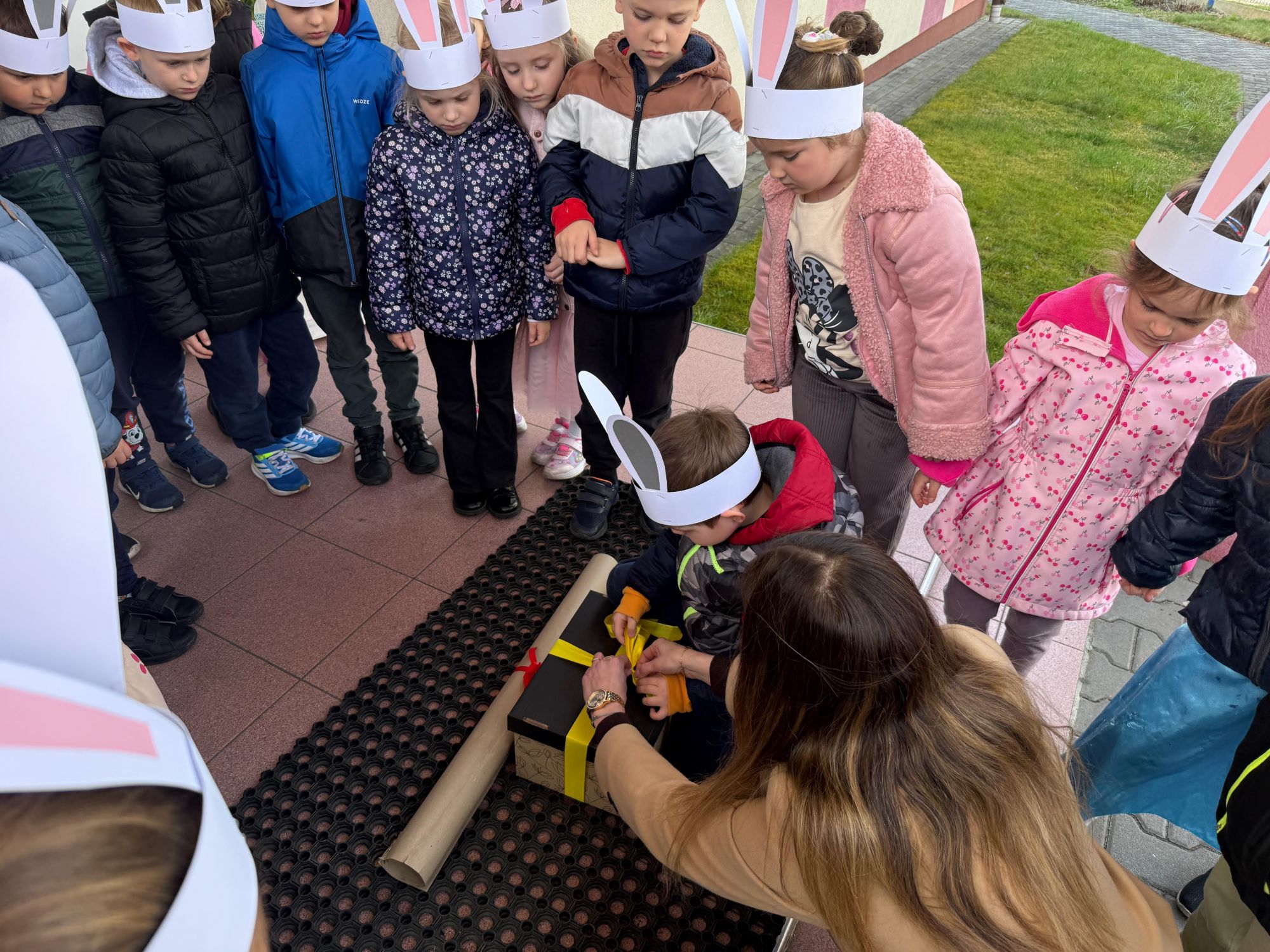 Każdego roku, tuż przed Świętami Wielkanocnymi, starszaków odwiedza wyjątkowy gość – Zajączek Wielkanocny. W tym roku, 1 kwietnia, dzieci już od samego rana z niecierpliwością wypatrywały jego przyjścia. Zaglądały przez okna i zastanawiały się, kiedy się pojawi. Po drugim śniadaniu ubrały się i założyły opaski z uszami zajączka, aby jeszcze lepiej poczuć wielkanocny nastrój. Chwilę później wyszły przed budynek przedszkola, gdzie czekała na nie niespodzianka – pięknie udekorowane wstążką pudełko oraz tajemnicza mapa. Po otwarciu pudełka przedszkolaki znalazły list, który odczytały wspólnie z panią Eweliną. Następnie rozłożyły mapę wskazującą trasę poszukiwania upominków i zgodnie z jej wskazówkami wyruszyły w drogę. Podczas wyprawy odnajdywały kolejne koperty pozostawione przez Zajączka. Z ogromnym zaangażowaniem wykonywały ukryte w nich zadania. Rozwiązywały zagadki, układały puzzle, pokonywały tory przeszkód, tworzyły wspólną pisankę z wykorzystaniem sznura, figur oraz przyborów gimnastycznych, takich jak szarfy czy woreczki. Uczestniczyły w zabawach matematycznych - przeliczały kropki na pisankach i dopasowywały do nich odpowiednie cyfry. Nie zabrakło także zabaw ruchowych, śpiewu piosenek oraz recytacji wierszy. Gdy dzieci dotarły do celu i odnalazły ostatni list, Zajączek postanowił zrobić im małego psikusa. Najpierw natrafiły na pusty koszyk z napisem „Prima Aprilis – szukajcie dalej!”. Ostatecznie udało się odnaleźć prawdziwy skarb – koszyk pełen słodkich upominków, który sprawił wszystkim ogromną radość. Poszukiwanie wskazówek okazało się doskonałą zabawą, która dostarczyła wszystkim wielu niezapomnianych wrażeń.
