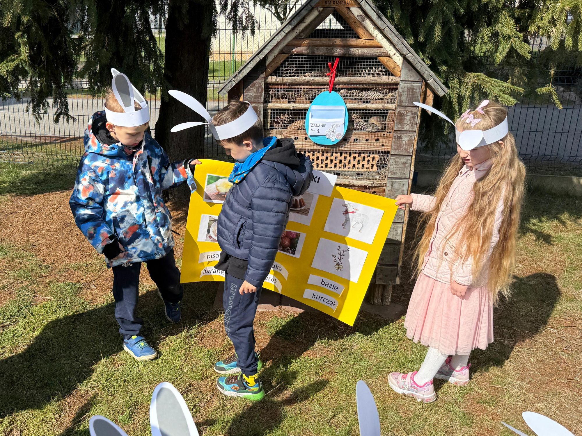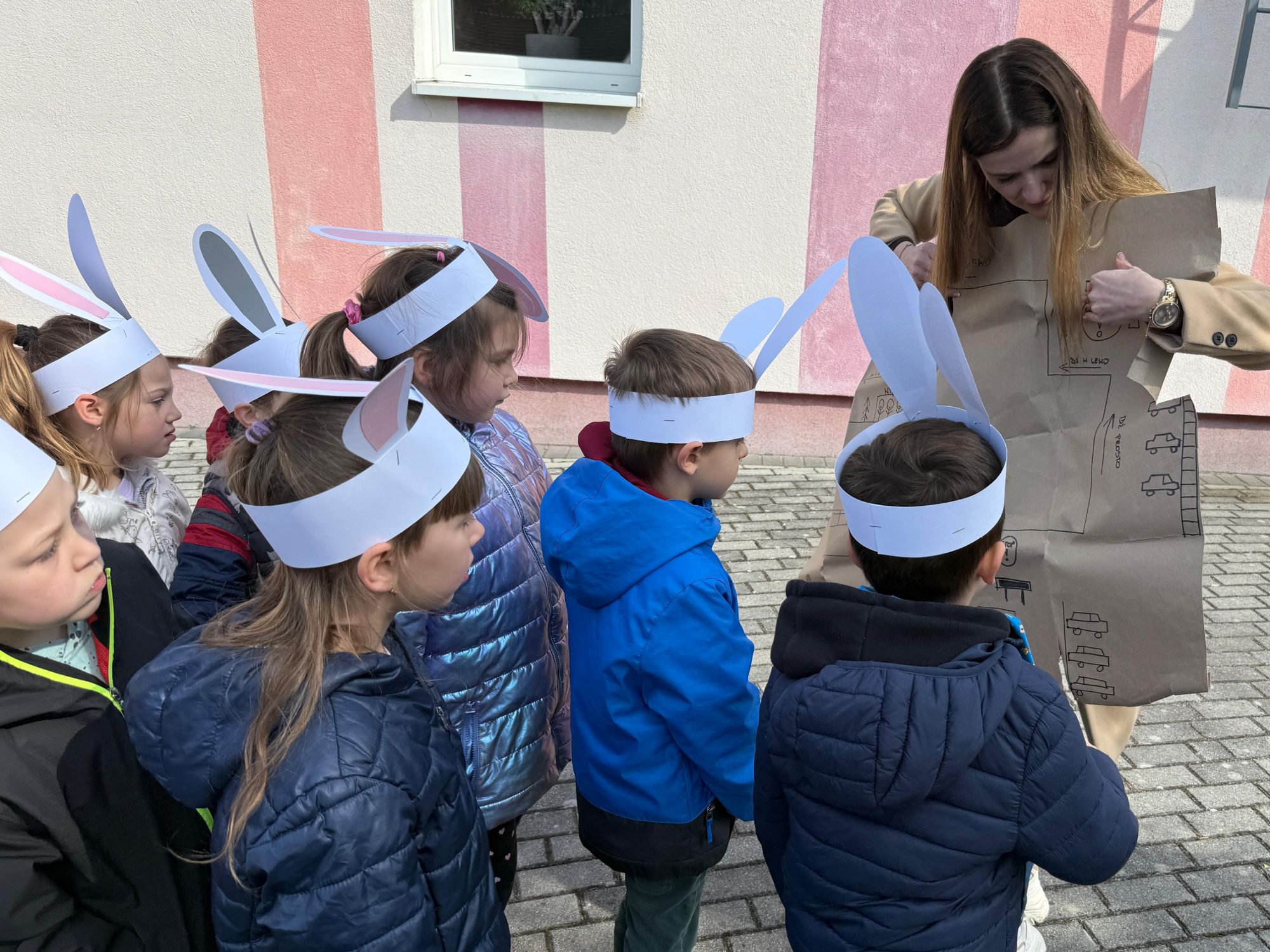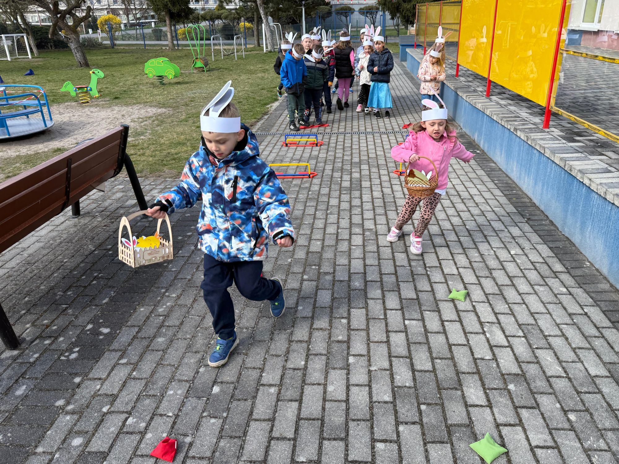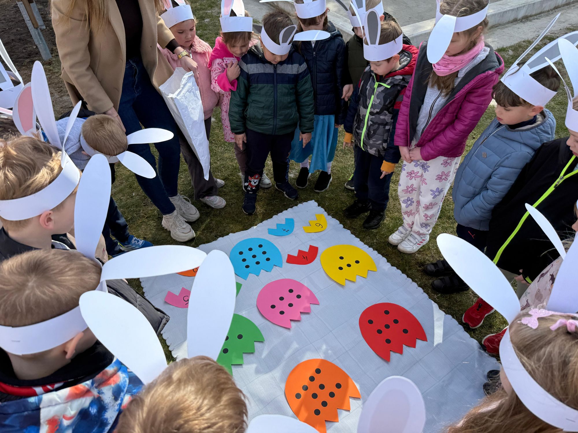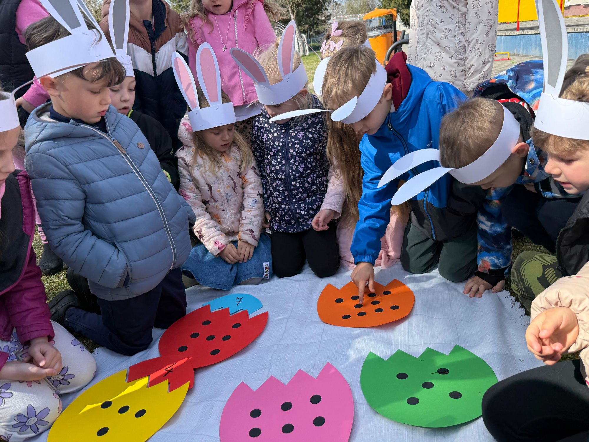 Każdego roku, tuż przed Świętami Wielkanocnymi, starszaków odwiedza wyjątkowy gość – Zajączek Wielkanocny. W tym roku, 1 kwietnia, dzieci już od samego rana z niecierpliwością wypatrywały jego przyjścia. Zaglądały przez okna i zastanawiały się, kiedy się pojawi. Po drugim śniadaniu ubrały się i założyły opaski z uszami zajączka, aby jeszcze lepiej poczuć wielkanocny nastrój. Chwilę później wyszły przed budynek przedszkola, gdzie czekała na nie niespodzianka – pięknie udekorowane wstążką pudełko oraz tajemnicza mapa. Po otwarciu pudełka przedszkolaki znalazły list, który odczytały wspólnie z panią Eweliną. Następnie rozłożyły mapę wskazującą trasę poszukiwania upominków i zgodnie z jej wskazówkami wyruszyły w drogę. Podczas wyprawy odnajdywały kolejne koperty pozostawione przez Zajączka. Z ogromnym zaangażowaniem wykonywały ukryte w nich zadania. Rozwiązywały zagadki, układały puzzle, pokonywały tory przeszkód, tworzyły wspólną pisankę z wykorzystaniem sznura, figur oraz przyborów gimnastycznych, takich jak szarfy czy woreczki. Uczestniczyły w zabawach matematycznych - przeliczały kropki na pisankach i dopasowywały do nich odpowiednie cyfry. Nie zabrakło także zabaw ruchowych, śpiewu piosenek oraz recytacji wierszy. Gdy dzieci dotarły do celu i odnalazły ostatni list, Zajączek postanowił zrobić im małego psikusa. Najpierw natrafiły na pusty koszyk z napisem „Prima Aprilis – szukajcie dalej!”. Ostatecznie udało się odnaleźć prawdziwy skarb – koszyk pełen słodkich upominków, który sprawił wszystkim ogromną radość. Poszukiwanie wskazówek okazało się doskonałą zabawą, która dostarczyła wszystkim wielu niezapomnianych wrażeń.