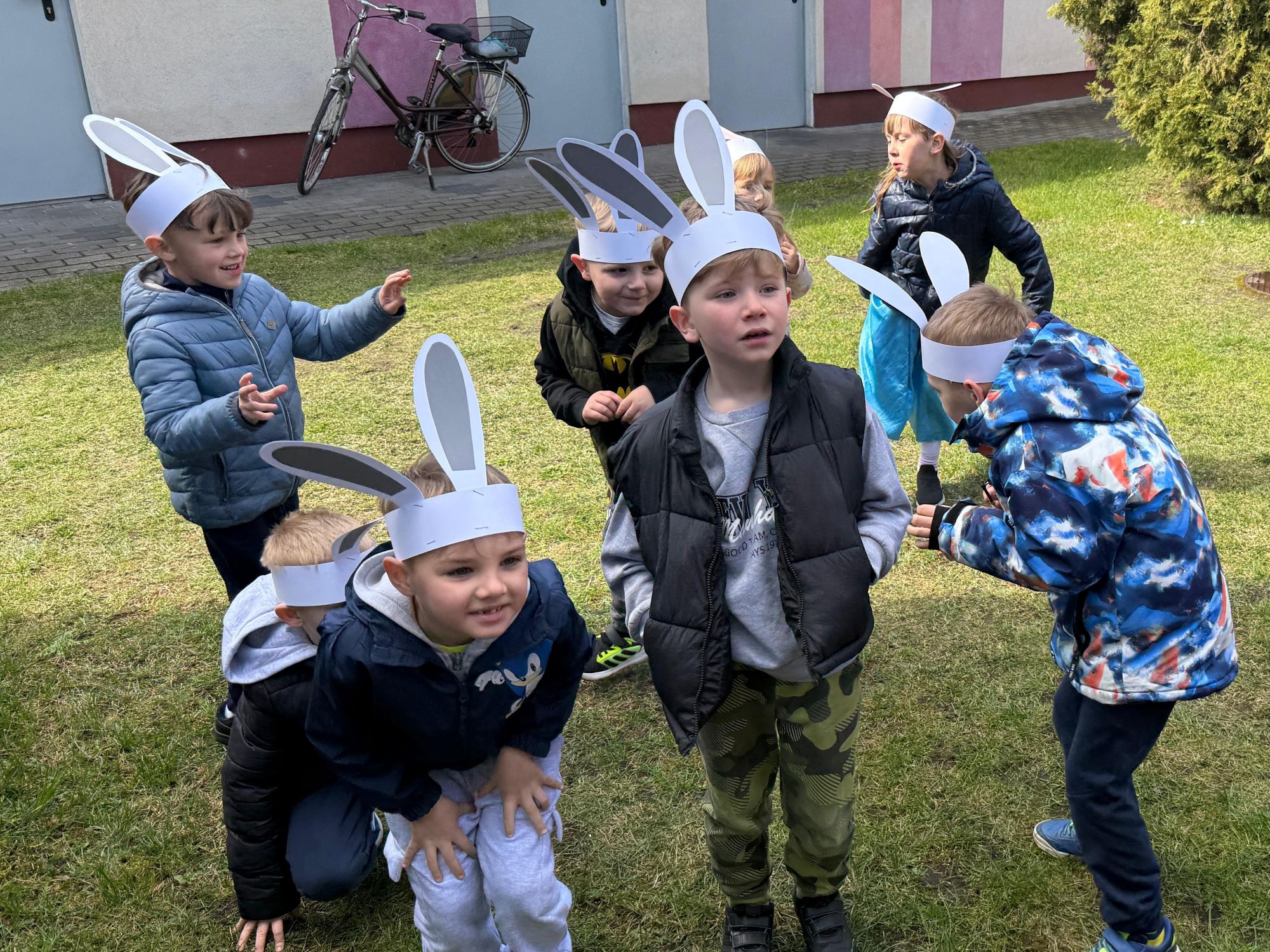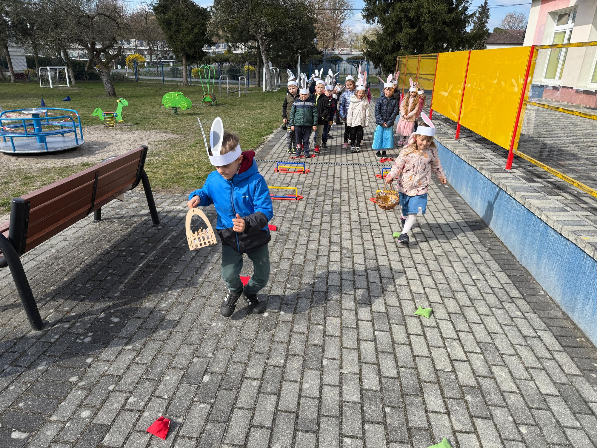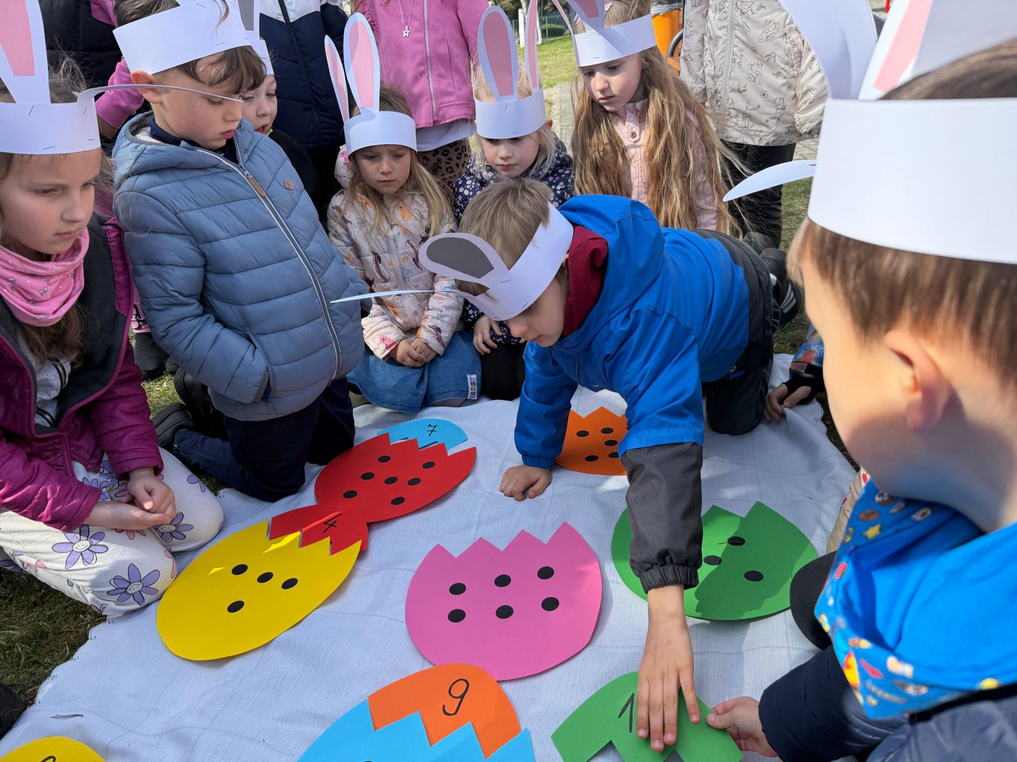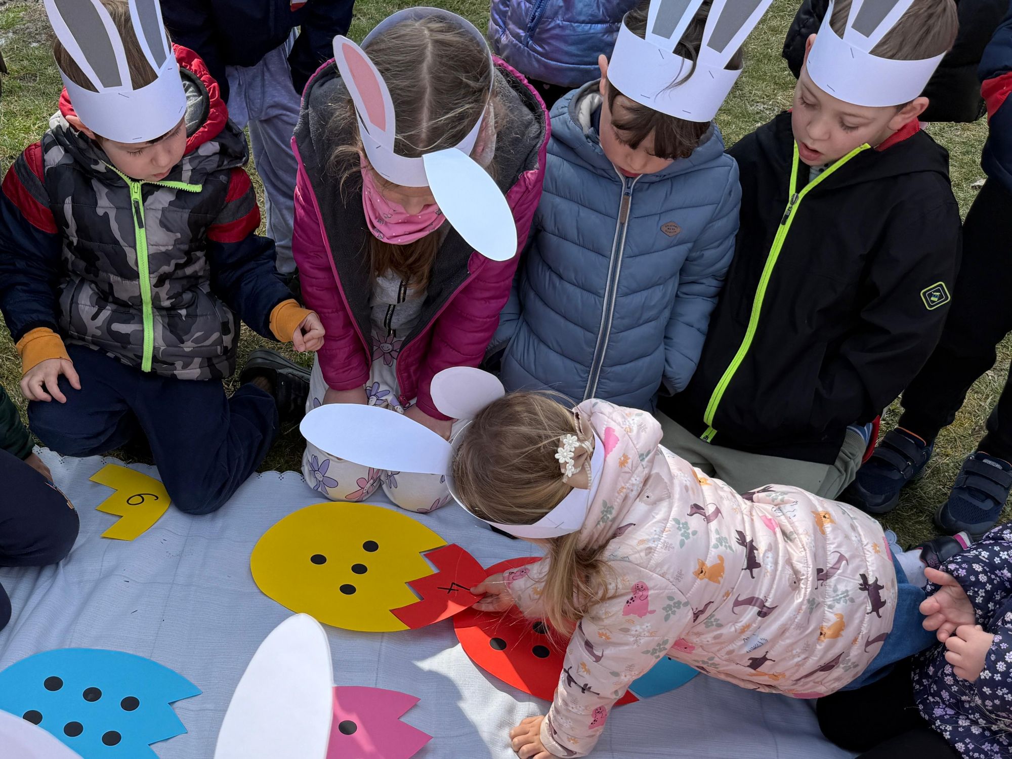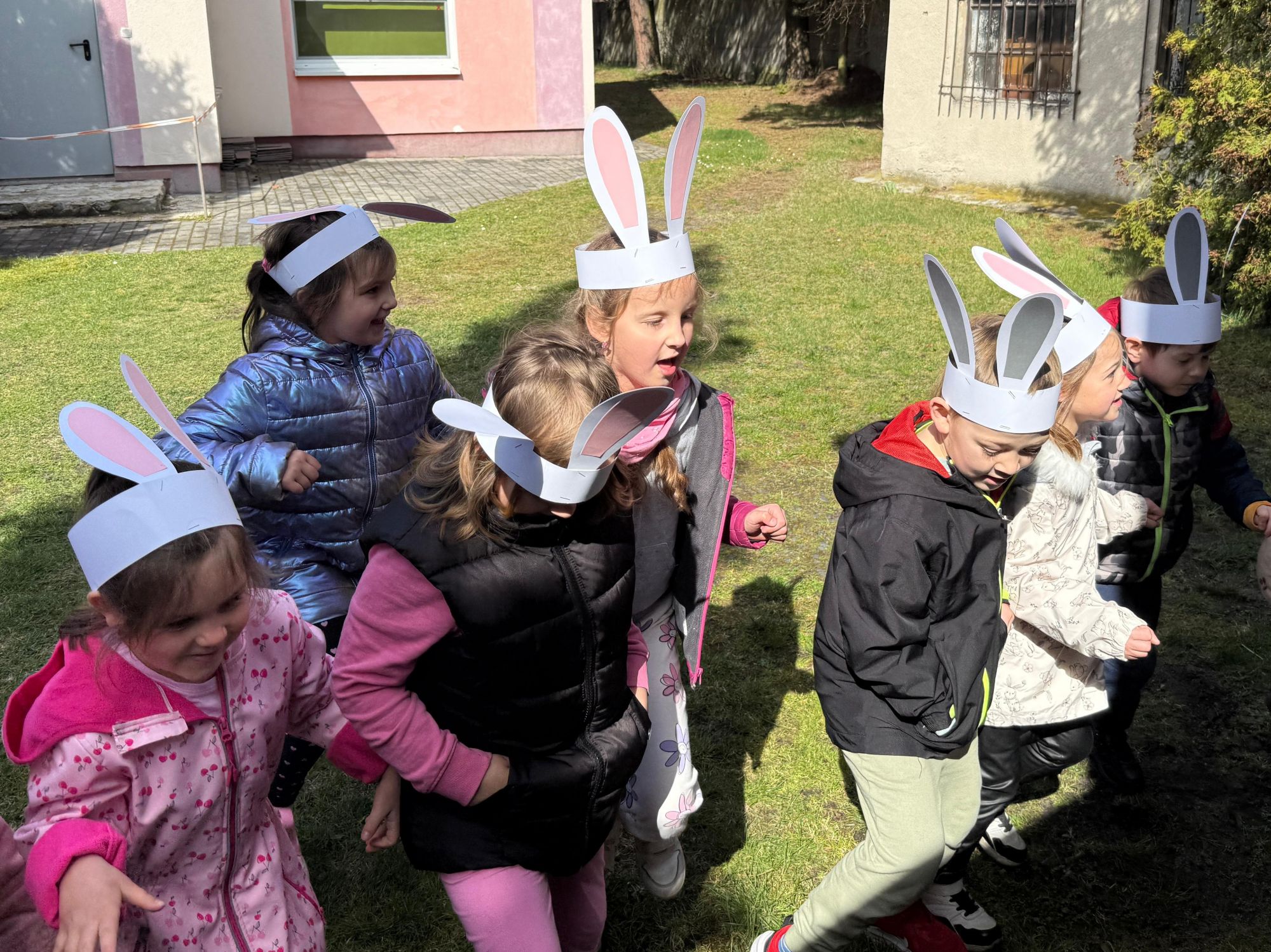 Każdego roku, tuż przed Świętami Wielkanocnymi, starszaków odwiedza wyjątkowy gość – Zajączek Wielkanocny. W tym roku, 1 kwietnia, dzieci już od samego rana z niecierpliwością wypatrywały jego przyjścia. Zaglądały przez okna i zastanawiały się, kiedy się pojawi. Po drugim śniadaniu ubrały się i założyły opaski z uszami zajączka, aby jeszcze lepiej poczuć wielkanocny nastrój. Chwilę później wyszły przed budynek przedszkola, gdzie czekała na nie niespodzianka – pięknie udekorowane wstążką pudełko oraz tajemnicza mapa. Po otwarciu pudełka przedszkolaki znalazły list, który odczytały wspólnie z panią Eweliną. Następnie rozłożyły mapę wskazującą trasę poszukiwania upominków i zgodnie z jej wskazówkami wyruszyły w drogę. Podczas wyprawy odnajdywały kolejne koperty pozostawione przez Zajączka. Z ogromnym zaangażowaniem wykonywały ukryte w nich zadania. Rozwiązywały zagadki, układały puzzle, pokonywały tory przeszkód, tworzyły wspólną pisankę z wykorzystaniem sznura, figur oraz przyborów gimnastycznych, takich jak szarfy czy woreczki. Uczestniczyły w zabawach matematycznych - przeliczały kropki na pisankach i dopasowywały do nich odpowiednie cyfry. Nie zabrakło także zabaw ruchowych, śpiewu piosenek oraz recytacji wierszy. Gdy dzieci dotarły do celu i odnalazły ostatni list, Zajączek postanowił zrobić im małego psikusa. Najpierw natrafiły na pusty koszyk z napisem „Prima Aprilis – szukajcie dalej!”. Ostatecznie udało się odnaleźć prawdziwy skarb – koszyk pełen słodkich upominków, który sprawił wszystkim ogromną radość. Poszukiwanie wskazówek okazało się doskonałą zabawą, która dostarczyła wszystkim wielu niezapomnianych wrażeń.