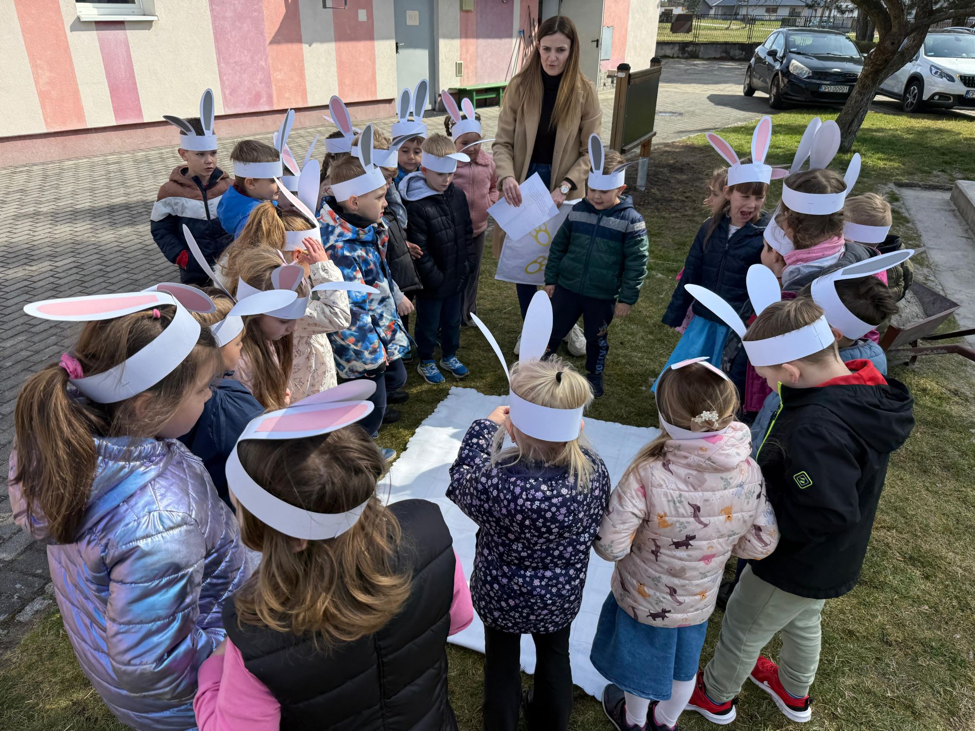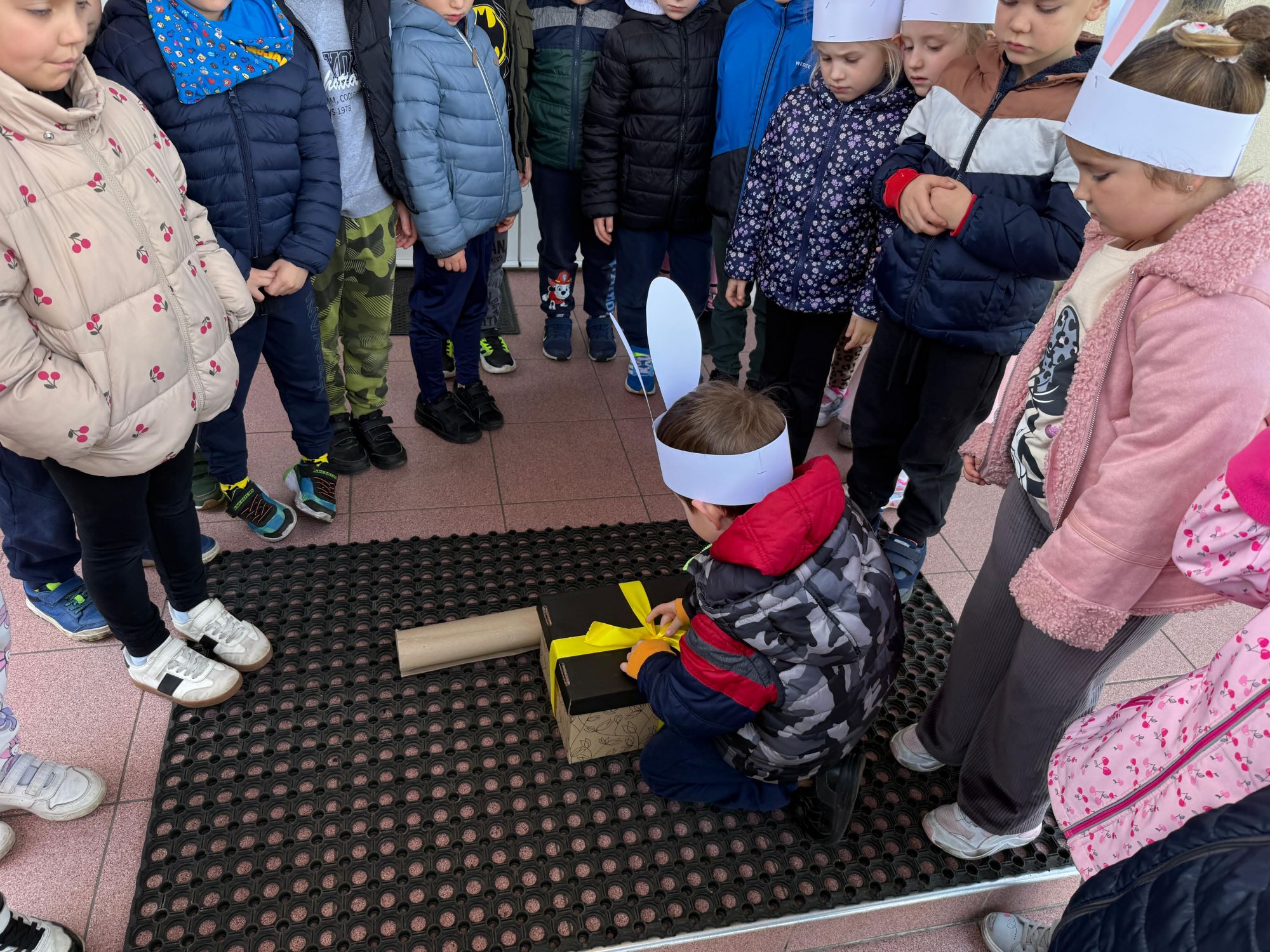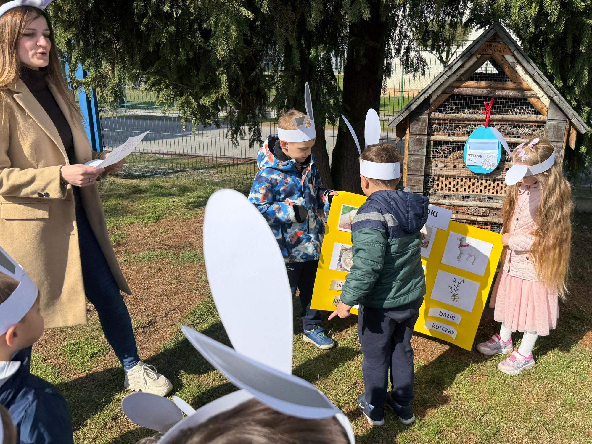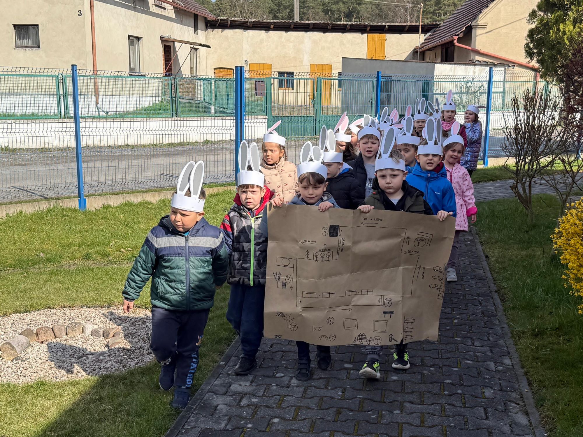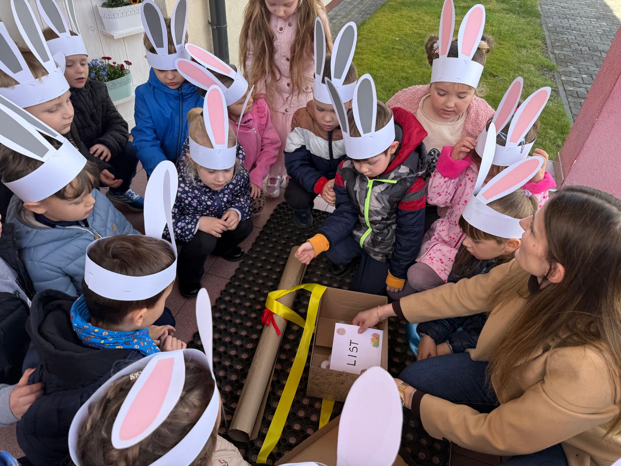Każdego roku, tuż przed Świętami Wielkanocnymi, starszaków odwiedza wyjątkowy gość – Zajączek Wielkanocny. W tym roku, 1 kwietnia, dzieci już od samego rana z niecierpliwością wypatrywały jego przyjścia. Zaglądały przez okna i zastanawiały się, kiedy się pojawi. Po drugim śniadaniu ubrały się i założyły opaski z uszami zajączka, aby jeszcze lepiej poczuć wielkanocny nastrój. Chwilę później wyszły przed budynek przedszkola, gdzie czekała na nie niespodzianka – pięknie udekorowane wstążką pudełko oraz tajemnicza mapa. Po otwarciu pudełka przedszkolaki znalazły list, który odczytały wspólnie z panią Eweliną. Następnie rozłożyły mapę wskazującą trasę poszukiwania upominków i zgodnie z jej wskazówkami wyruszyły w drogę. Podczas wyprawy odnajdywały kolejne koperty pozostawione przez Zajączka. Z ogromnym zaangażowaniem wykonywały ukryte w nich zadania. Rozwiązywały zagadki, układały puzzle, pokonywały tory przeszkód, tworzyły wspólną pisankę z wykorzystaniem sznura, figur oraz przyborów gimnastycznych, takich jak szarfy czy woreczki. Uczestniczyły w zabawach matematycznych - przeliczały kropki na pisankach i dopasowywały do nich odpowiednie cyfry. Nie zabrakło także zabaw ruchowych, śpiewu piosenek oraz recytacji wierszy. Gdy dzieci dotarły do celu i odnalazły ostatni list, Zajączek postanowił zrobić im małego psikusa. Najpierw natrafiły na pusty koszyk z napisem „Prima Aprilis – szukajcie dalej!”. Ostatecznie udało się odnaleźć prawdziwy skarb – koszyk pełen słodkich upominków, który sprawił wszystkim ogromną radość. Poszukiwanie wskazówek okazało się doskonałą zabawą, która dostarczyła wszystkim wielu niezapomnianych wrażeń.