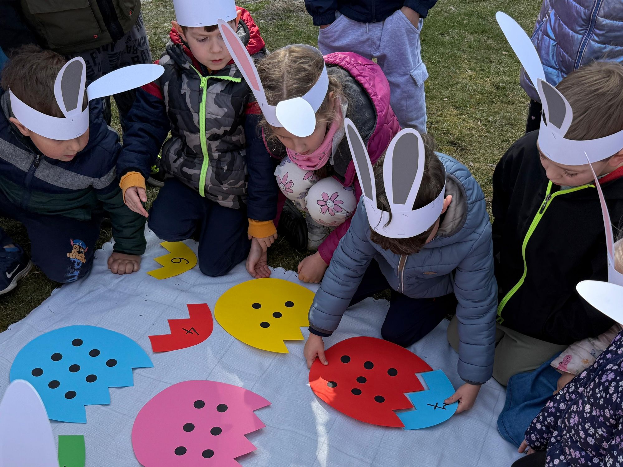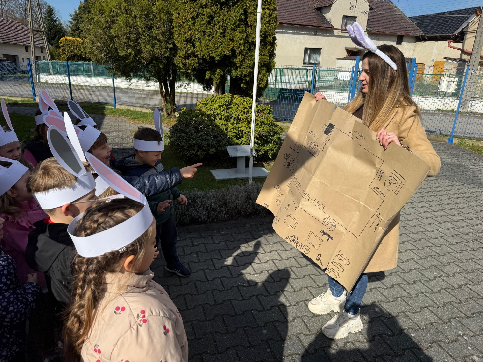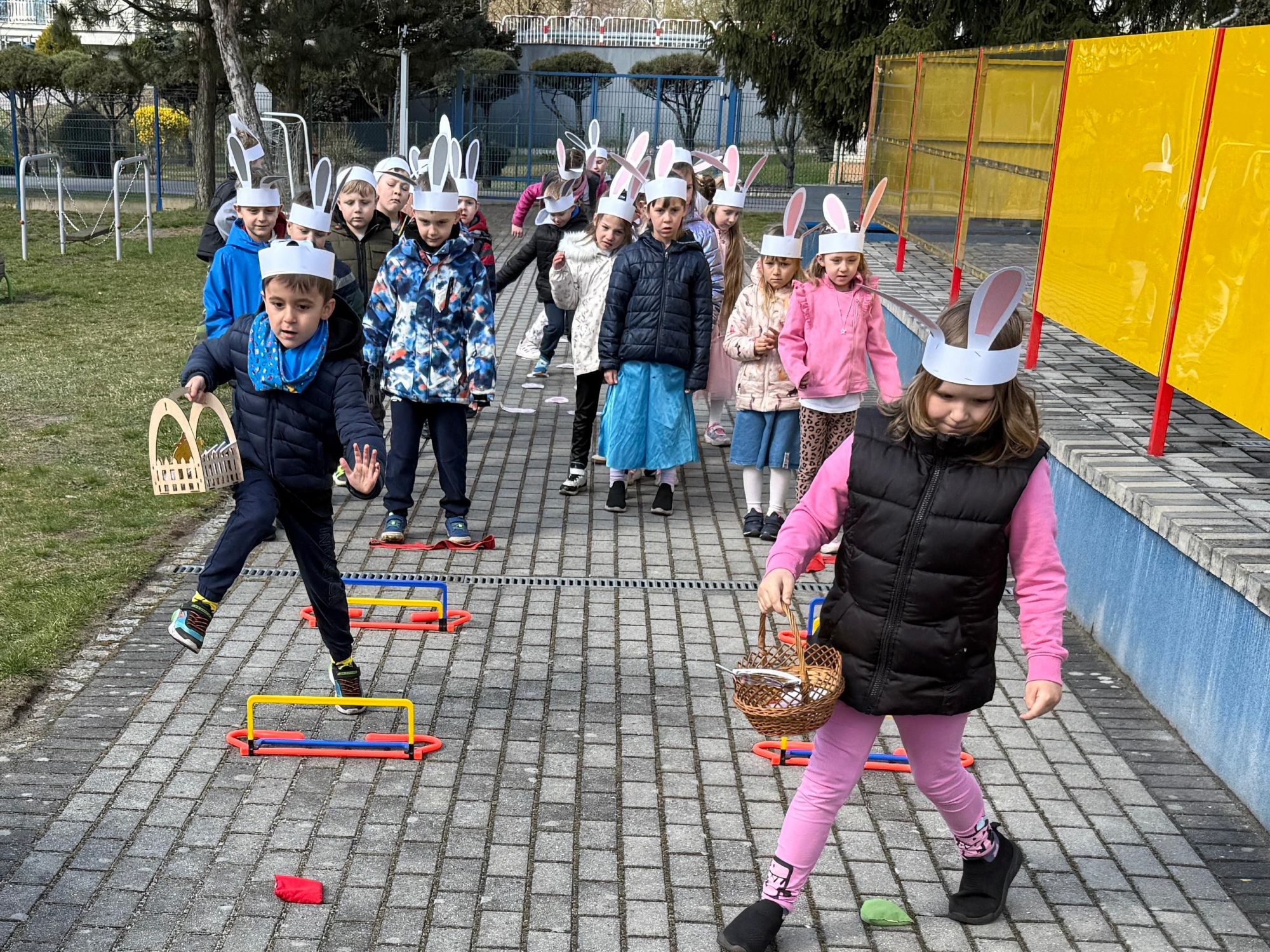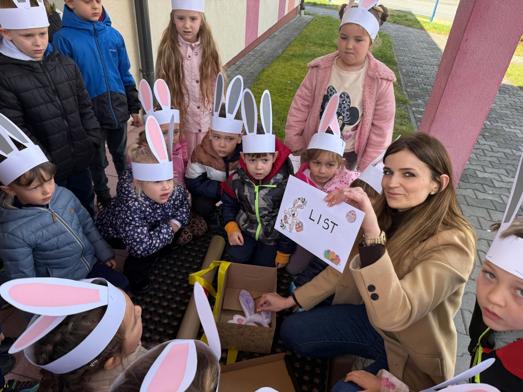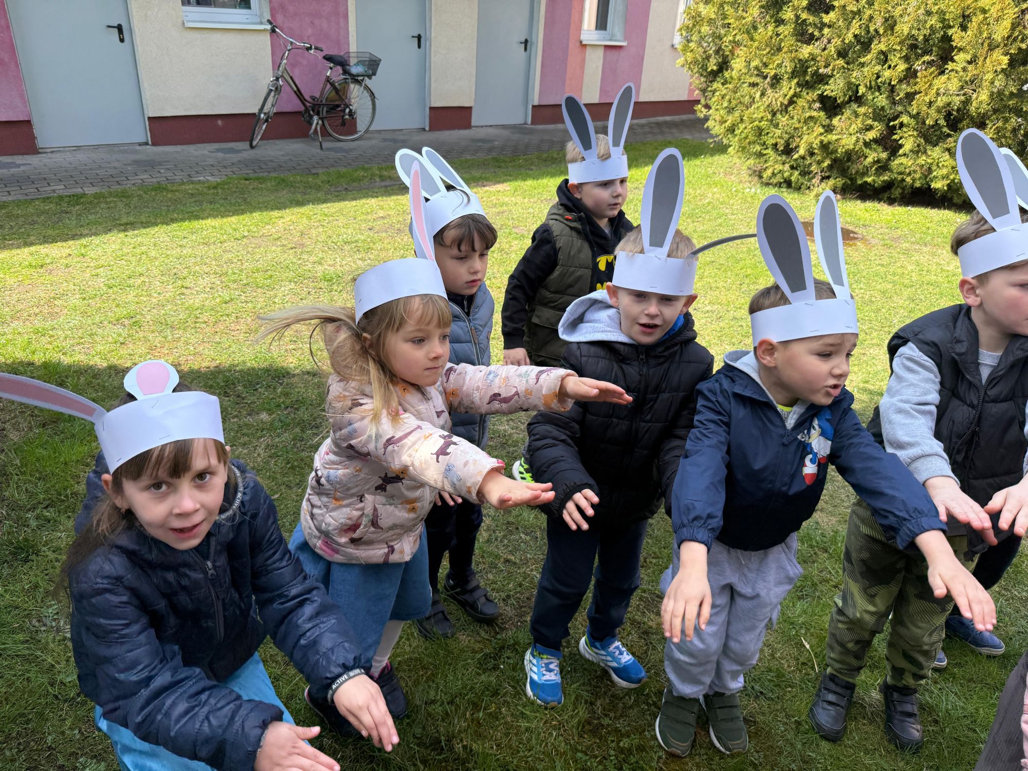 Każdego roku, tuż przed Świętami Wielkanocnymi, starszaków odwiedza wyjątkowy gość – Zajączek Wielkanocny. W tym roku, 1 kwietnia, dzieci już od samego rana z niecierpliwością wypatrywały jego przyjścia. Zaglądały przez okna i zastanawiały się, kiedy się pojawi. Po drugim śniadaniu ubrały się i założyły opaski z uszami zajączka, aby jeszcze lepiej poczuć wielkanocny nastrój. Chwilę później wyszły przed budynek przedszkola, gdzie czekała na nie niespodzianka – pięknie udekorowane wstążką pudełko oraz tajemnicza mapa. Po otwarciu pudełka przedszkolaki znalazły list, który odczytały wspólnie z panią Eweliną. Następnie rozłożyły mapę wskazującą trasę poszukiwania upominków i zgodnie z jej wskazówkami wyruszyły w drogę. Podczas wyprawy odnajdywały kolejne koperty pozostawione przez Zajączka. Z ogromnym zaangażowaniem wykonywały ukryte w nich zadania. Rozwiązywały zagadki, układały puzzle, pokonywały tory przeszkód, tworzyły wspólną pisankę z wykorzystaniem sznura, figur oraz przyborów gimnastycznych, takich jak szarfy czy woreczki. Uczestniczyły w zabawach matematycznych - przeliczały kropki na pisankach i dopasowywały do nich odpowiednie cyfry. Nie zabrakło także zabaw ruchowych, śpiewu piosenek oraz recytacji wierszy. Gdy dzieci dotarły do celu i odnalazły ostatni list, Zajączek postanowił zrobić im małego psikusa. Najpierw natrafiły na pusty koszyk z napisem „Prima Aprilis – szukajcie dalej!”. Ostatecznie udało się odnaleźć prawdziwy skarb – koszyk pełen słodkich upominków, który sprawił wszystkim ogromną radość. Poszukiwanie wskazówek okazało się doskonałą zabawą, która dostarczyła wszystkim wielu niezapomnianych wrażeń.