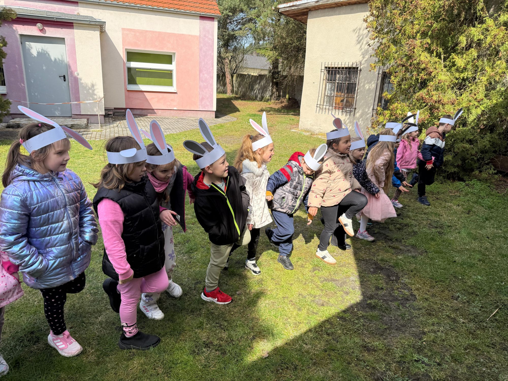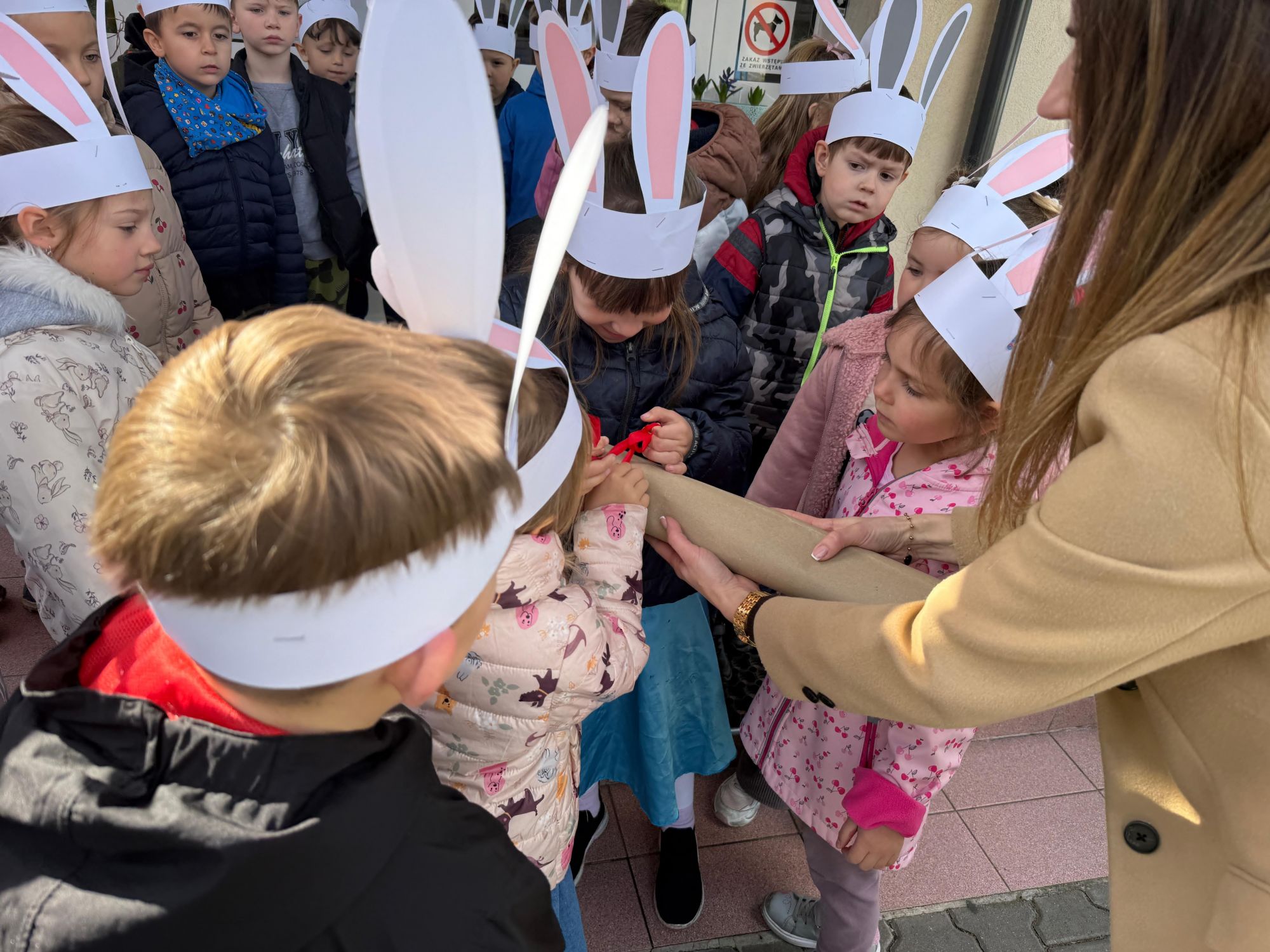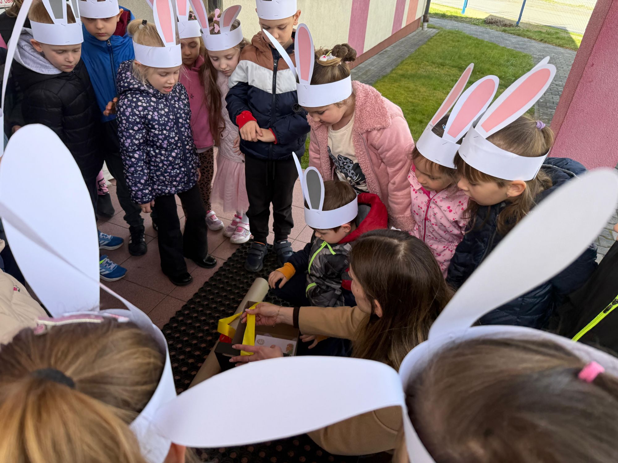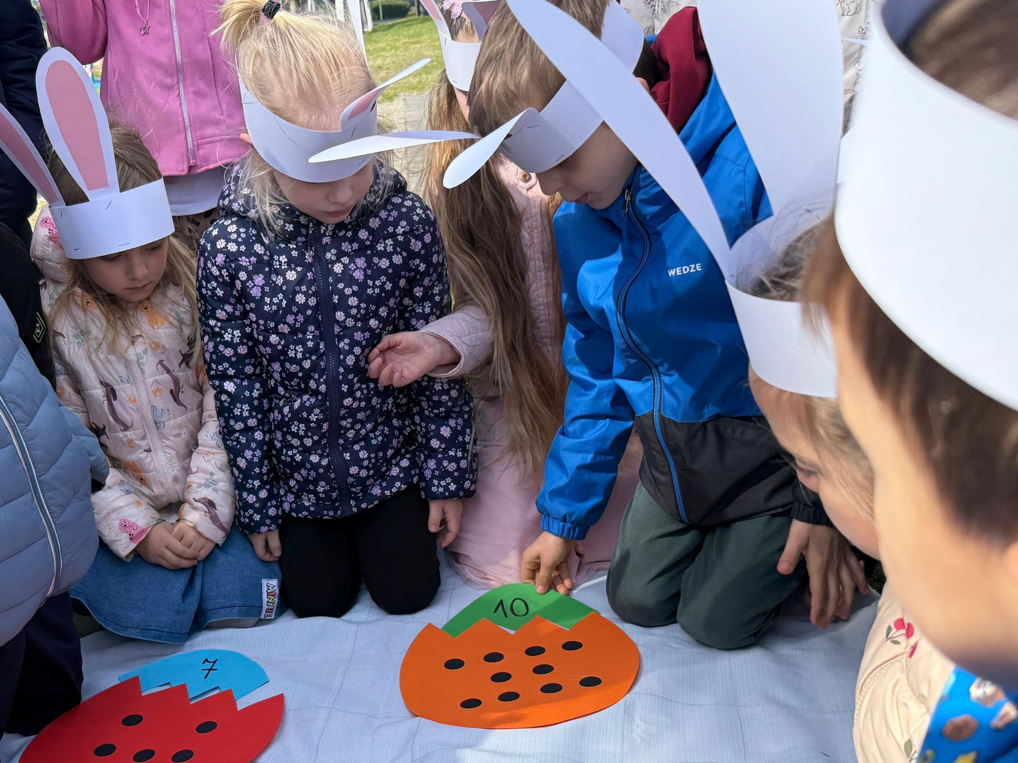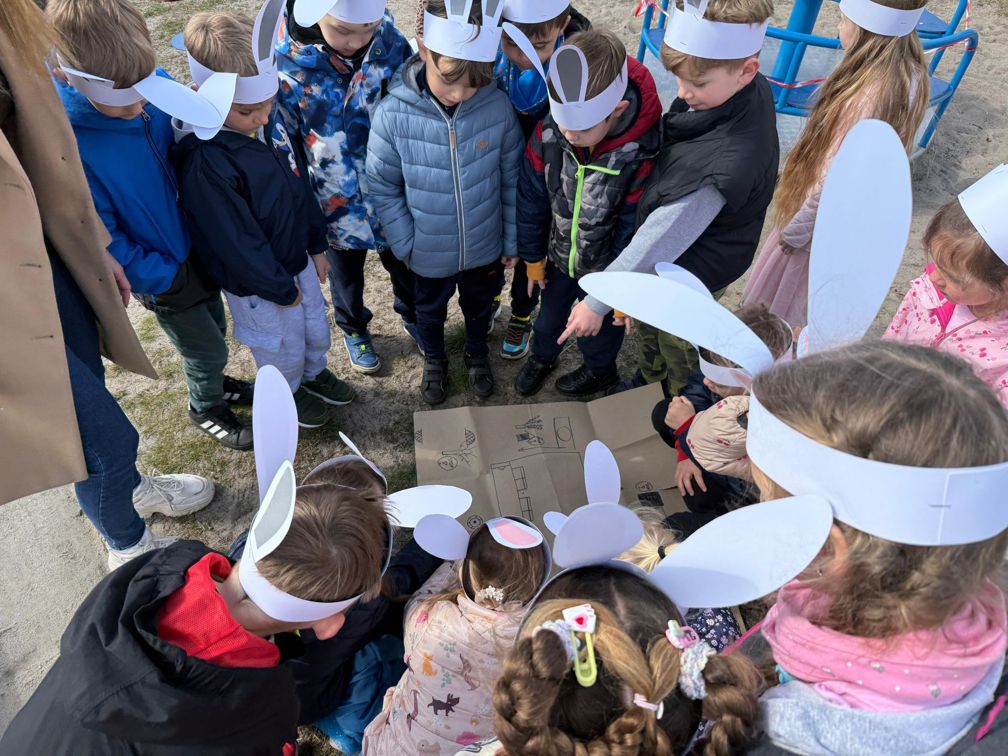 Każdego roku, tuż przed Świętami Wielkanocnymi, starszaków odwiedza wyjątkowy gość – Zajączek Wielkanocny. W tym roku, 1 kwietnia, dzieci już od samego rana z niecierpliwością wypatrywały jego przyjścia. Zaglądały przez okna i zastanawiały się, kiedy się pojawi. Po drugim śniadaniu ubrały się i założyły opaski z uszami zajączka, aby jeszcze lepiej poczuć wielkanocny nastrój. Chwilę później wyszły przed budynek przedszkola, gdzie czekała na nie niespodzianka – pięknie udekorowane wstążką pudełko oraz tajemnicza mapa. Po otwarciu pudełka przedszkolaki znalazły list, który odczytały wspólnie z panią Eweliną. Następnie rozłożyły mapę wskazującą trasę poszukiwania upominków i zgodnie z jej wskazówkami wyruszyły w drogę. Podczas wyprawy odnajdywały kolejne koperty pozostawione przez Zajączka. Z ogromnym zaangażowaniem wykonywały ukryte w nich zadania. Rozwiązywały zagadki, układały puzzle, pokonywały tory przeszkód, tworzyły wspólną pisankę z wykorzystaniem sznura, figur oraz przyborów gimnastycznych, takich jak szarfy czy woreczki. Uczestniczyły w zabawach matematycznych - przeliczały kropki na pisankach i dopasowywały do nich odpowiednie cyfry. Nie zabrakło także zabaw ruchowych, śpiewu piosenek oraz recytacji wierszy. Gdy dzieci dotarły do celu i odnalazły ostatni list, Zajączek postanowił zrobić im małego psikusa. Najpierw natrafiły na pusty koszyk z napisem „Prima Aprilis – szukajcie dalej!”. Ostatecznie udało się odnaleźć prawdziwy skarb – koszyk pełen słodkich upominków, który sprawił wszystkim ogromną radość. Poszukiwanie wskazówek okazało się doskonałą zabawą, która dostarczyła wszystkim wielu niezapomnianych wrażeń.