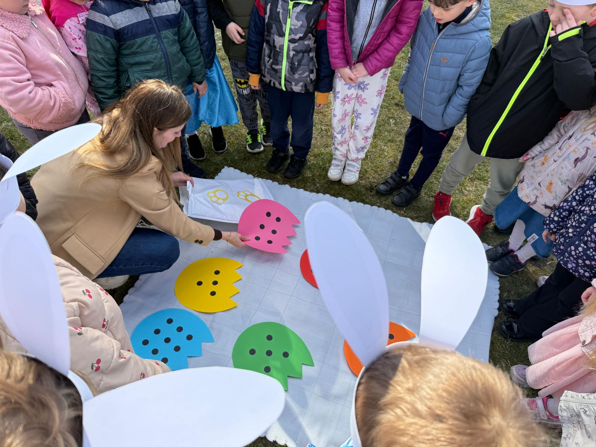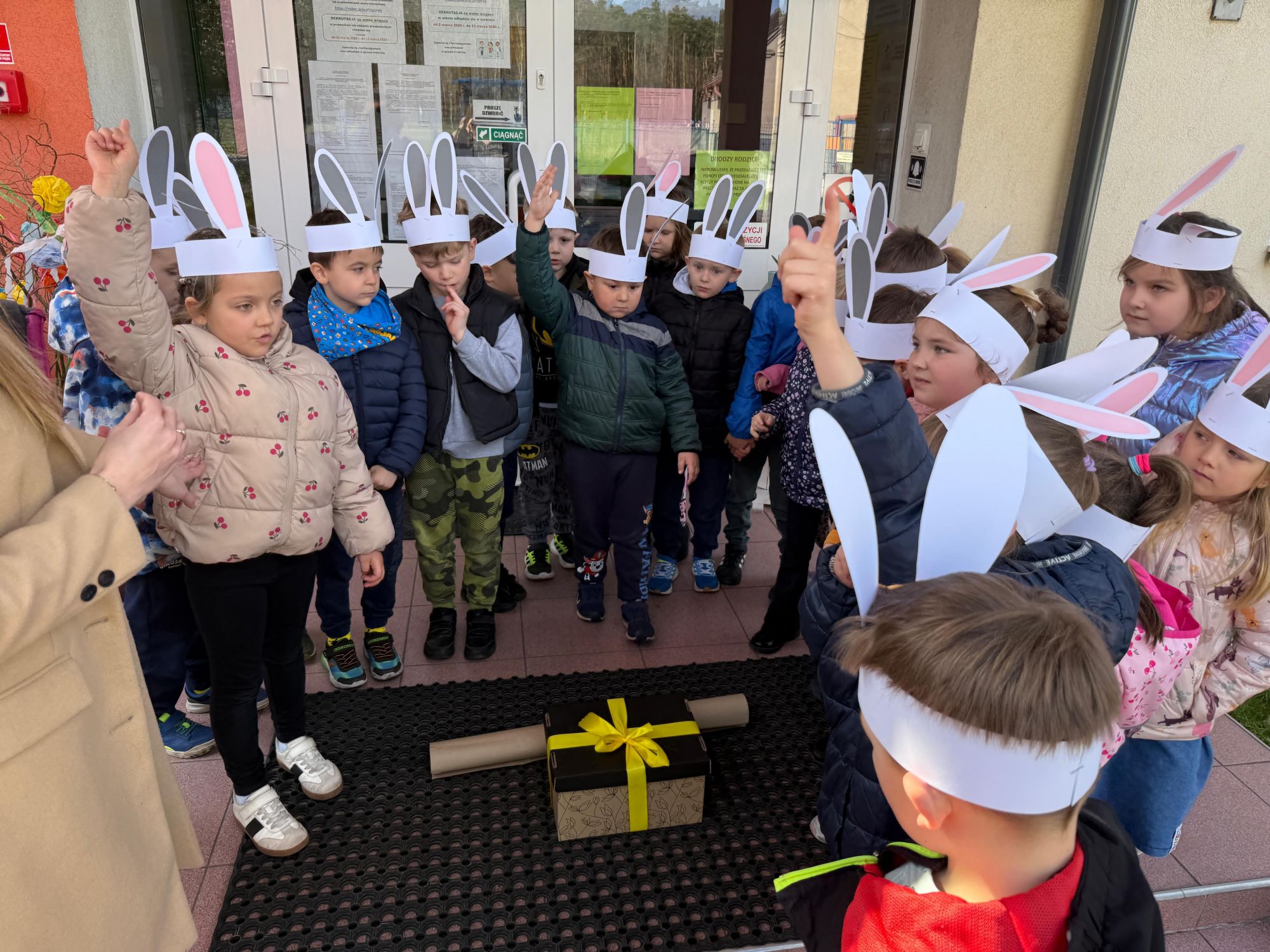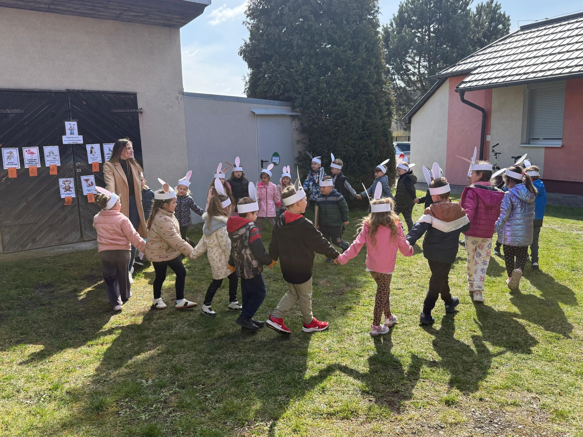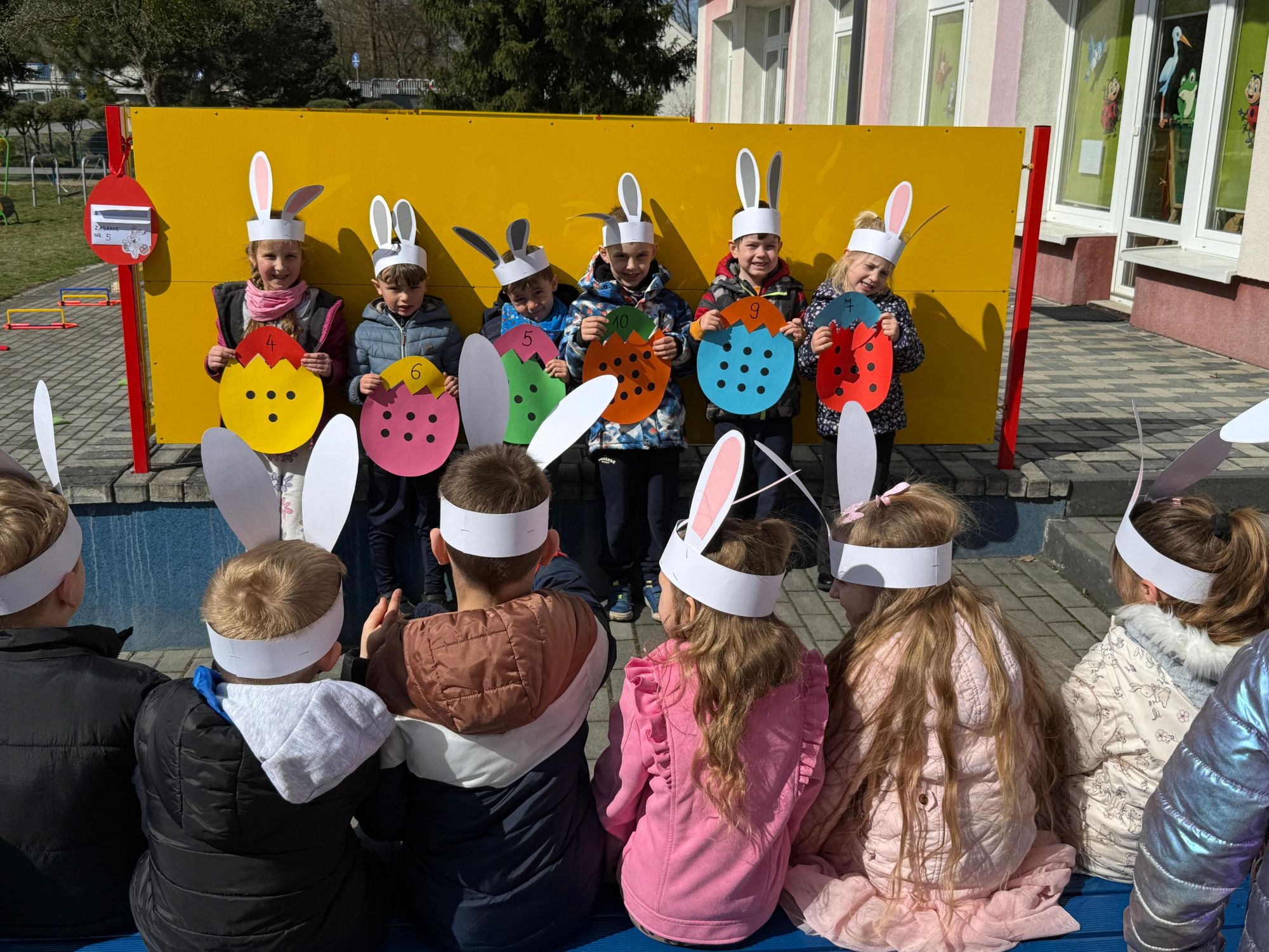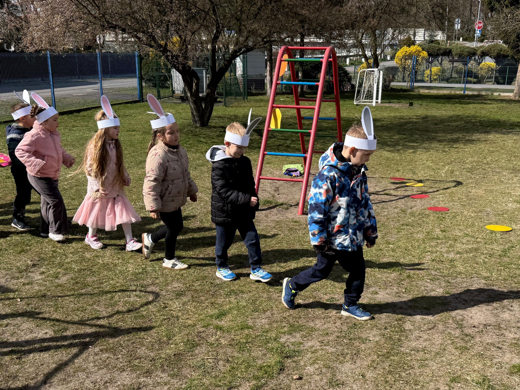 Każdego roku, tuż przed Świętami Wielkanocnymi, starszaków odwiedza wyjątkowy gość – Zajączek Wielkanocny. W tym roku, 1 kwietnia, dzieci już od samego rana z niecierpliwością wypatrywały jego przyjścia. Zaglądały przez okna i zastanawiały się, kiedy się pojawi. Po drugim śniadaniu ubrały się i założyły opaski z uszami zajączka, aby jeszcze lepiej poczuć wielkanocny nastrój. Chwilę później wyszły przed budynek przedszkola, gdzie czekała na nie niespodzianka – pięknie udekorowane wstążką pudełko oraz tajemnicza mapa. Po otwarciu pudełka przedszkolaki znalazły list, który odczytały wspólnie z panią Eweliną. Następnie rozłożyły mapę wskazującą trasę poszukiwania upominków i zgodnie z jej wskazówkami wyruszyły w drogę. Podczas wyprawy odnajdywały kolejne koperty pozostawione przez Zajączka. Z ogromnym zaangażowaniem wykonywały ukryte w nich zadania. Rozwiązywały zagadki, układały puzzle, pokonywały tory przeszkód, tworzyły wspólną pisankę z wykorzystaniem sznura, figur oraz przyborów gimnastycznych, takich jak szarfy czy woreczki. Uczestniczyły w zabawach matematycznych - przeliczały kropki na pisankach i dopasowywały do nich odpowiednie cyfry. Nie zabrakło także zabaw ruchowych, śpiewu piosenek oraz recytacji wierszy. Gdy dzieci dotarły do celu i odnalazły ostatni list, Zajączek postanowił zrobić im małego psikusa. Najpierw natrafiły na pusty koszyk z napisem „Prima Aprilis – szukajcie dalej!”. Ostatecznie udało się odnaleźć prawdziwy skarb – koszyk pełen słodkich upominków, który sprawił wszystkim ogromną radość. Poszukiwanie wskazówek okazało się doskonałą zabawą, która dostarczyła wszystkim wielu niezapomnianych wrażeń.