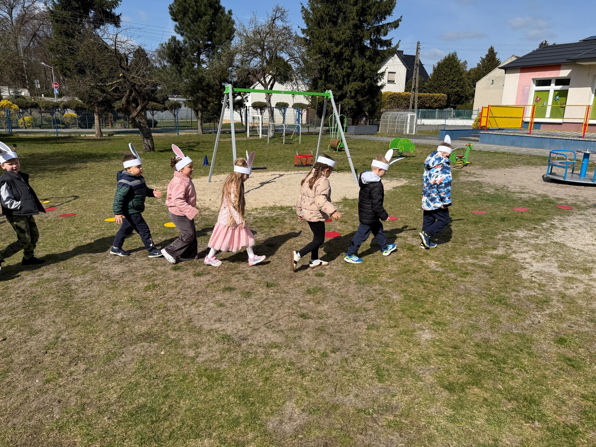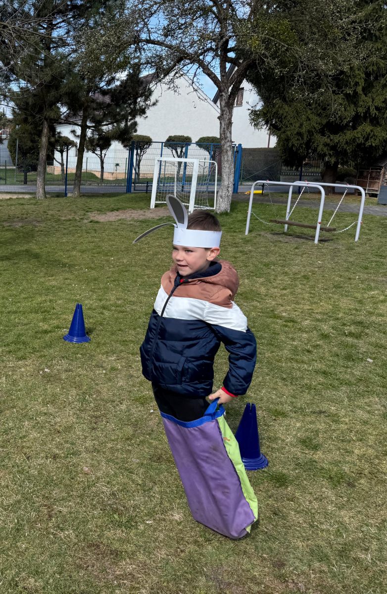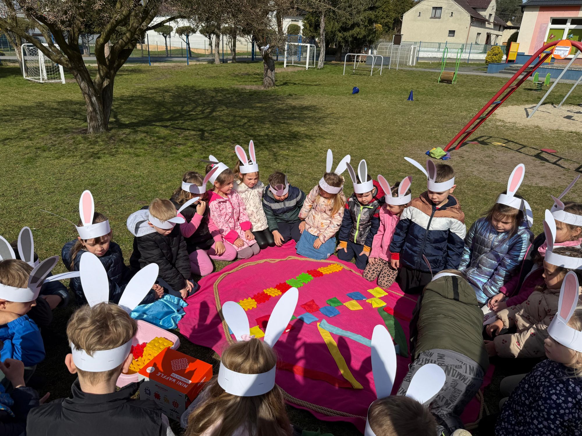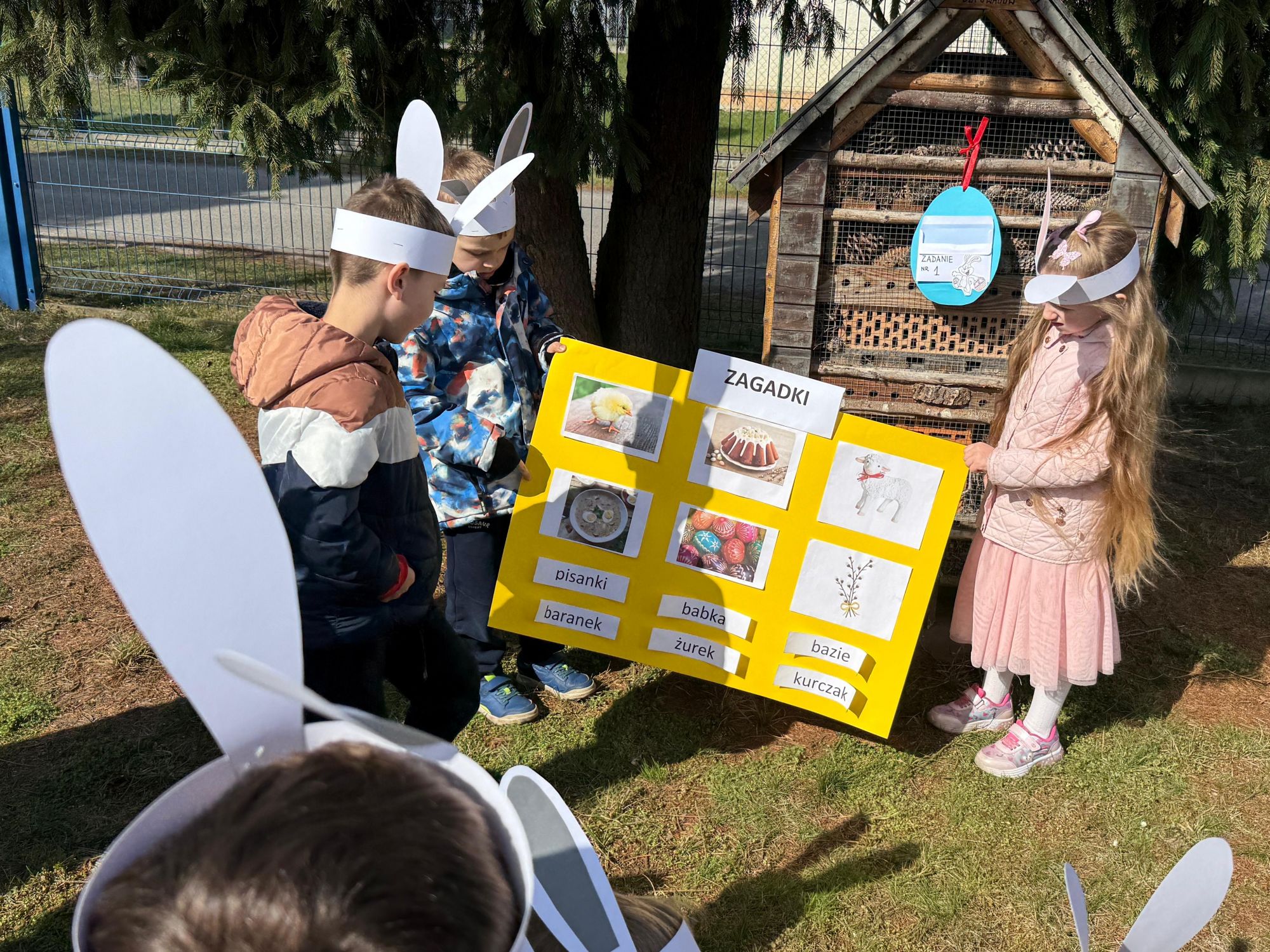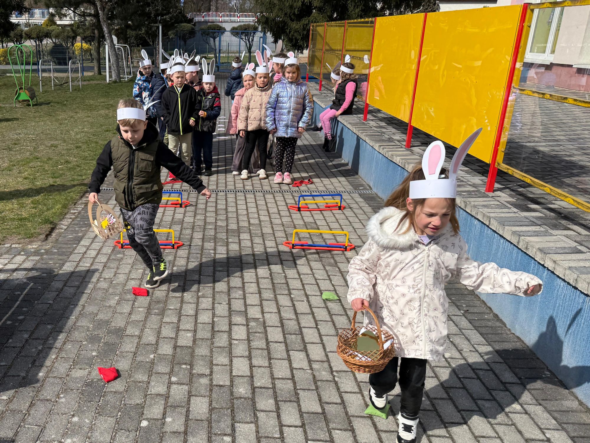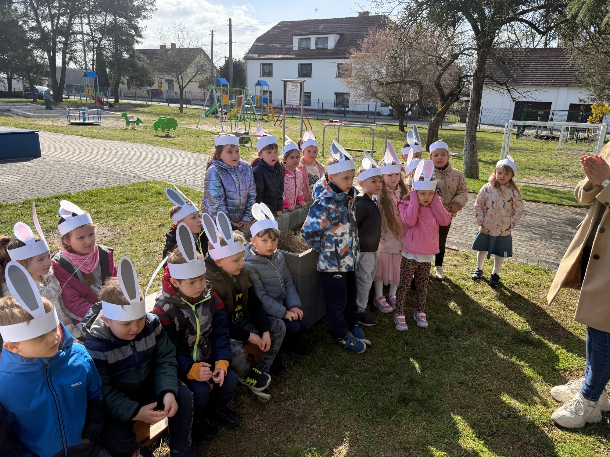 Każdego roku, tuż przed Świętami Wielkanocnymi, starszaków odwiedza wyjątkowy gość – Zajączek Wielkanocny. W tym roku, 1 kwietnia, dzieci już od samego rana z niecierpliwością wypatrywały jego przyjścia. Zaglądały przez okna i zastanawiały się, kiedy się pojawi. Po drugim śniadaniu ubrały się i założyły opaski z uszami zajączka, aby jeszcze lepiej poczuć wielkanocny nastrój. Chwilę później wyszły przed budynek przedszkola, gdzie czekała na nie niespodzianka – pięknie udekorowane wstążką pudełko oraz tajemnicza mapa. Po otwarciu pudełka przedszkolaki znalazły list, który odczytały wspólnie z panią Eweliną. Następnie rozłożyły mapę wskazującą trasę poszukiwania upominków i zgodnie z jej wskazówkami wyruszyły w drogę. Podczas wyprawy odnajdywały kolejne koperty pozostawione przez Zajączka. Z ogromnym zaangażowaniem wykonywały ukryte w nich zadania. Rozwiązywały zagadki, układały puzzle, pokonywały tory przeszkód, tworzyły wspólną pisankę z wykorzystaniem sznura, figur oraz przyborów gimnastycznych, takich jak szarfy czy woreczki. Uczestniczyły w zabawach matematycznych - przeliczały kropki na pisankach i dopasowywały do nich odpowiednie cyfry. Nie zabrakło także zabaw ruchowych, śpiewu piosenek oraz recytacji wierszy. Gdy dzieci dotarły do celu i odnalazły ostatni list, Zajączek postanowił zrobić im małego psikusa. Najpierw natrafiły na pusty koszyk z napisem „Prima Aprilis – szukajcie dalej!”. Ostatecznie udało się odnaleźć prawdziwy skarb – koszyk pełen słodkich upominków, który sprawił wszystkim ogromną radość. Poszukiwanie wskazówek okazało się doskonałą zabawą, która dostarczyła wszystkim wielu niezapomnianych wrażeń.