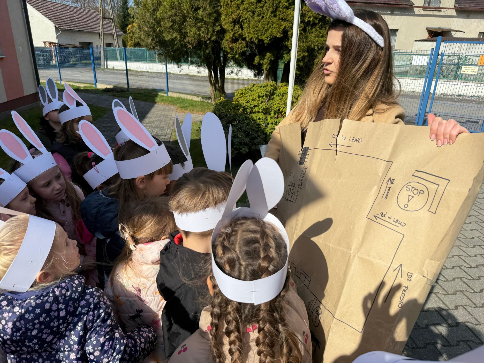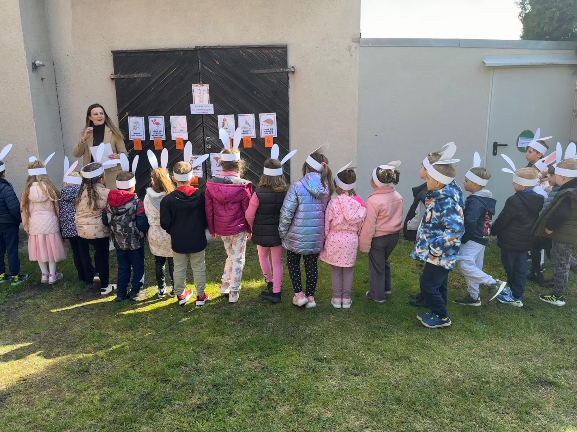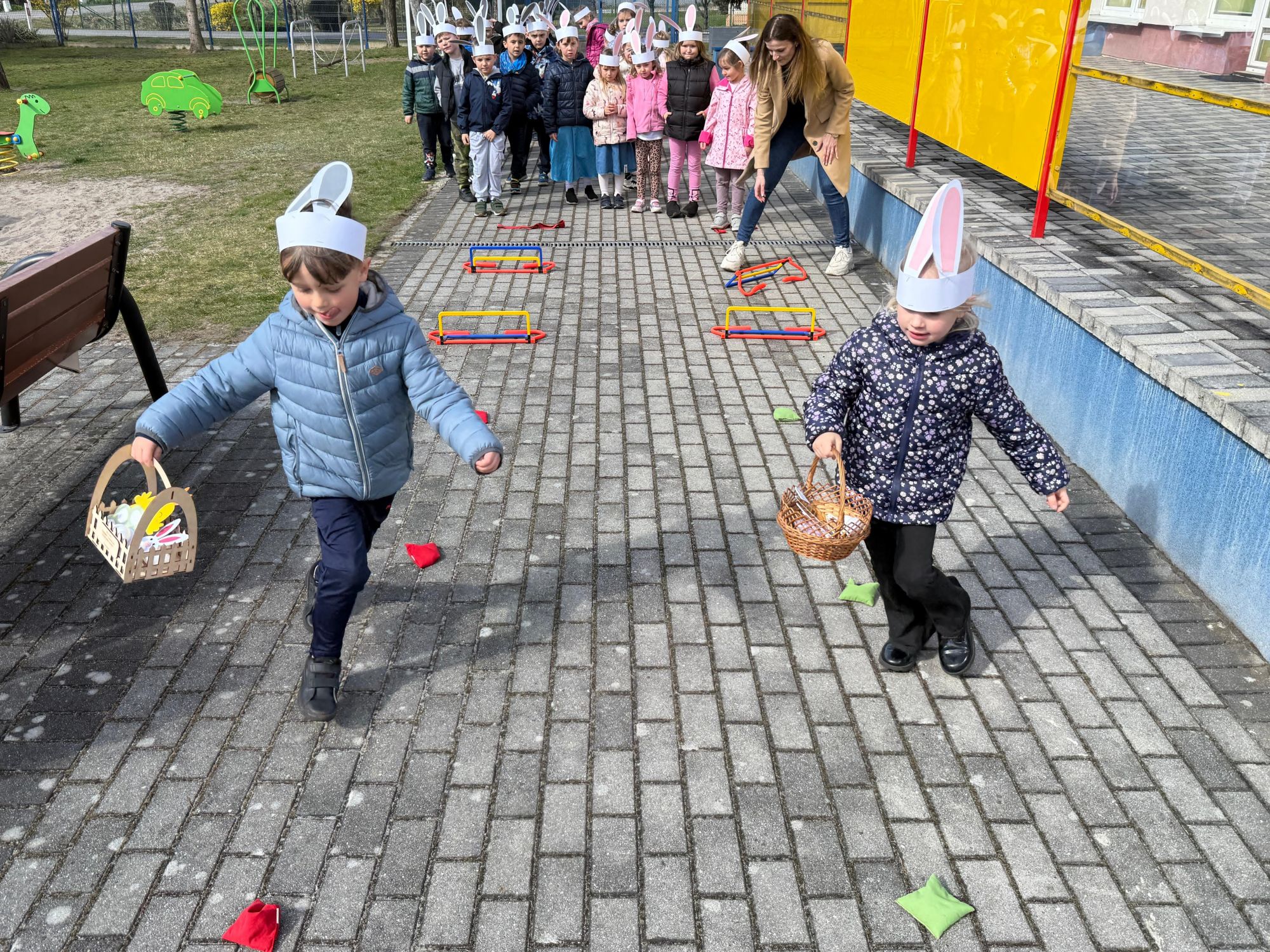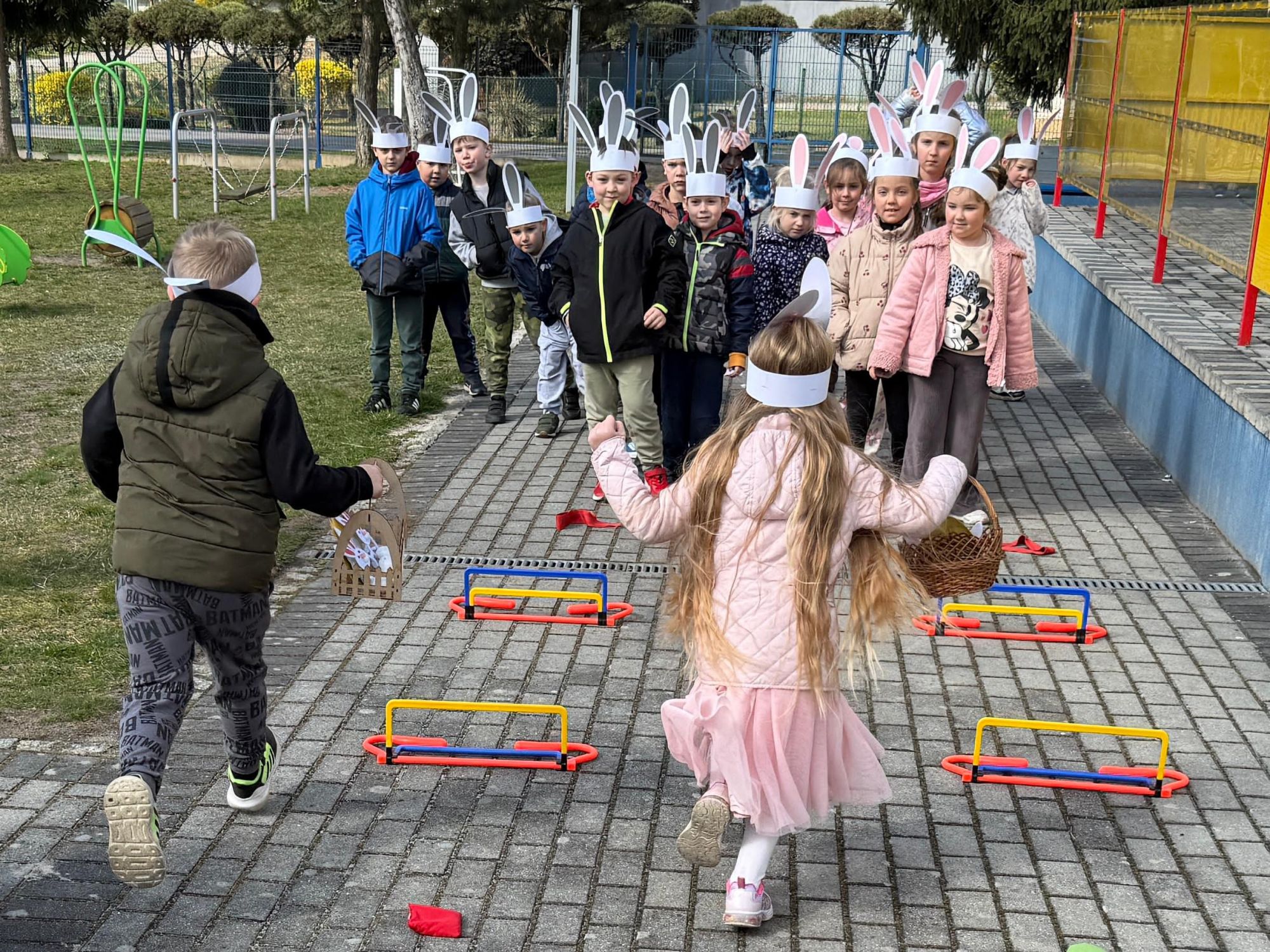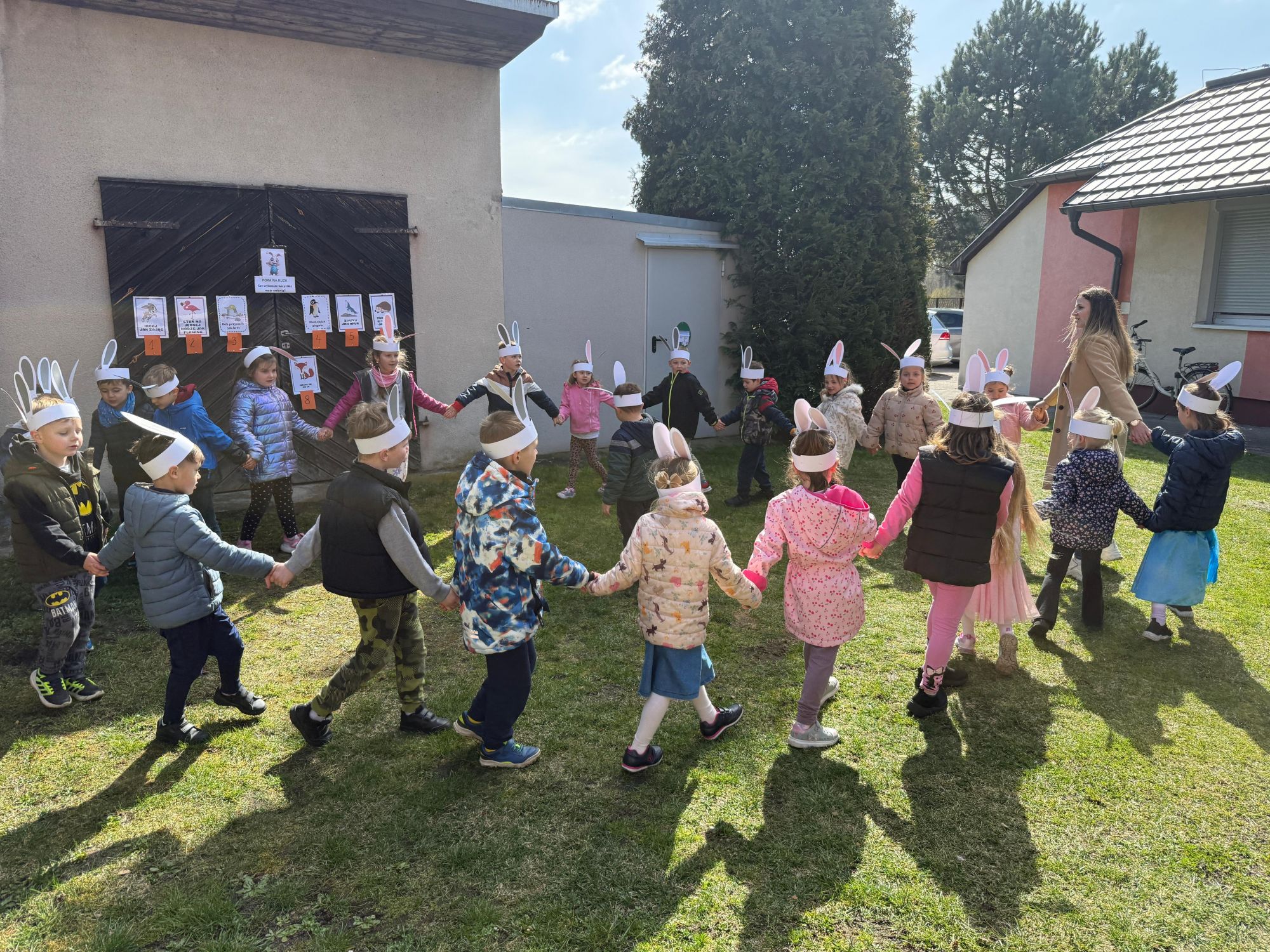 Każdego roku, tuż przed Świętami Wielkanocnymi, starszaków odwiedza wyjątkowy gość – Zajączek Wielkanocny. W tym roku, 1 kwietnia, dzieci już od samego rana z niecierpliwością wypatrywały jego przyjścia. Zaglądały przez okna i zastanawiały się, kiedy się pojawi. Po drugim śniadaniu ubrały się i założyły opaski z uszami zajączka, aby jeszcze lepiej poczuć wielkanocny nastrój. Chwilę później wyszły przed budynek przedszkola, gdzie czekała na nie niespodzianka – pięknie udekorowane wstążką pudełko oraz tajemnicza mapa. Po otwarciu pudełka przedszkolaki znalazły list, który odczytały wspólnie z panią Eweliną. Następnie rozłożyły mapę wskazującą trasę poszukiwania upominków i zgodnie z jej wskazówkami wyruszyły w drogę. Podczas wyprawy odnajdywały kolejne koperty pozostawione przez Zajączka. Z ogromnym zaangażowaniem wykonywały ukryte w nich zadania. Rozwiązywały zagadki, układały puzzle, pokonywały tory przeszkód, tworzyły wspólną pisankę z wykorzystaniem sznura, figur oraz przyborów gimnastycznych, takich jak szarfy czy woreczki. Uczestniczyły w zabawach matematycznych - przeliczały kropki na pisankach i dopasowywały do nich odpowiednie cyfry. Nie zabrakło także zabaw ruchowych, śpiewu piosenek oraz recytacji wierszy. Gdy dzieci dotarły do celu i odnalazły ostatni list, Zajączek postanowił zrobić im małego psikusa. Najpierw natrafiły na pusty koszyk z napisem „Prima Aprilis – szukajcie dalej!”. Ostatecznie udało się odnaleźć prawdziwy skarb – koszyk pełen słodkich upominków, który sprawił wszystkim ogromną radość. Poszukiwanie wskazówek okazało się doskonałą zabawą, która dostarczyła wszystkim wielu niezapomnianych wrażeń.