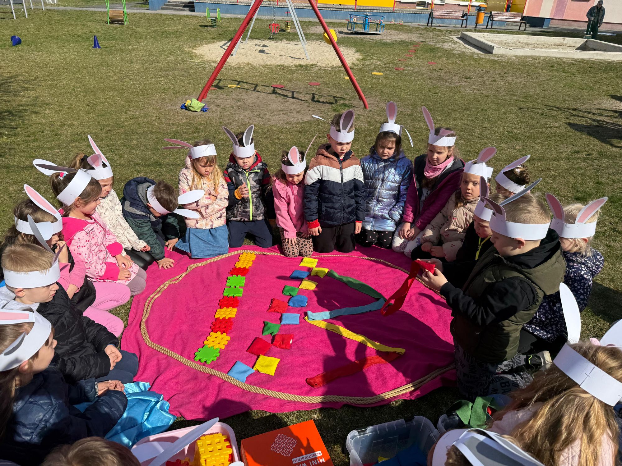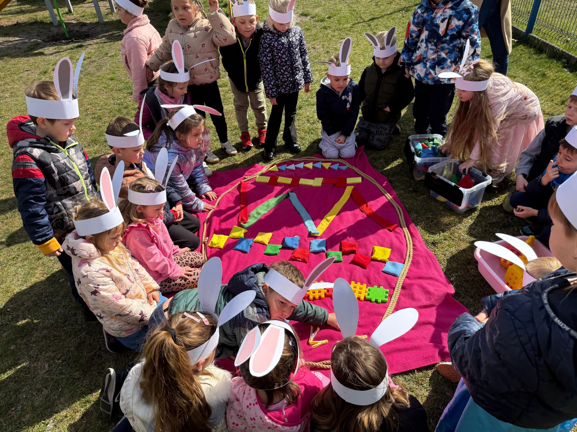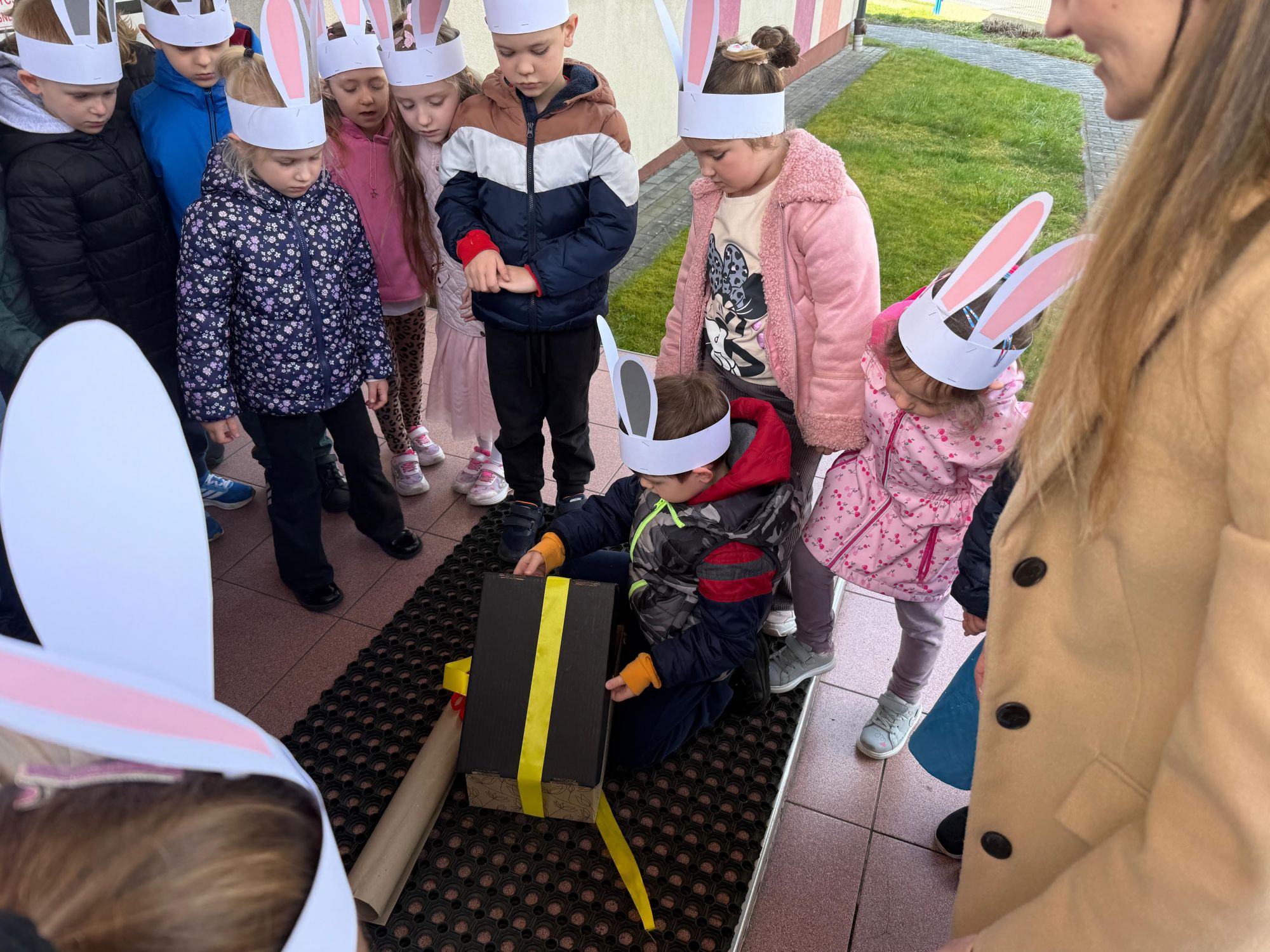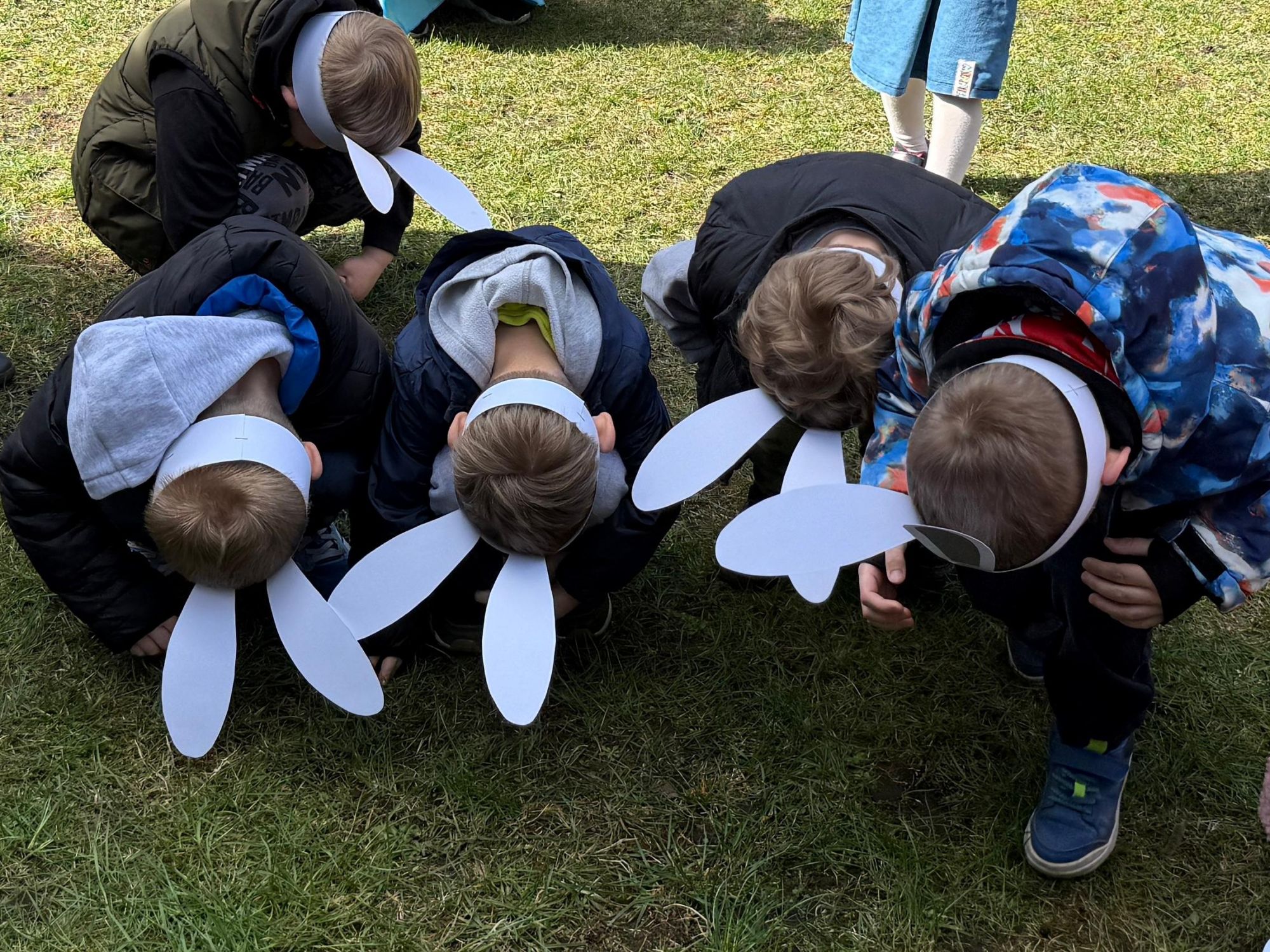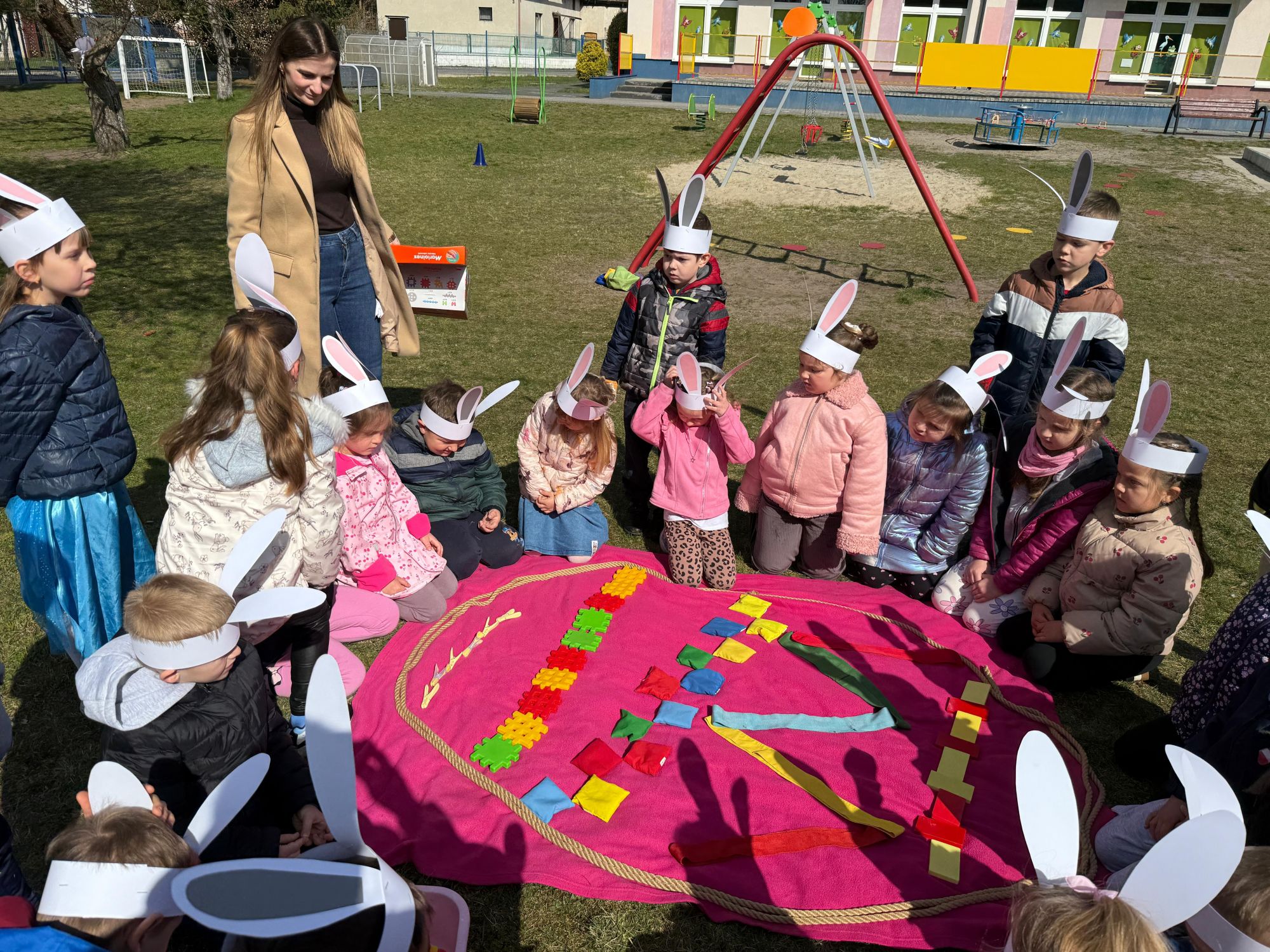 Każdego roku, tuż przed Świętami Wielkanocnymi, starszaków odwiedza wyjątkowy gość – Zajączek Wielkanocny. W tym roku, 1 kwietnia, dzieci już od samego rana z niecierpliwością wypatrywały jego przyjścia. Zaglądały przez okna i zastanawiały się, kiedy się pojawi. Po drugim śniadaniu ubrały się i założyły opaski z uszami zajączka, aby jeszcze lepiej poczuć wielkanocny nastrój. Chwilę później wyszły przed budynek przedszkola, gdzie czekała na nie niespodzianka – pięknie udekorowane wstążką pudełko oraz tajemnicza mapa. Po otwarciu pudełka przedszkolaki znalazły list, który odczytały wspólnie z panią Eweliną. Następnie rozłożyły mapę wskazującą trasę poszukiwania upominków i zgodnie z jej wskazówkami wyruszyły w drogę. Podczas wyprawy odnajdywały kolejne koperty pozostawione przez Zajączka. Z ogromnym zaangażowaniem wykonywały ukryte w nich zadania. Rozwiązywały zagadki, układały puzzle, pokonywały tory przeszkód, tworzyły wspólną pisankę z wykorzystaniem sznura, figur oraz przyborów gimnastycznych, takich jak szarfy czy woreczki. Uczestniczyły w zabawach matematycznych - przeliczały kropki na pisankach i dopasowywały do nich odpowiednie cyfry. Nie zabrakło także zabaw ruchowych, śpiewu piosenek oraz recytacji wierszy. Gdy dzieci dotarły do celu i odnalazły ostatni list, Zajączek postanowił zrobić im małego psikusa. Najpierw natrafiły na pusty koszyk z napisem „Prima Aprilis – szukajcie dalej!”. Ostatecznie udało się odnaleźć prawdziwy skarb – koszyk pełen słodkich upominków, który sprawił wszystkim ogromną radość. Poszukiwanie wskazówek okazało się doskonałą zabawą, która dostarczyła wszystkim wielu niezapomnianych wrażeń.