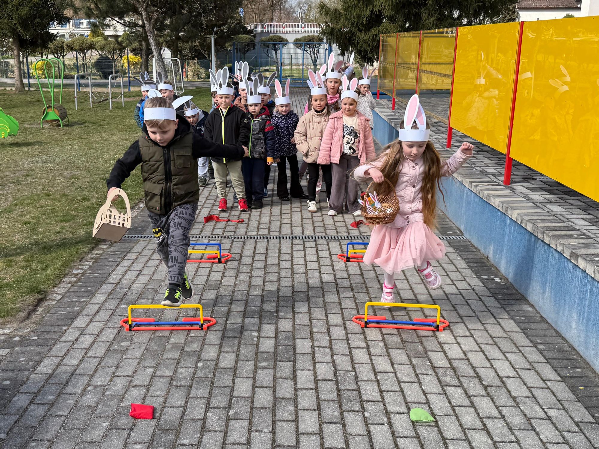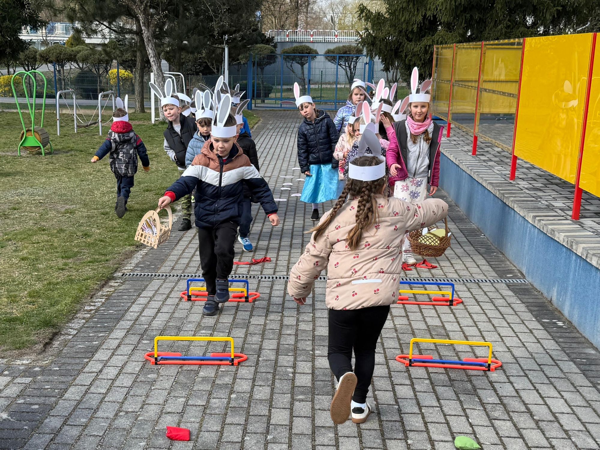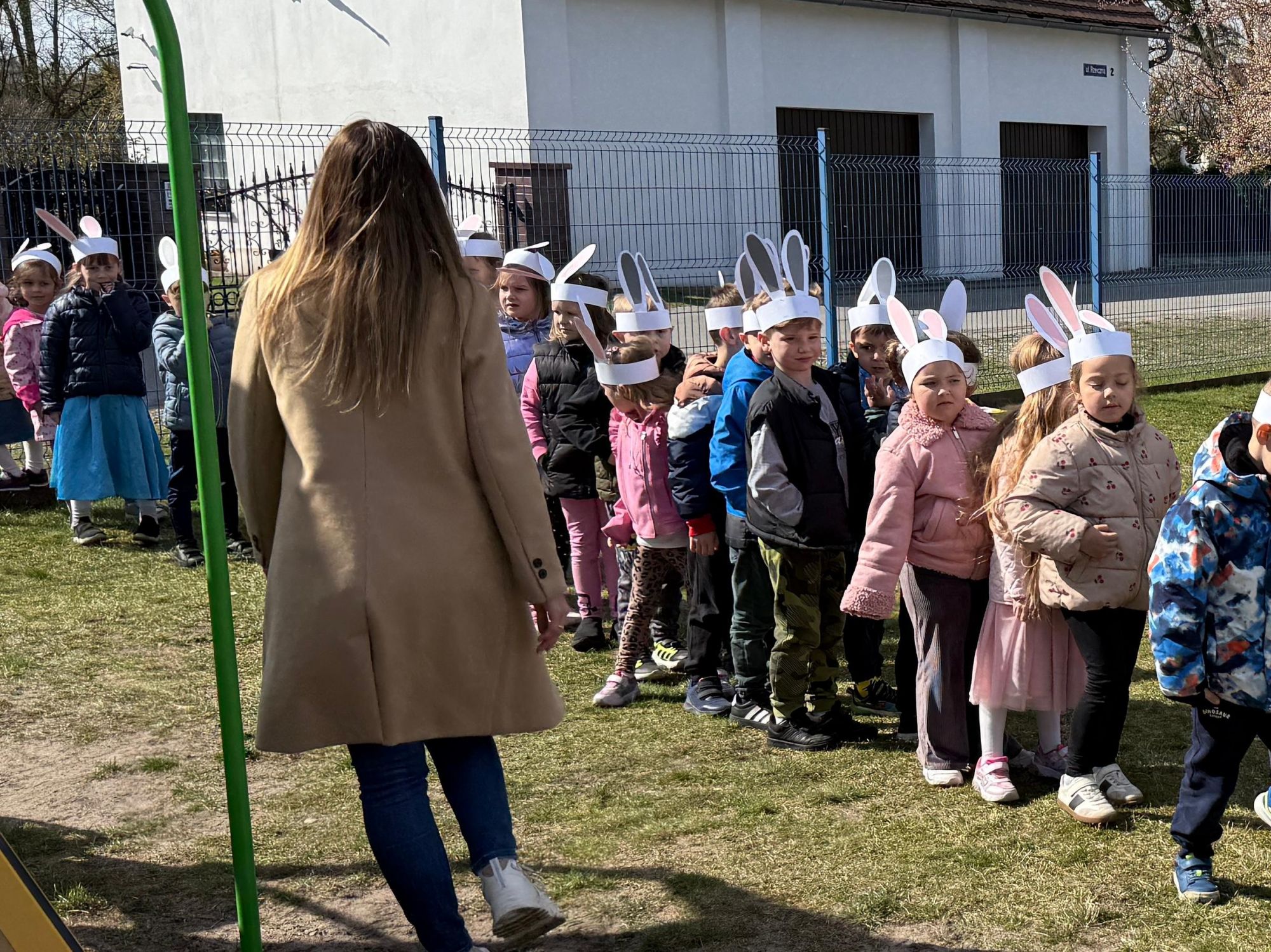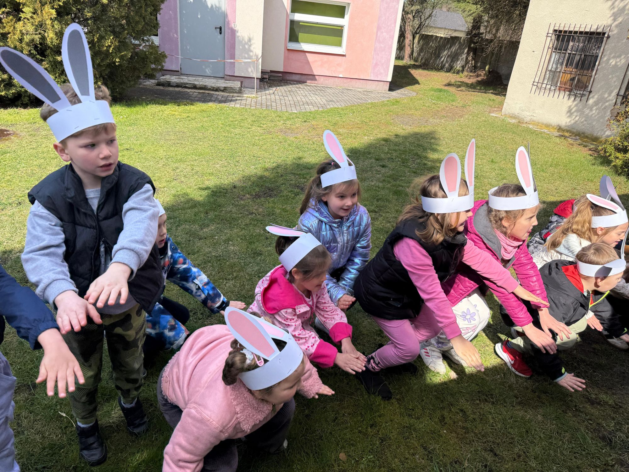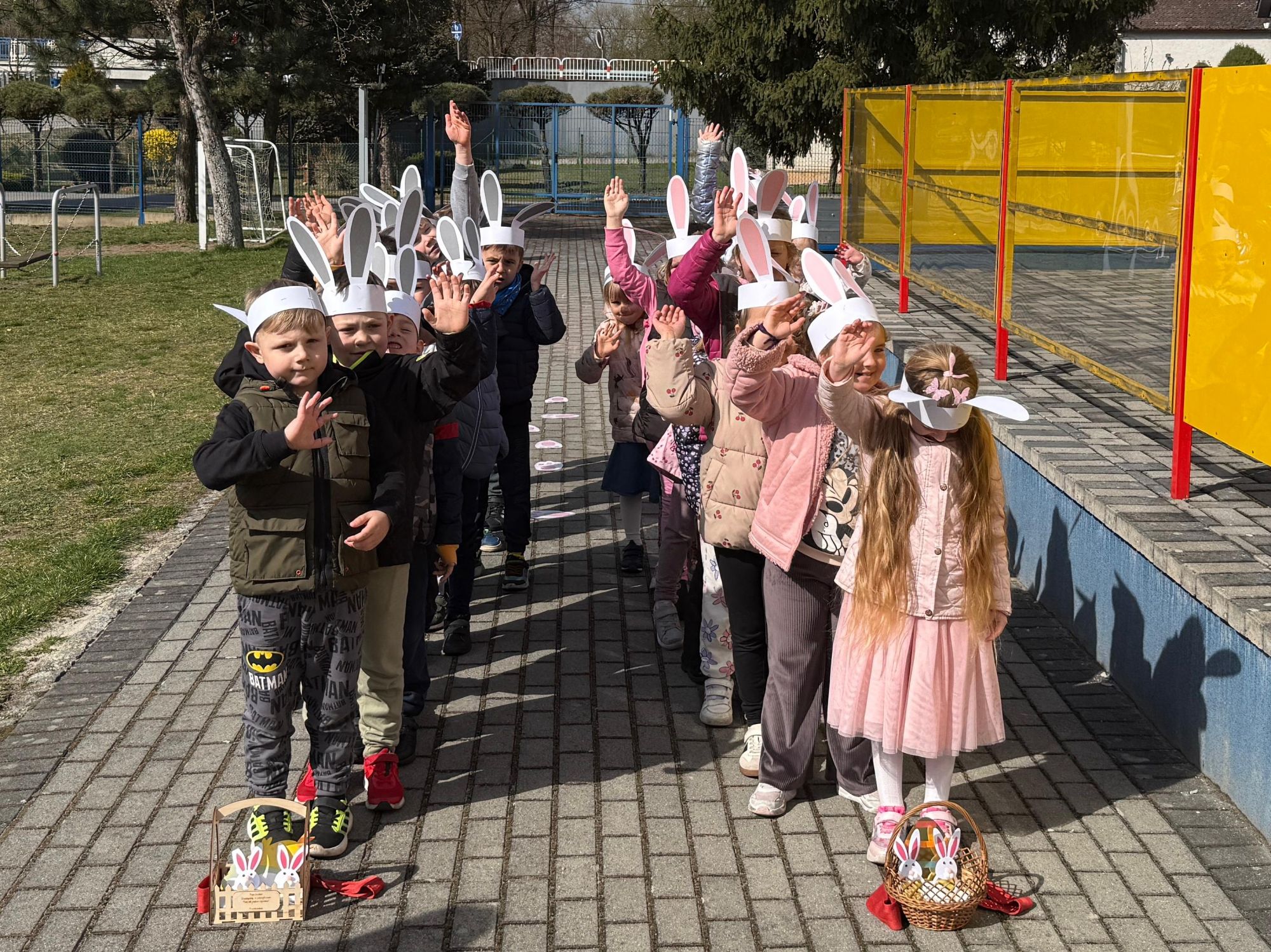 Każdego roku, tuż przed Świętami Wielkanocnymi, starszaków odwiedza wyjątkowy gość – Zajączek Wielkanocny. W tym roku, 1 kwietnia, dzieci już od samego rana z niecierpliwością wypatrywały jego przyjścia. Zaglądały przez okna i zastanawiały się, kiedy się pojawi. Po drugim śniadaniu ubrały się i założyły opaski z uszami zajączka, aby jeszcze lepiej poczuć wielkanocny nastrój. Chwilę później wyszły przed budynek przedszkola, gdzie czekała na nie niespodzianka – pięknie udekorowane wstążką pudełko oraz tajemnicza mapa. Po otwarciu pudełka przedszkolaki znalazły list, który odczytały wspólnie z panią Eweliną. Następnie rozłożyły mapę wskazującą trasę poszukiwania upominków i zgodnie z jej wskazówkami wyruszyły w drogę. Podczas wyprawy odnajdywały kolejne koperty pozostawione przez Zajączka. Z ogromnym zaangażowaniem wykonywały ukryte w nich zadania. Rozwiązywały zagadki, układały puzzle, pokonywały tory przeszkód, tworzyły wspólną pisankę z wykorzystaniem sznura, figur oraz przyborów gimnastycznych, takich jak szarfy czy woreczki. Uczestniczyły w zabawach matematycznych - przeliczały kropki na pisankach i dopasowywały do nich odpowiednie cyfry. Nie zabrakło także zabaw ruchowych, śpiewu piosenek oraz recytacji wierszy. Gdy dzieci dotarły do celu i odnalazły ostatni list, Zajączek postanowił zrobić im małego psikusa. Najpierw natrafiły na pusty koszyk z napisem „Prima Aprilis – szukajcie dalej!”. Ostatecznie udało się odnaleźć prawdziwy skarb – koszyk pełen słodkich upominków, który sprawił wszystkim ogromną radość. Poszukiwanie wskazówek okazało się doskonałą zabawą, która dostarczyła wszystkim wielu niezapomnianych wrażeń.