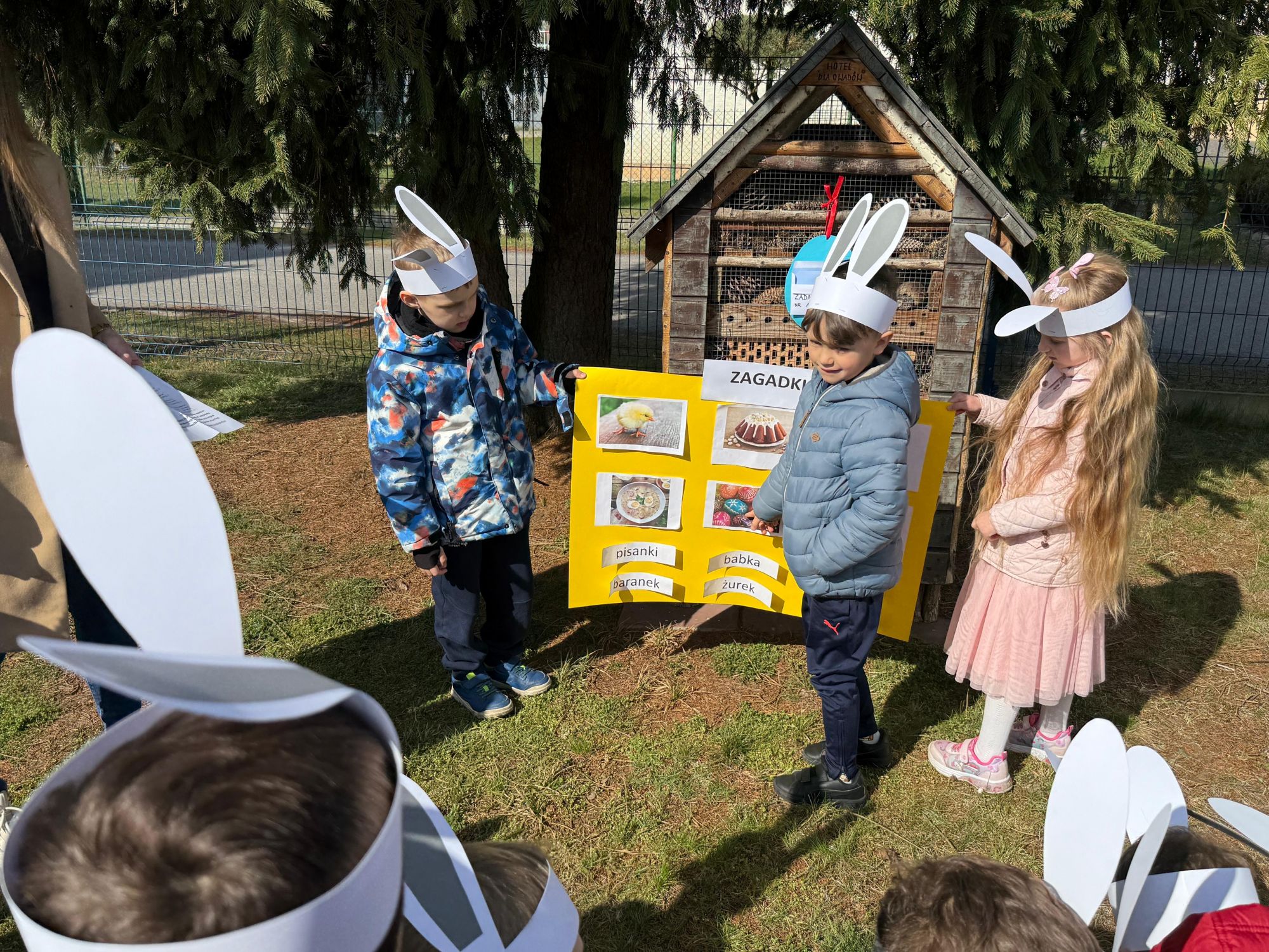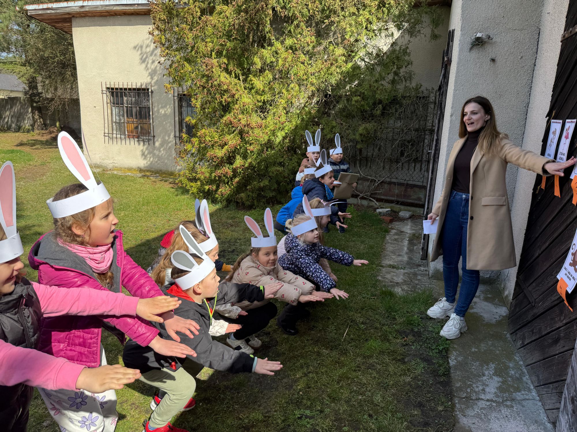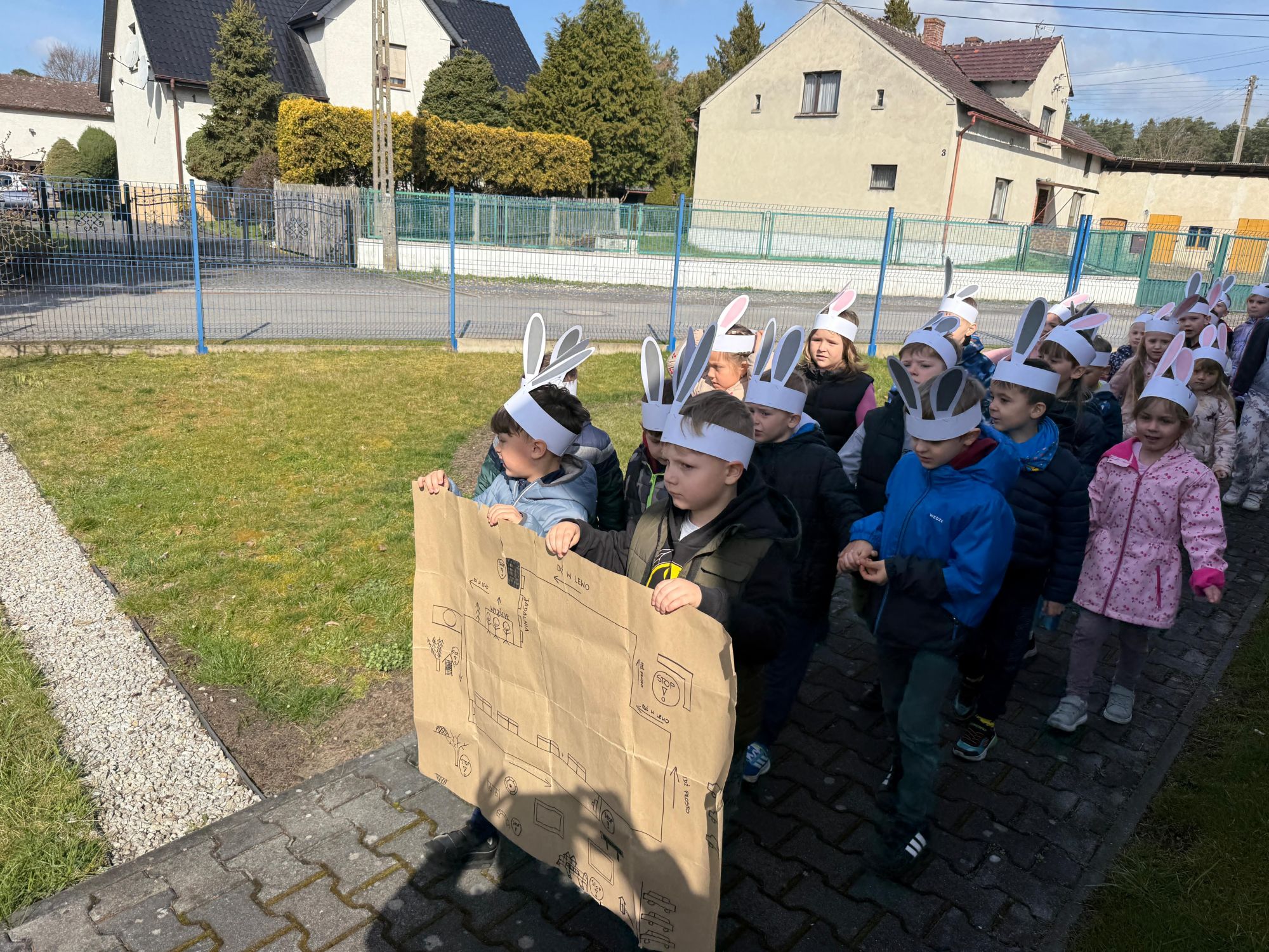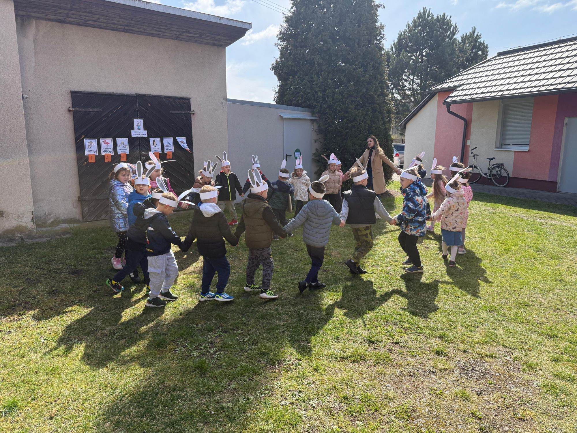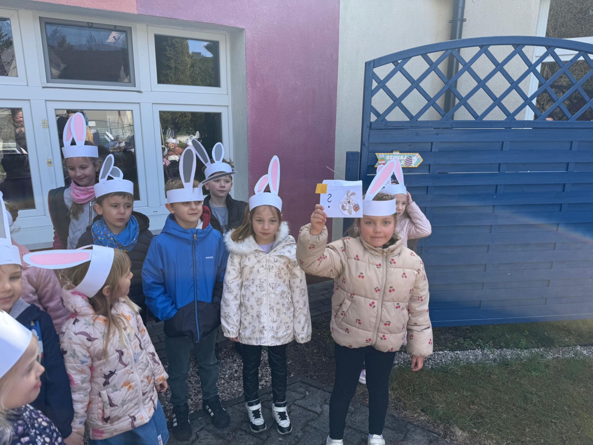 Każdego roku, tuż przed Świętami Wielkanocnymi, starszaków odwiedza wyjątkowy gość – Zajączek Wielkanocny. W tym roku, 1 kwietnia, dzieci już od samego rana z niecierpliwością wypatrywały jego przyjścia. Zaglądały przez okna i zastanawiały się, kiedy się pojawi. Po drugim śniadaniu ubrały się i założyły opaski z uszami zajączka, aby jeszcze lepiej poczuć wielkanocny nastrój. Chwilę później wyszły przed budynek przedszkola, gdzie czekała na nie niespodzianka – pięknie udekorowane wstążką pudełko oraz tajemnicza mapa. Po otwarciu pudełka przedszkolaki znalazły list, który odczytały wspólnie z panią Eweliną. Następnie rozłożyły mapę wskazującą trasę poszukiwania upominków i zgodnie z jej wskazówkami wyruszyły w drogę. Podczas wyprawy odnajdywały kolejne koperty pozostawione przez Zajączka. Z ogromnym zaangażowaniem wykonywały ukryte w nich zadania. Rozwiązywały zagadki, układały puzzle, pokonywały tory przeszkód, tworzyły wspólną pisankę z wykorzystaniem sznura, figur oraz przyborów gimnastycznych, takich jak szarfy czy woreczki. Uczestniczyły w zabawach matematycznych - przeliczały kropki na pisankach i dopasowywały do nich odpowiednie cyfry. Nie zabrakło także zabaw ruchowych, śpiewu piosenek oraz recytacji wierszy. Gdy dzieci dotarły do celu i odnalazły ostatni list, Zajączek postanowił zrobić im małego psikusa. Najpierw natrafiły na pusty koszyk z napisem „Prima Aprilis – szukajcie dalej!”. Ostatecznie udało się odnaleźć prawdziwy skarb – koszyk pełen słodkich upominków, który sprawił wszystkim ogromną radość. Poszukiwanie wskazówek okazało się doskonałą zabawą, która dostarczyła wszystkim wielu niezapomnianych wrażeń.